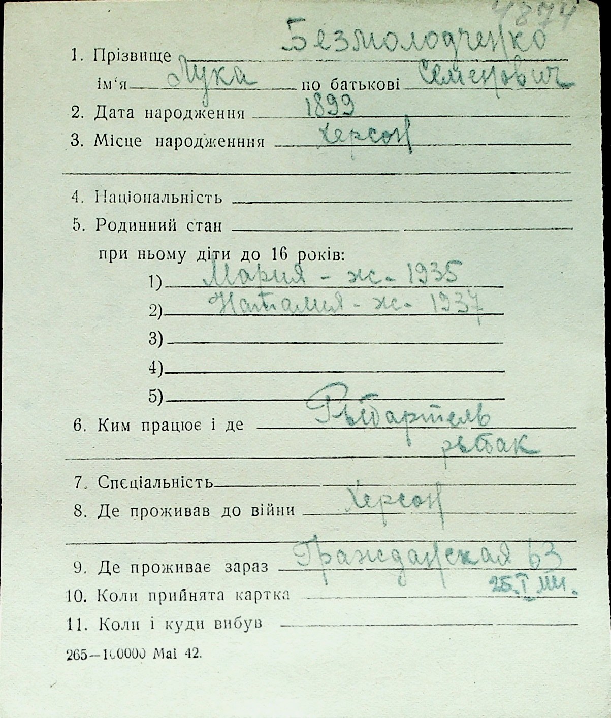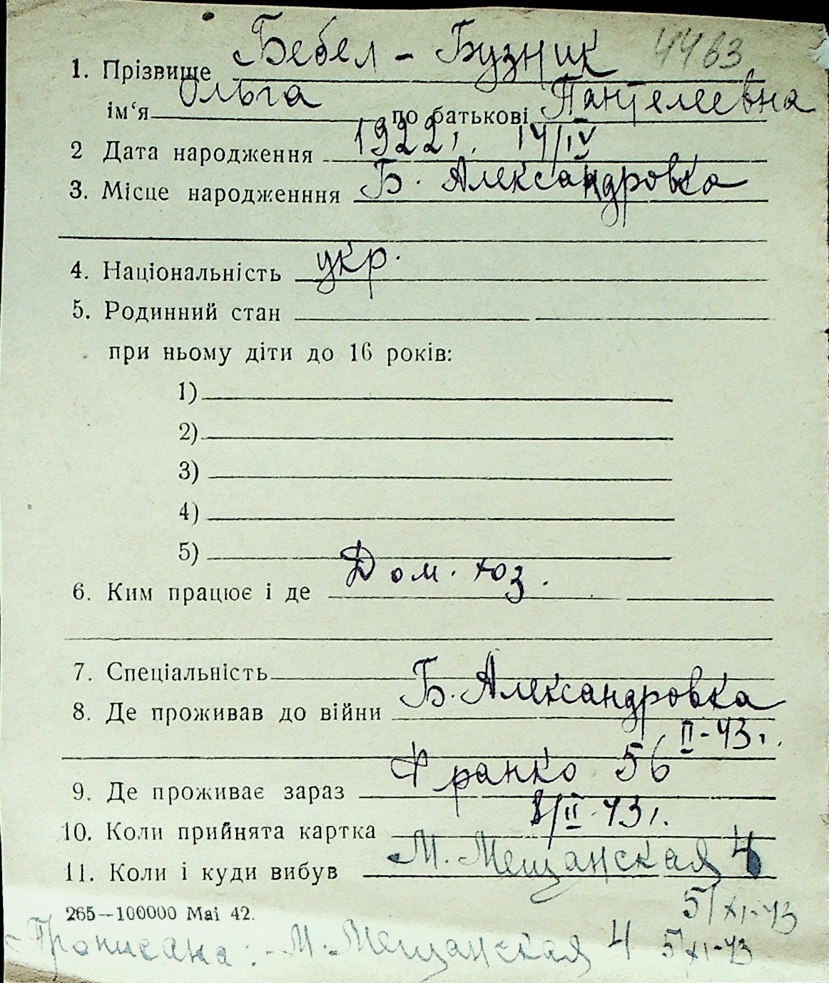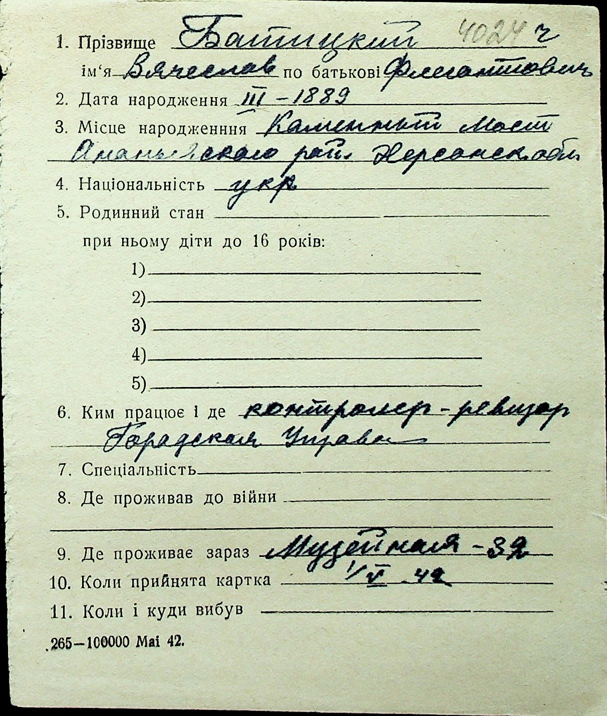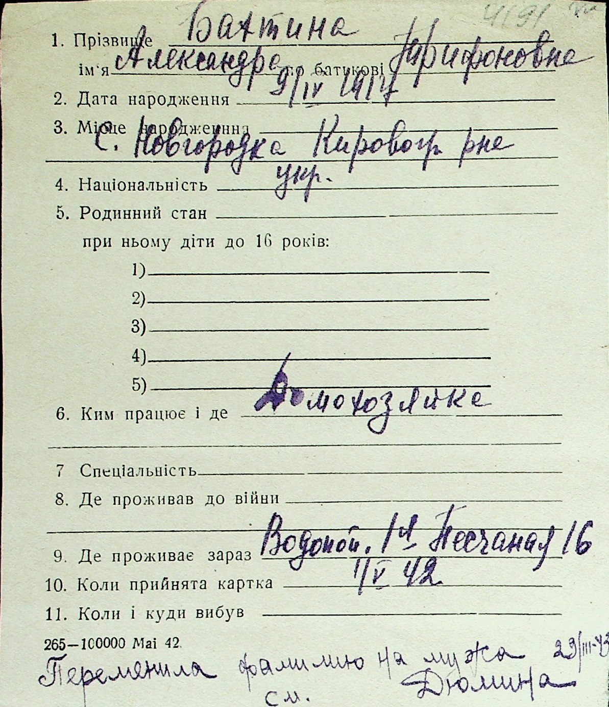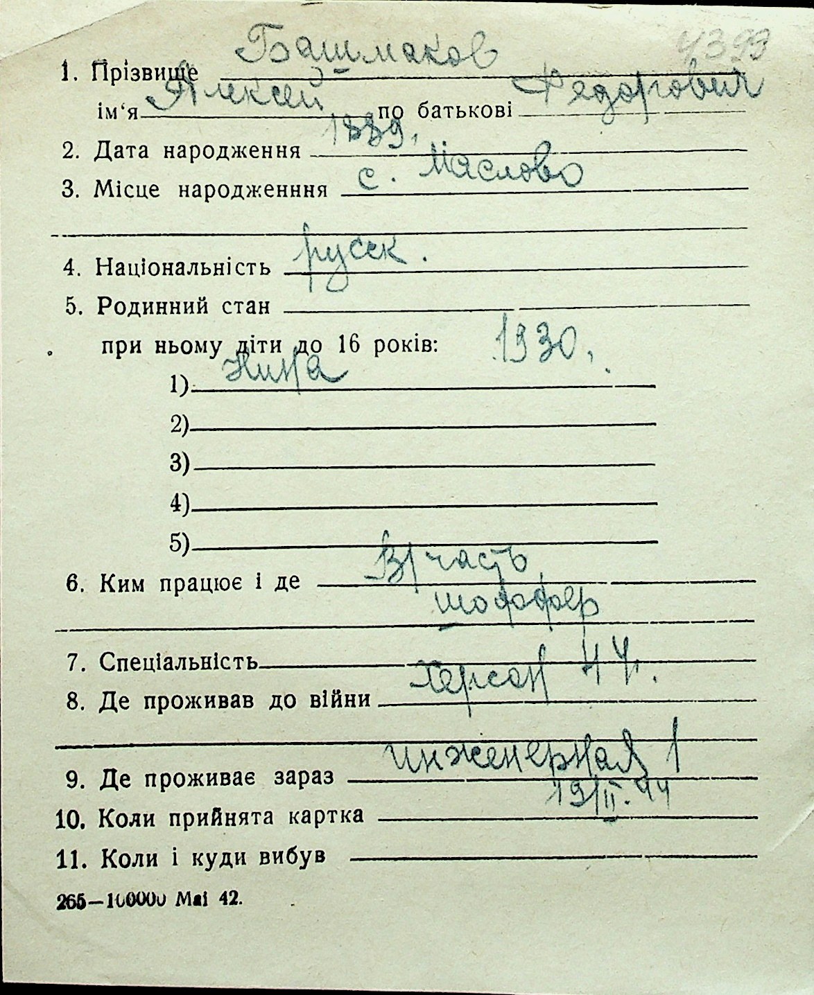 ◦ ◦ Перелік карток на осіб, які мешкали у м. Миколаїв у період окупації 1941–1944 років