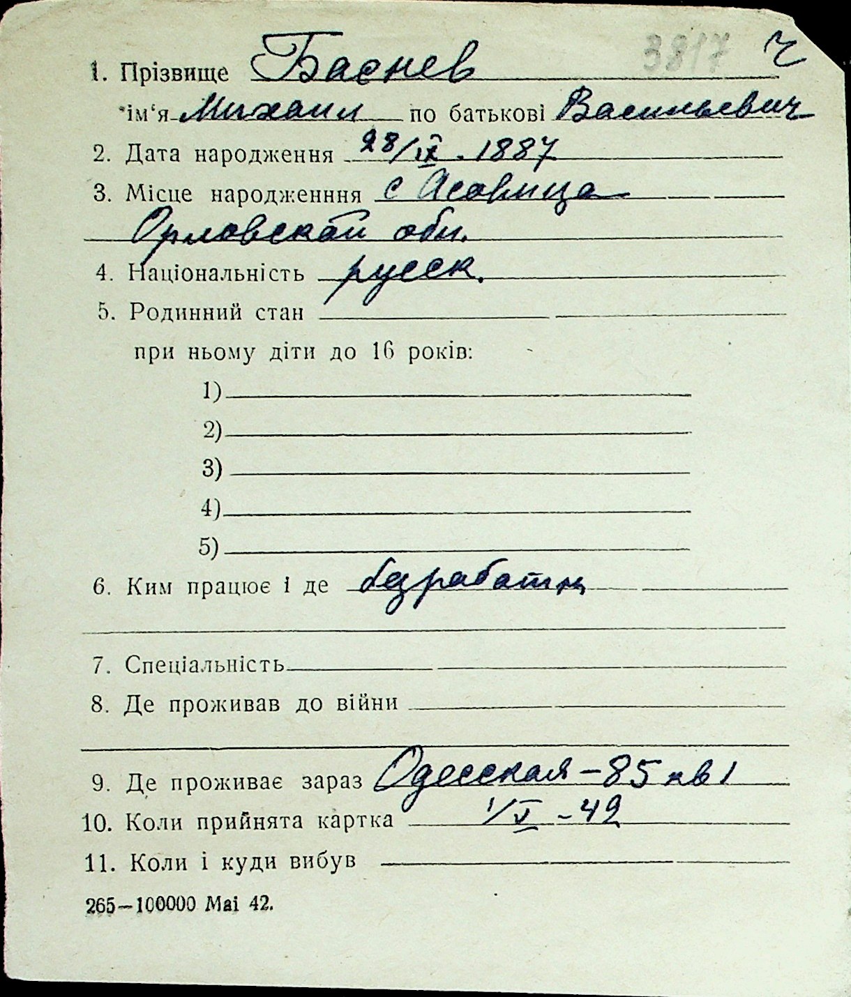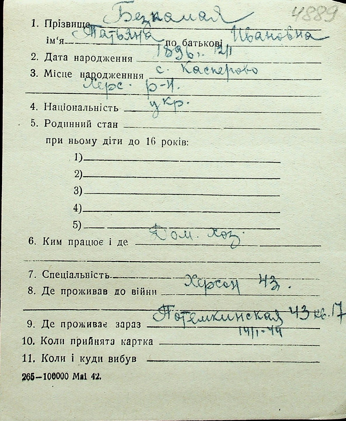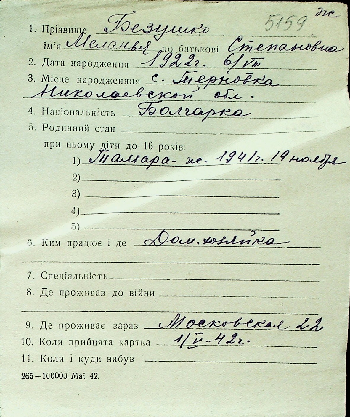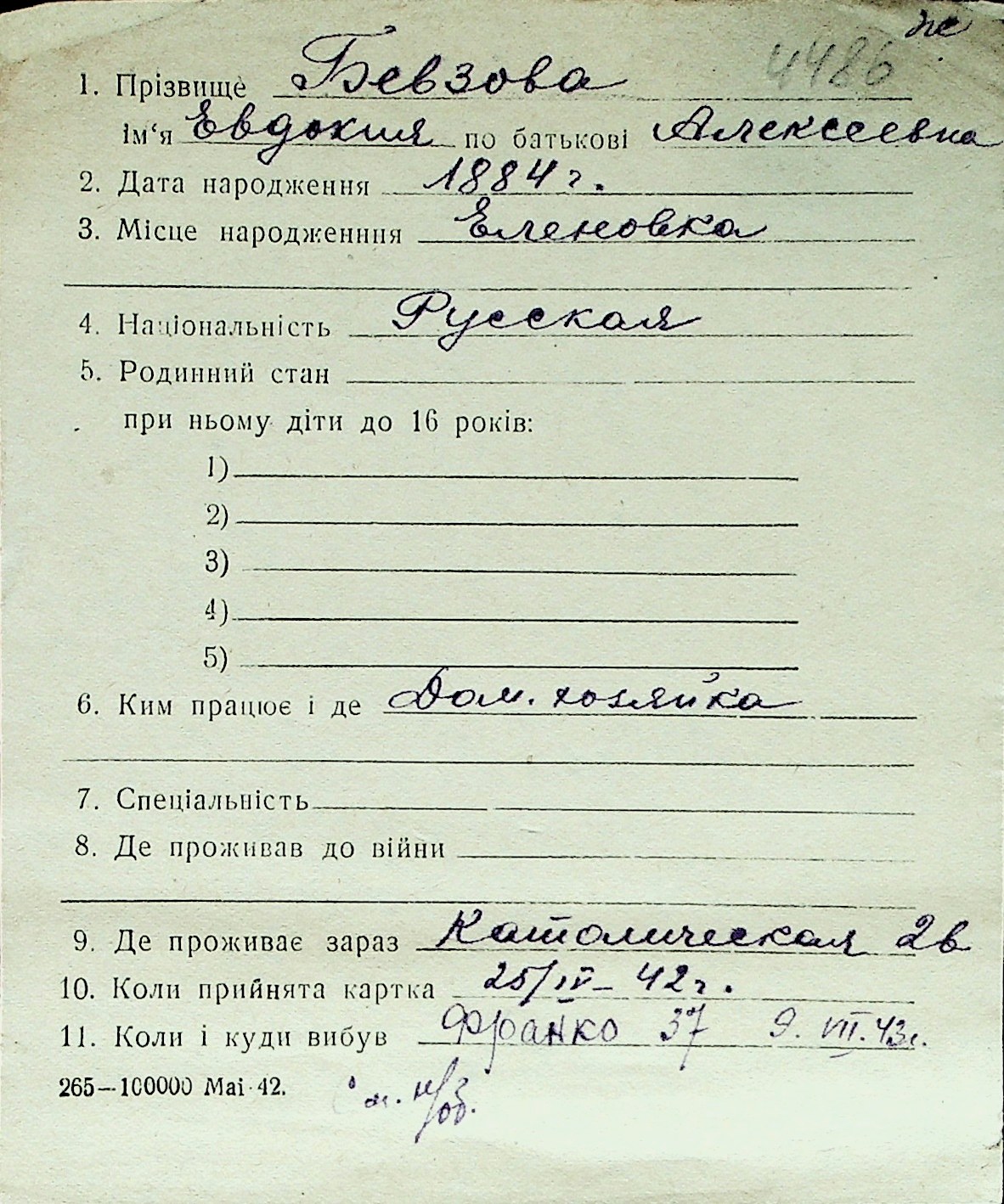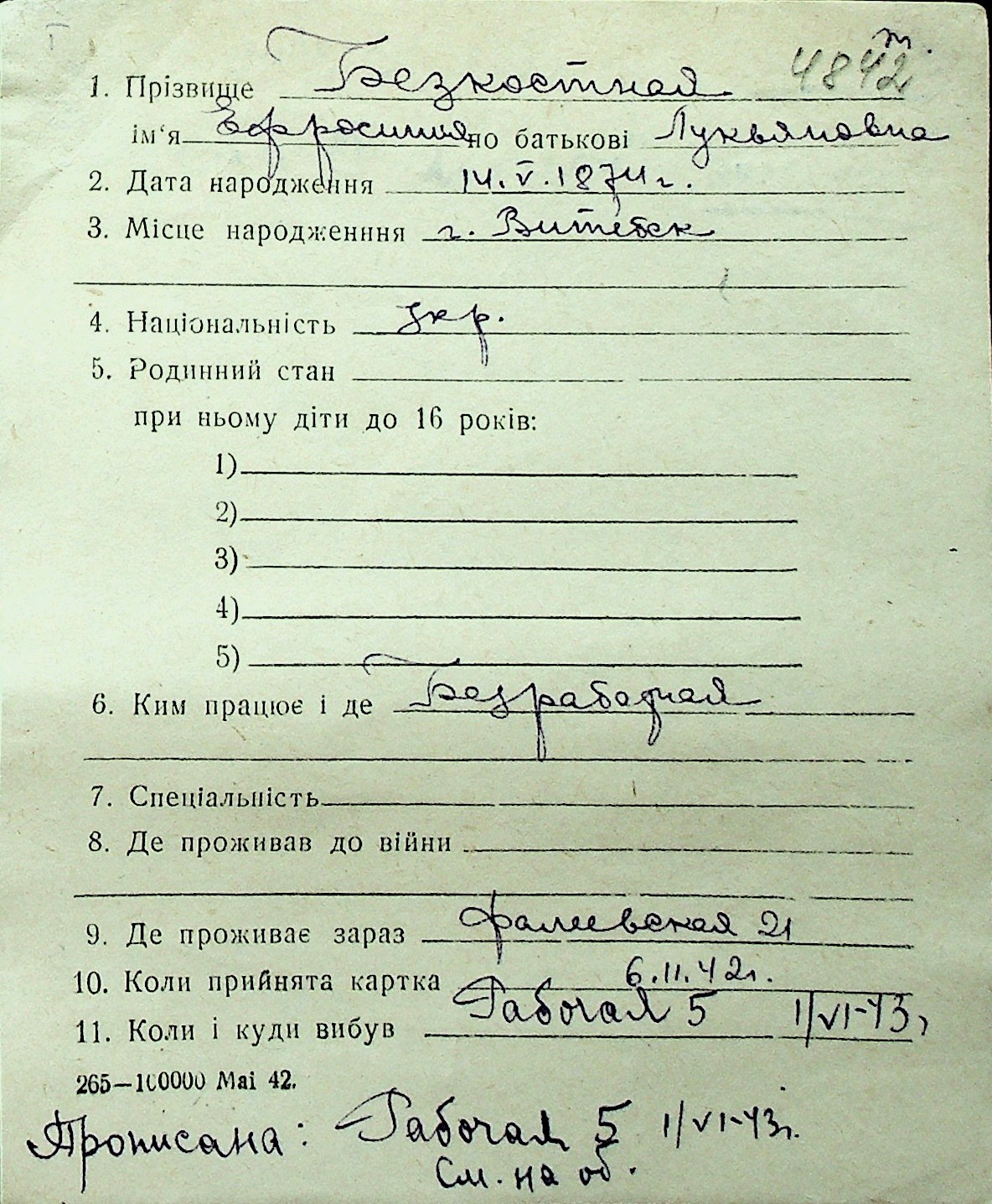 ◦ ◦ Перелік карток на осіб, які мешкали у м. Миколаїв у період окупації 1941–1944 років