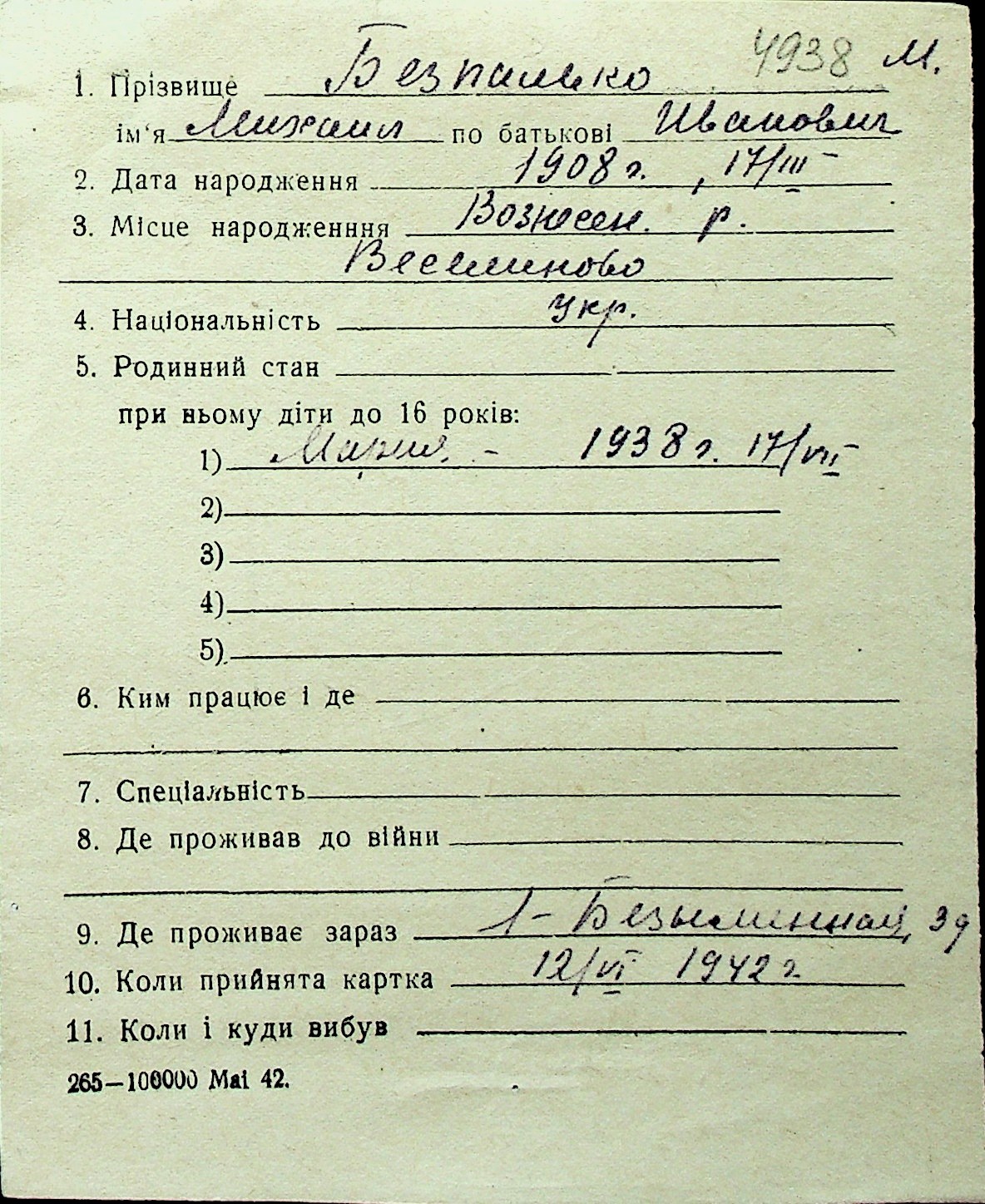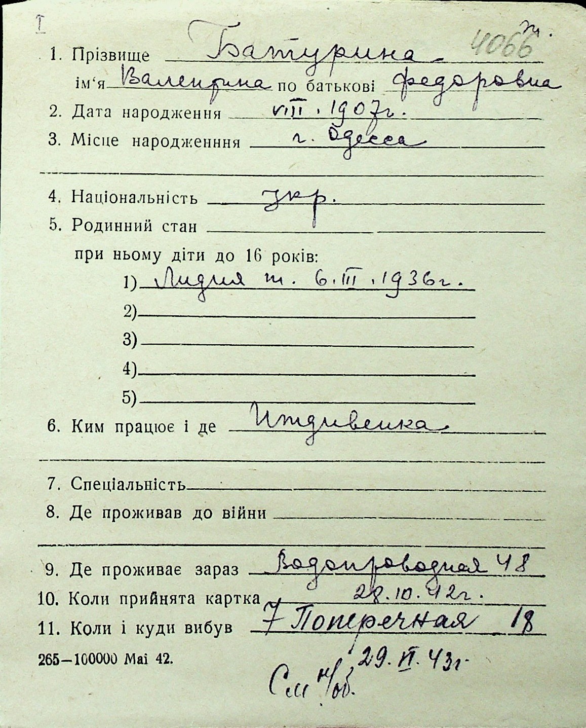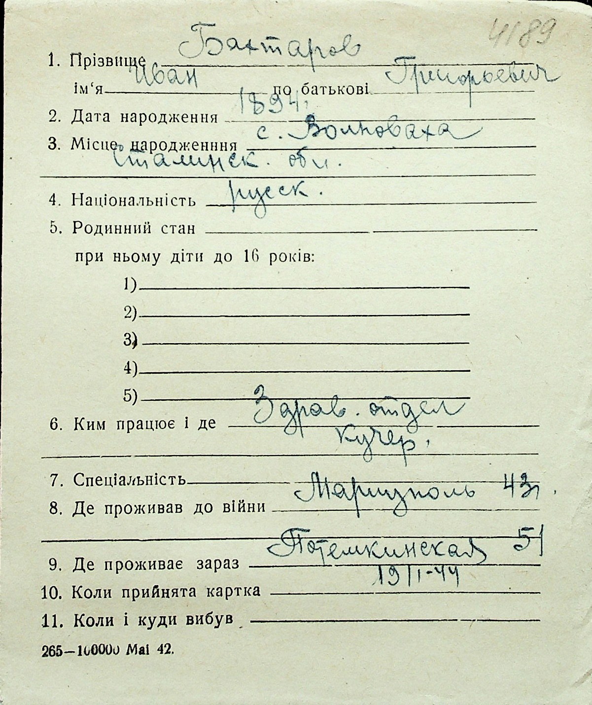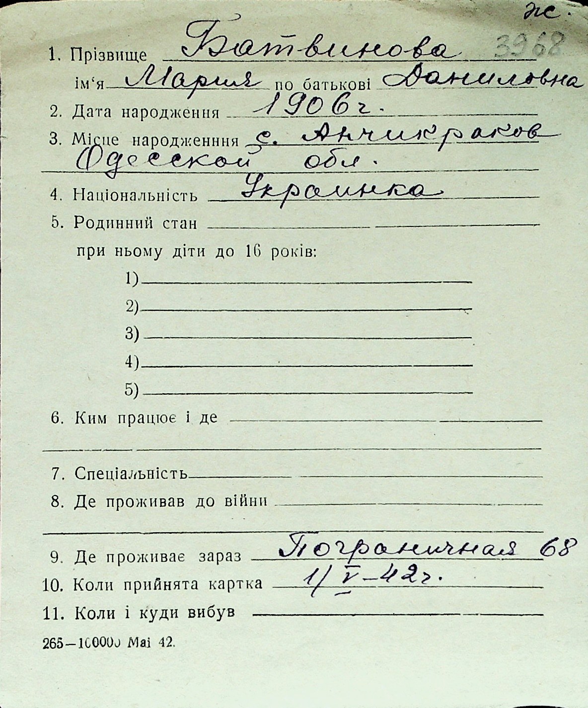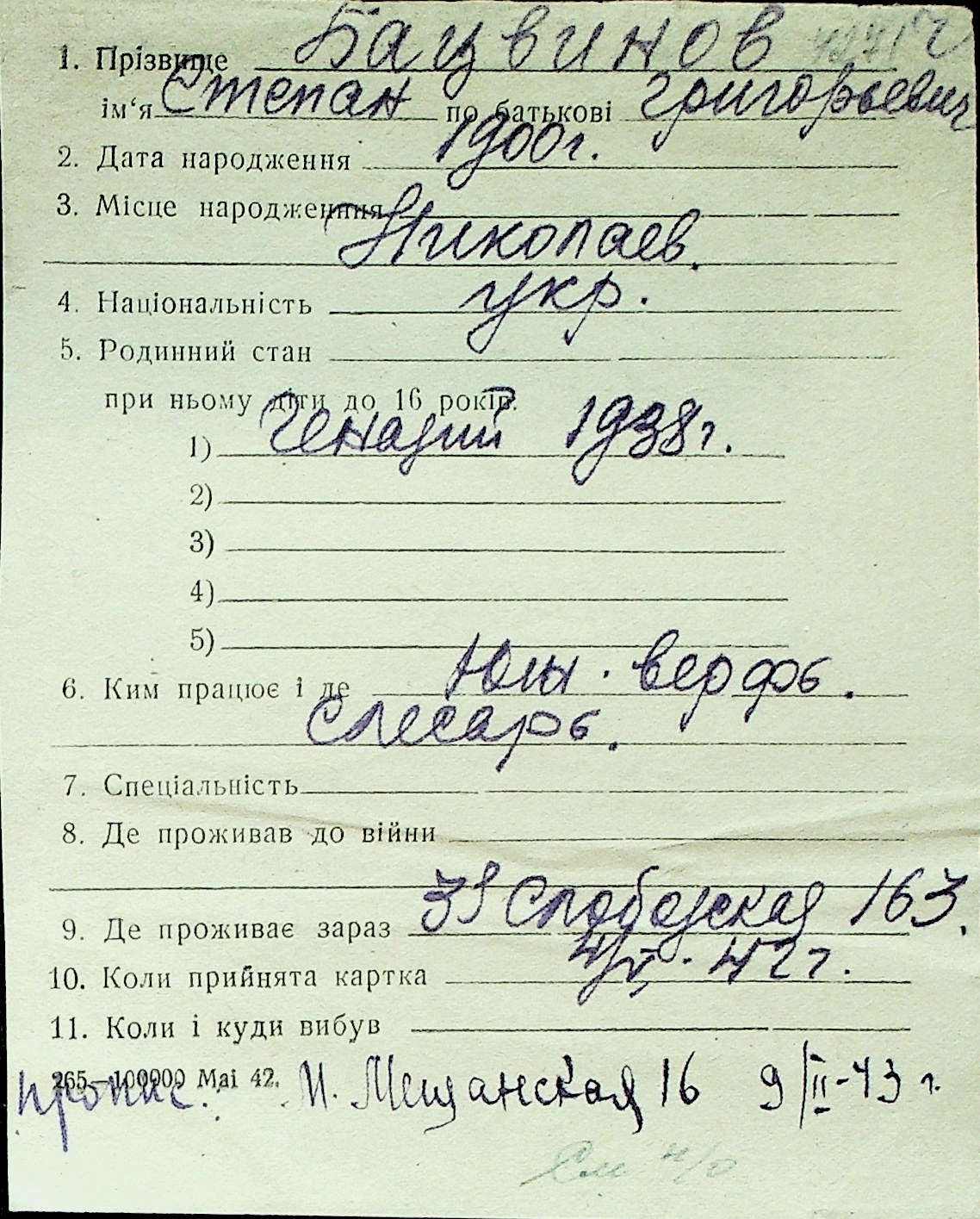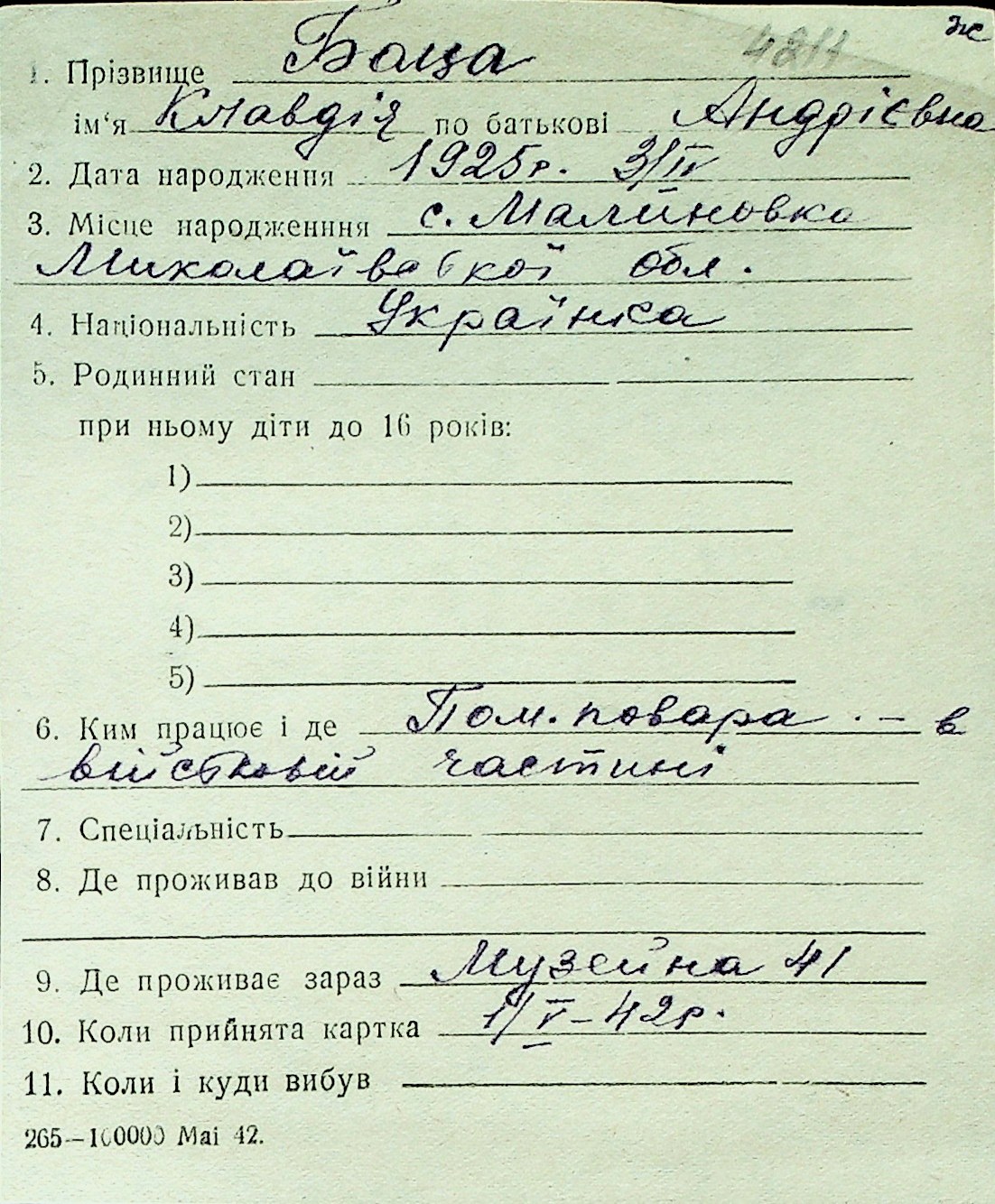 ◦ ◦ Перелік карток на осіб, які мешкали у м. Миколаїв у період окупації 1941–1944 років