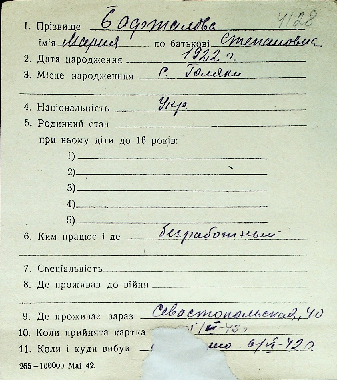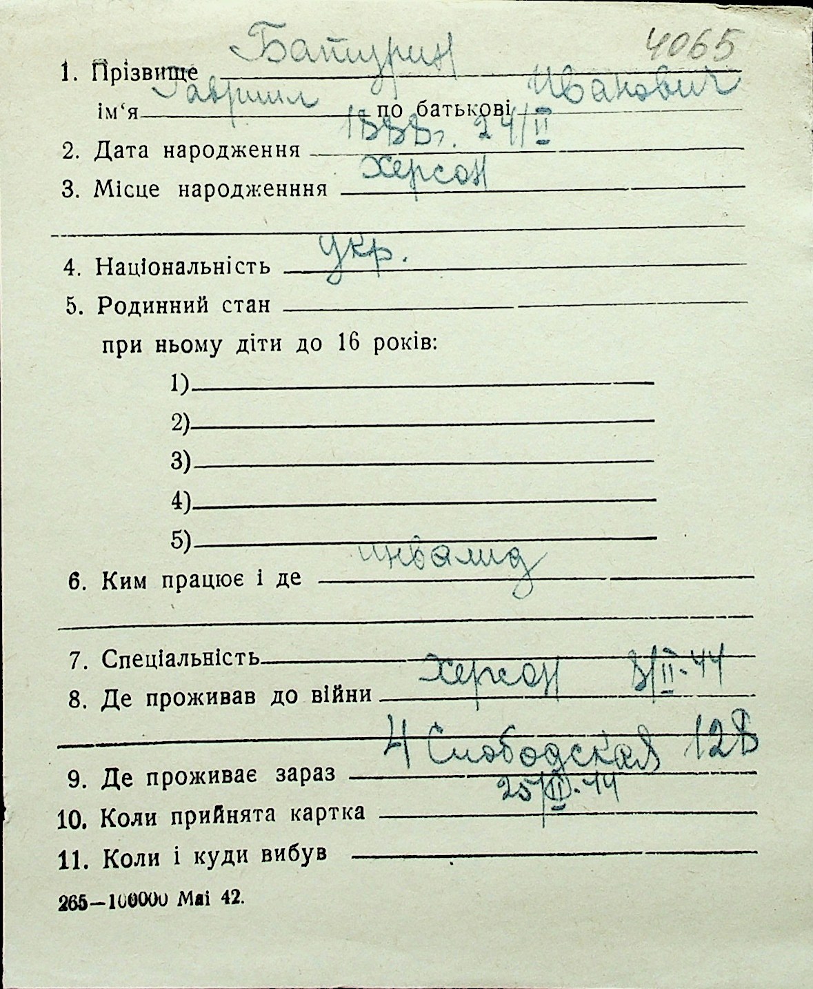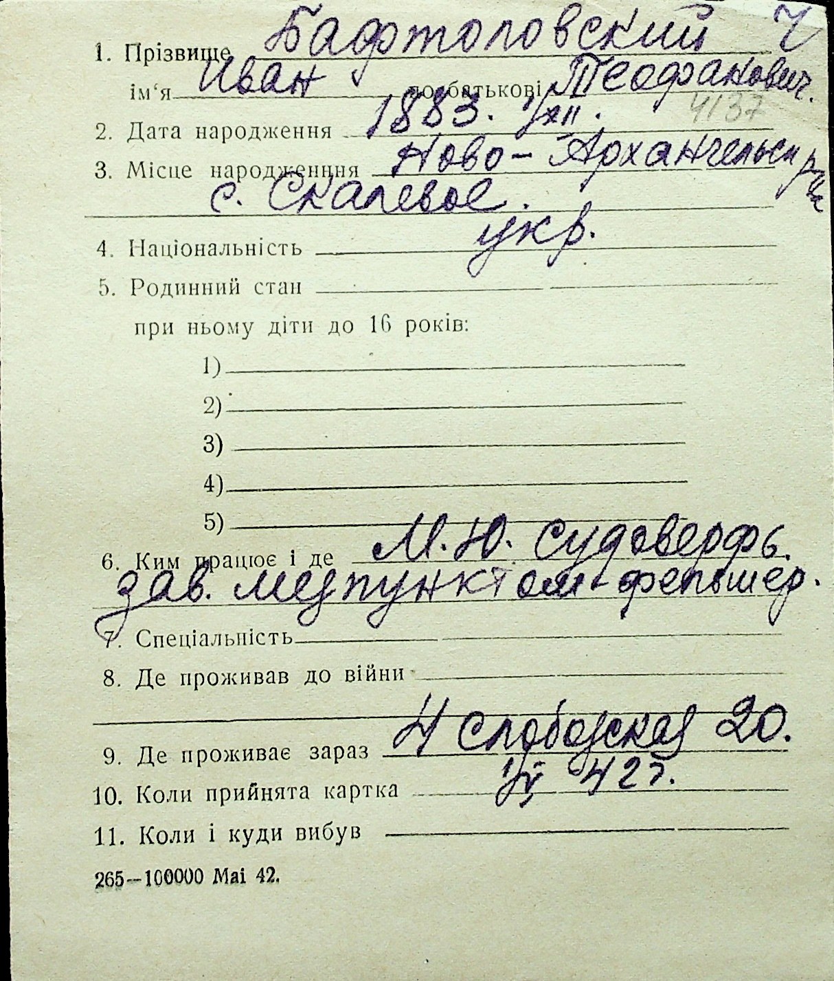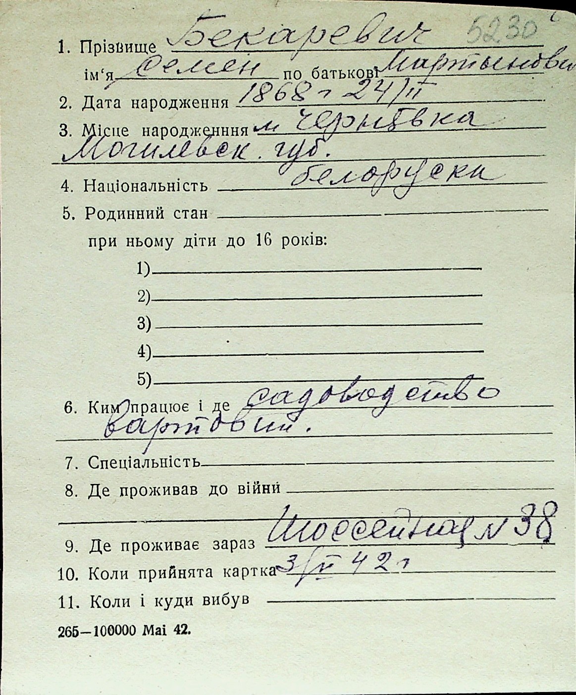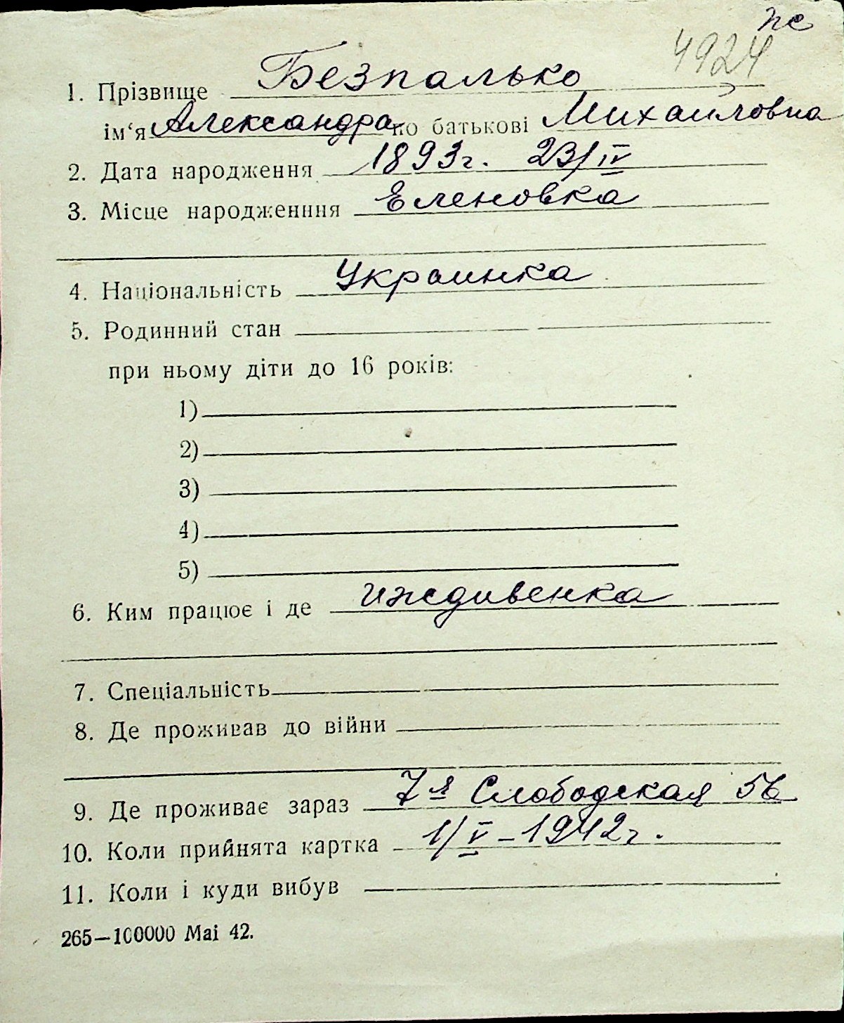 ◦ ◦ Перелік карток на осіб, які мешкали у м. Миколаїв у період окупації 1941–1944 років
