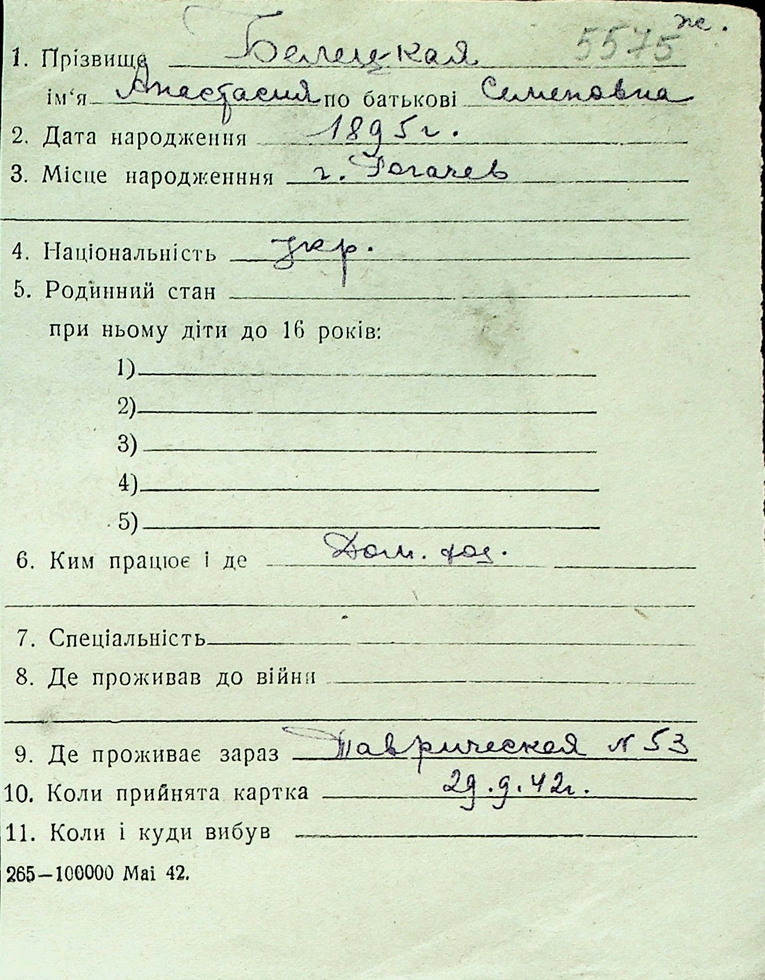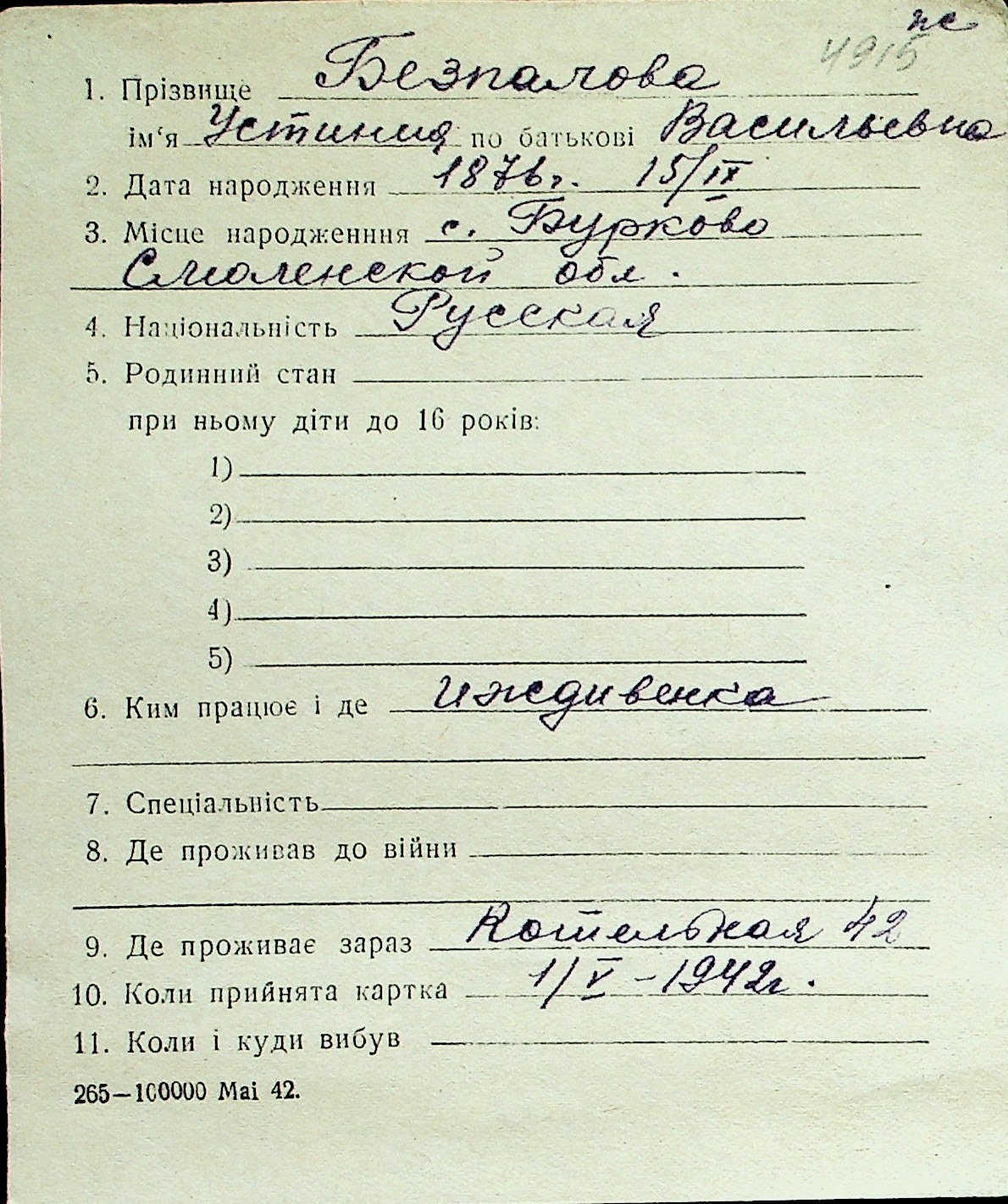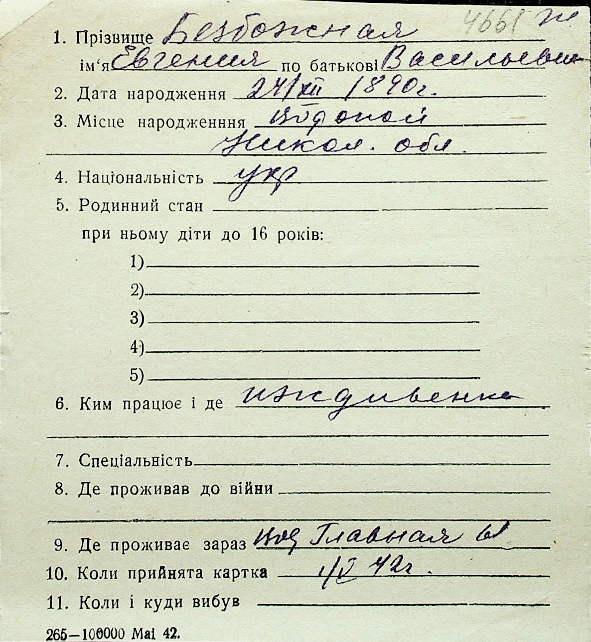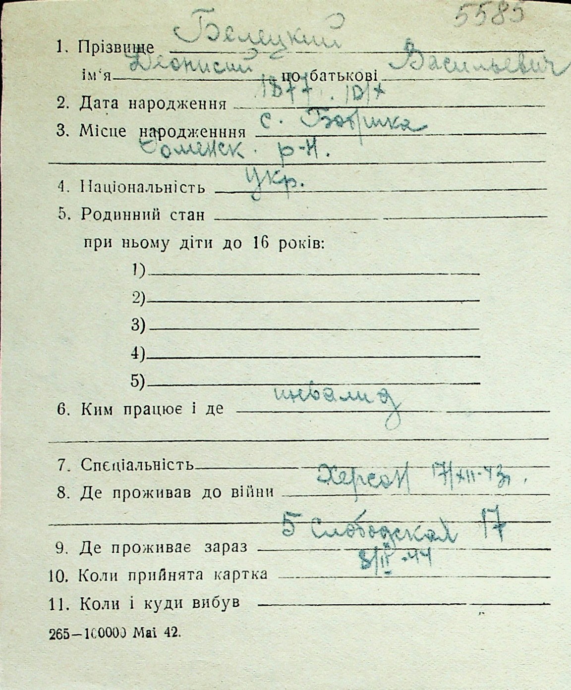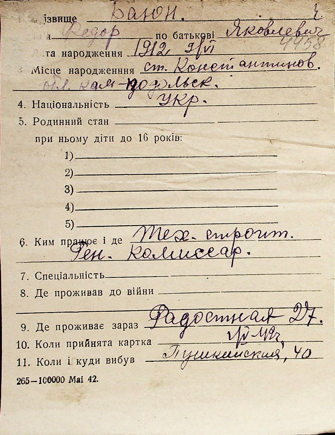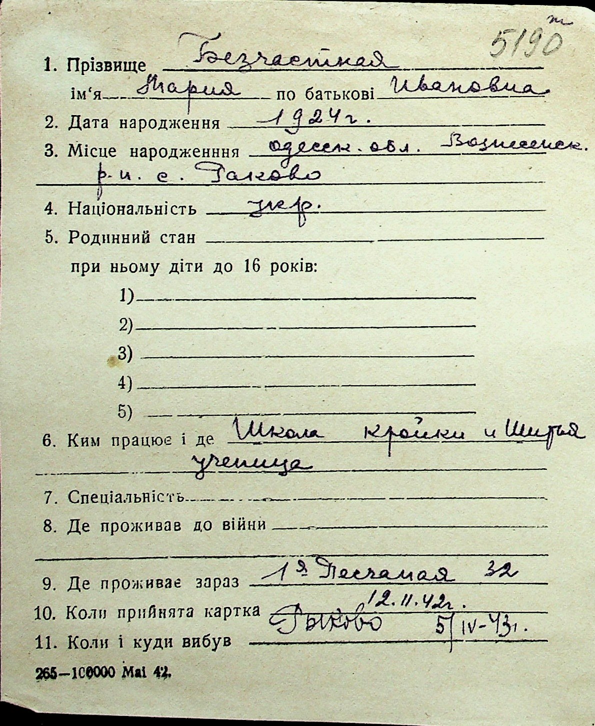 ◦ ◦ Перелік карток на осіб, які мешкали у м. Миколаїв у період окупації 1941–1944 років