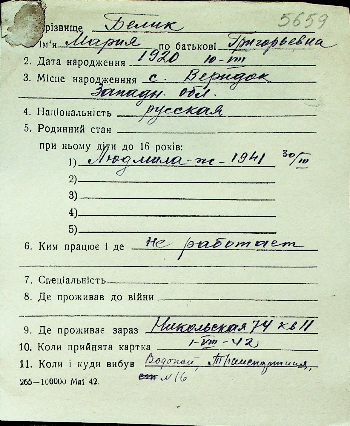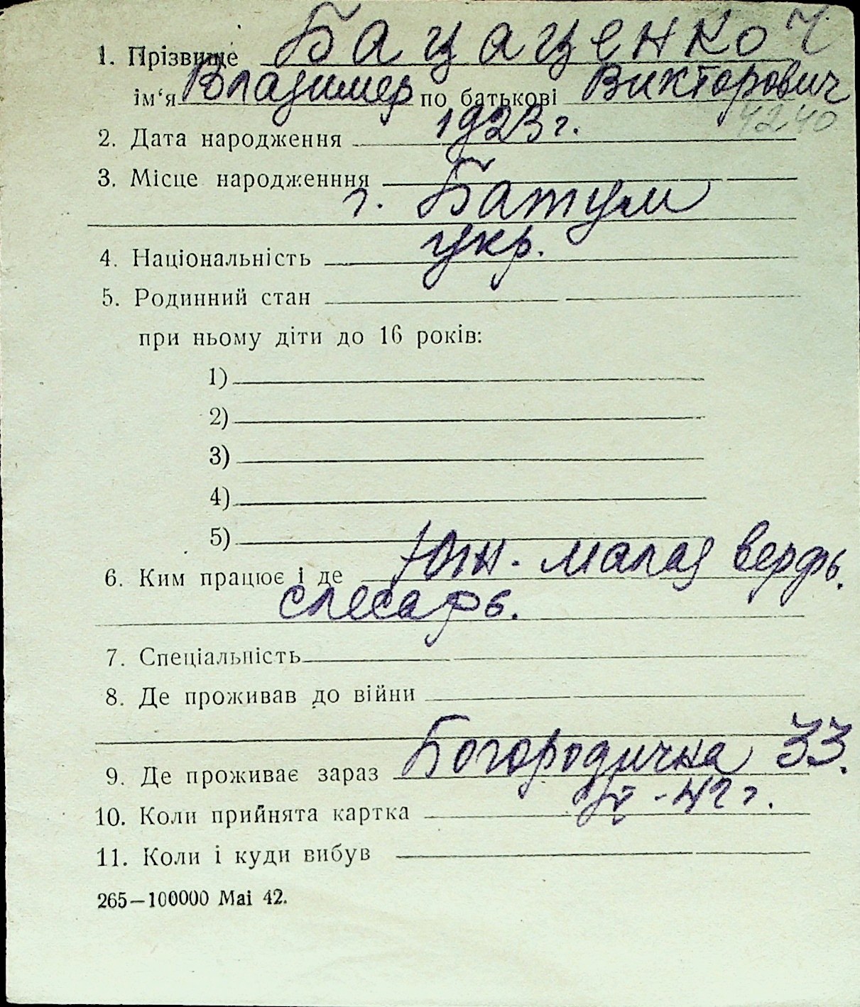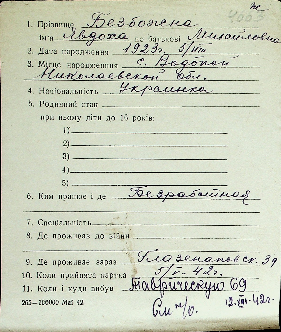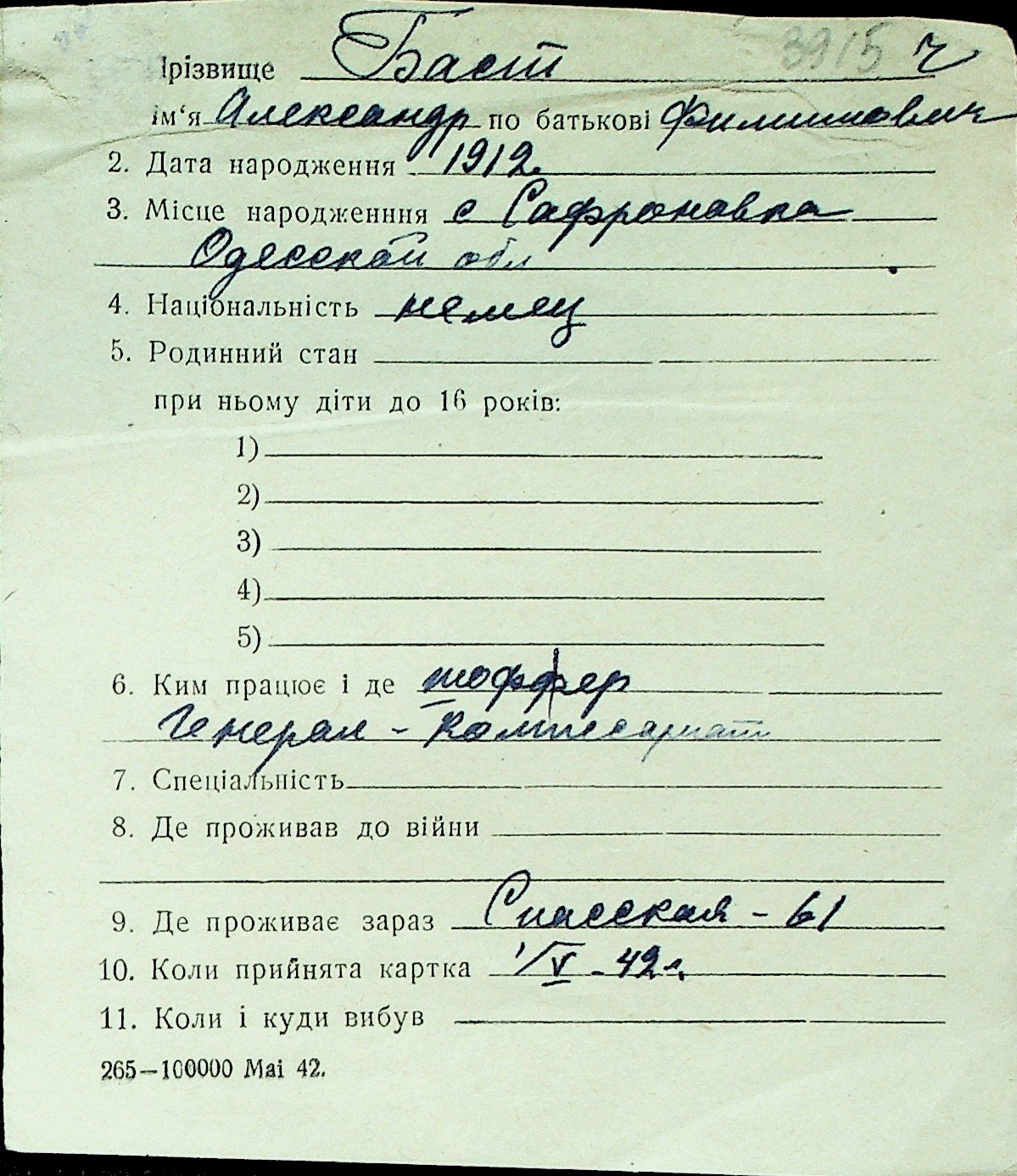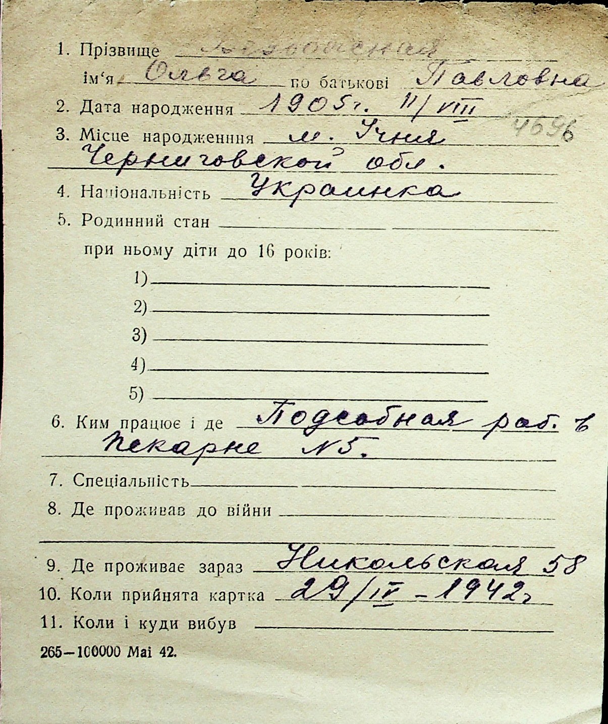 ◦ ◦ Перелік карток на осіб, які мешкали у м. Миколаїв у період окупації 1941–1944 років