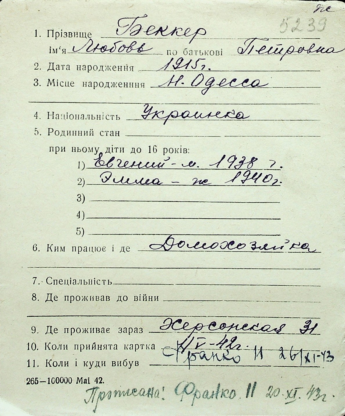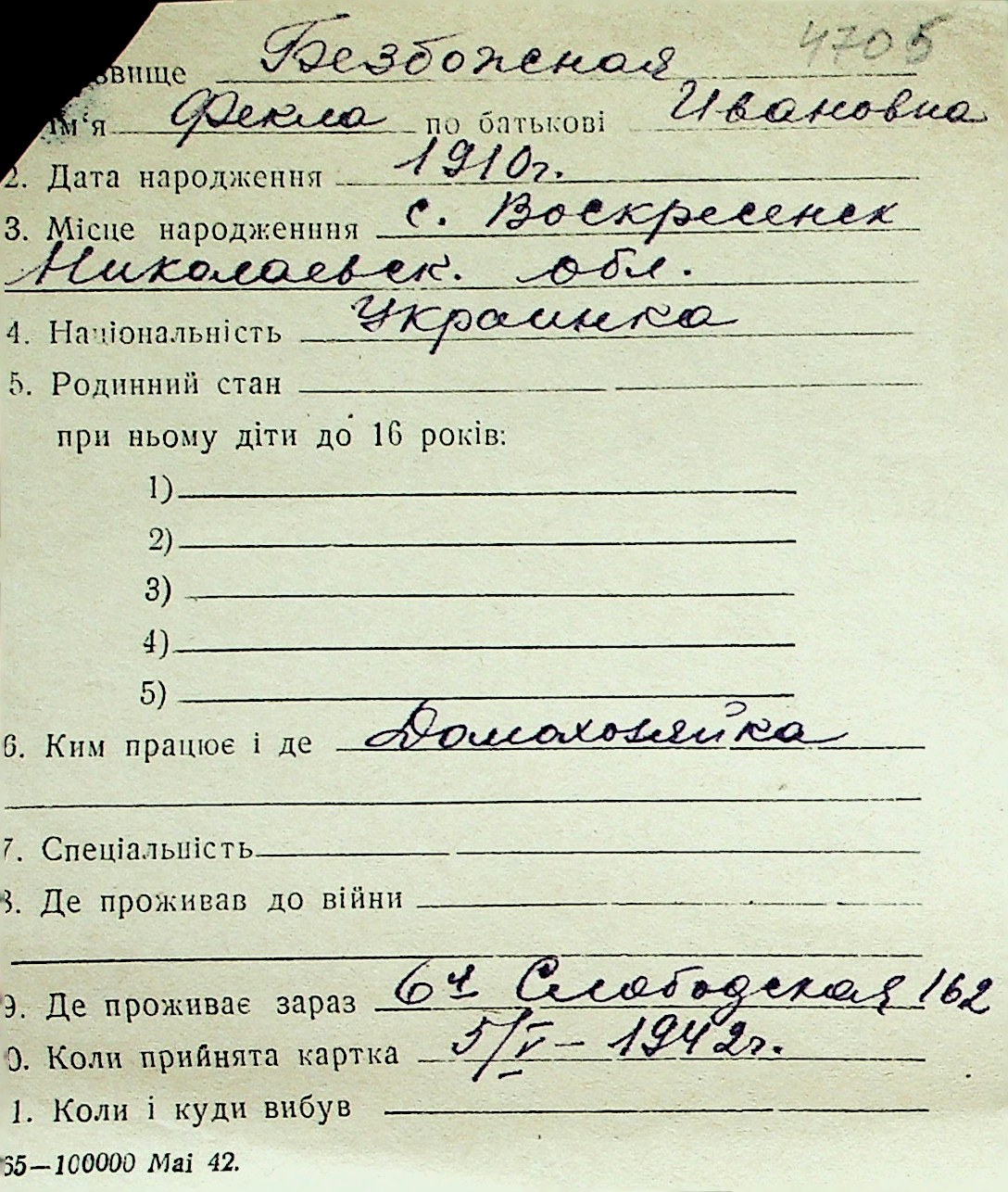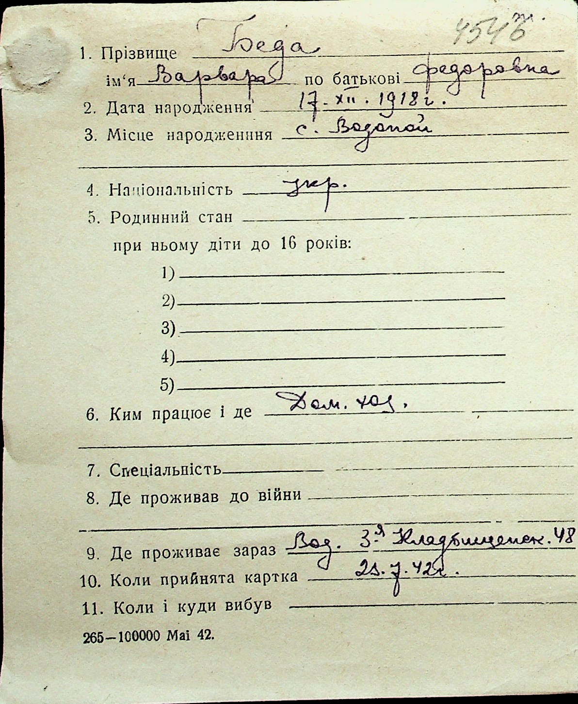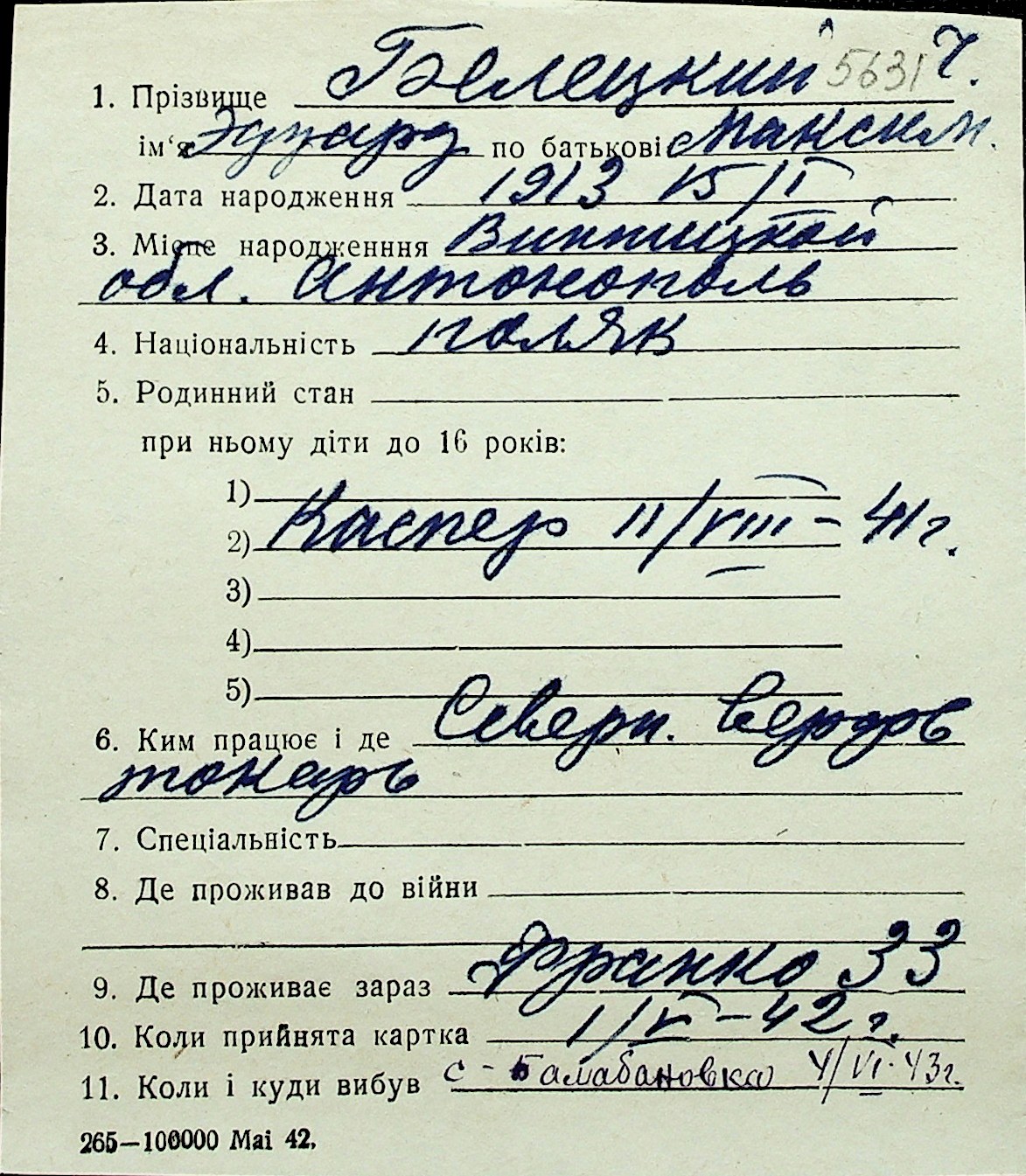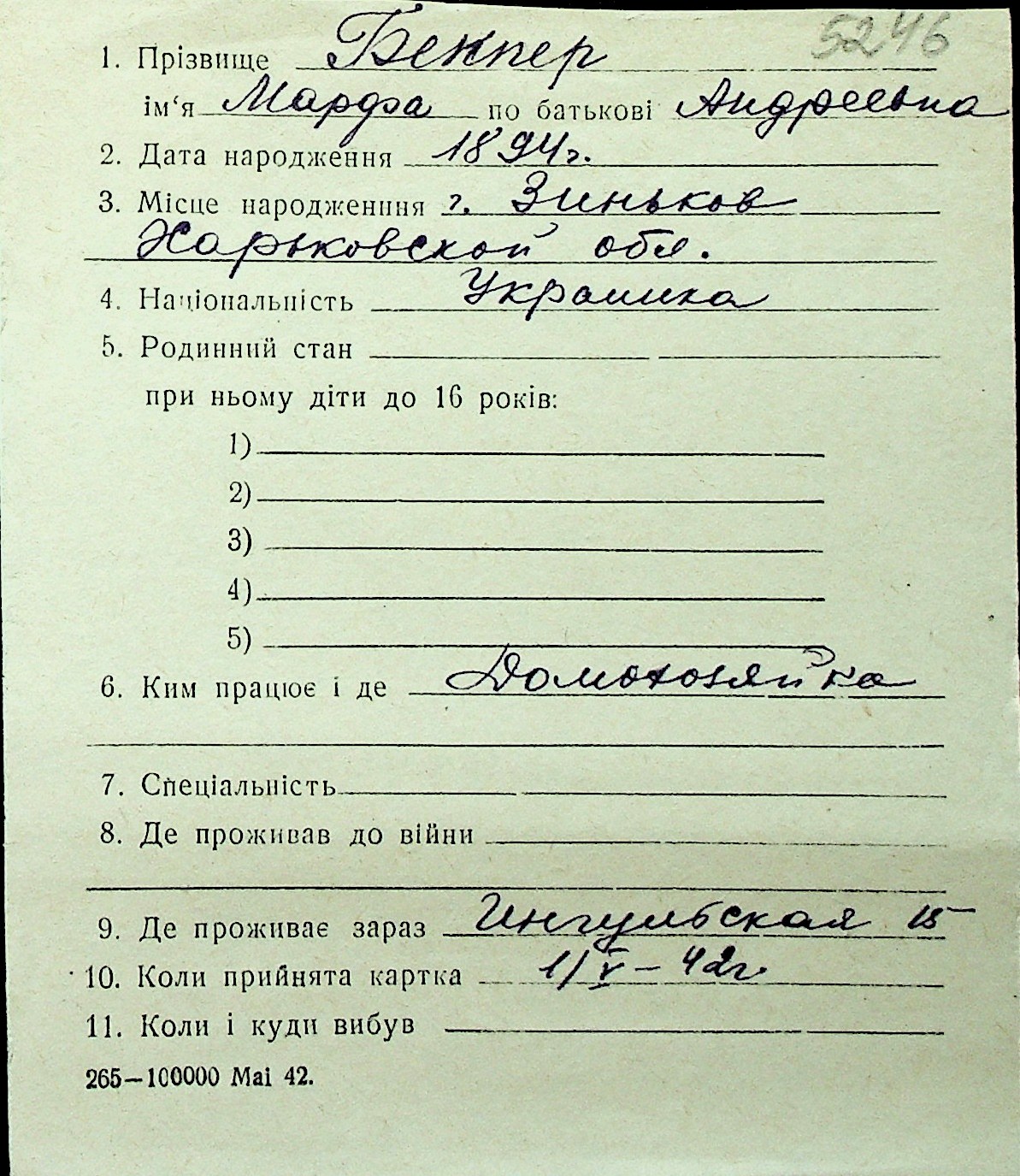 ◦ ◦ Перелік карток на осіб, які мешкали у м. Миколаїв у період окупації 1941–1944 років
