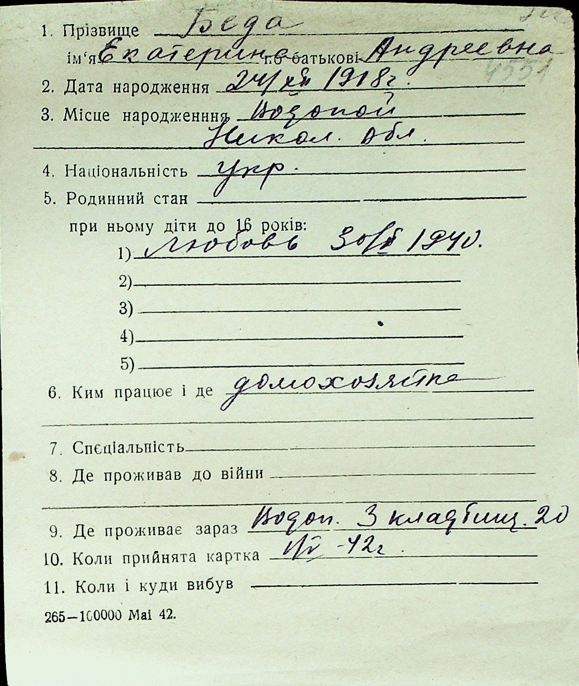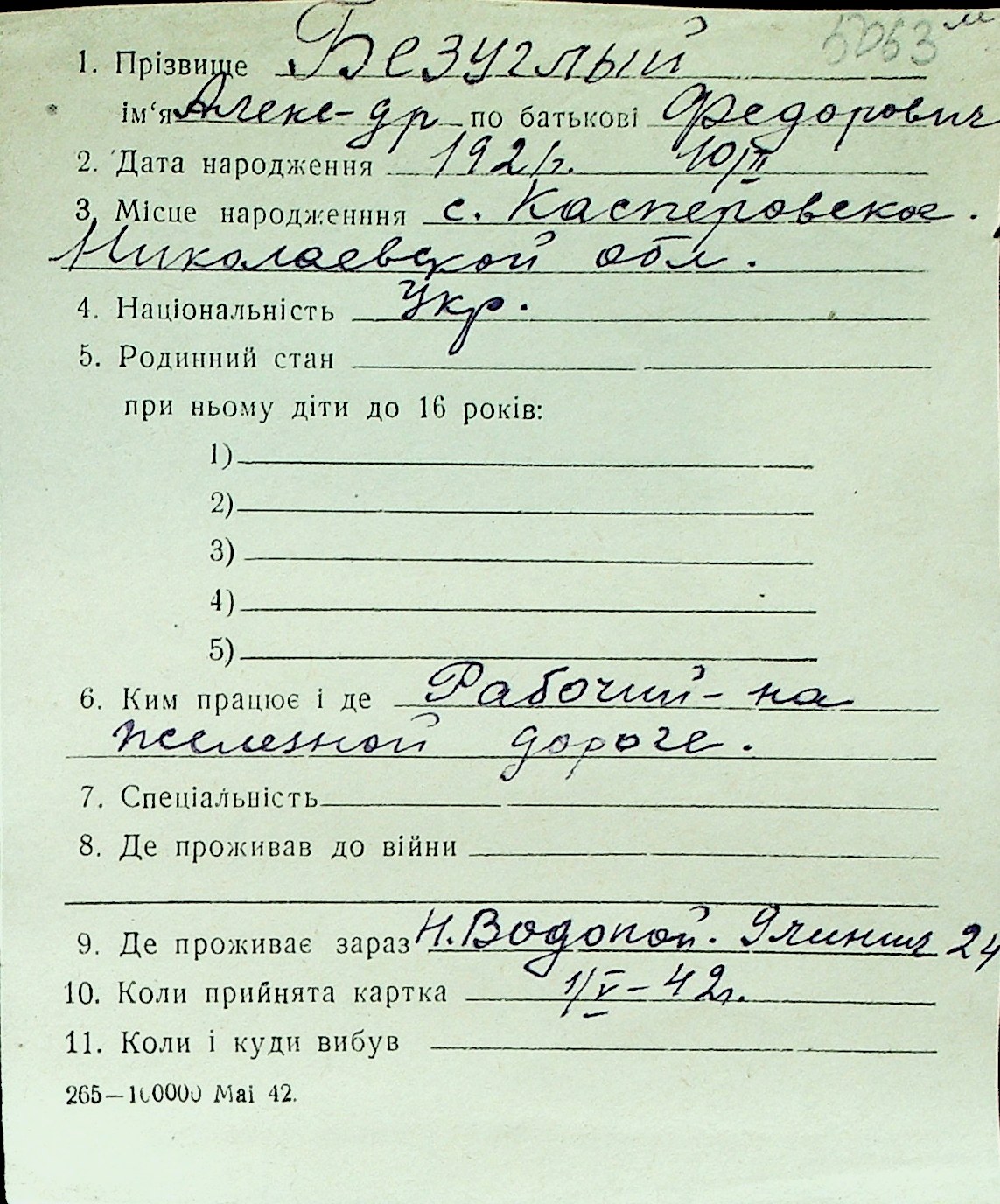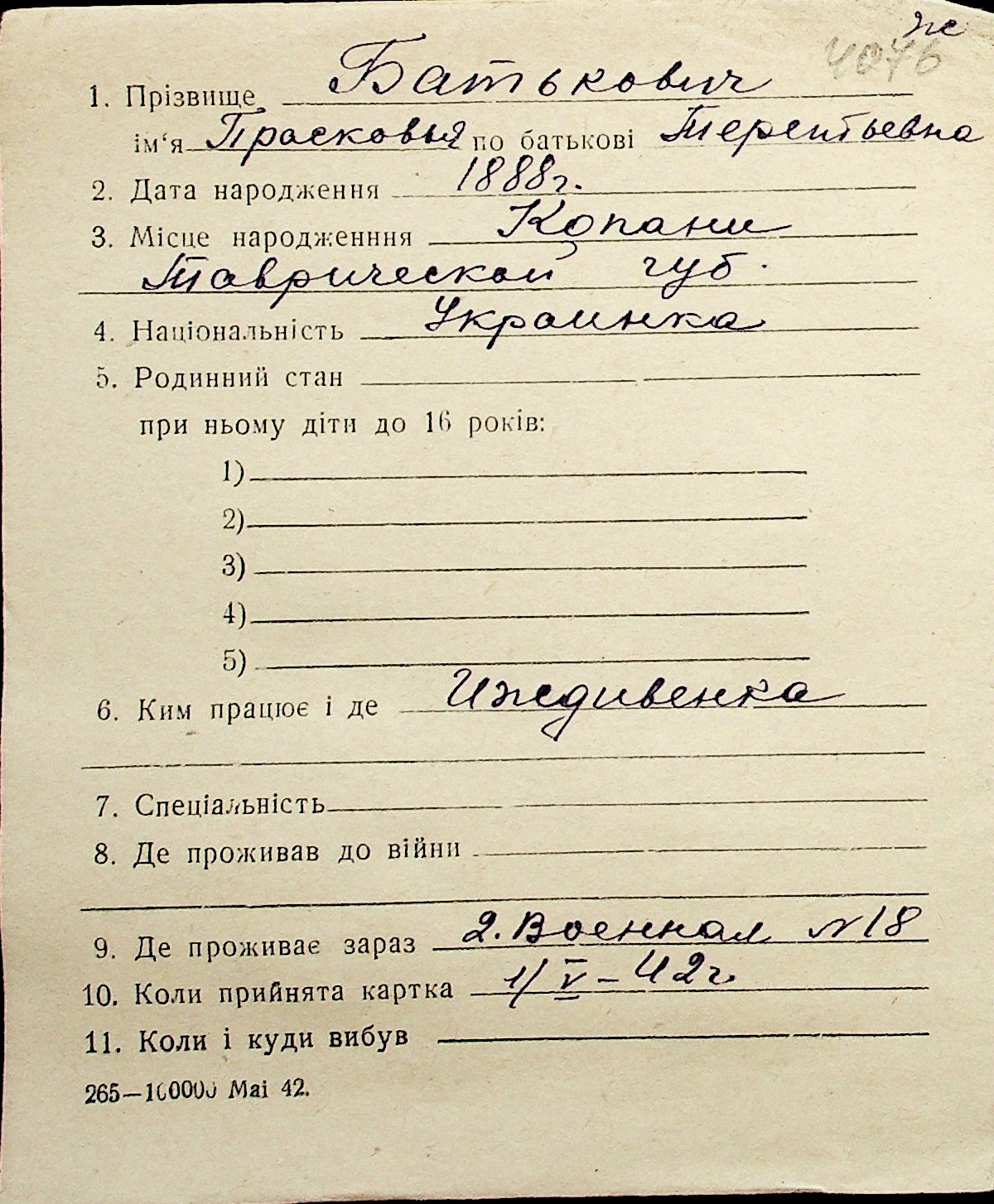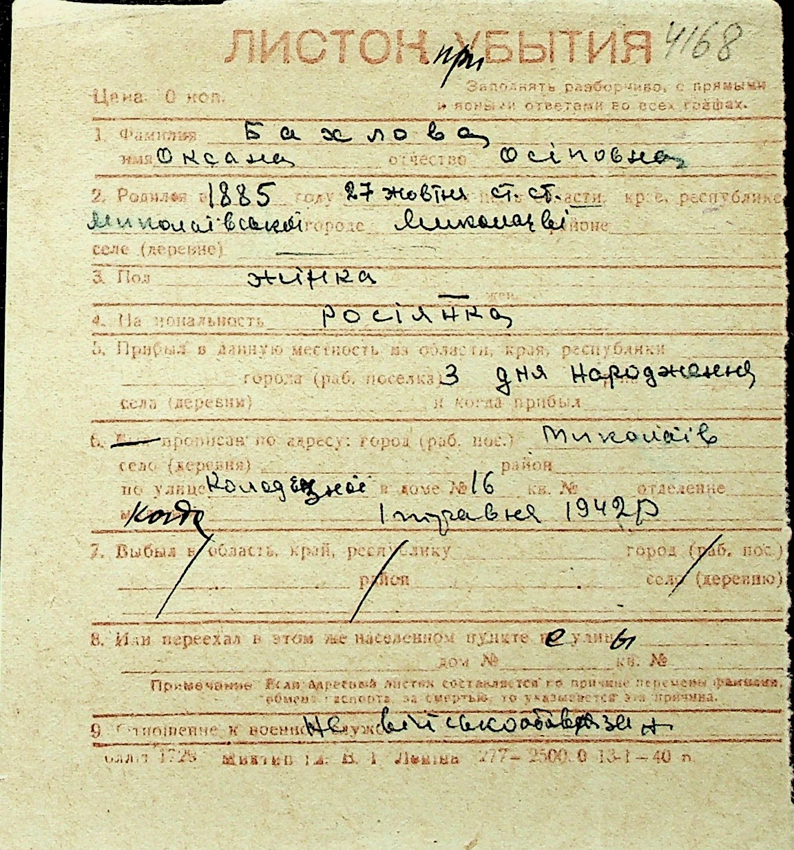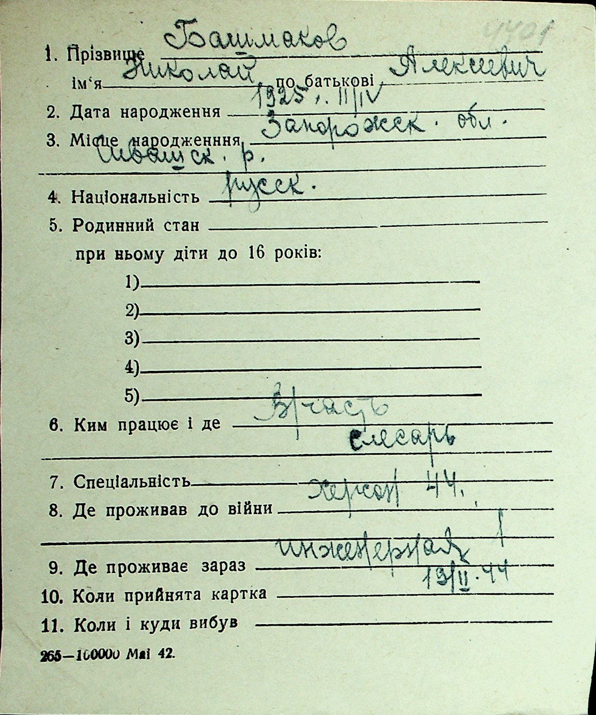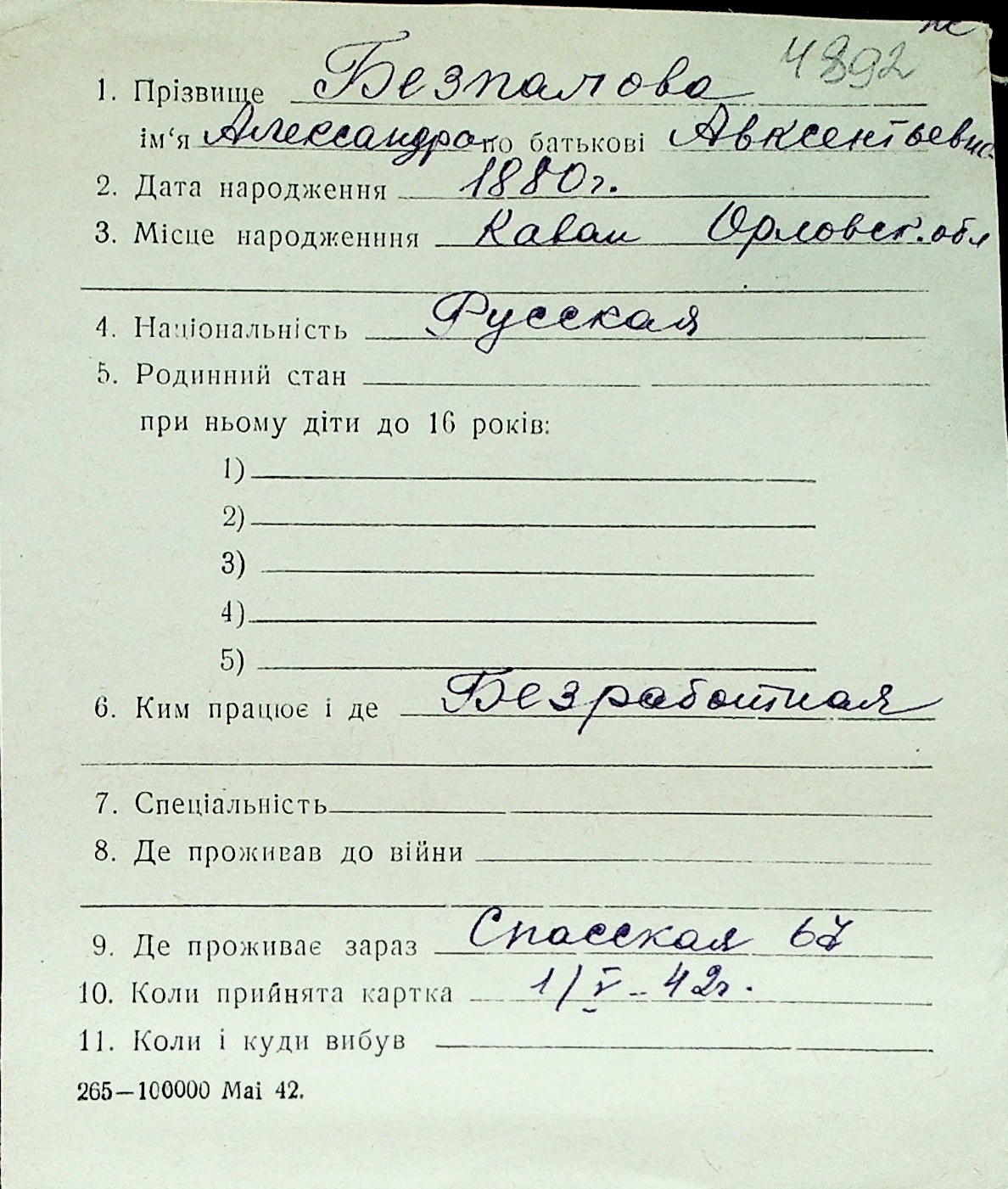 ◦ ◦ Перелік карток на осіб, які мешкали у м. Миколаїв у період окупації 1941–1944 років