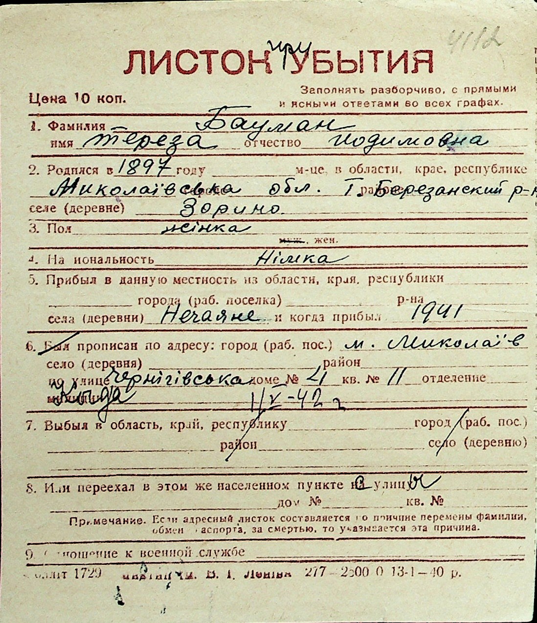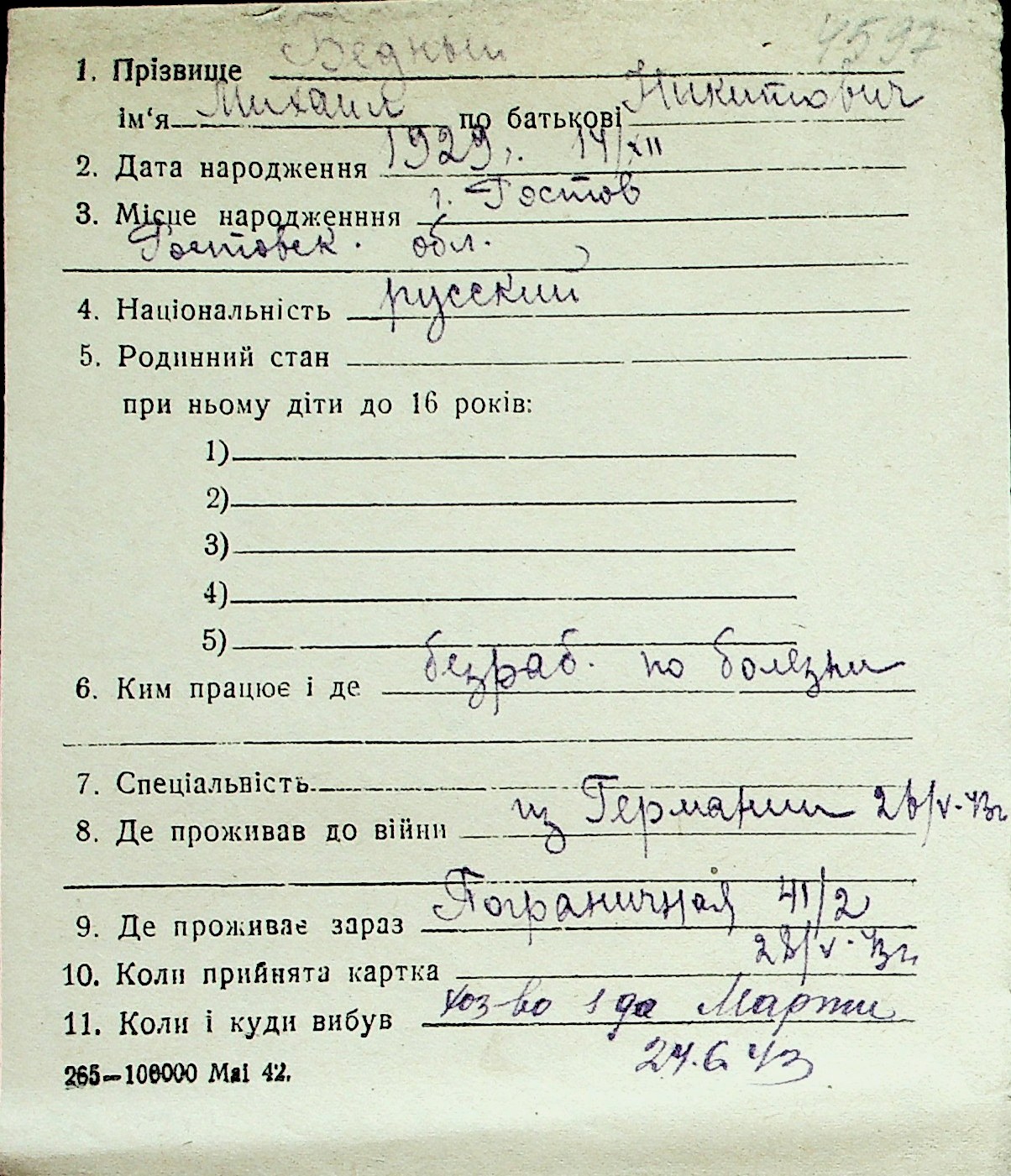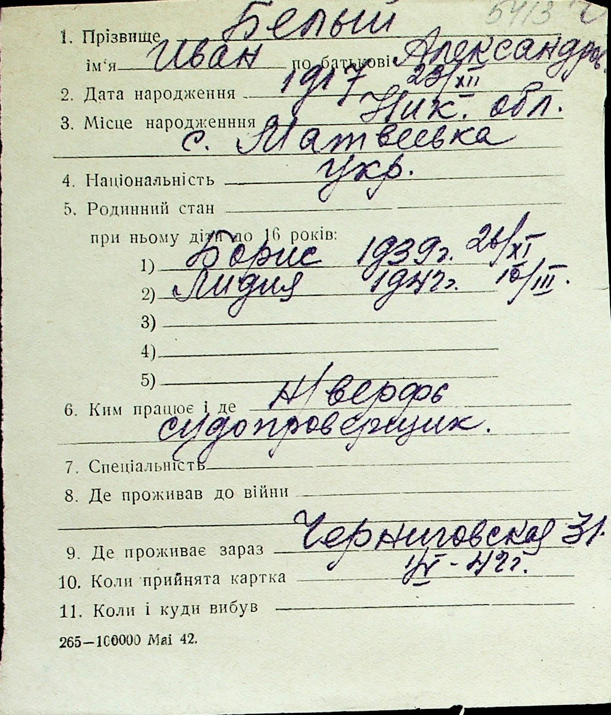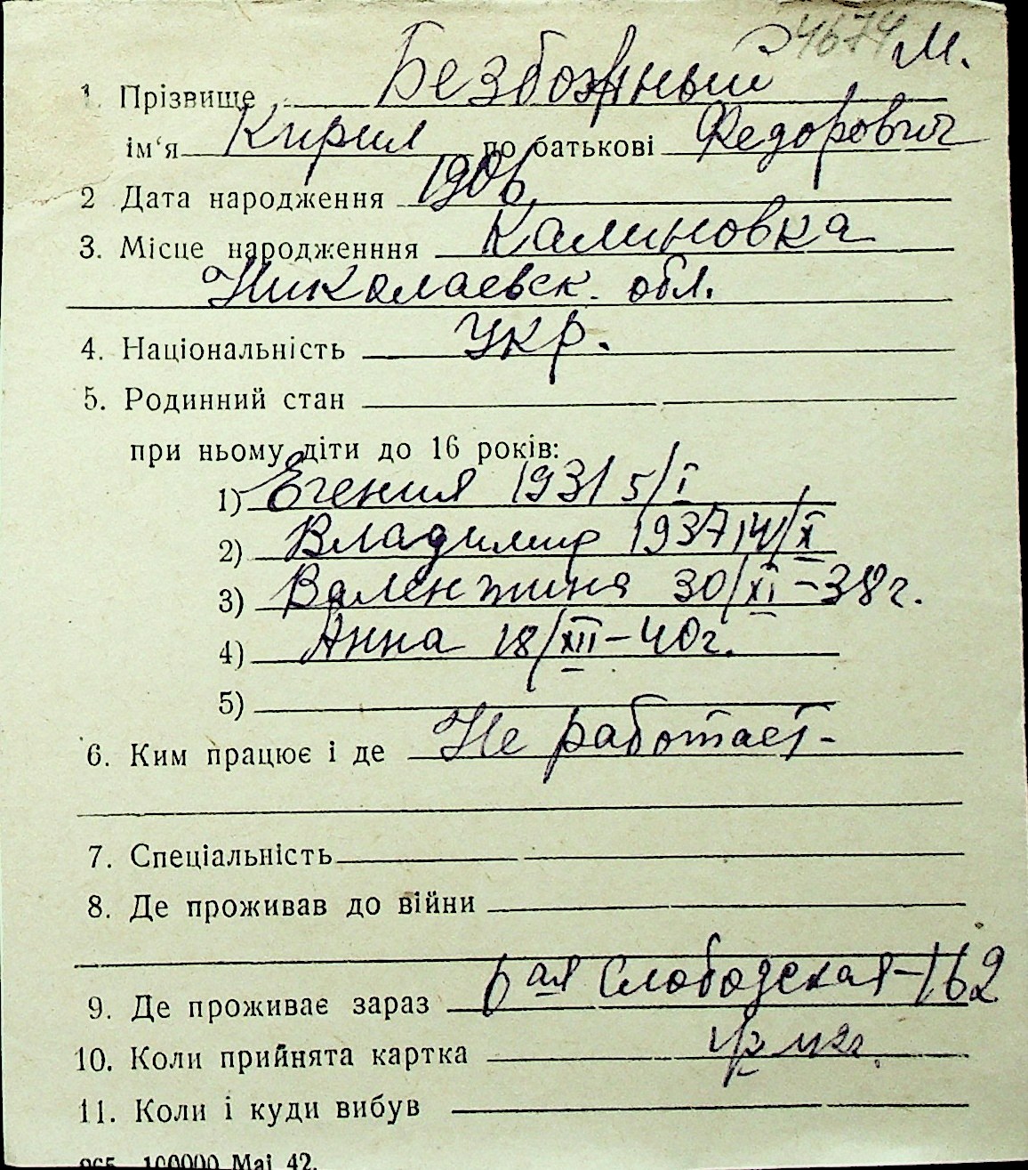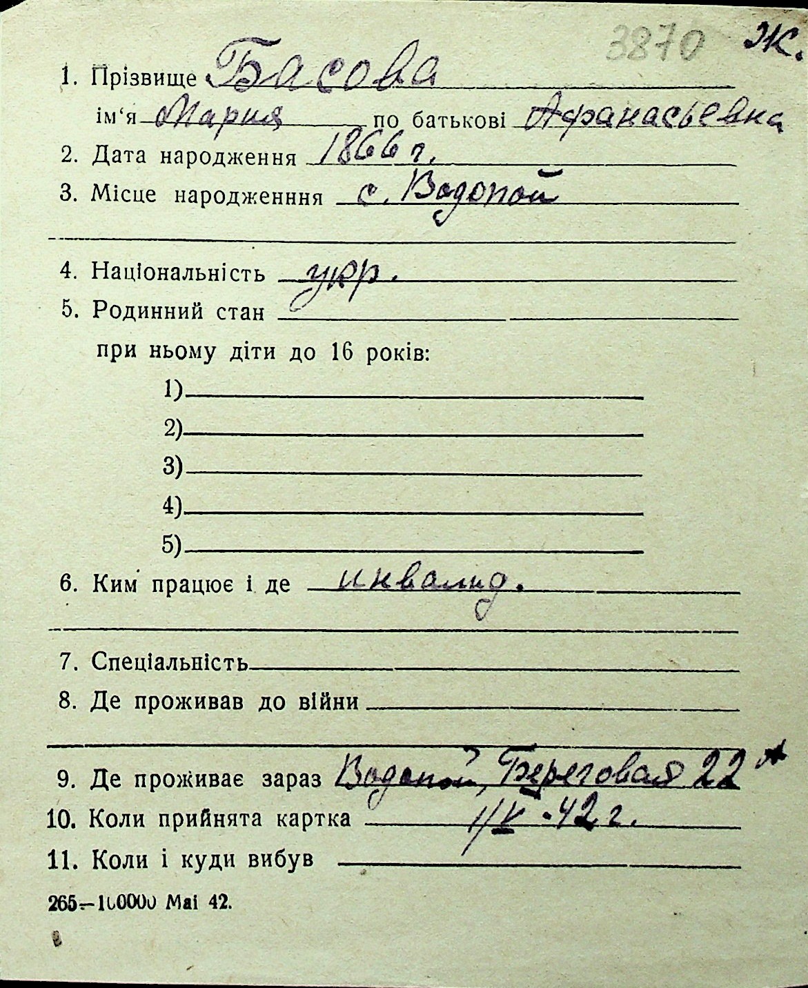 ◦ ◦ Перелік карток на осіб, які мешкали у м. Миколаїв у період окупації 1941–1944 років