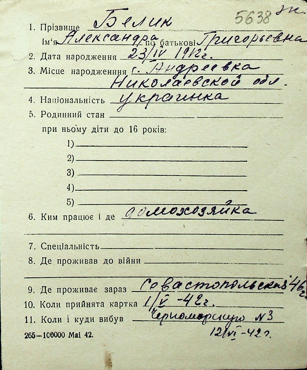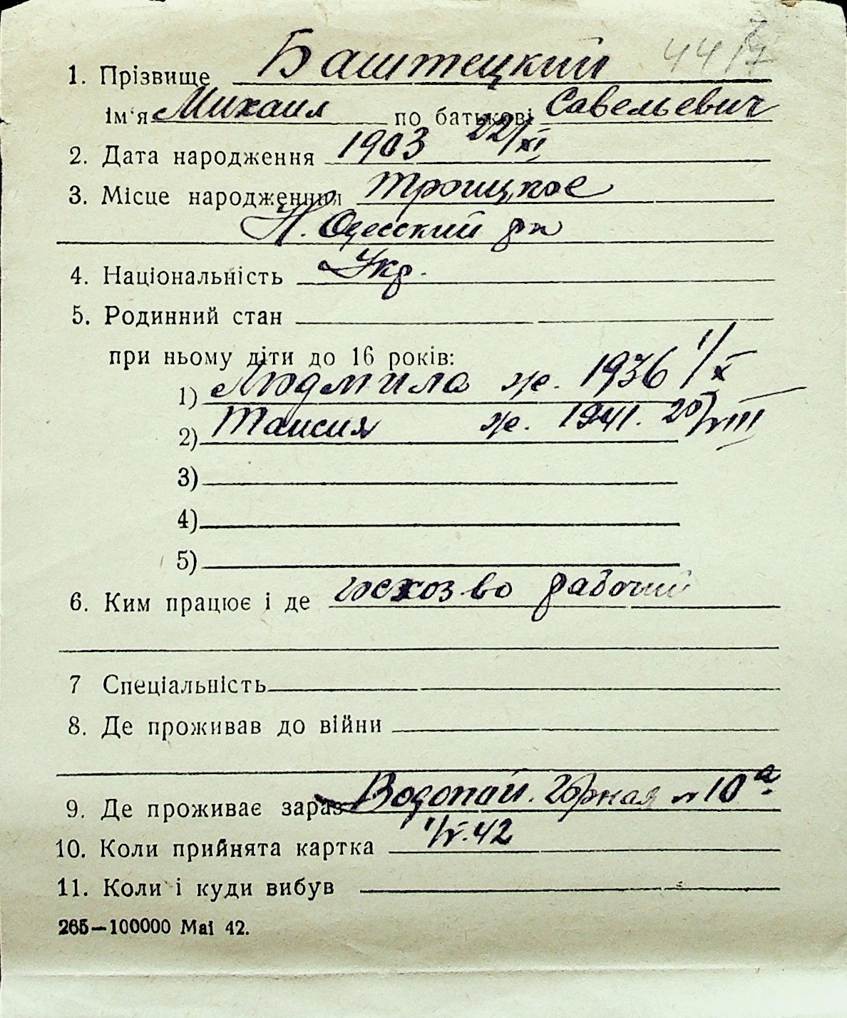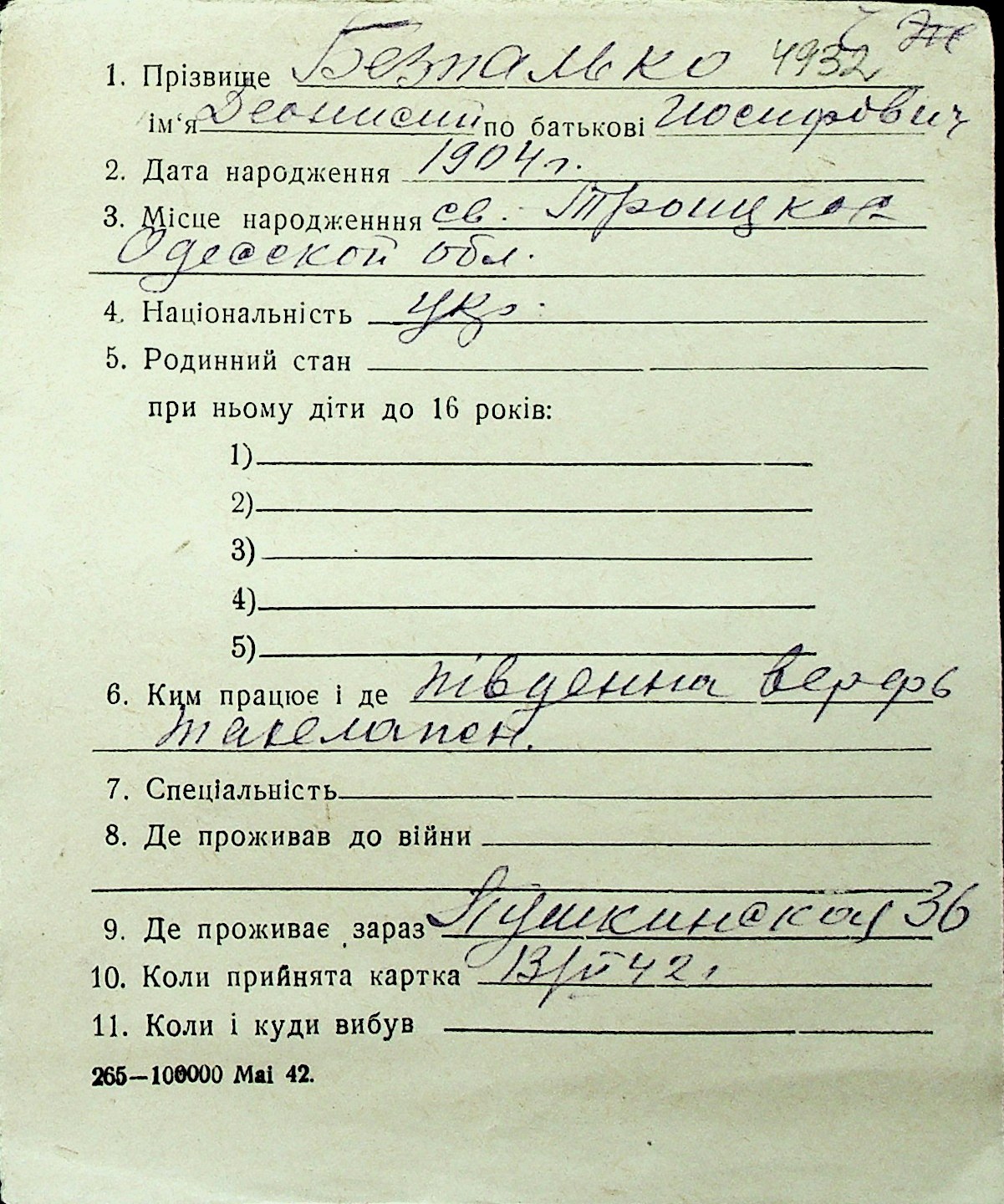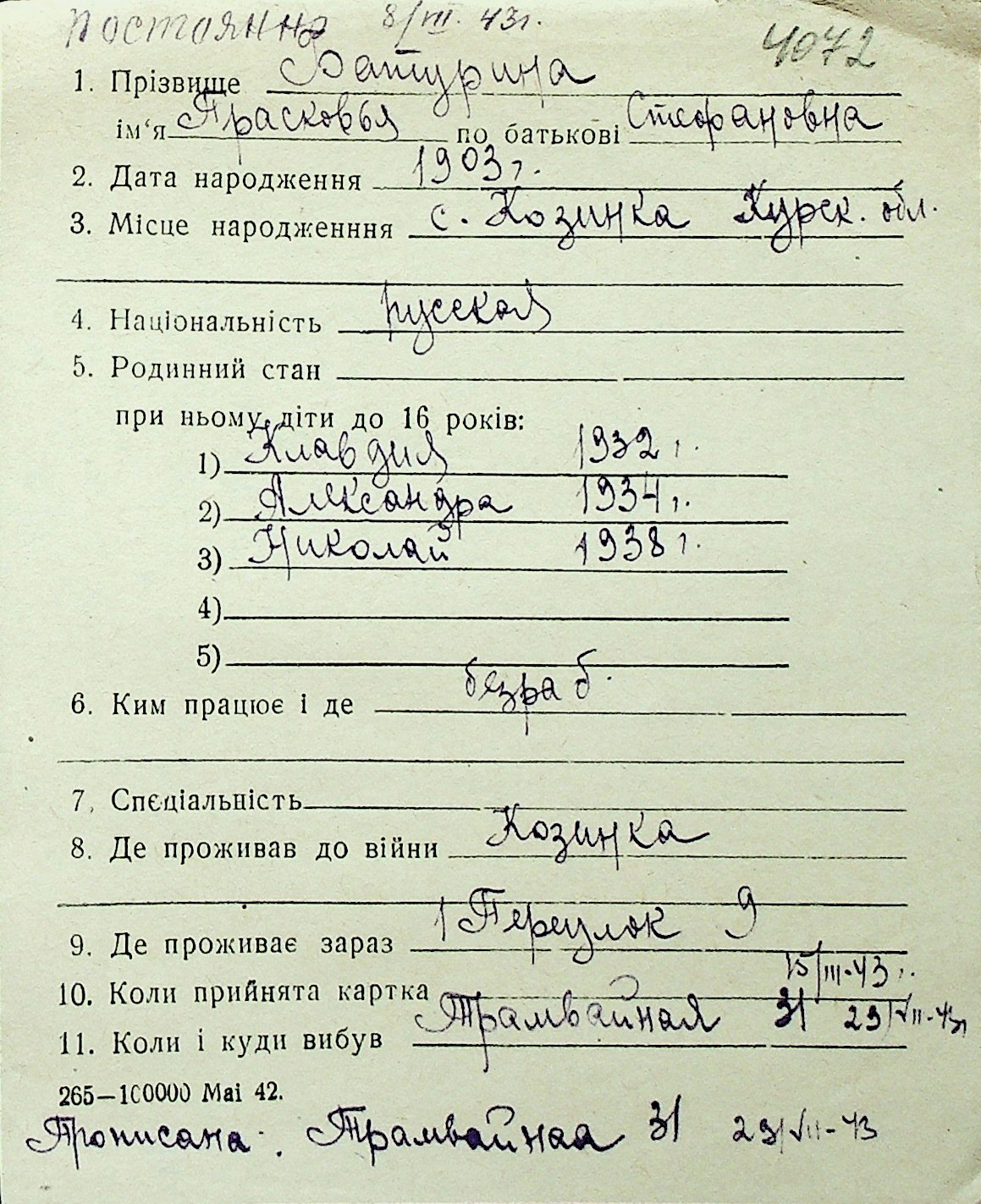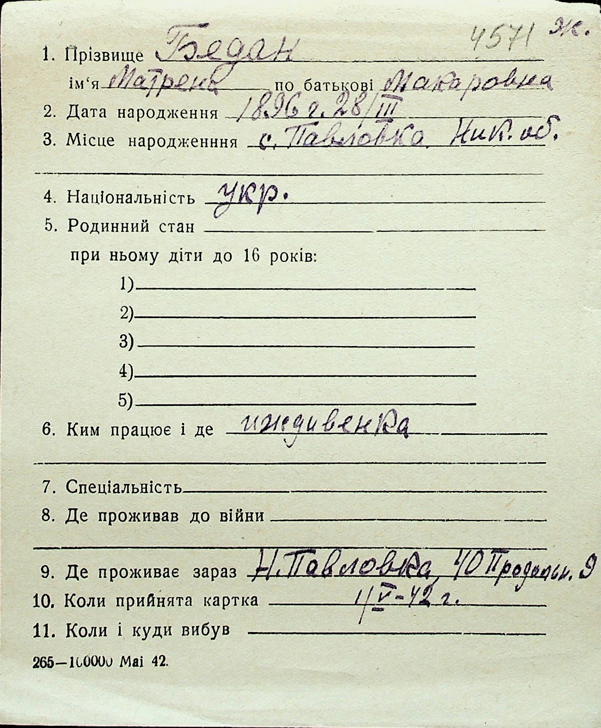 ◦ ◦ Перелік карток на осіб, які мешкали у м. Миколаїв у період окупації 1941–1944 років