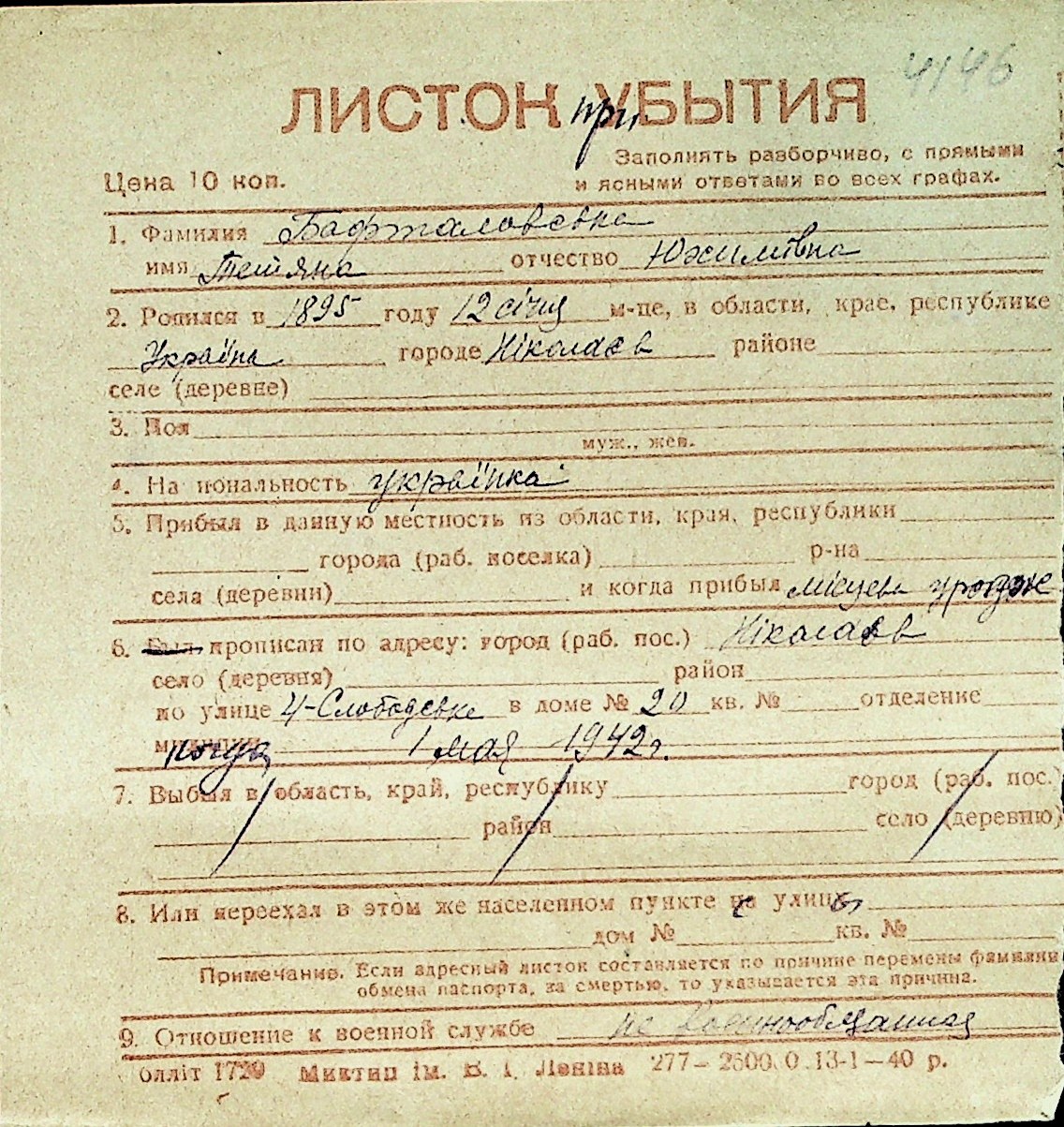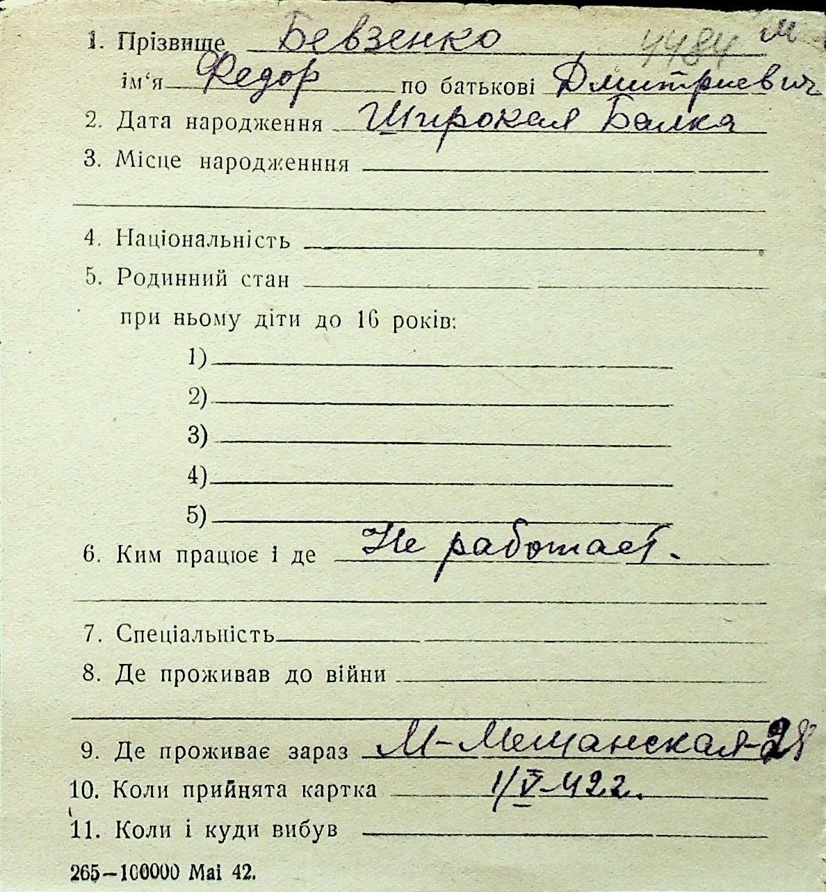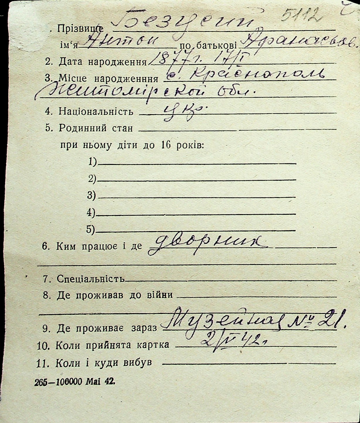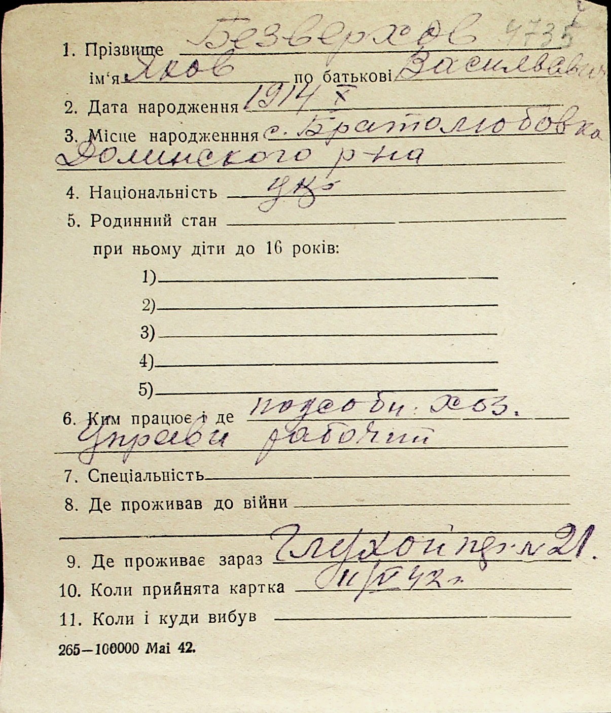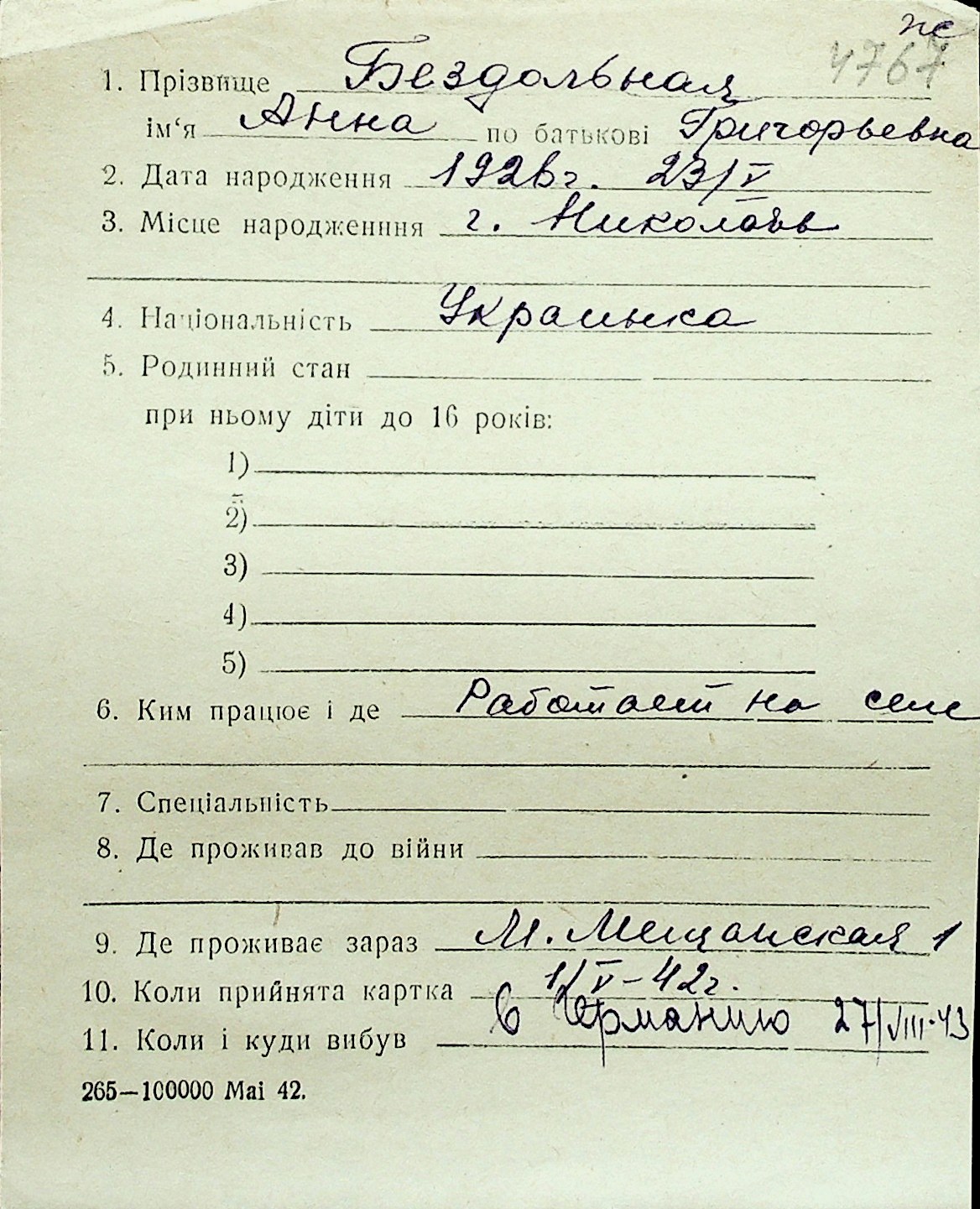 ◦ ◦ Перелік карток на осіб, які мешкали у м. Миколаїв у період окупації 1941–1944 років