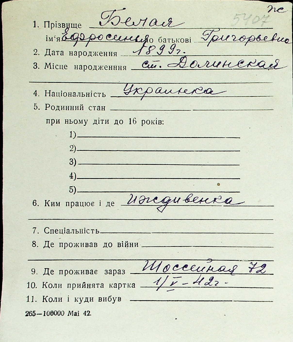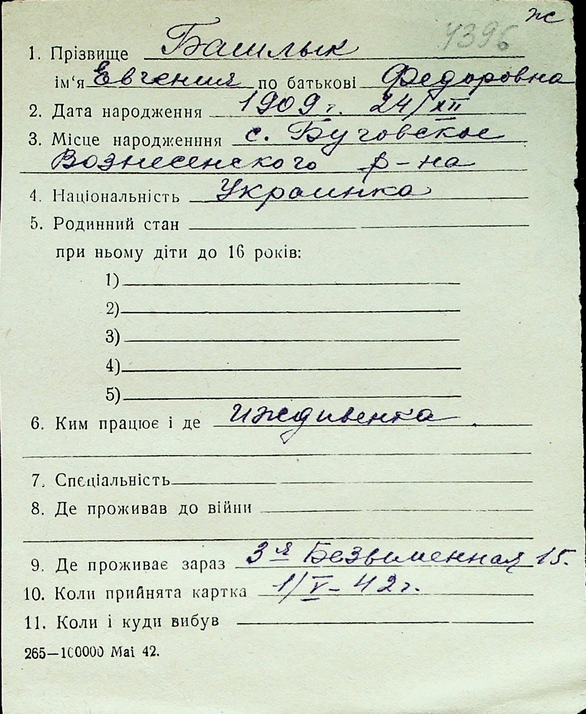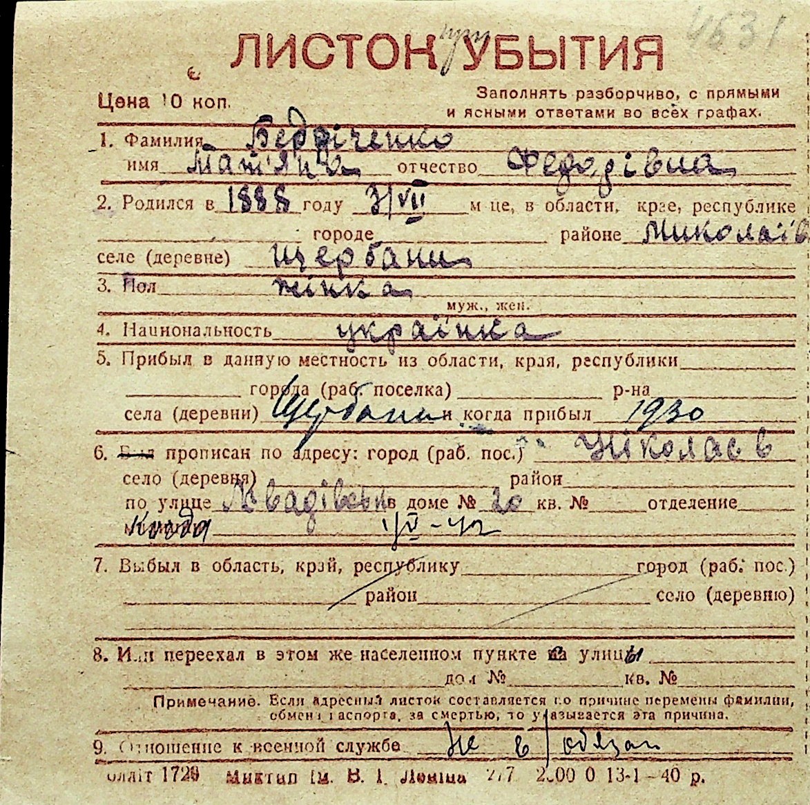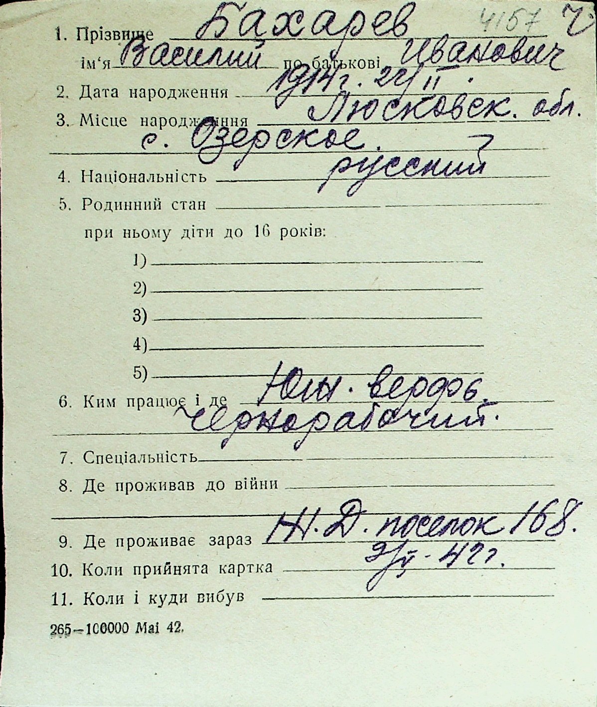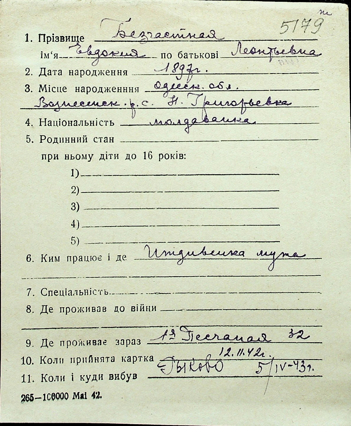 ◦ ◦ Перелік карток на осіб, які мешкали у м. Миколаїв у період окупації 1941–1944 років