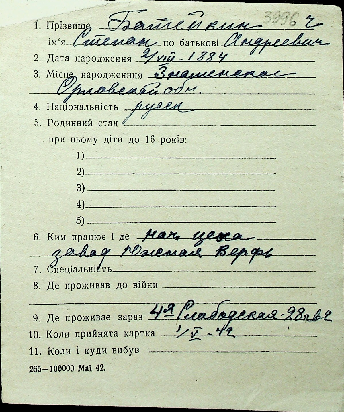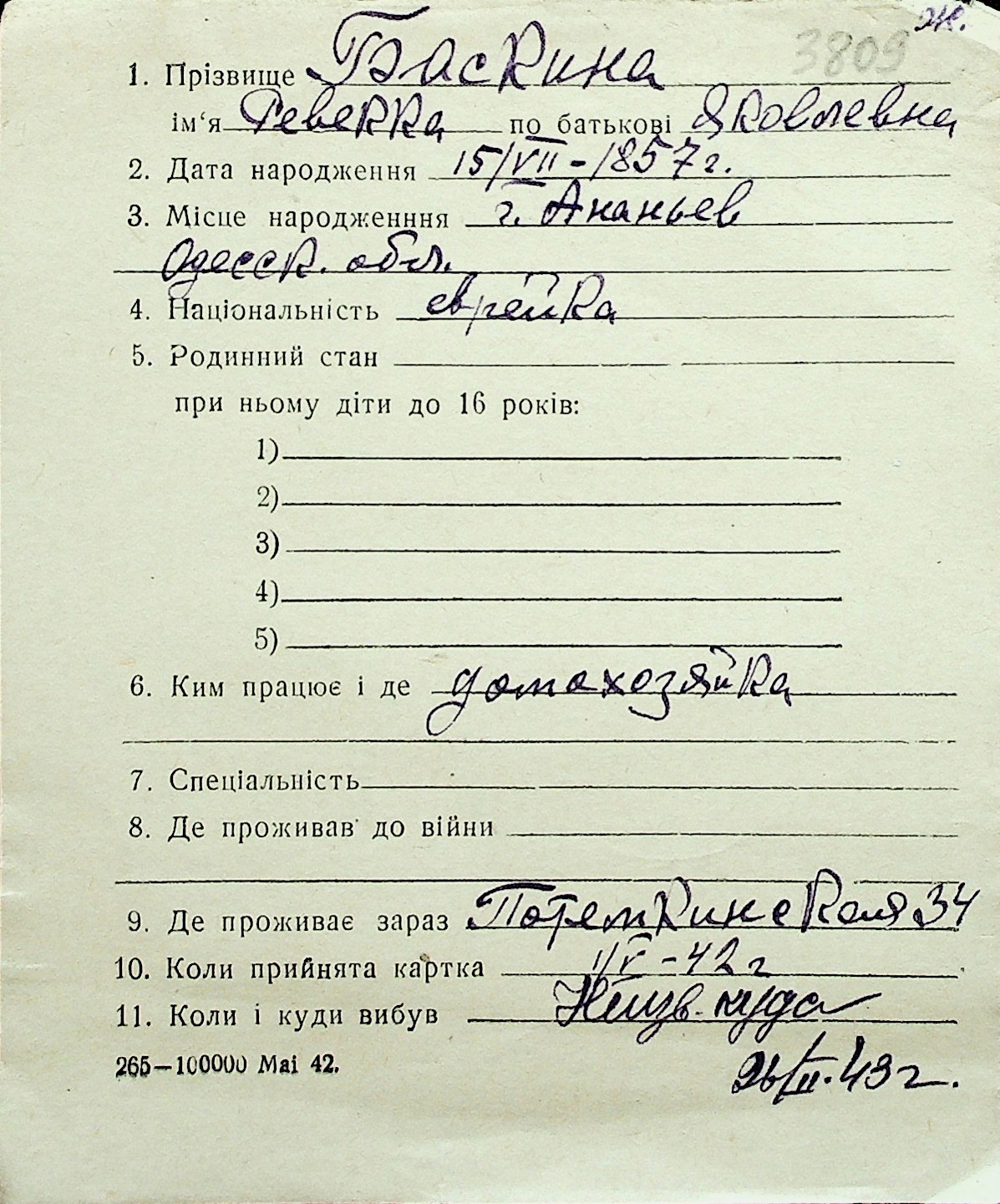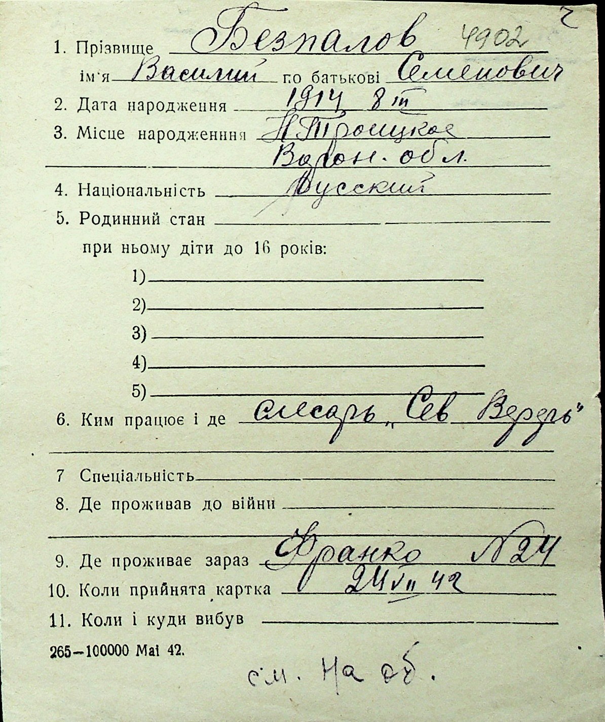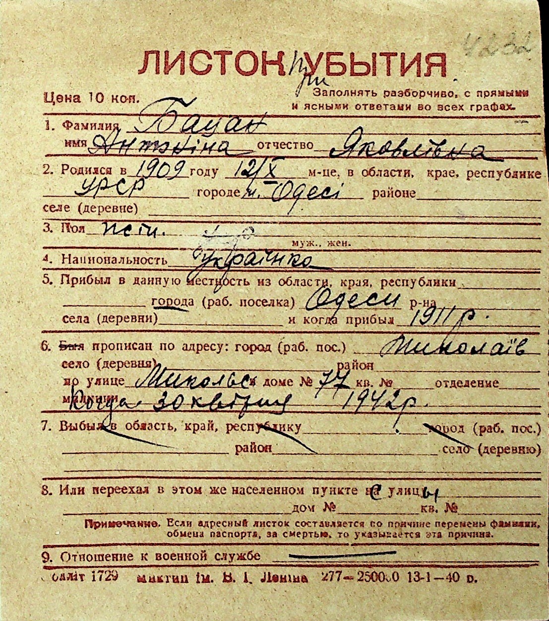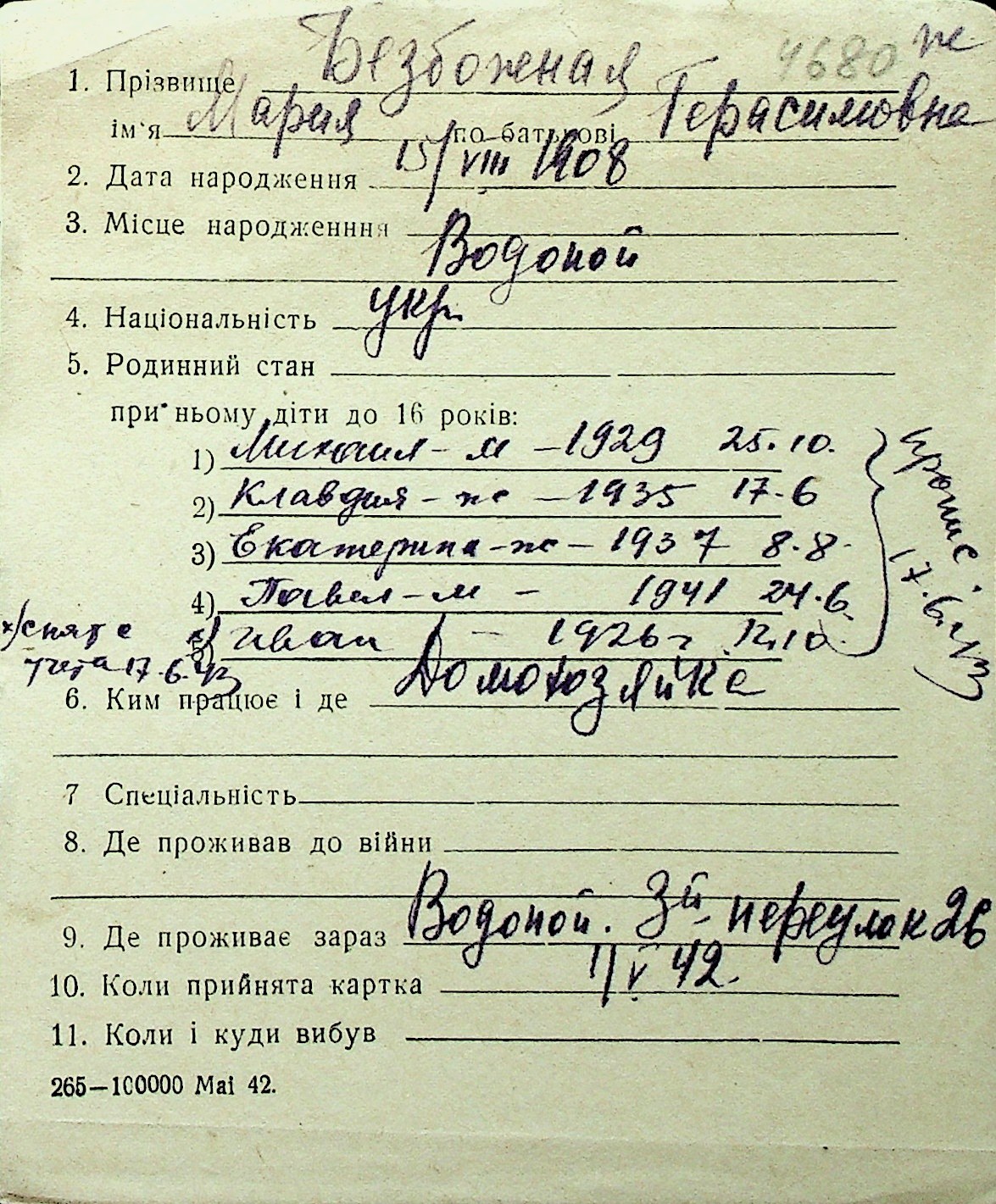 ◦ ◦ Перелік карток на осіб, які мешкали у м. Миколаїв у період окупації 1941–1944 років