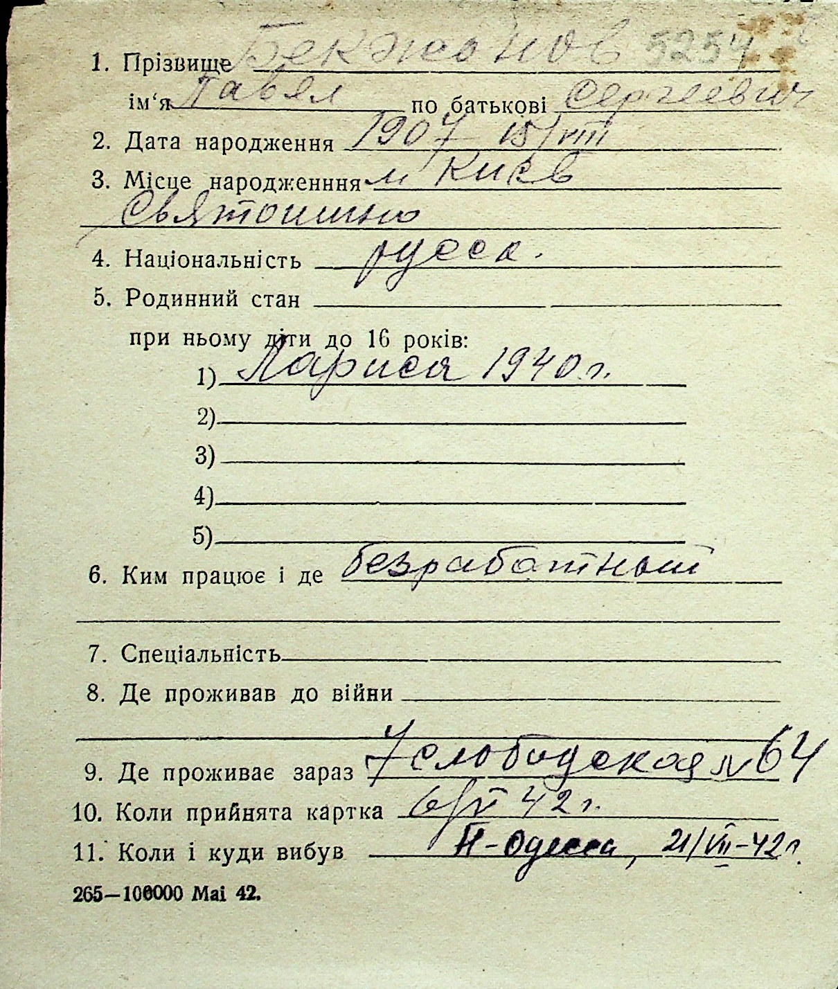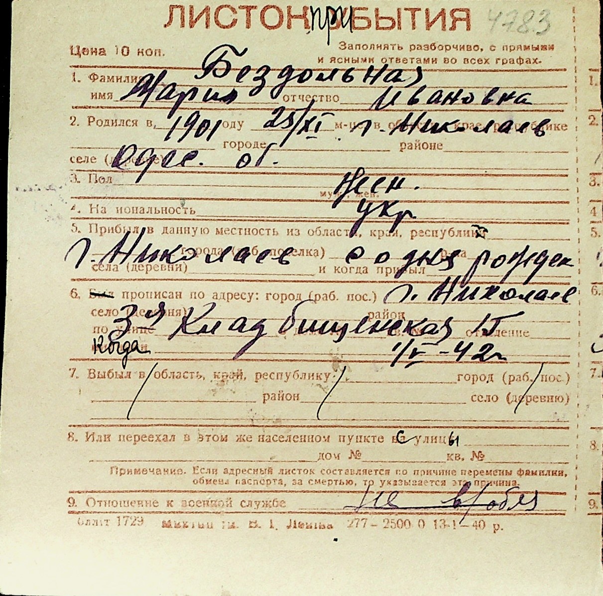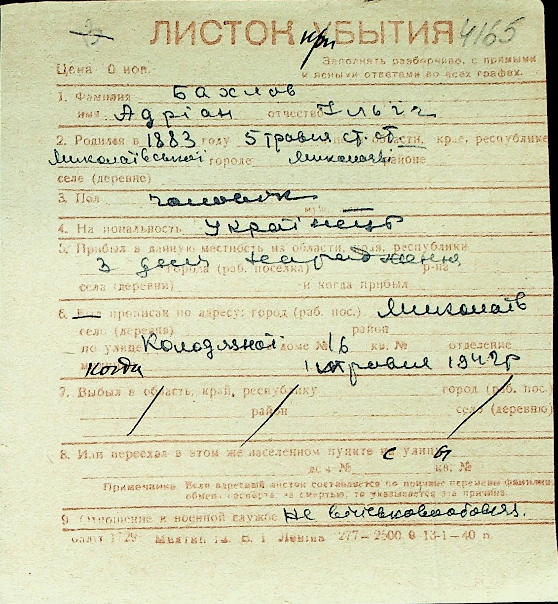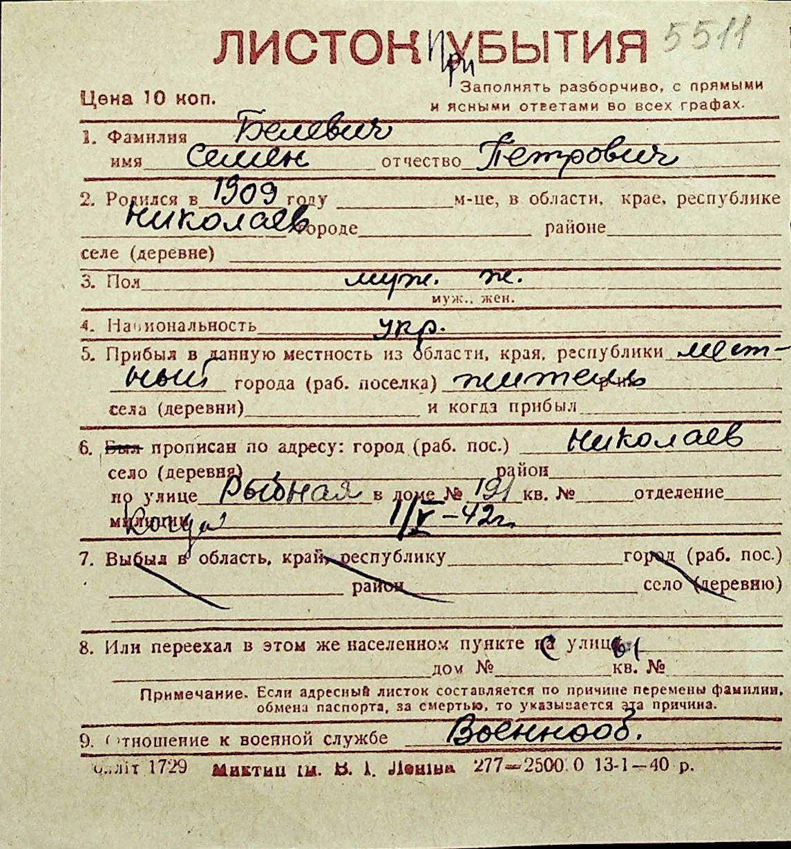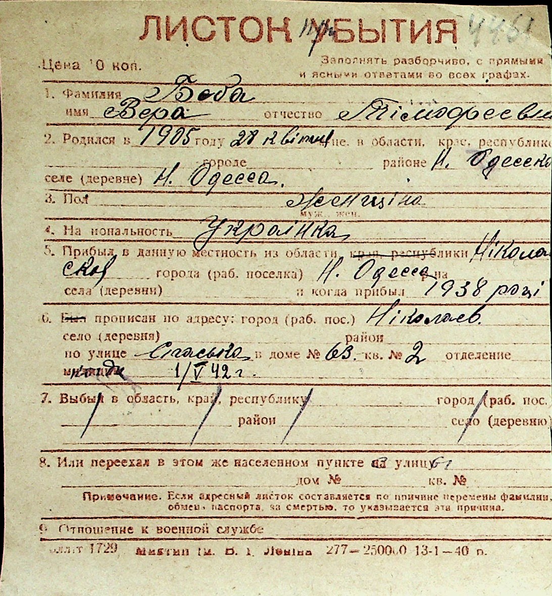 ◦ ◦ Перелік карток на осіб, які мешкали у м. Миколаїв у період окупації 1941–1944 років