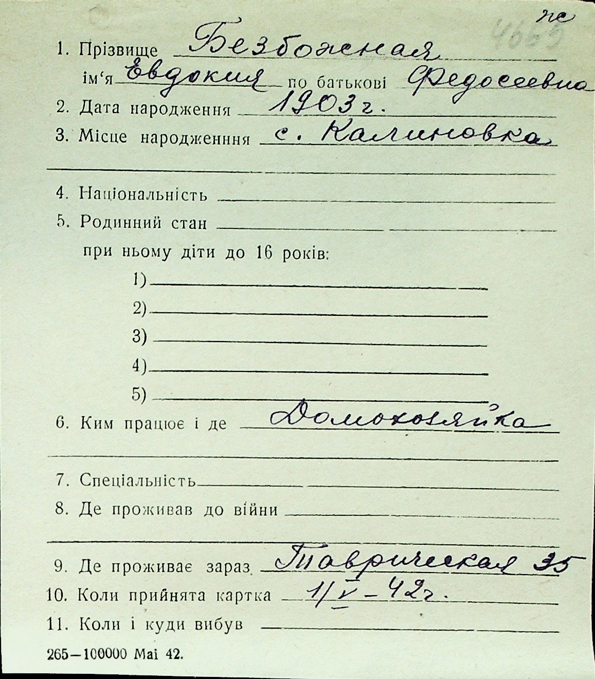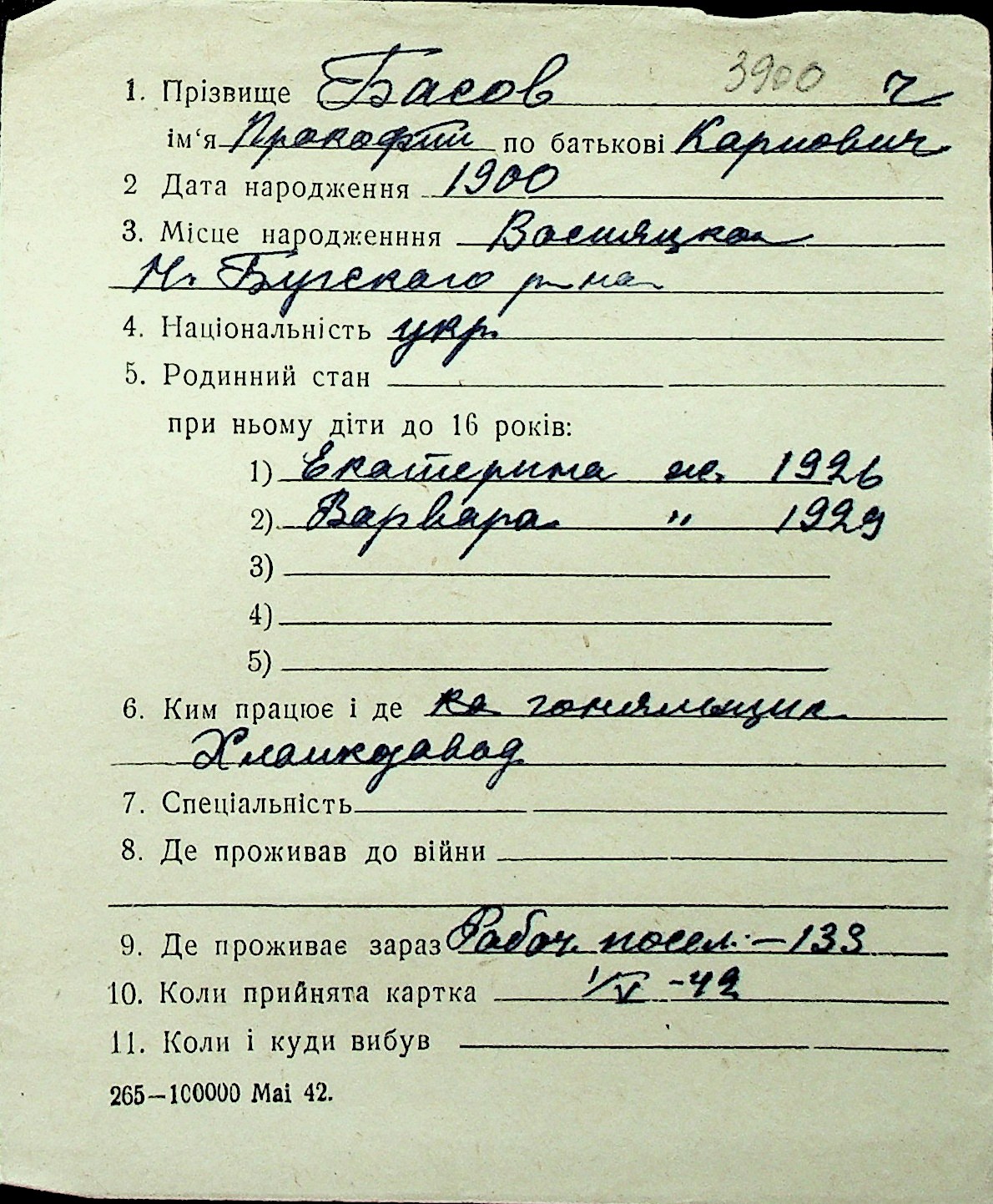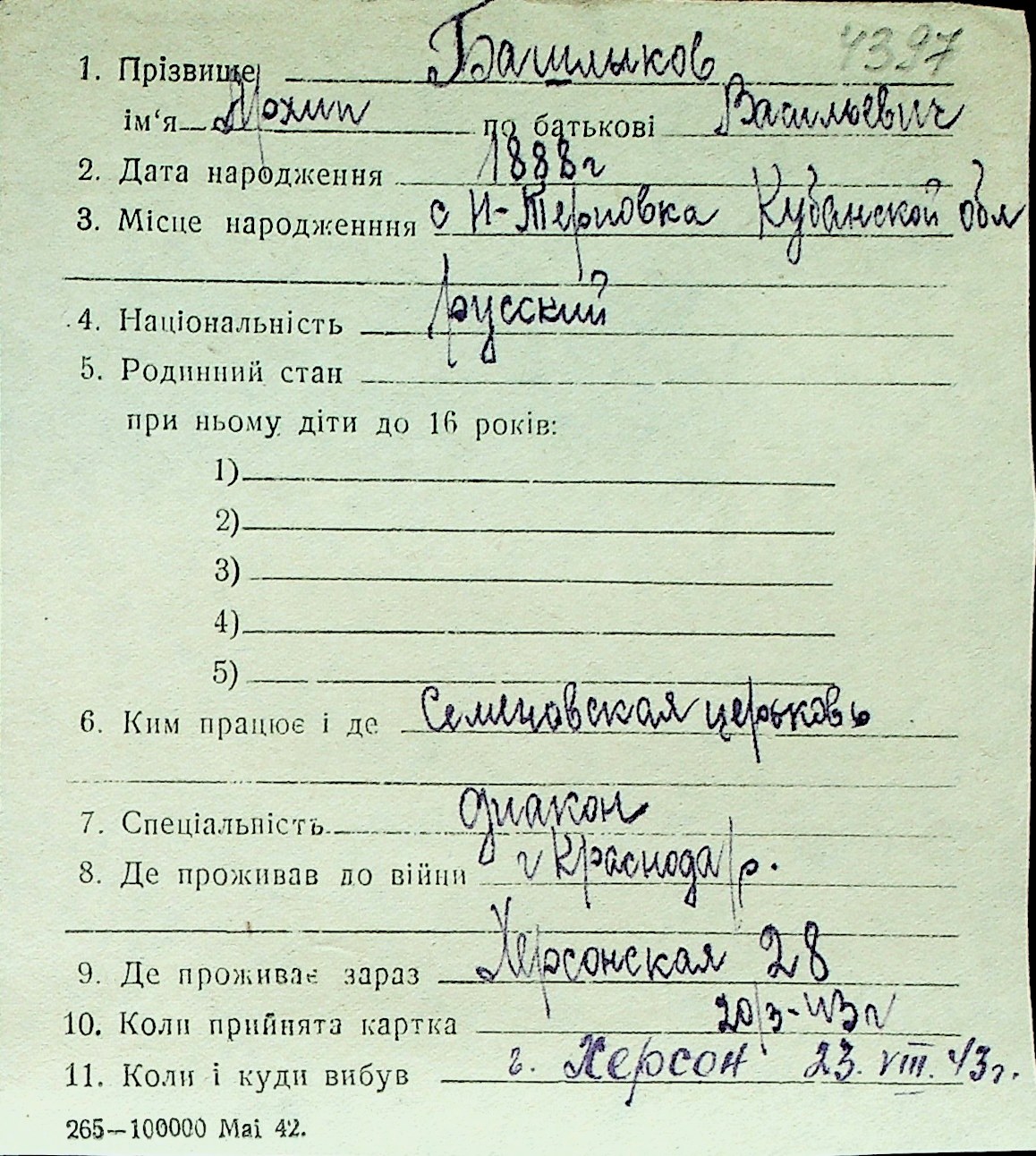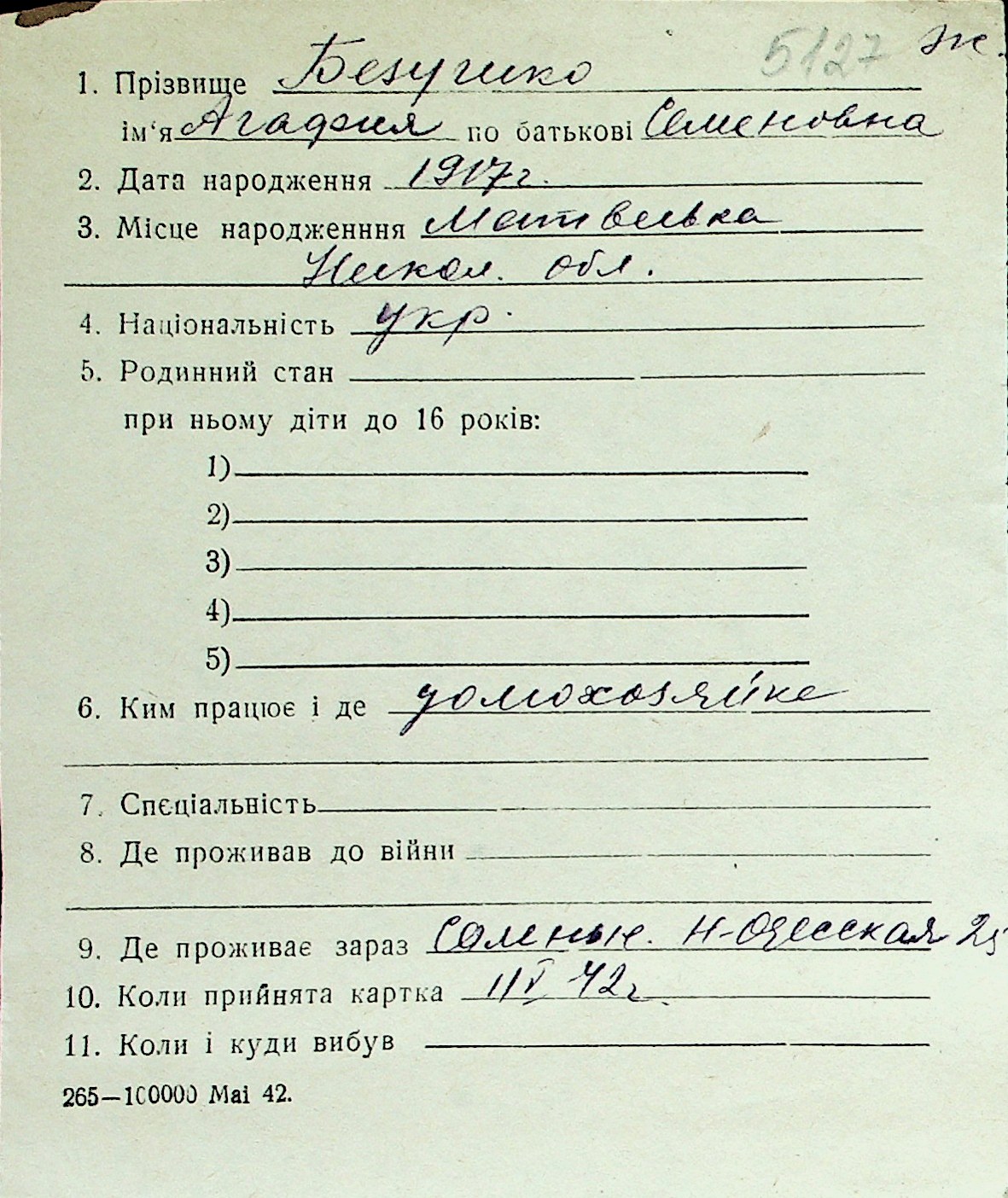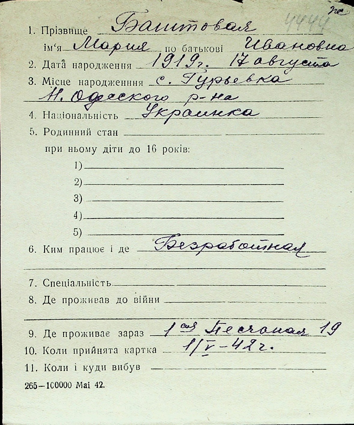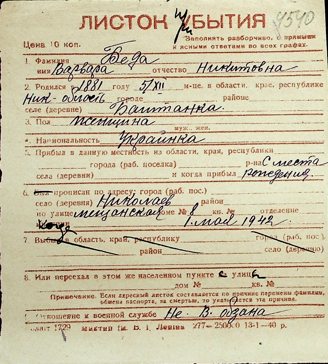◦ ◦ Перелік карток на осіб, які мешкали у м. Миколаїв у період окупації 1941–1944 років