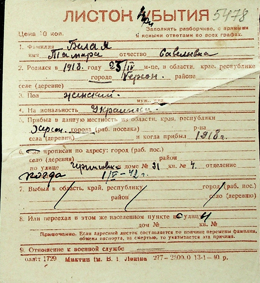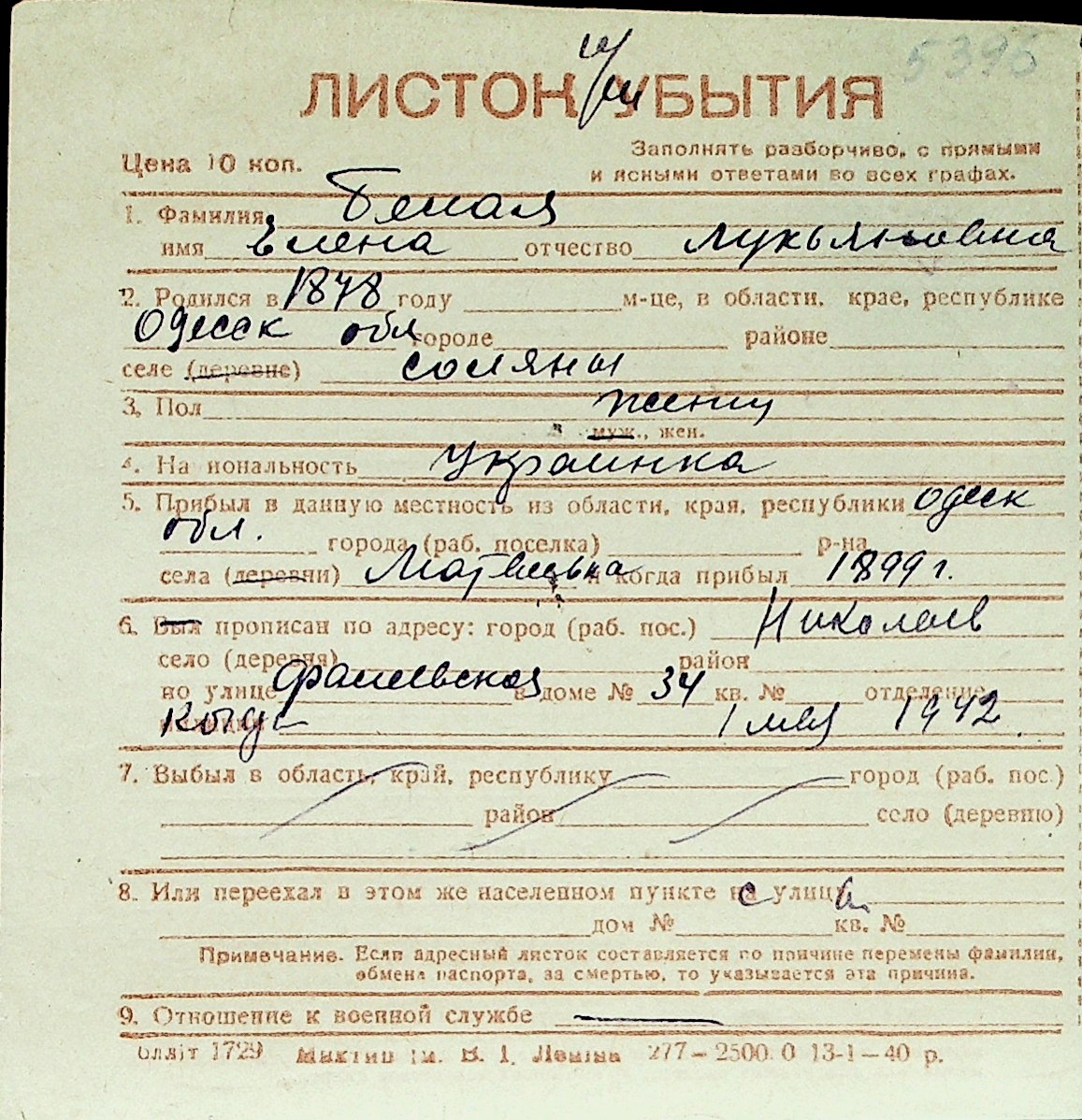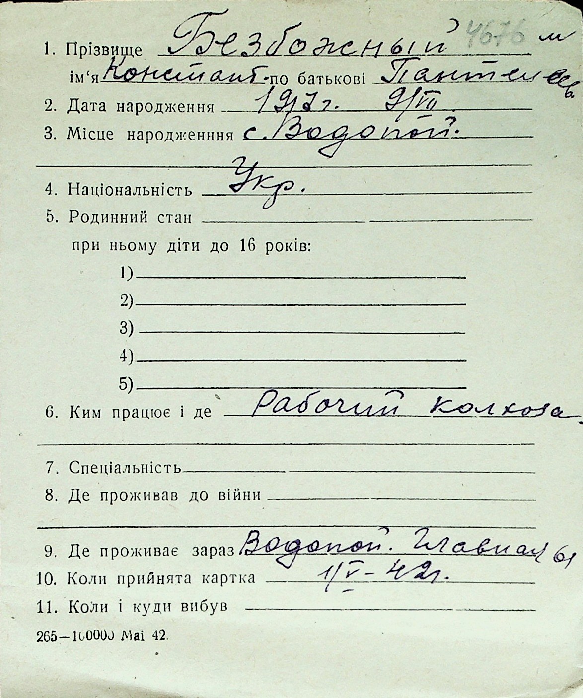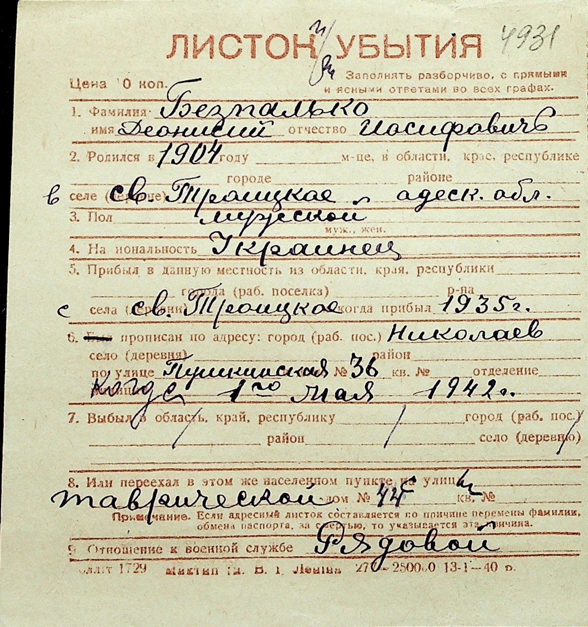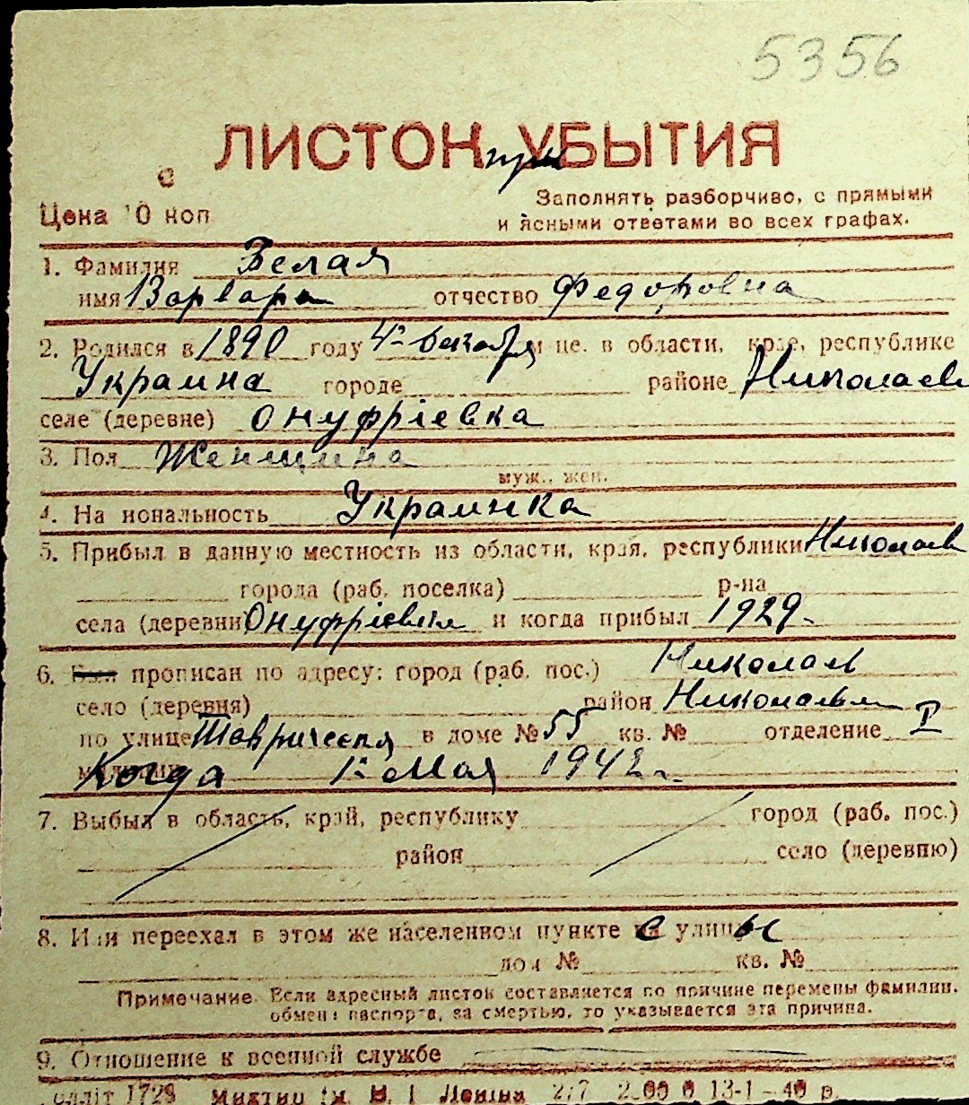 ◦ ◦ Перелік карток на осіб, які мешкали у м. Миколаїв у період окупації 1941–1944 років