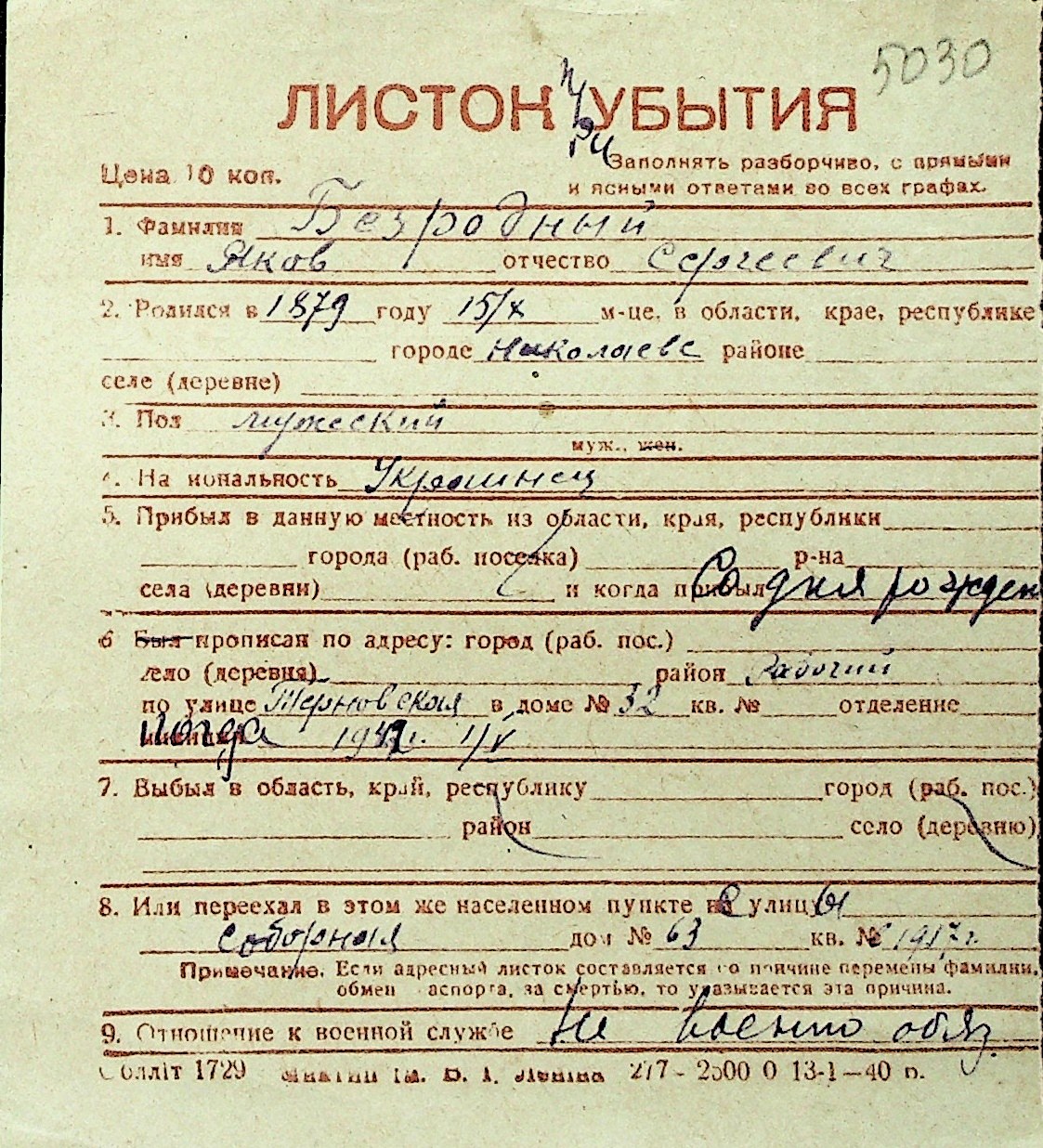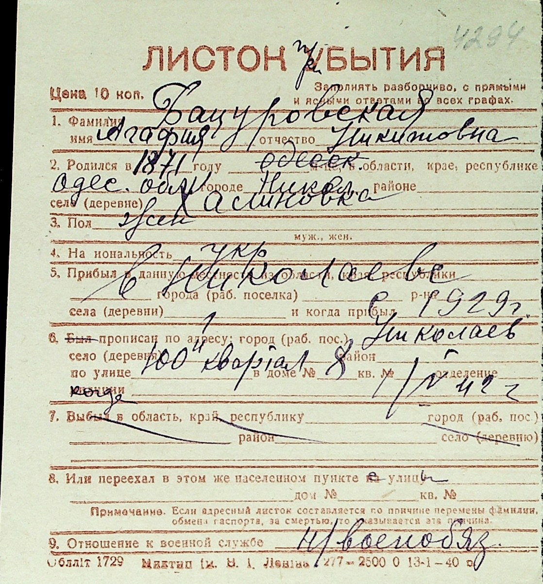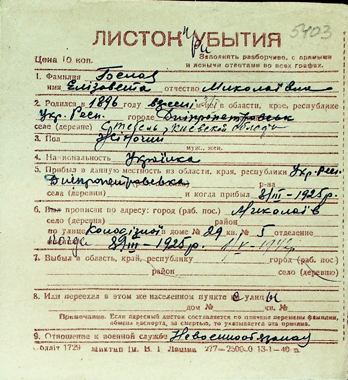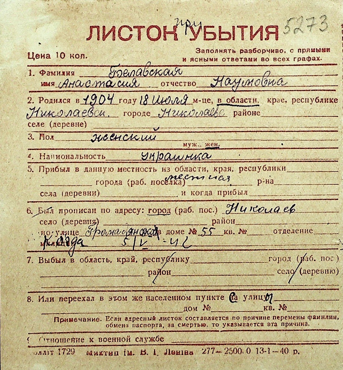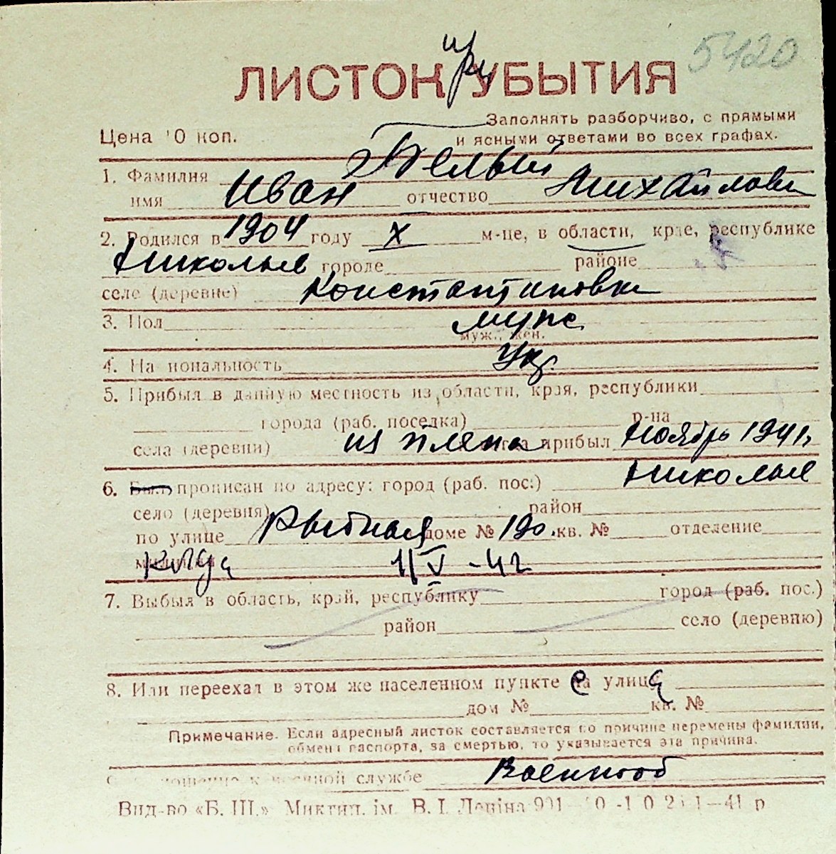 ◦ ◦ Перелік карток на осіб, які мешкали у м. Миколаїв у період окупації 1941–1944 років