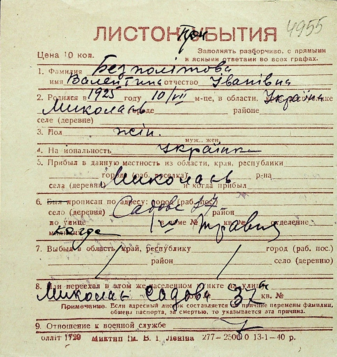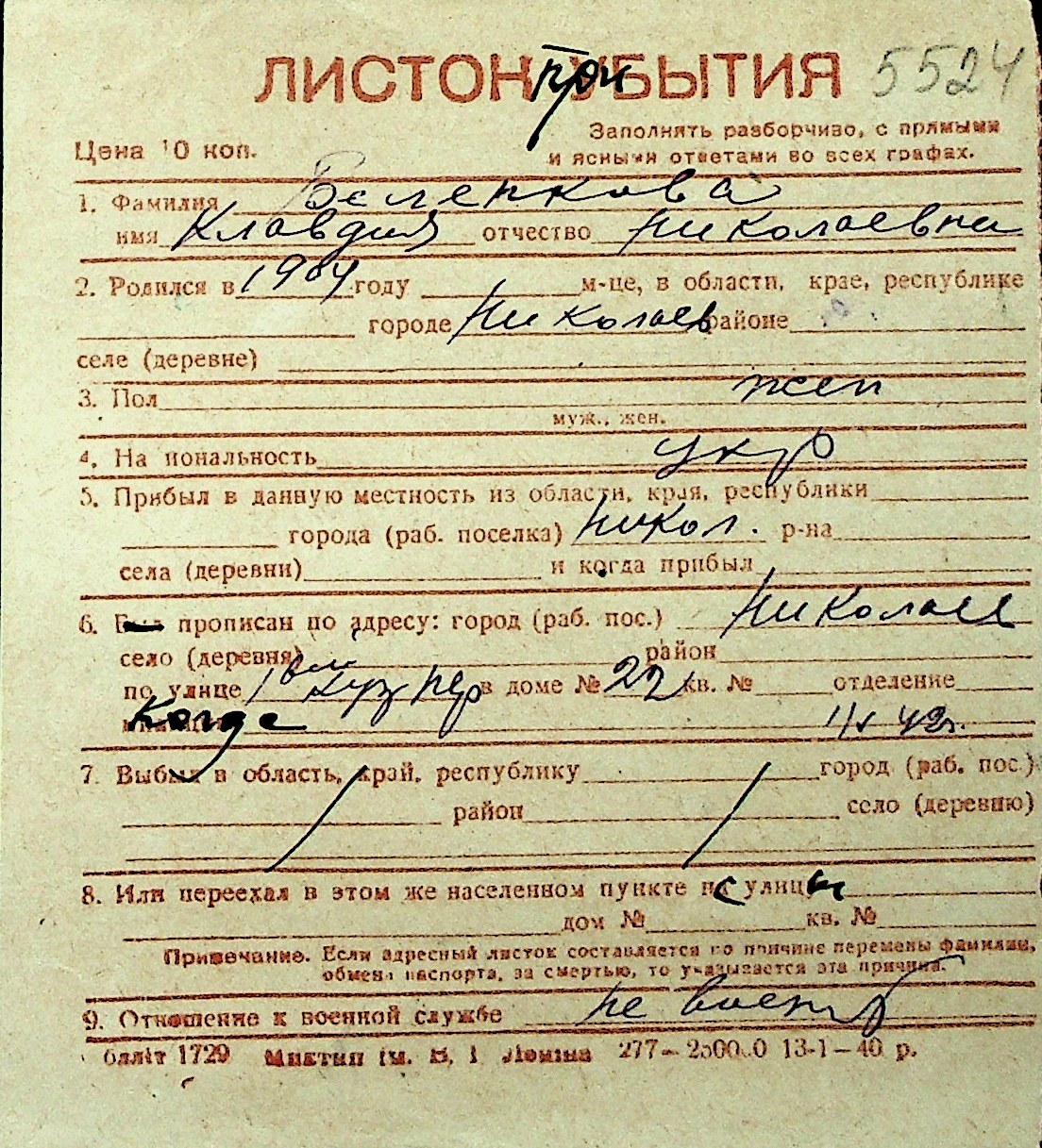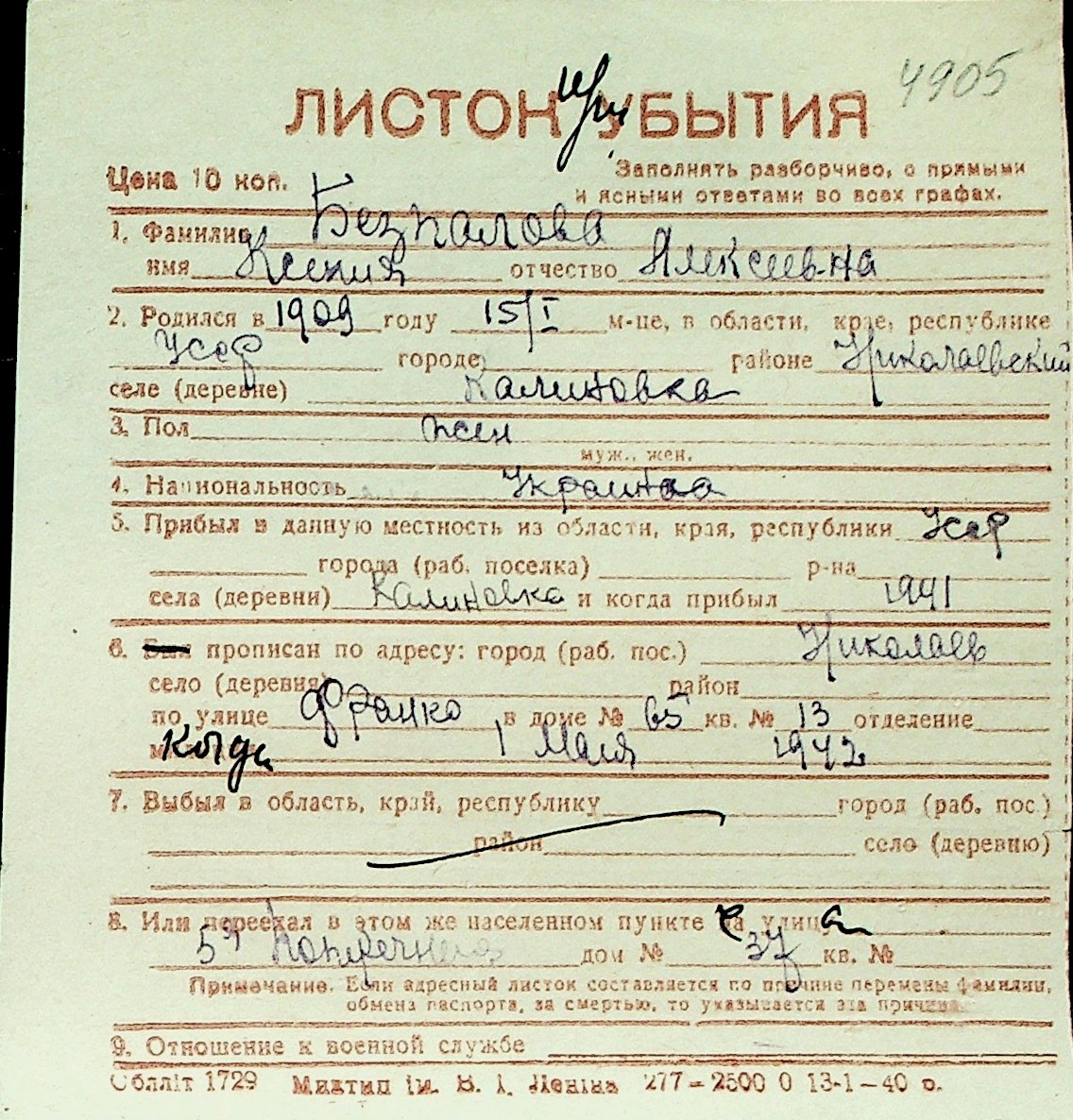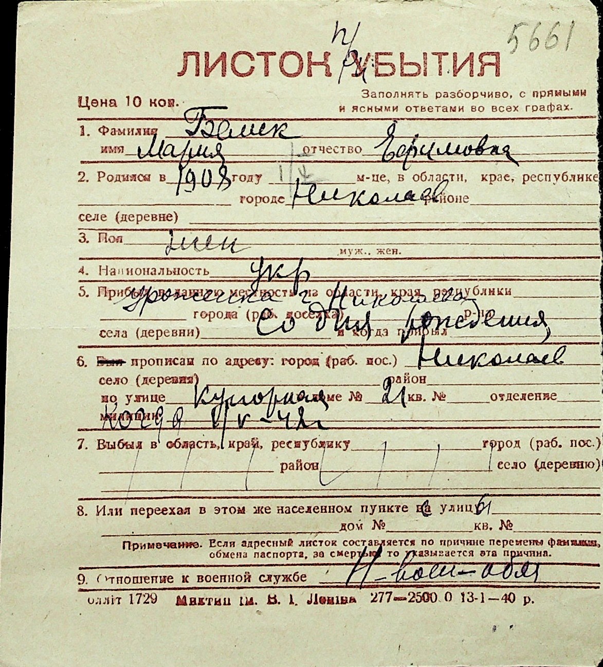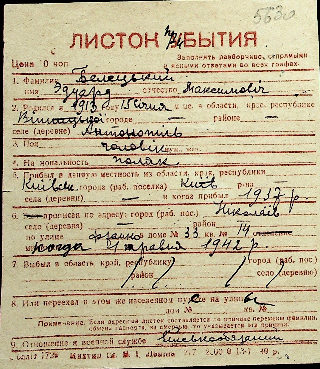 ◦ ◦ Перелік карток на осіб, які мешкали у м. Миколаїв у період окупації 1941–1944 років