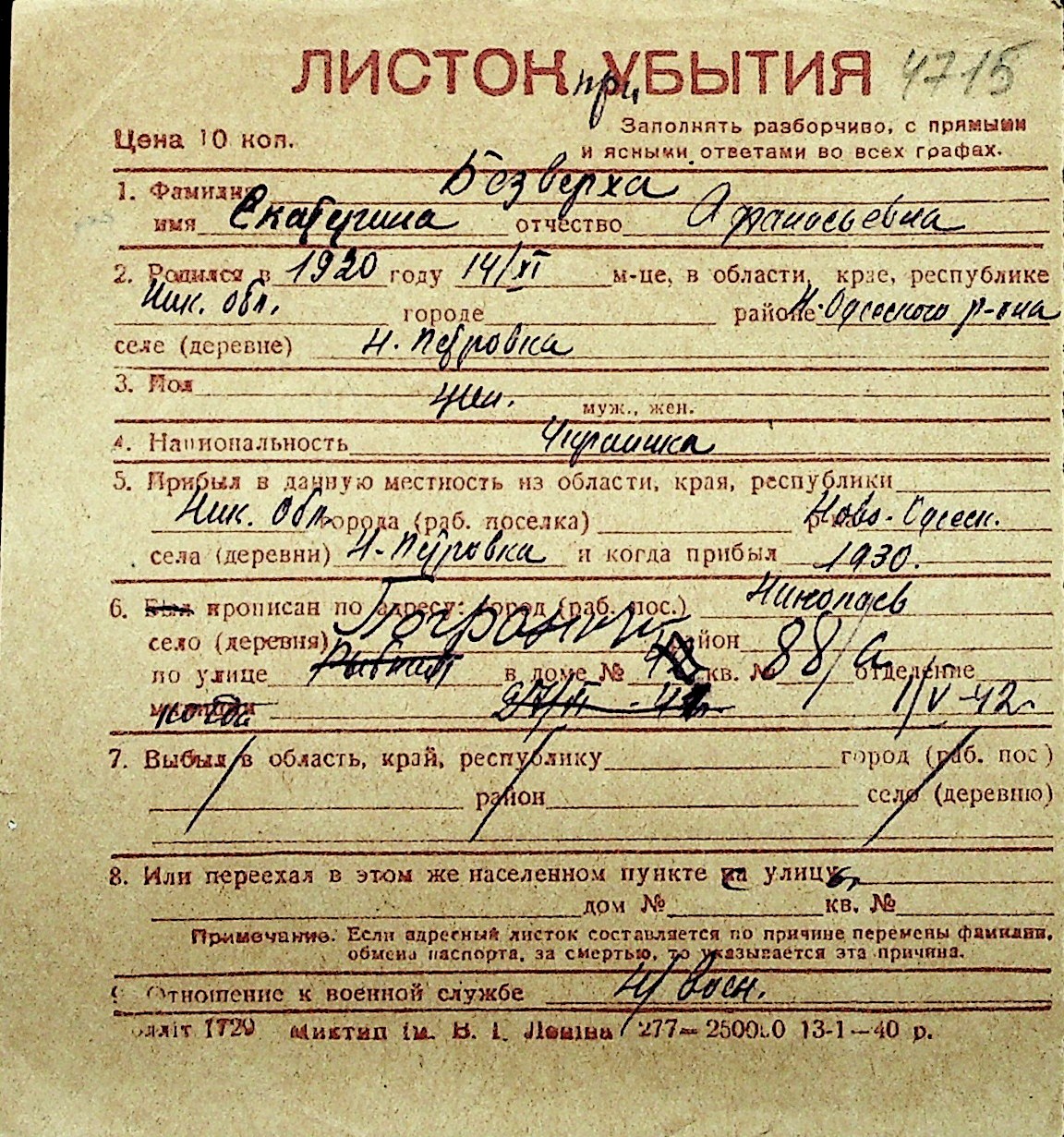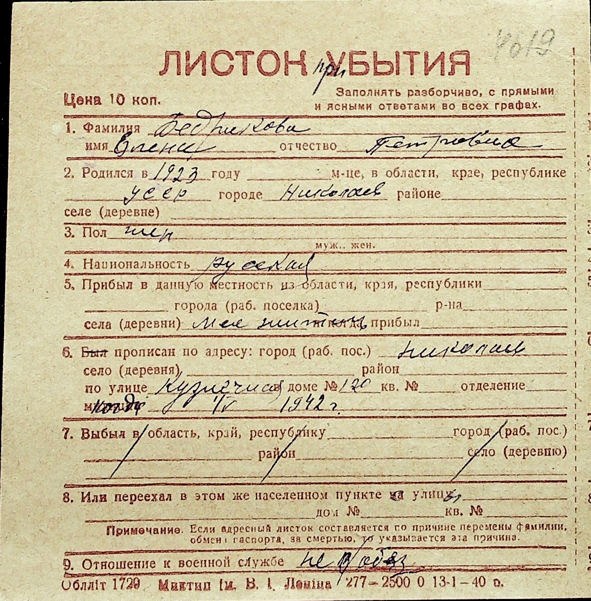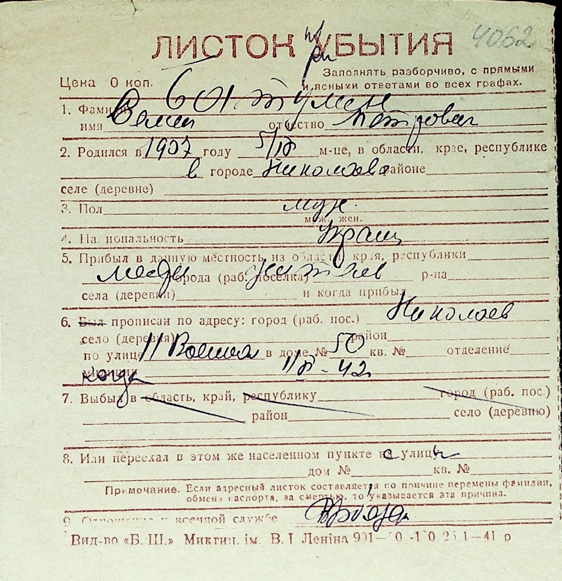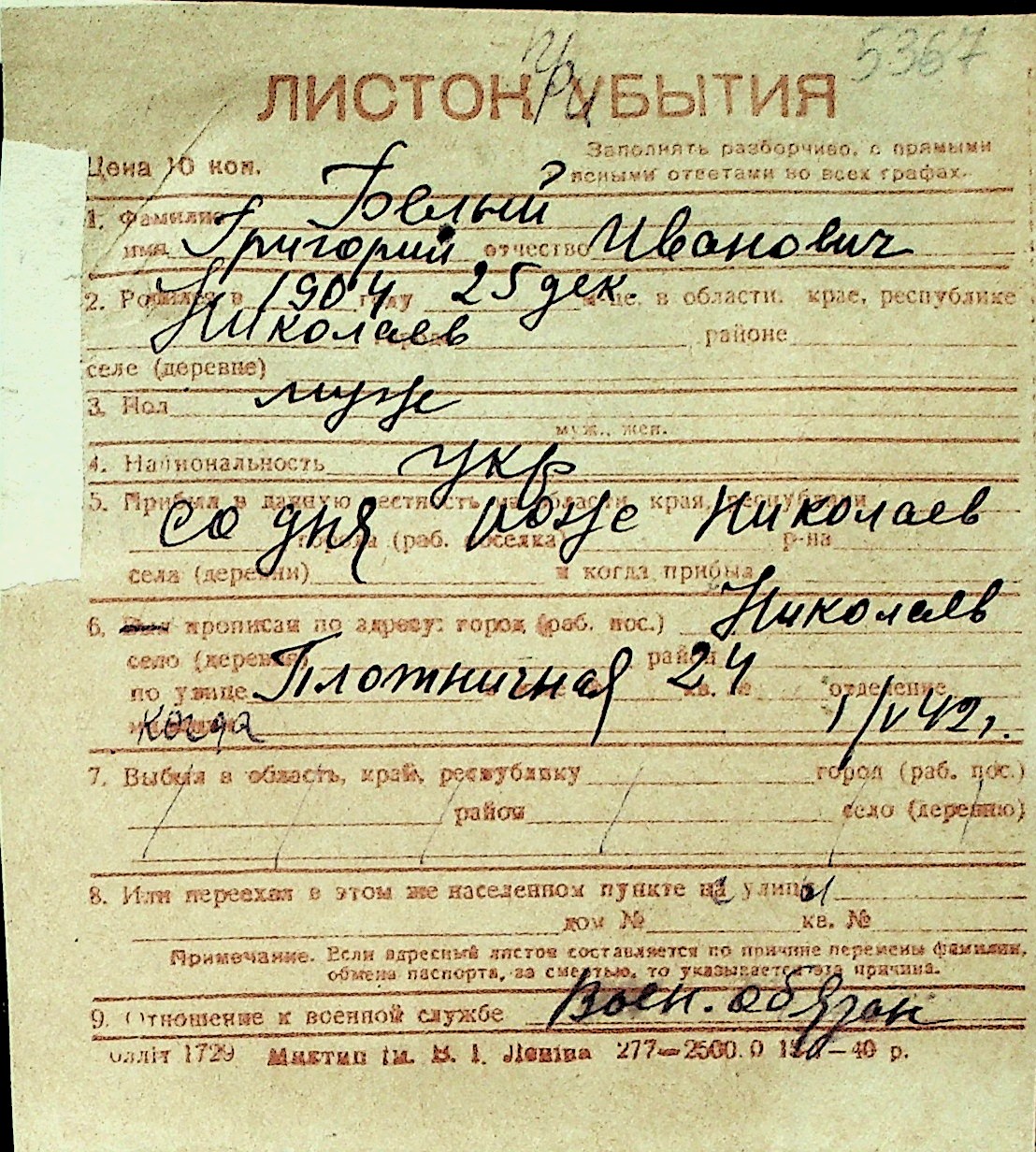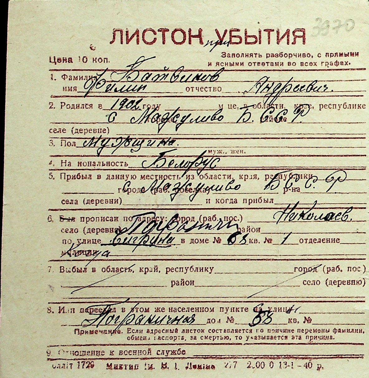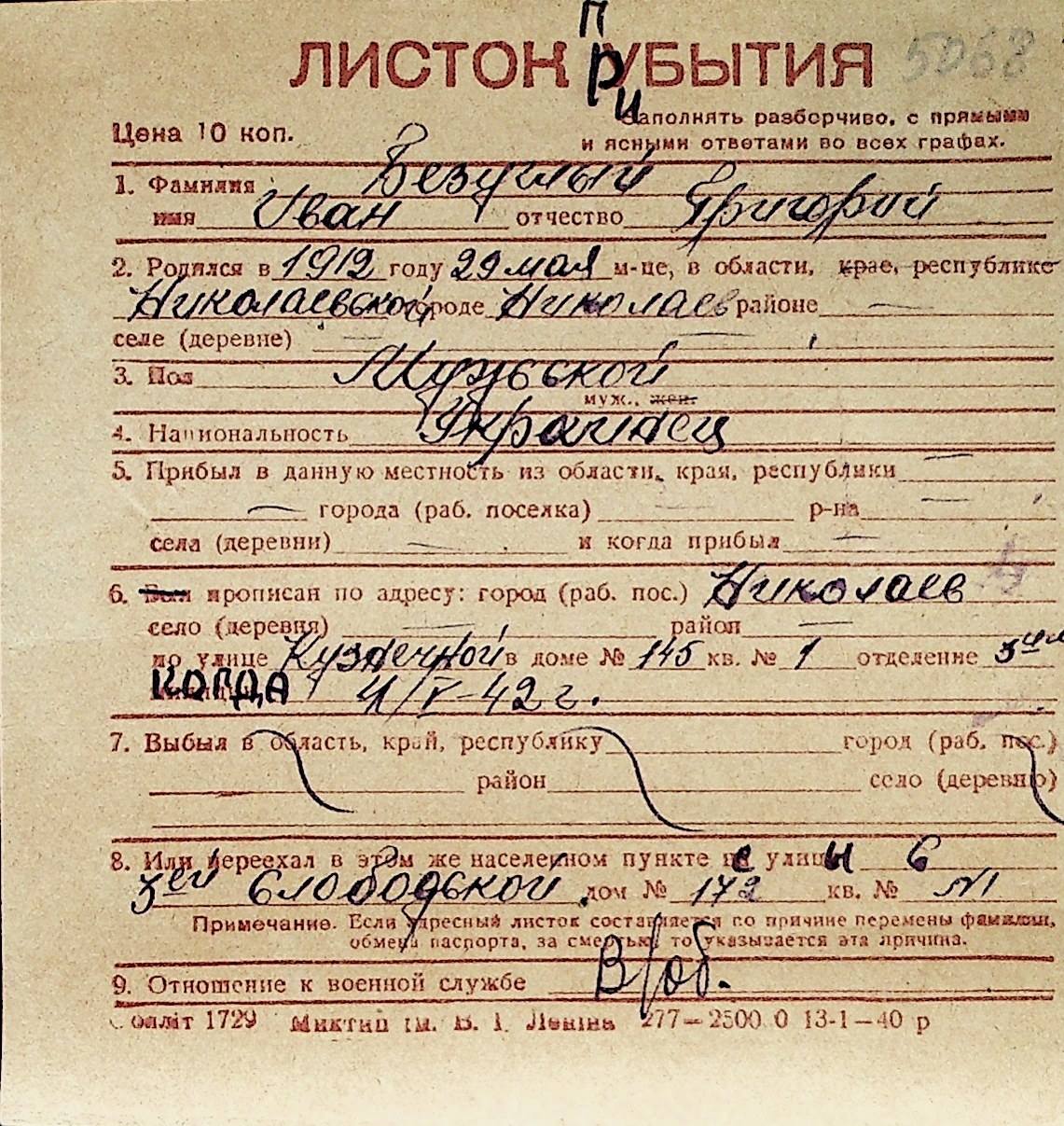 ◦ ◦ Перелік карток на осіб, які мешкали у м. Миколаїв у період окупації 1941–1944 років