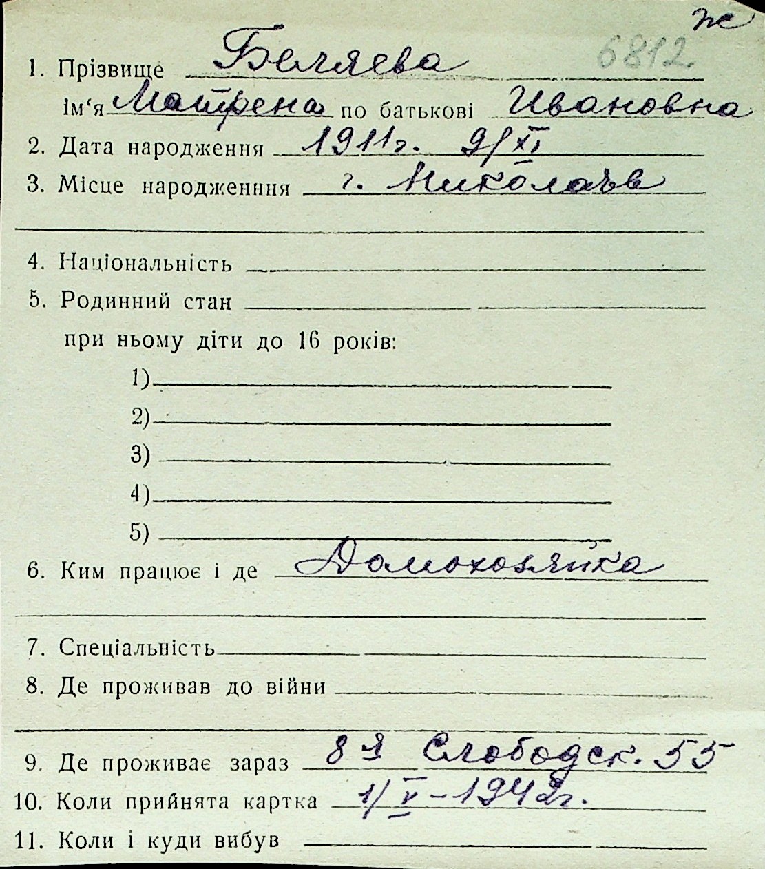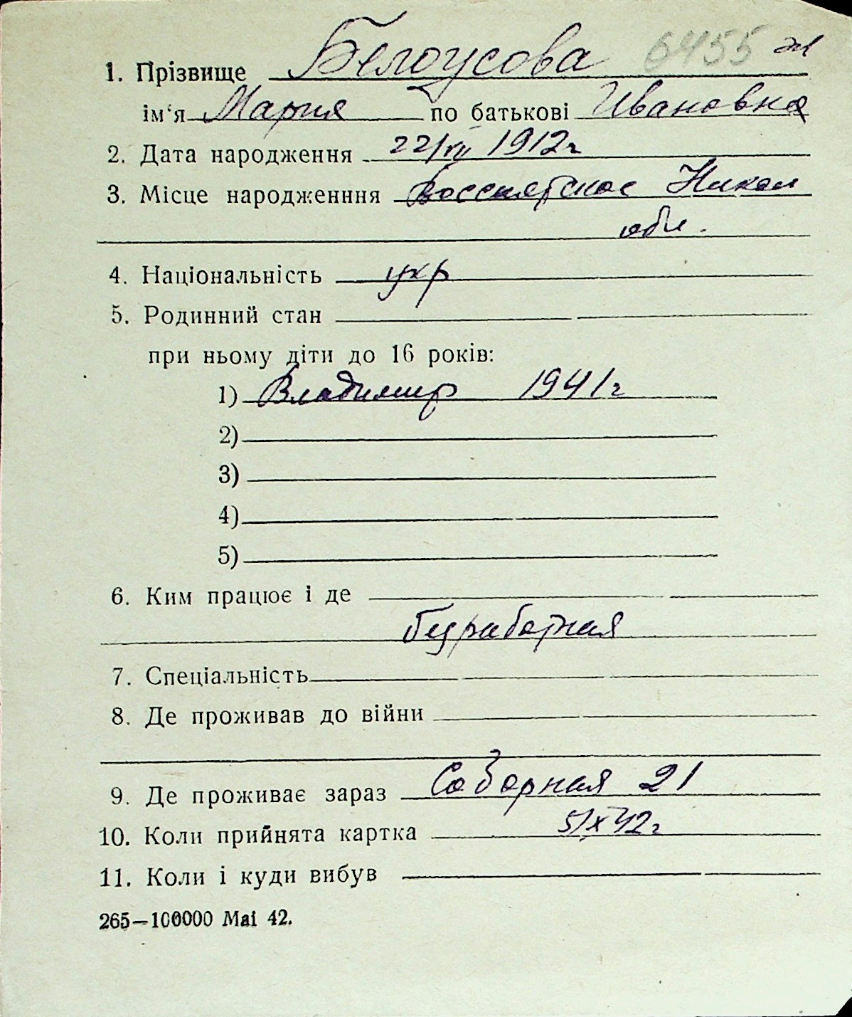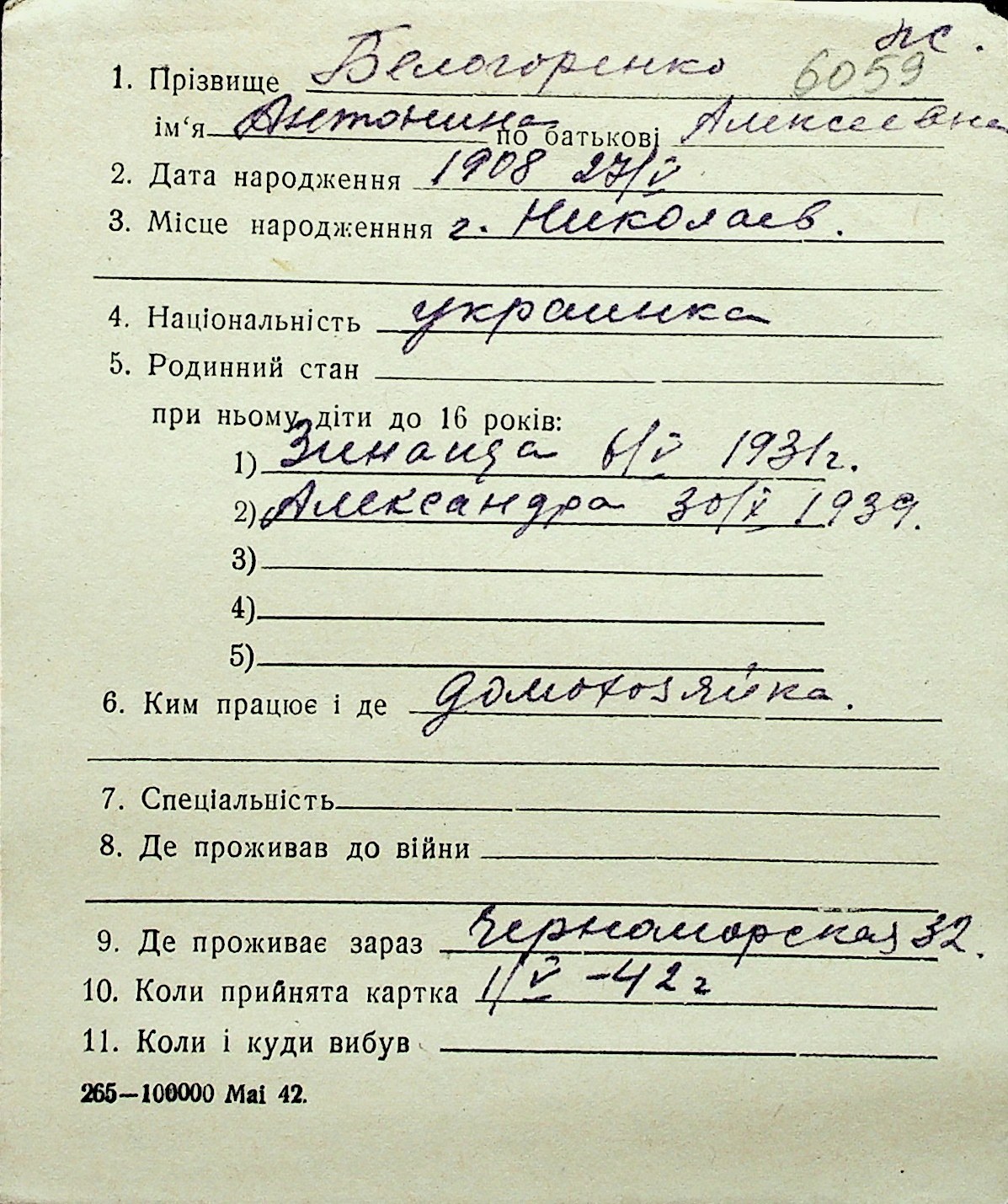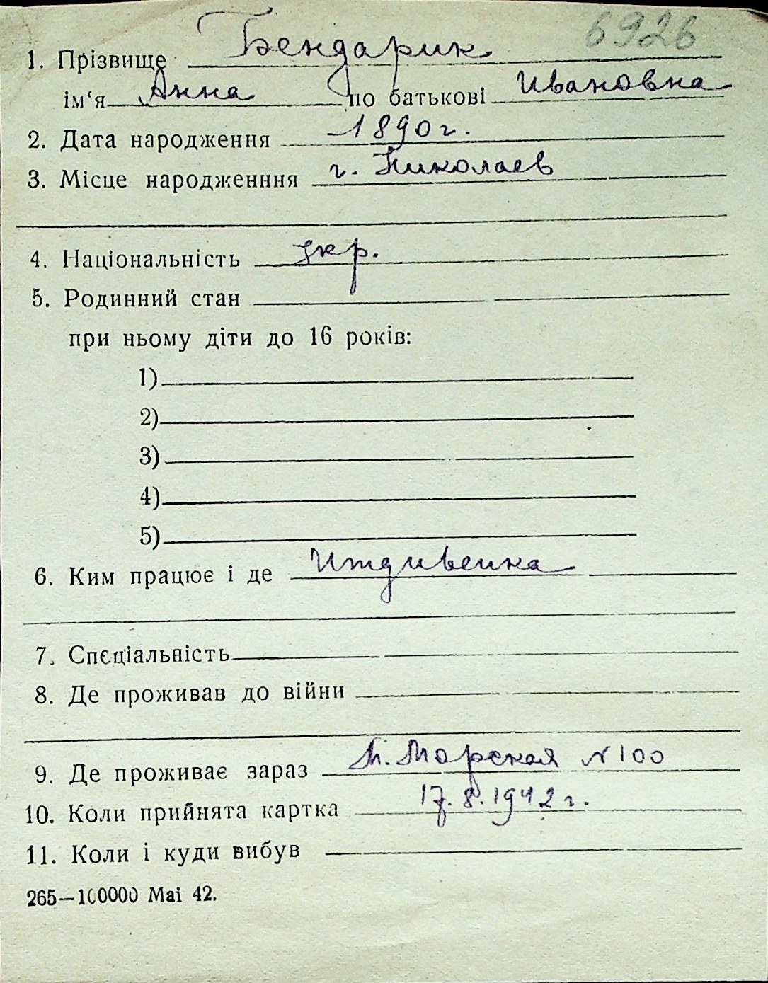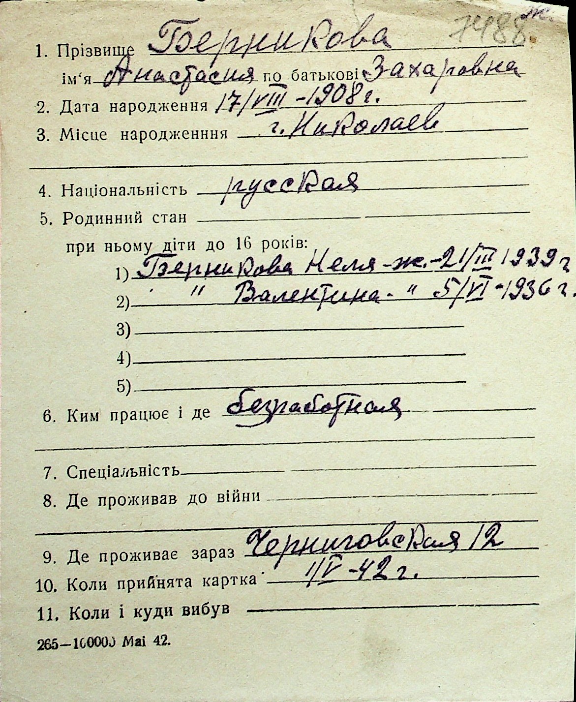 ◦ ◦ Перелік карток на осіб, які мешкали у м. Миколаїв у період окупації 1941–1944 років