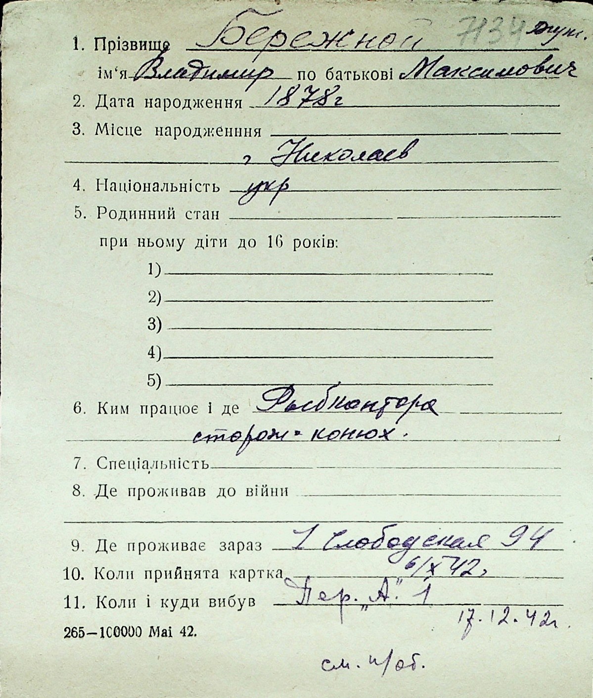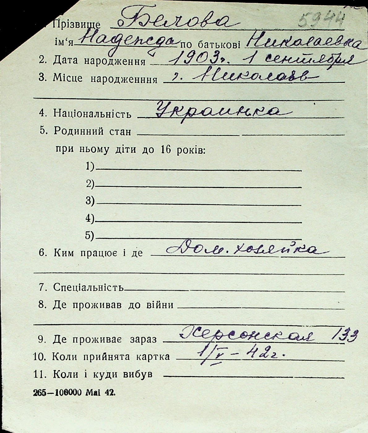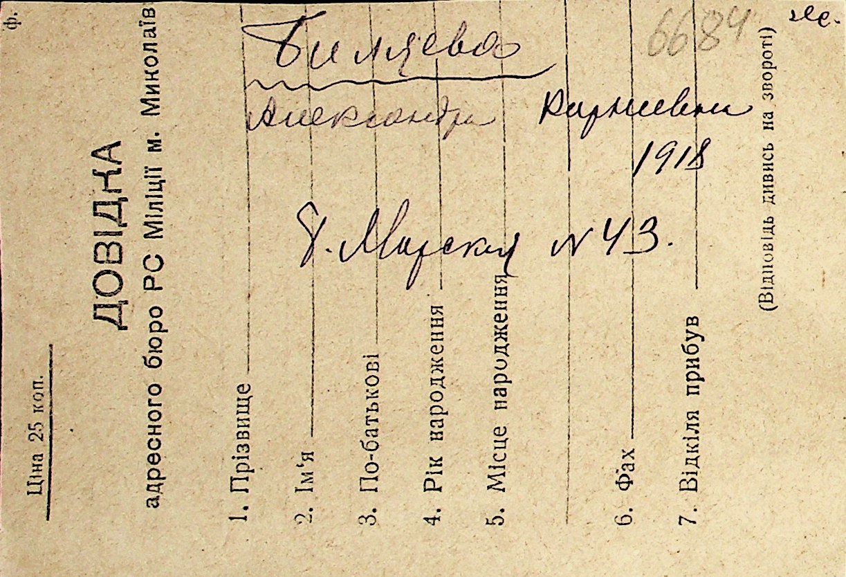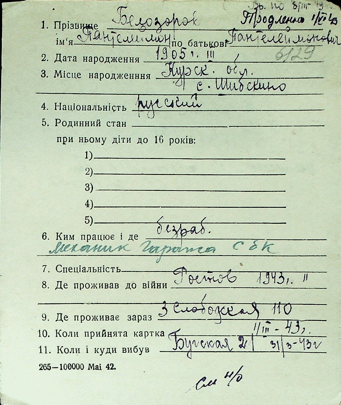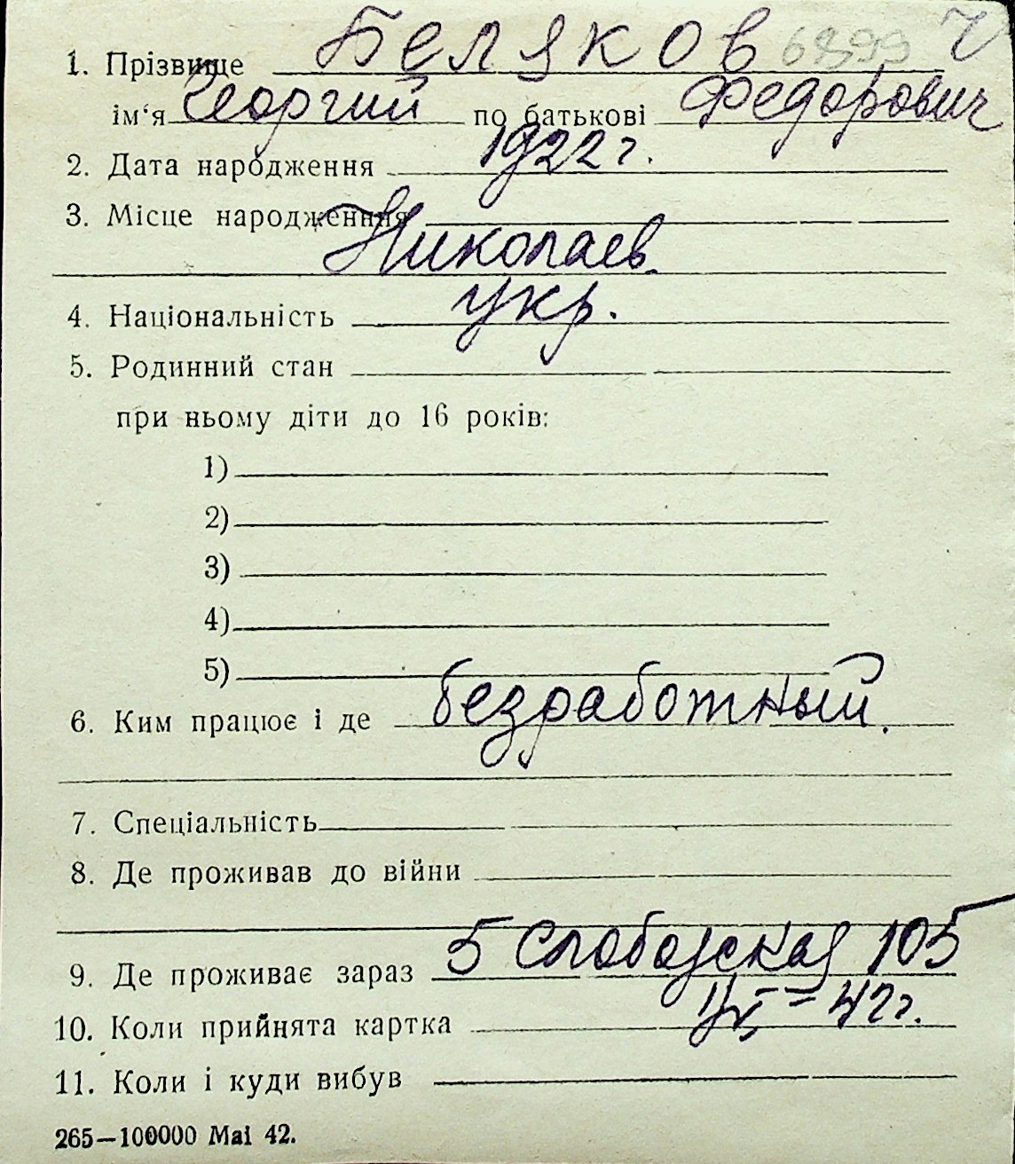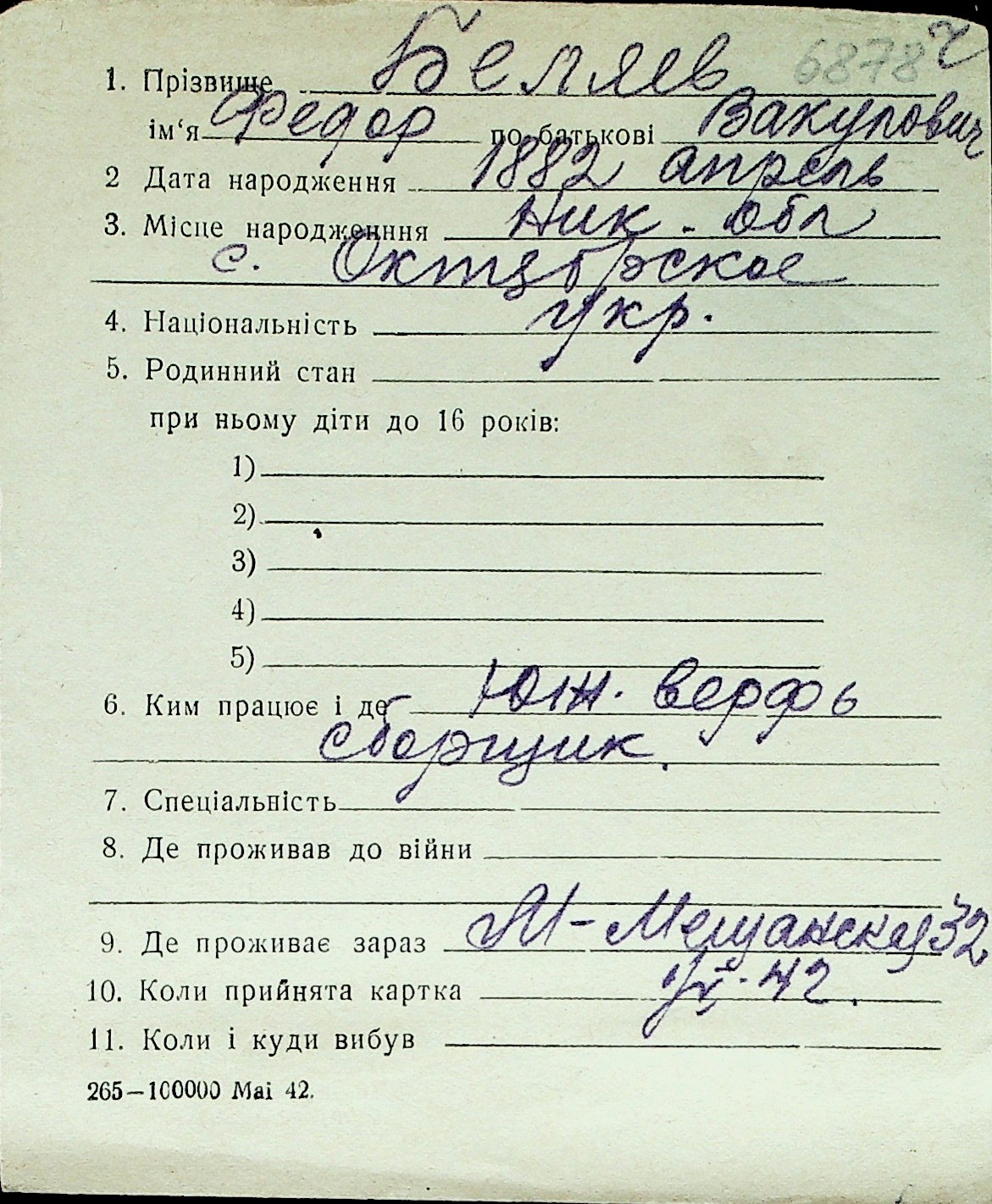 ◦ ◦ Перелік карток на осіб, які мешкали у м. Миколаїв у період окупації 1941–1944 років