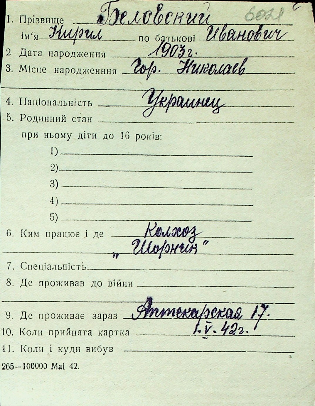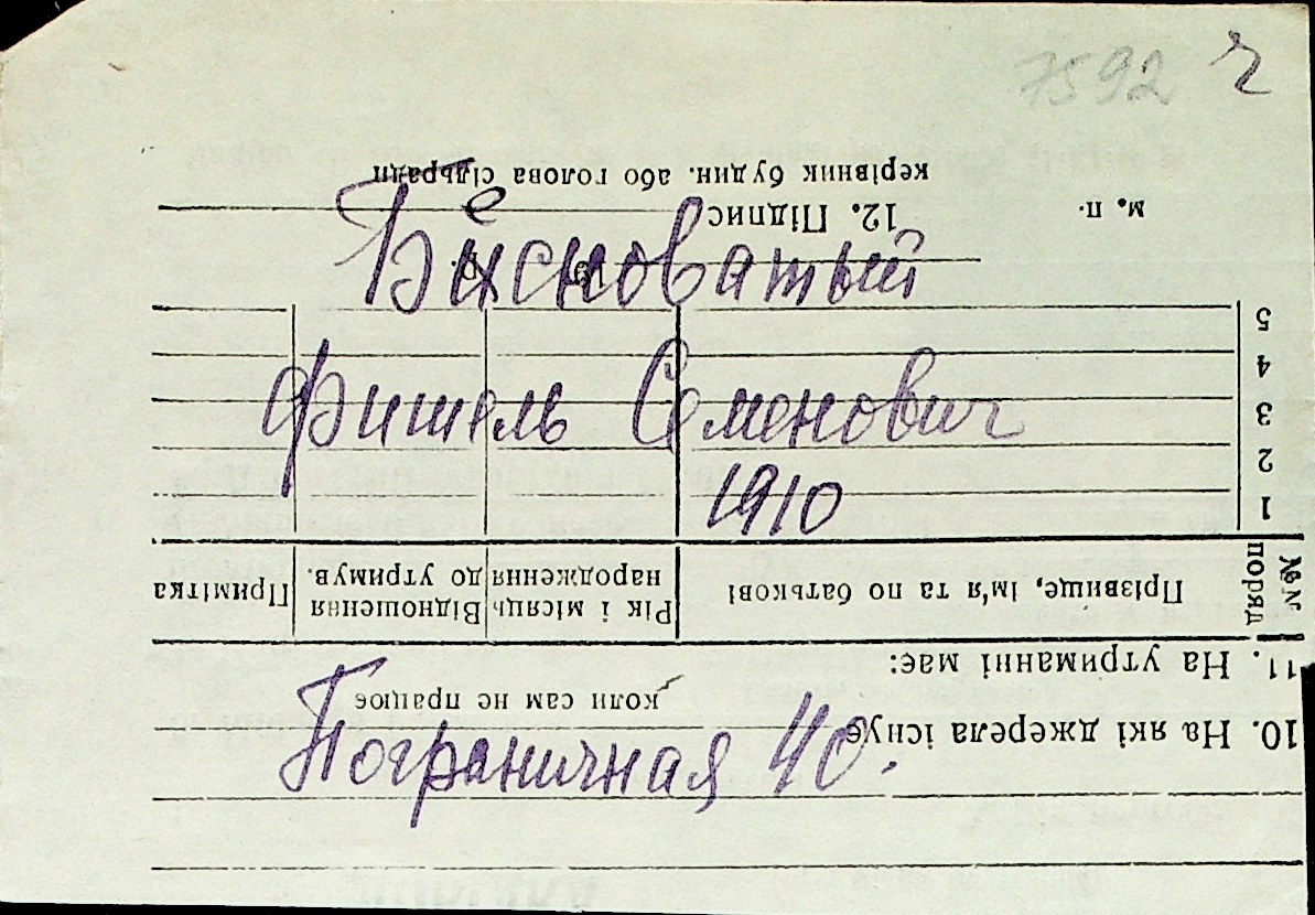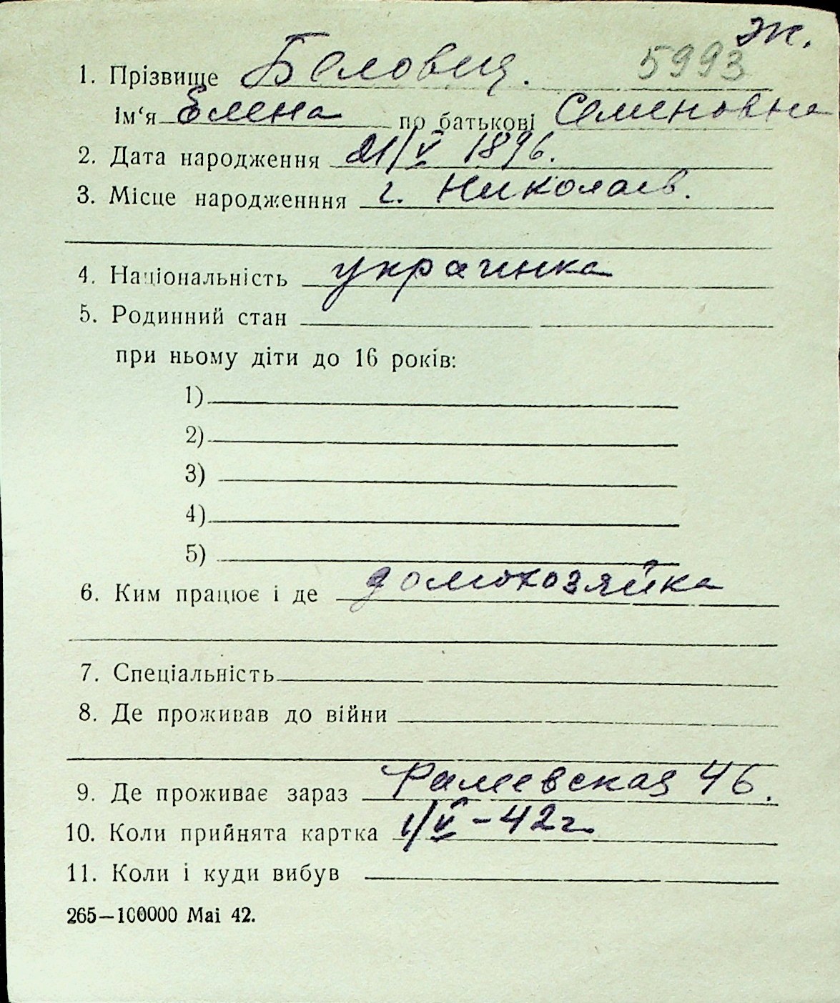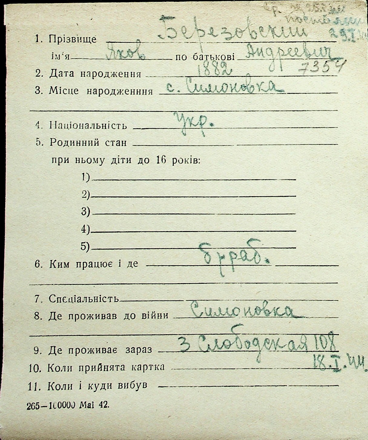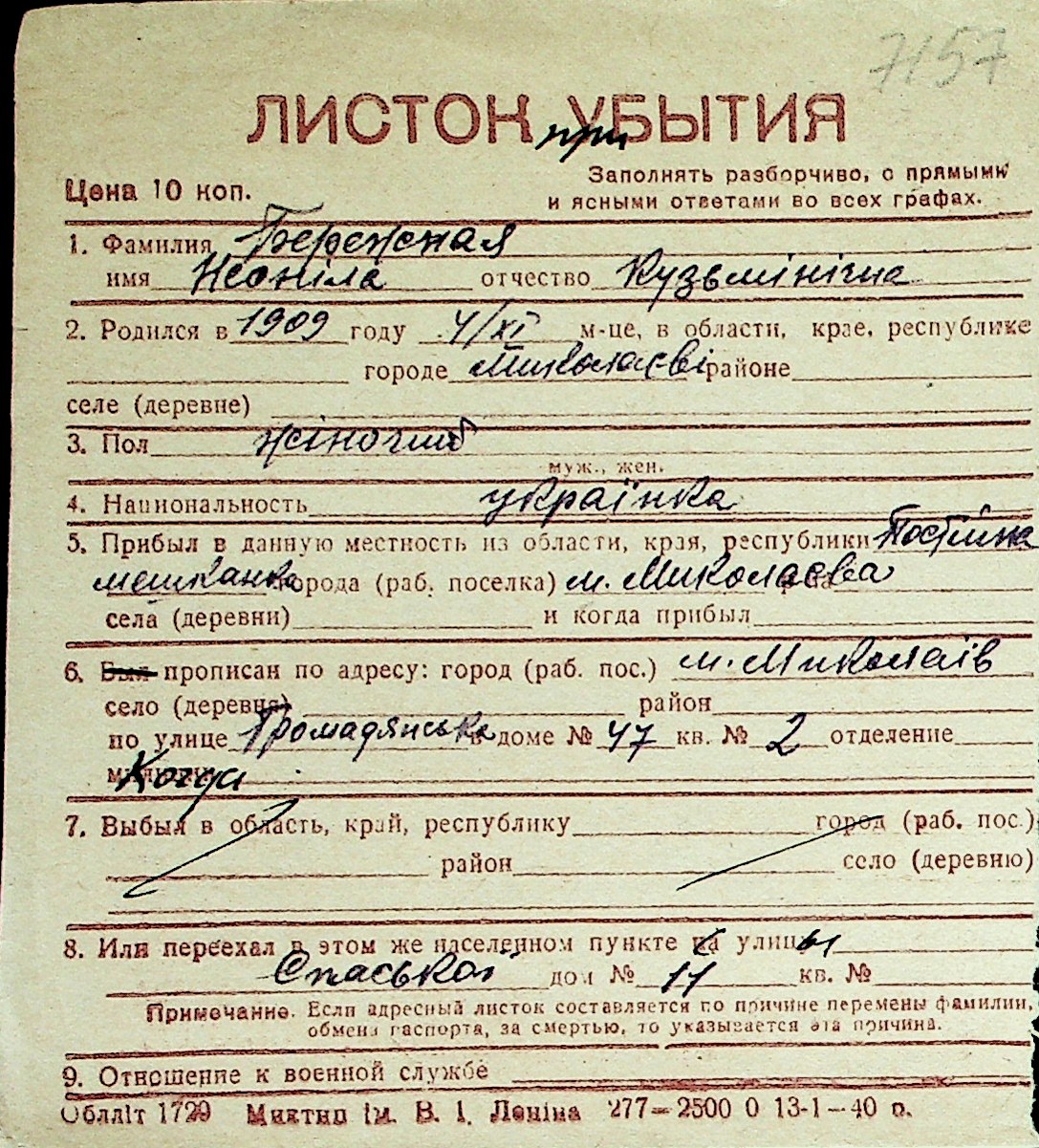 ◦ ◦ Перелік карток на осіб, які мешкали у м. Миколаїв у період окупації 1941–1944 років