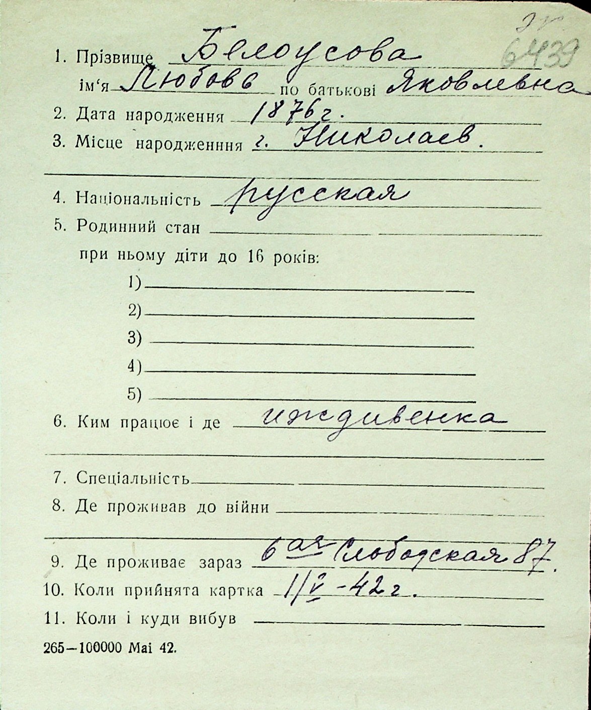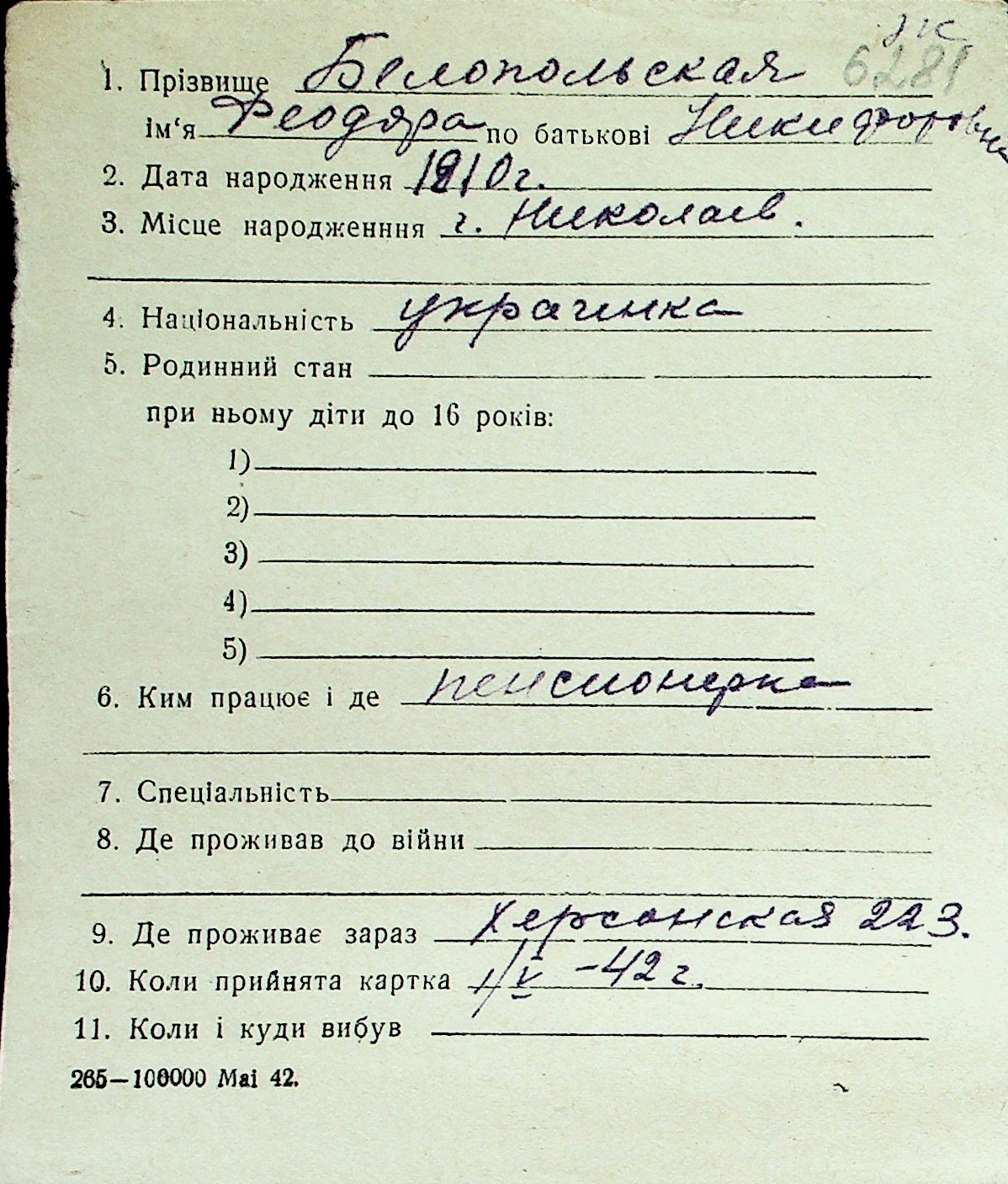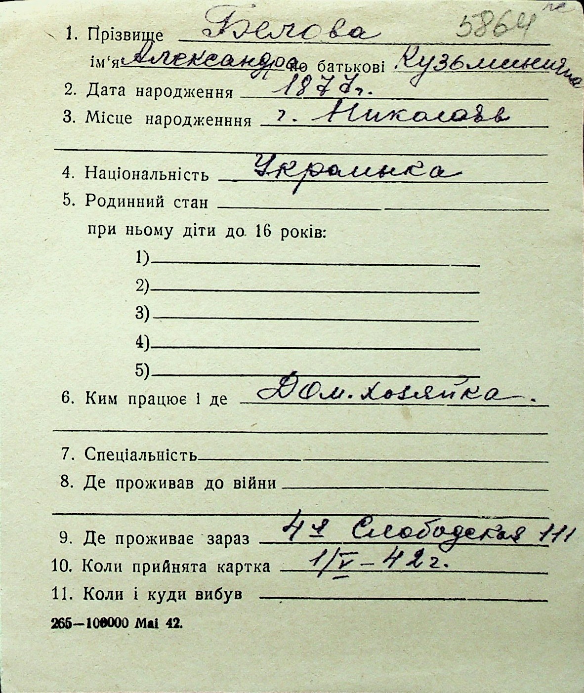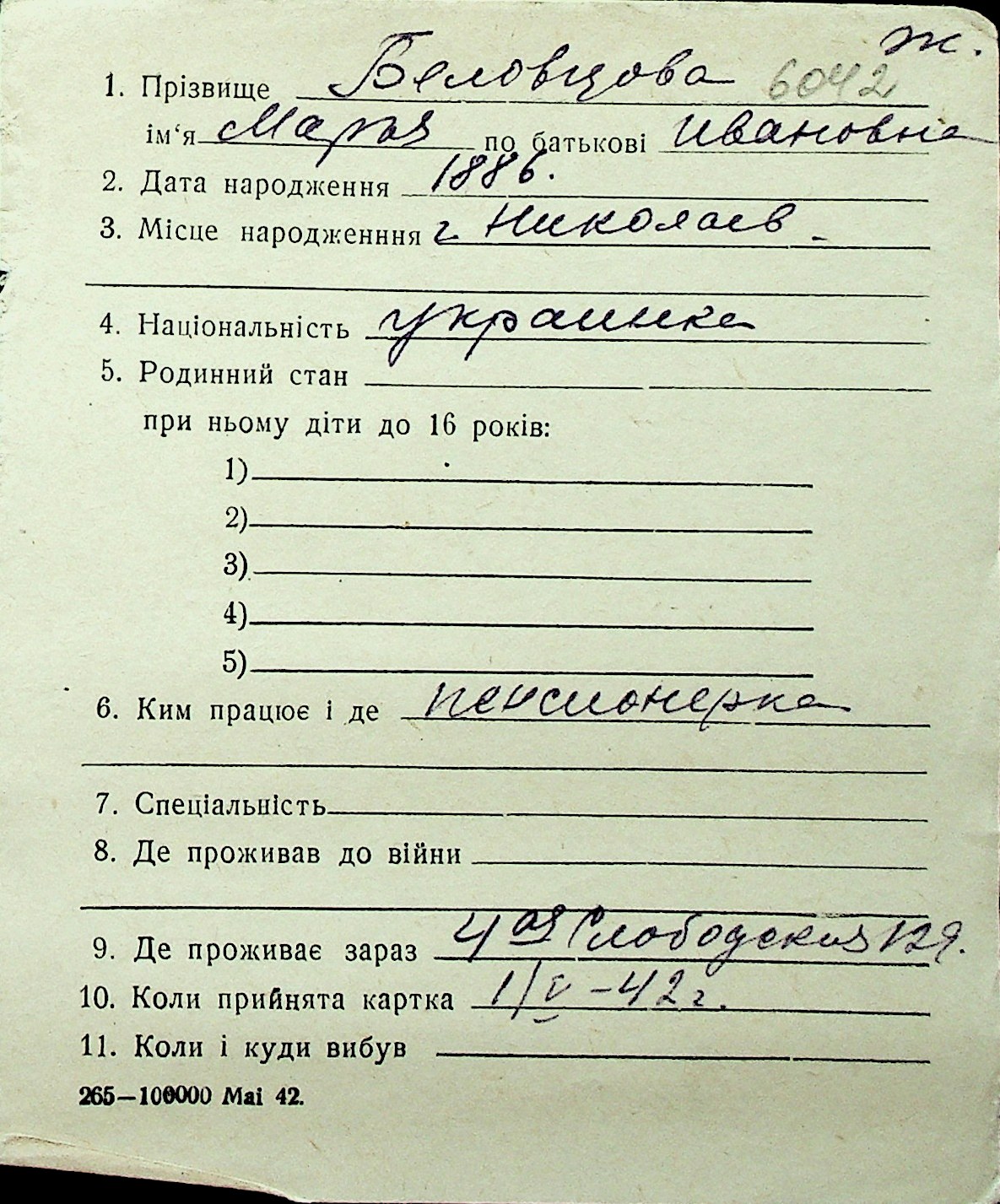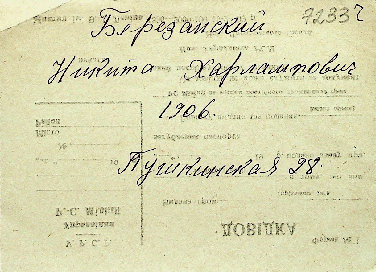 ◦ ◦ Перелік карток на осіб, які мешкали у м. Миколаїв у період окупації 1941–1944 років