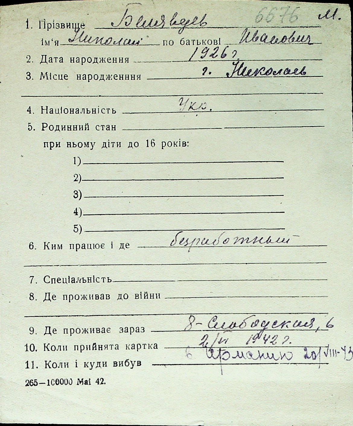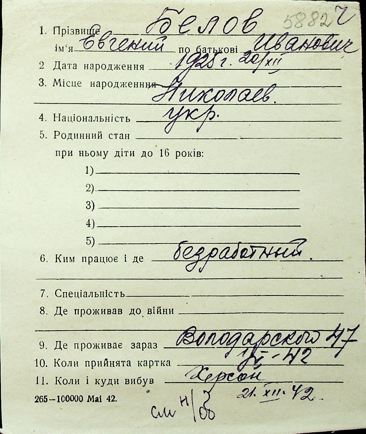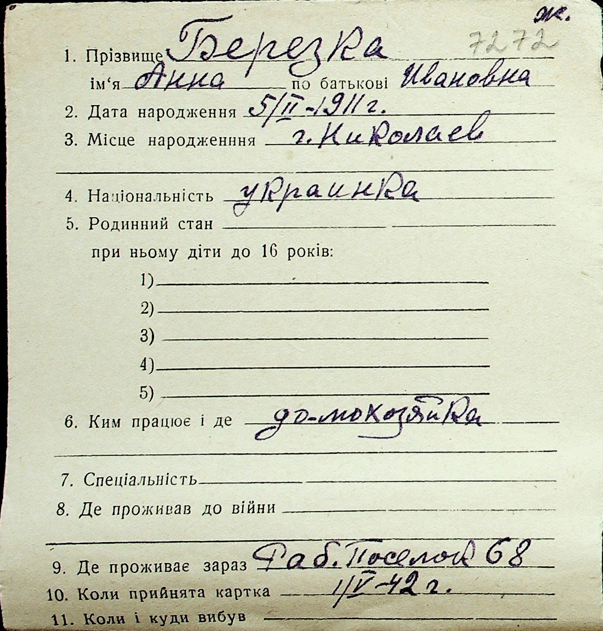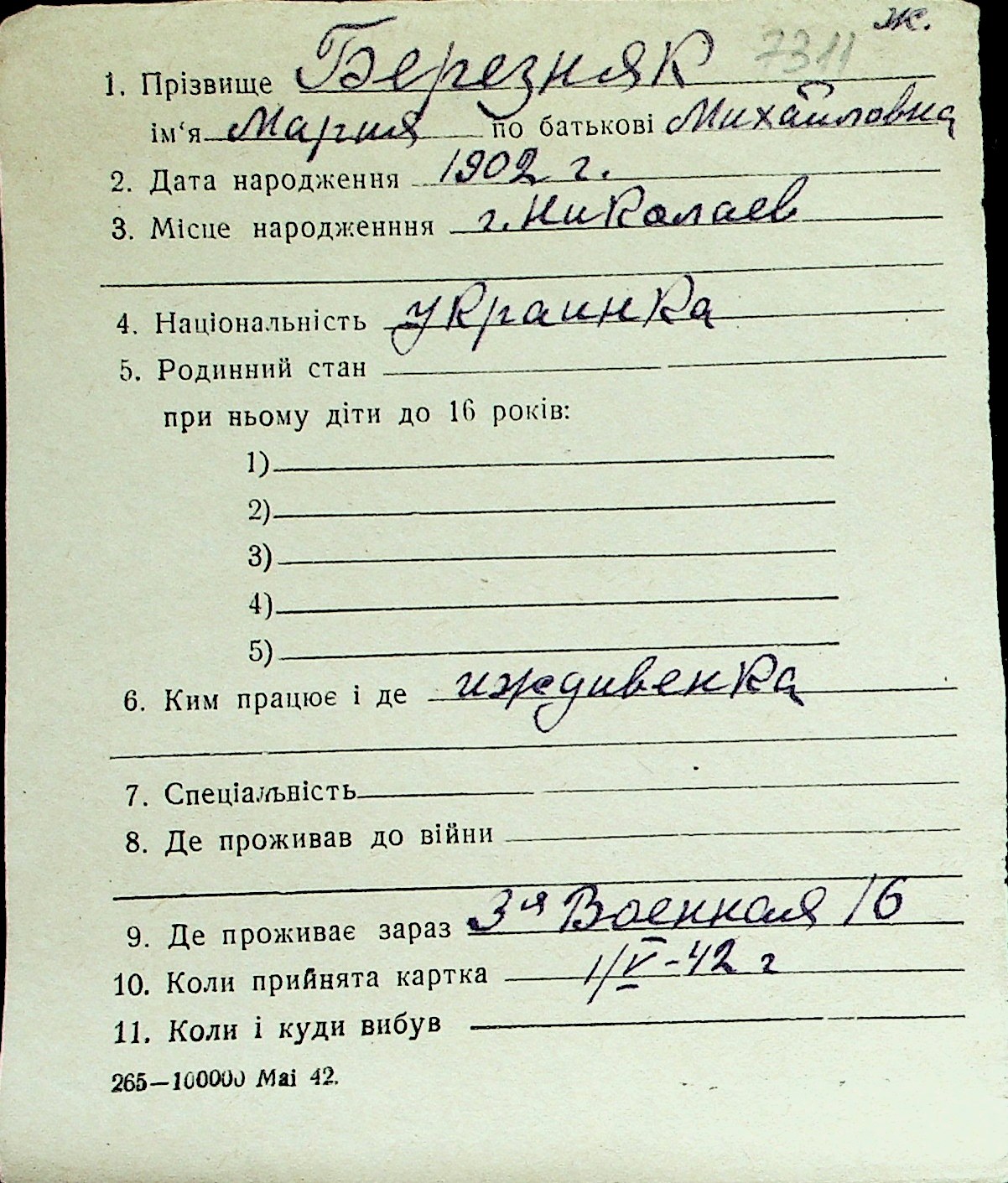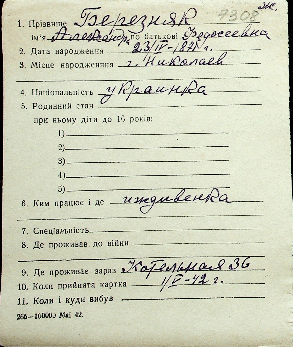 ◦ ◦ Перелік карток на осіб, які мешкали у м. Миколаїв у період окупації 1941–1944 років