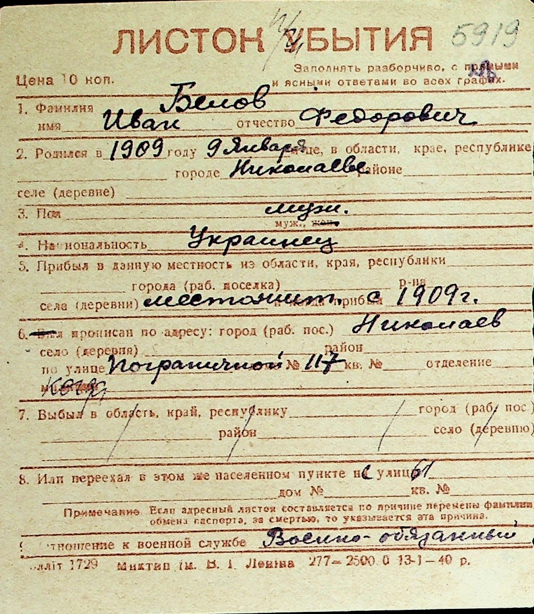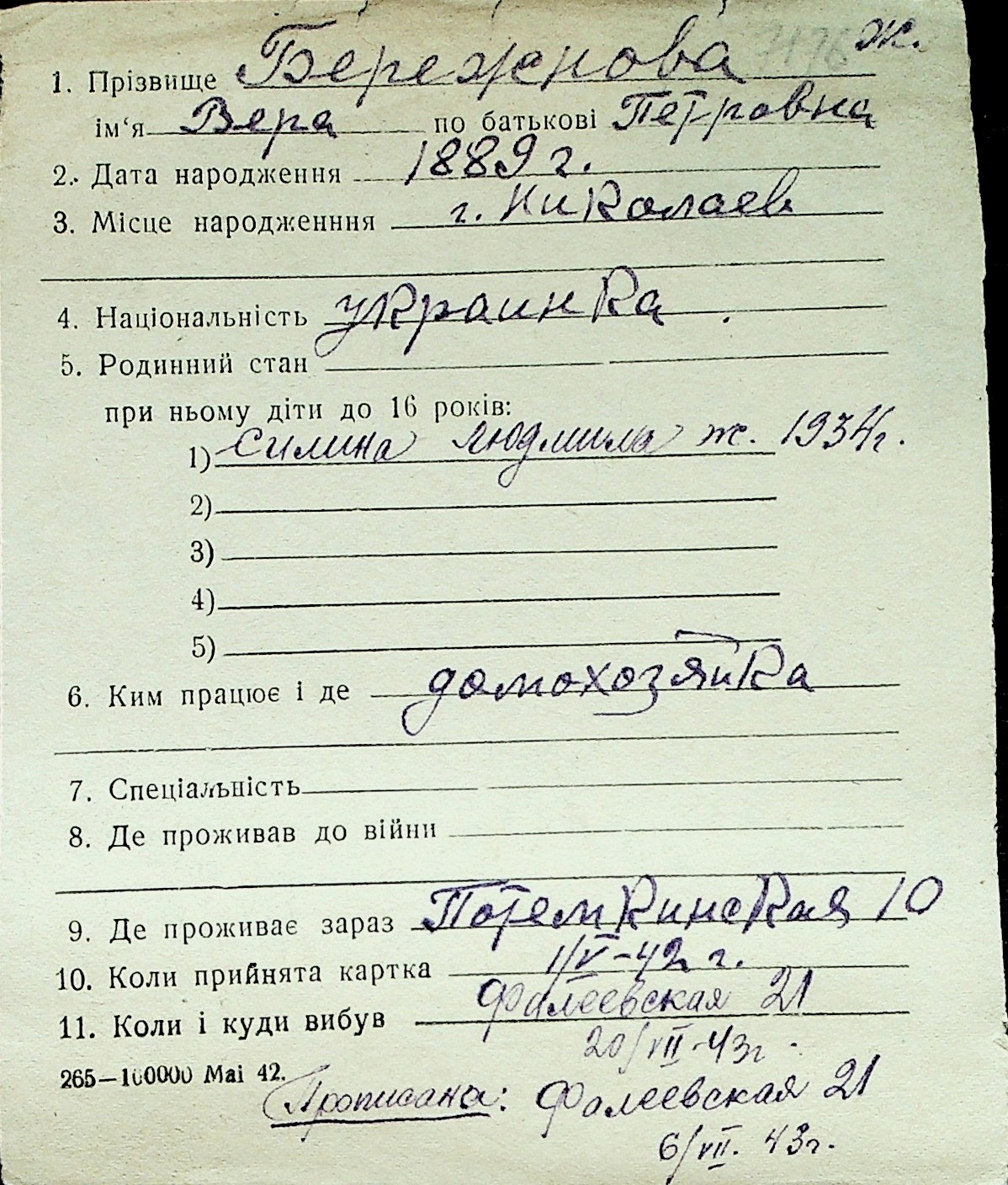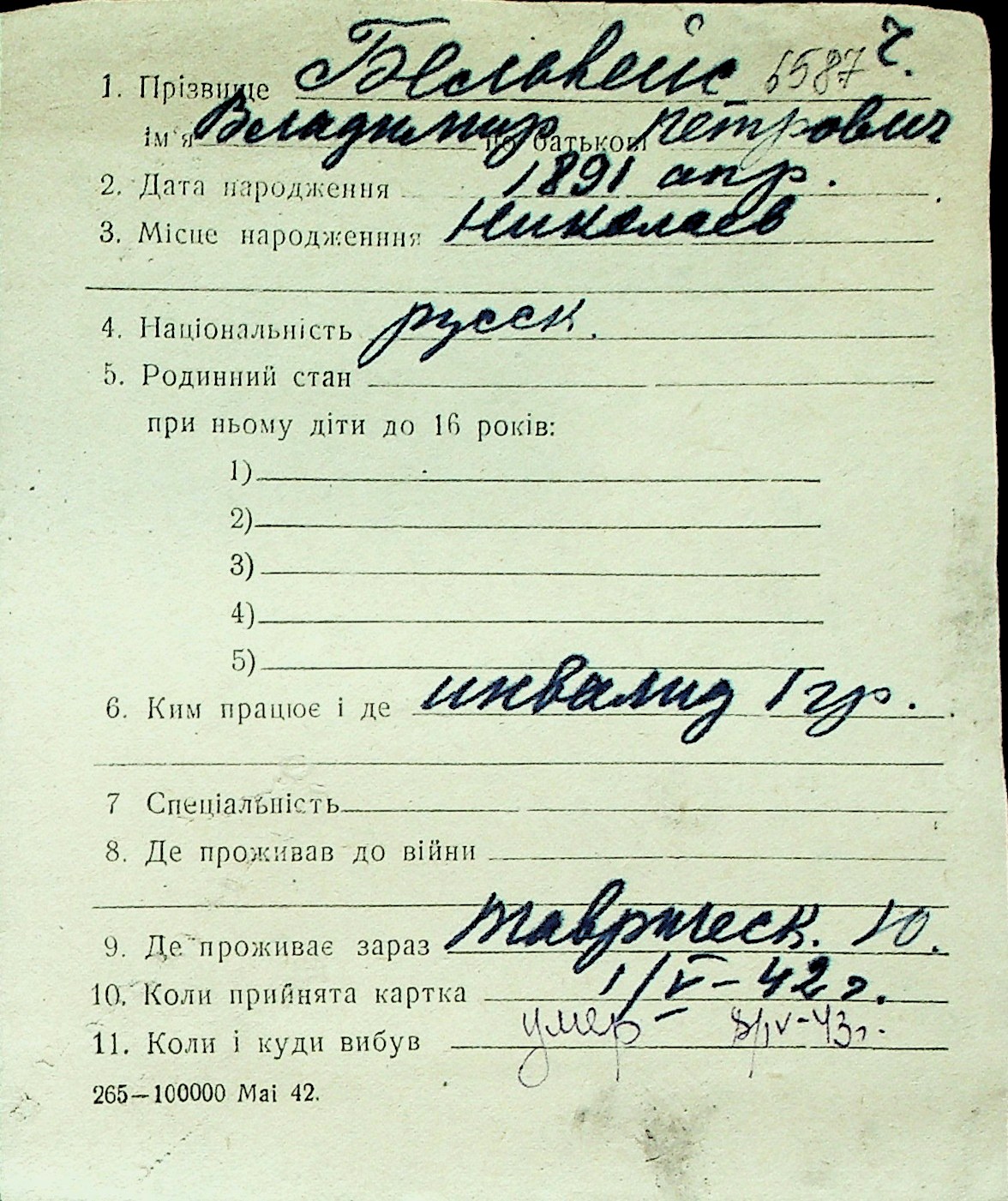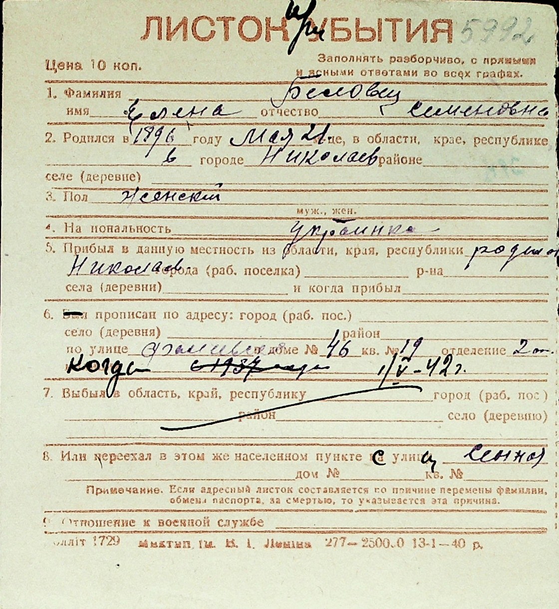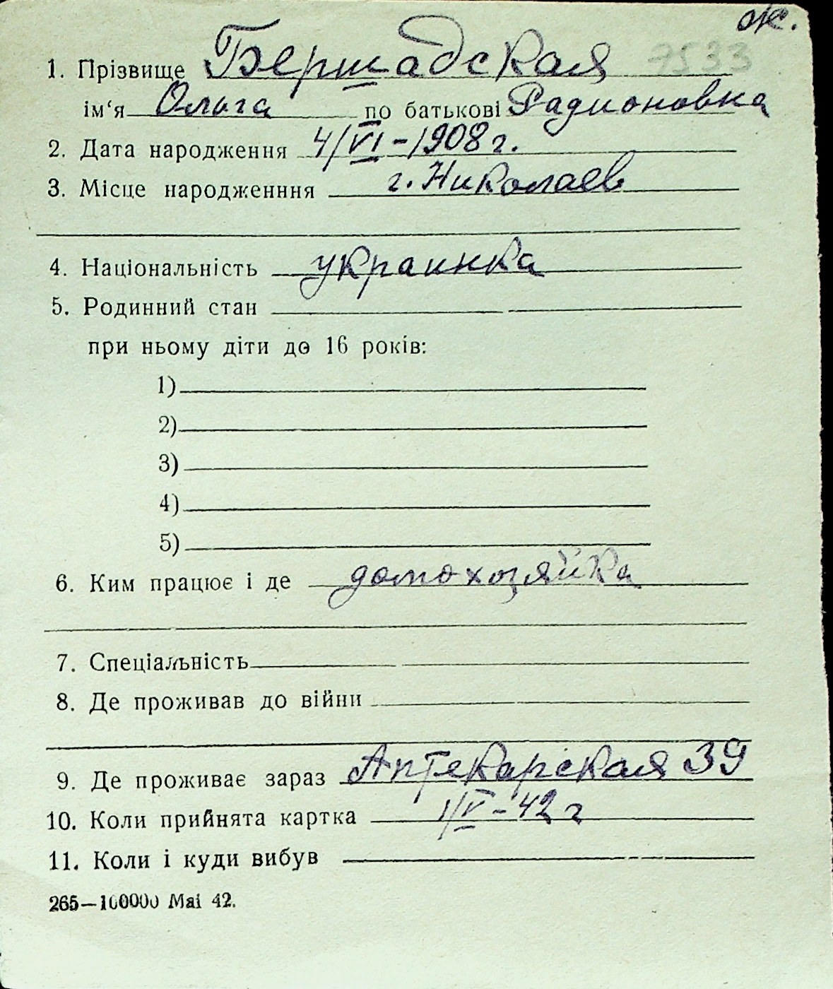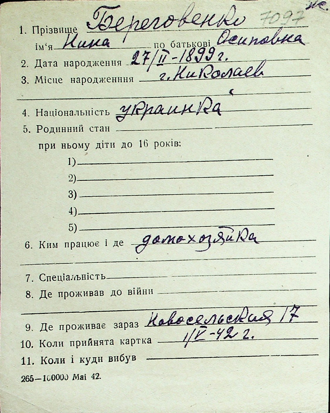 ◦ ◦ Перелік карток на осіб, які мешкали у м. Миколаїв у період окупації 1941–1944 років