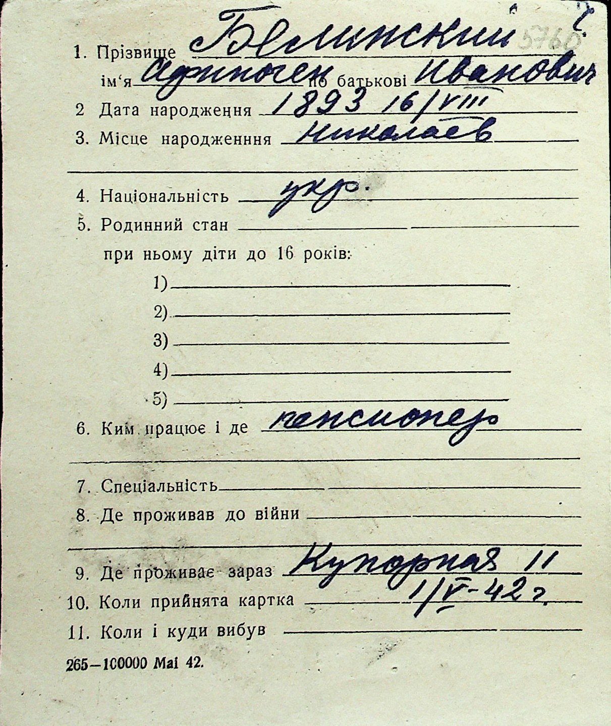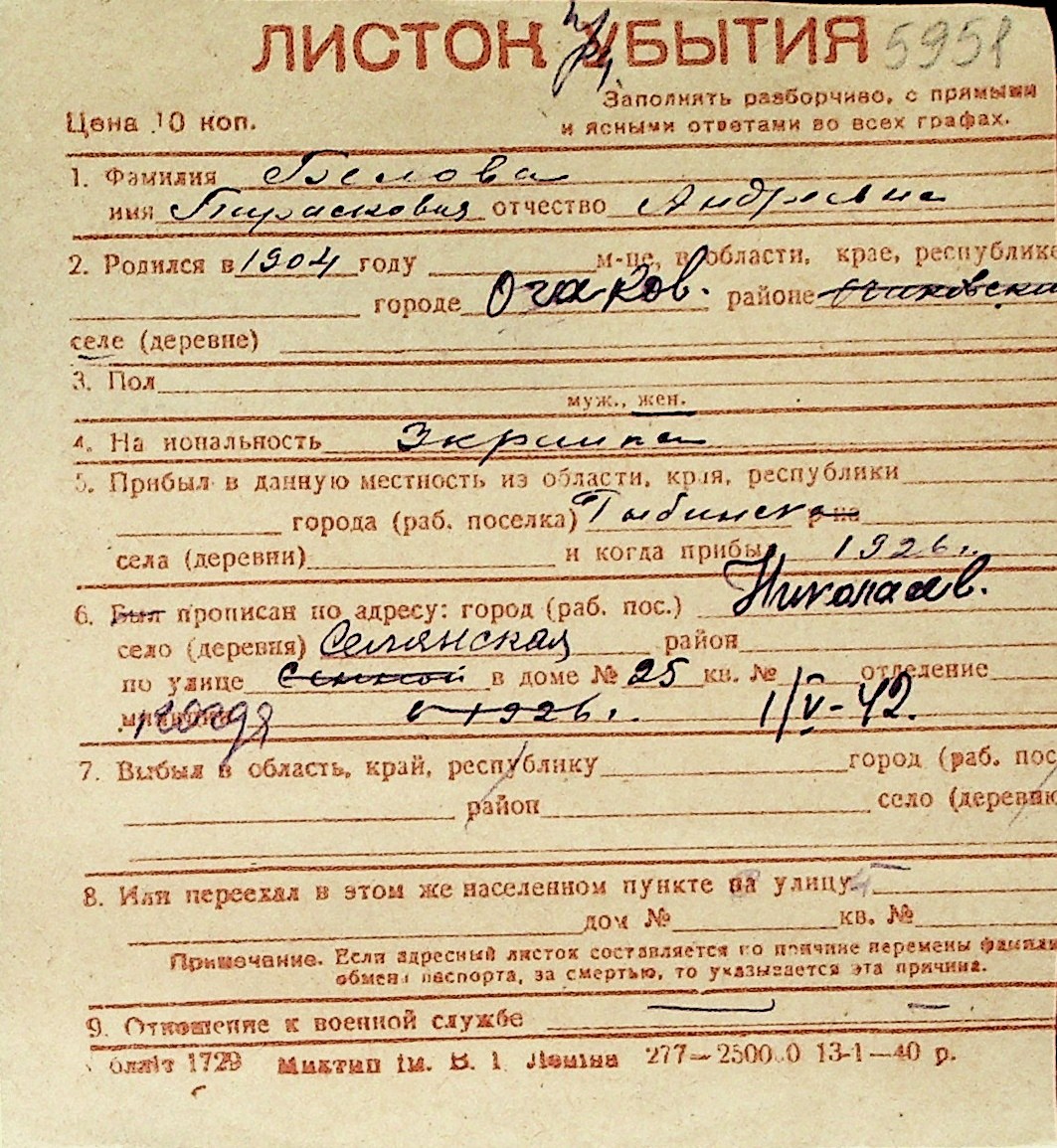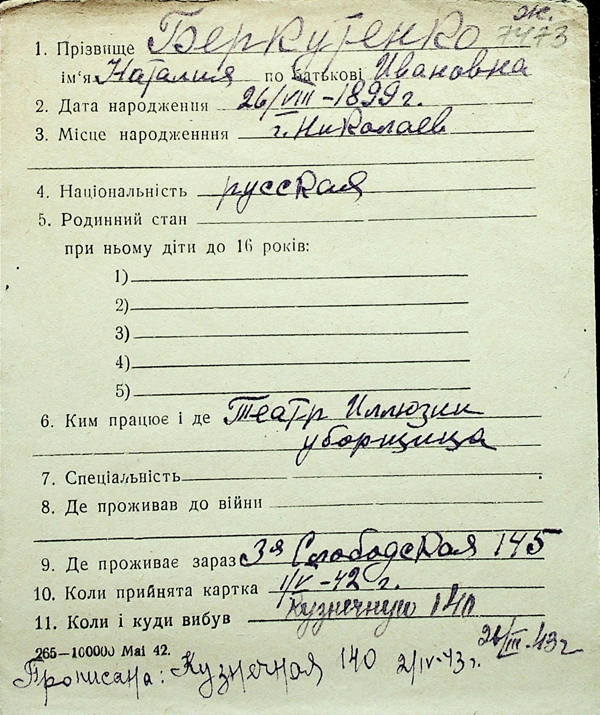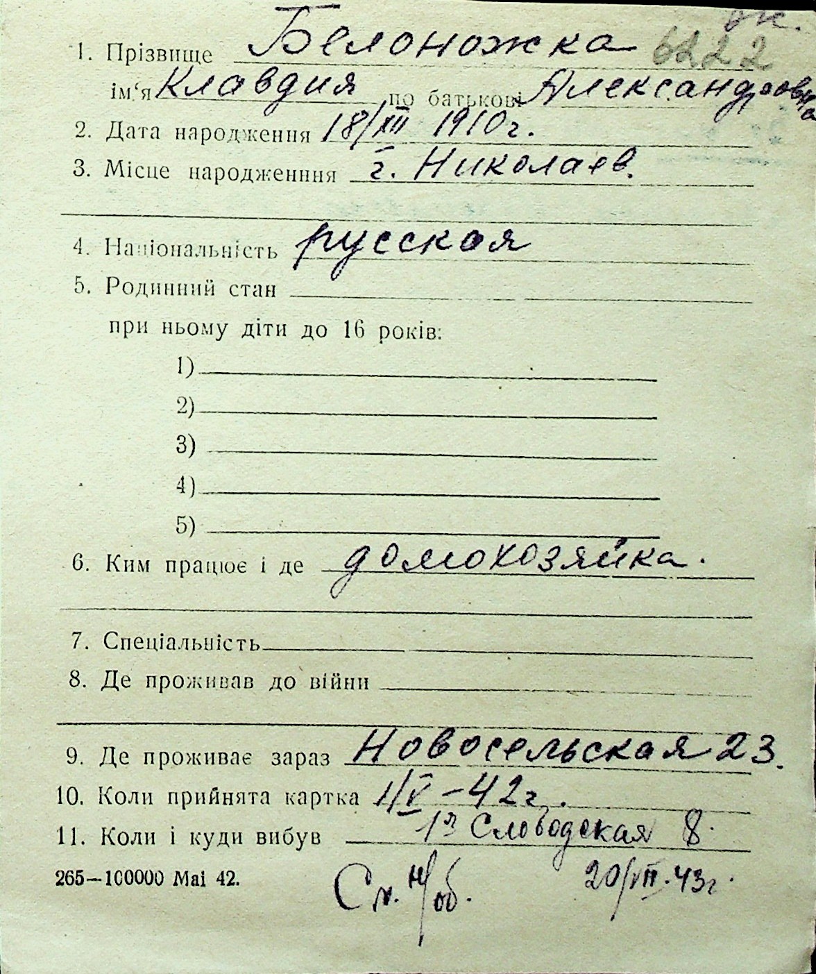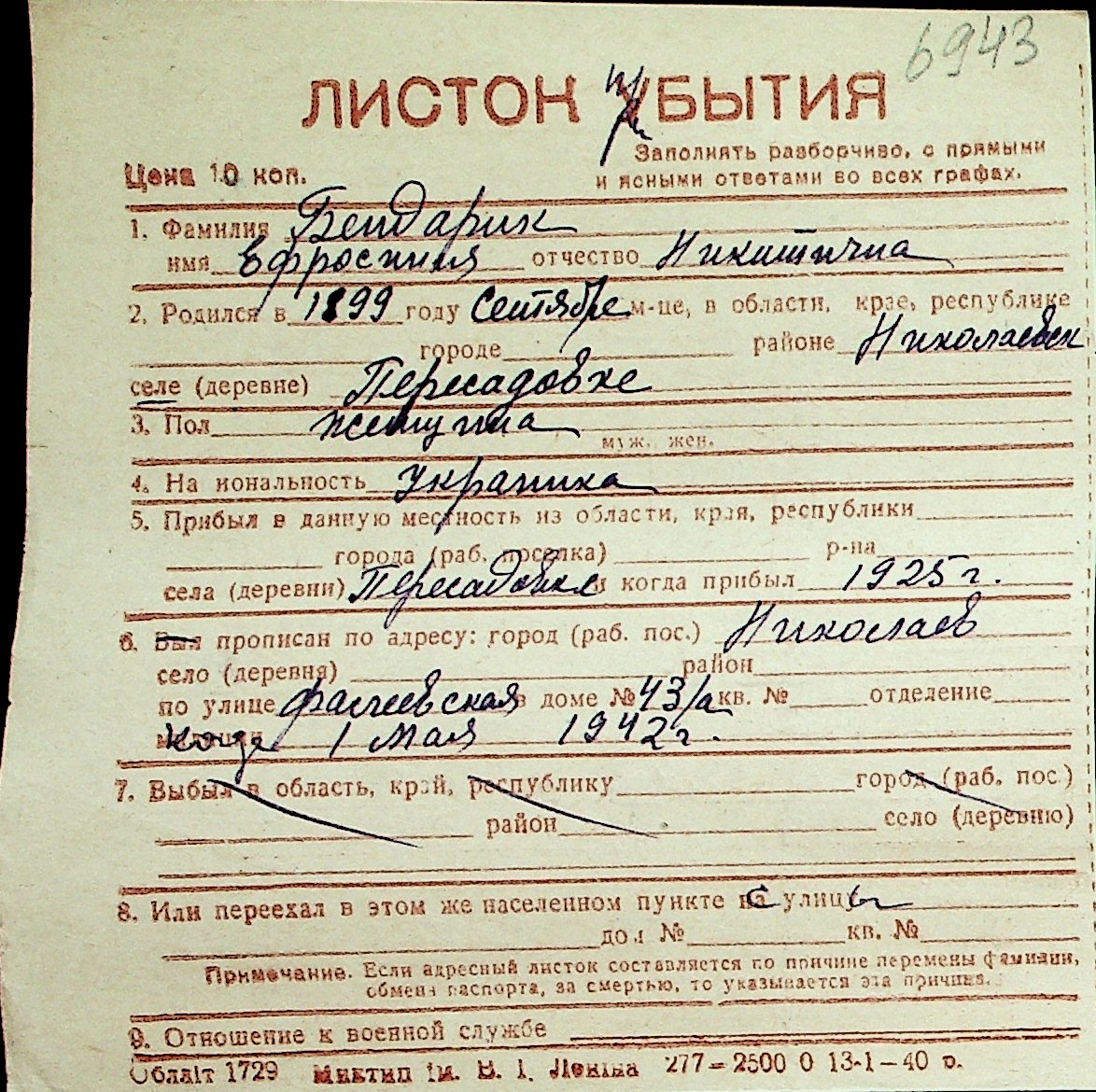 ◦ ◦ Перелік карток на осіб, які мешкали у м. Миколаїв у період окупації 1941–1944 років