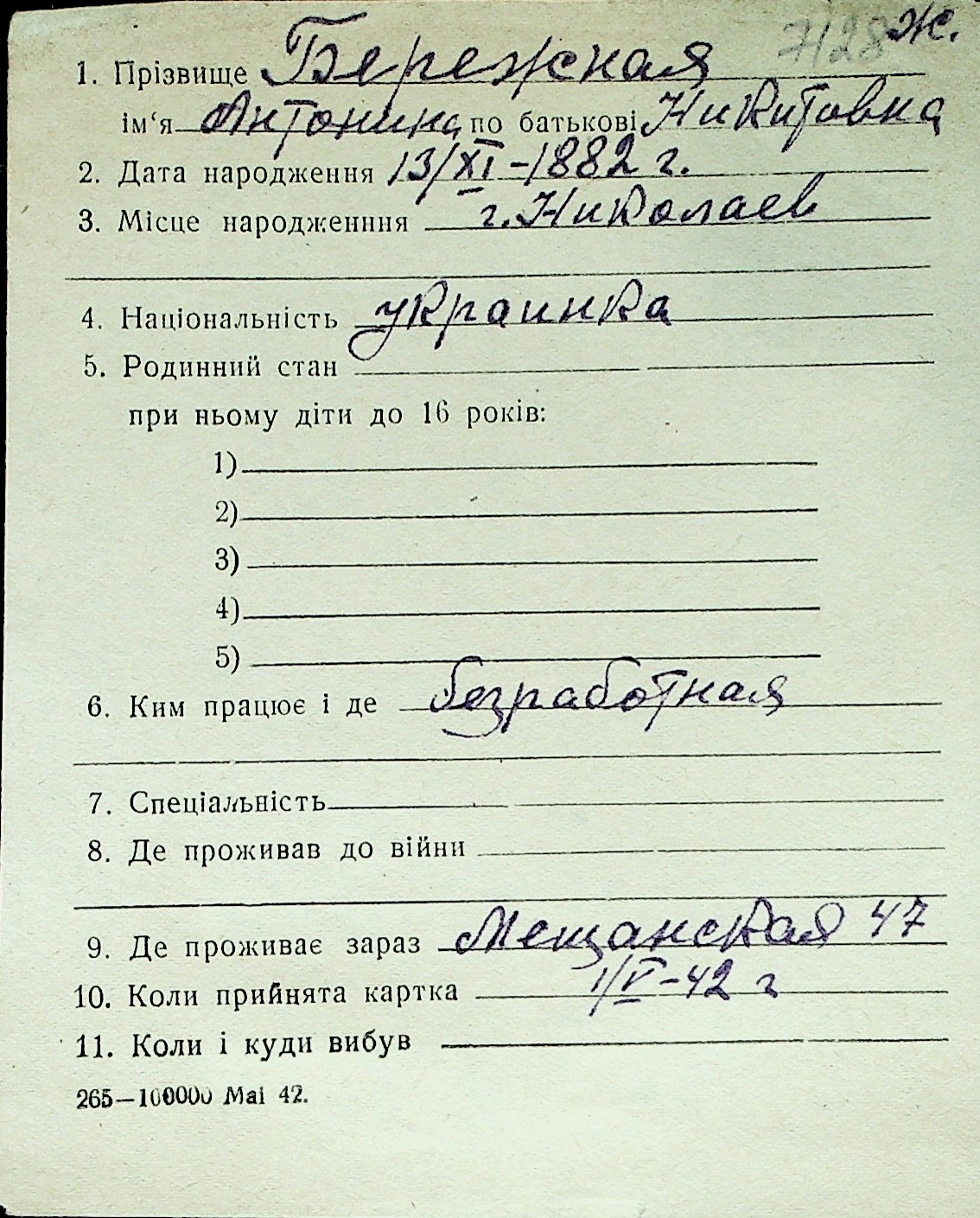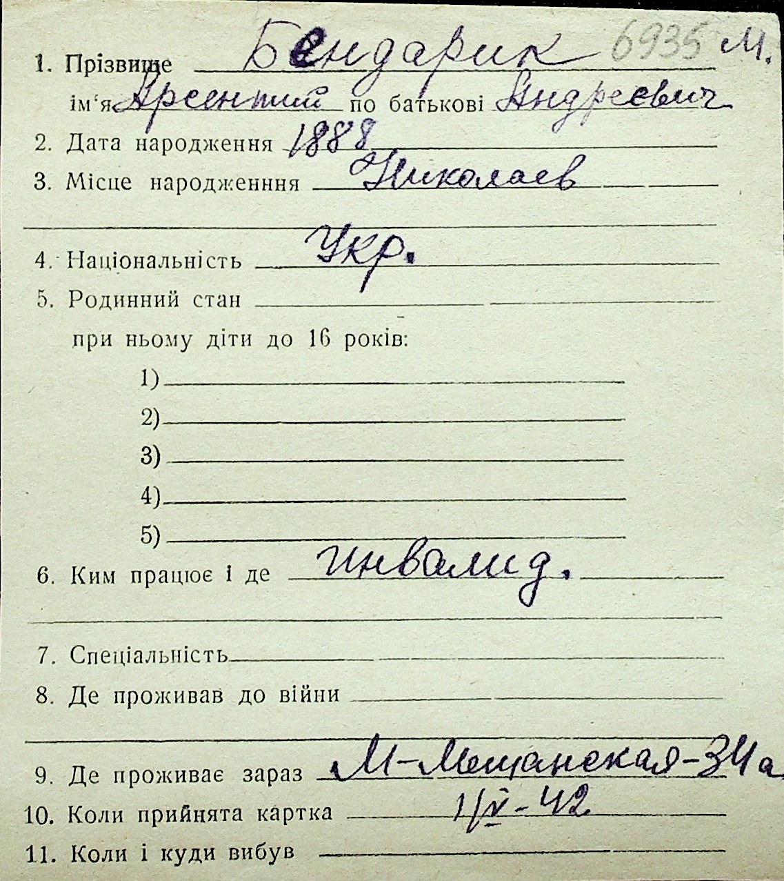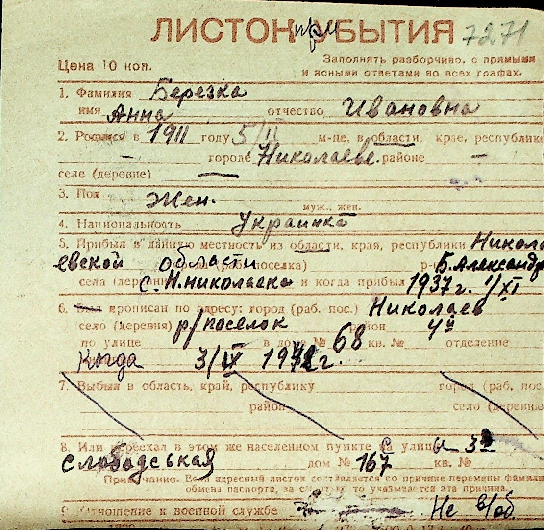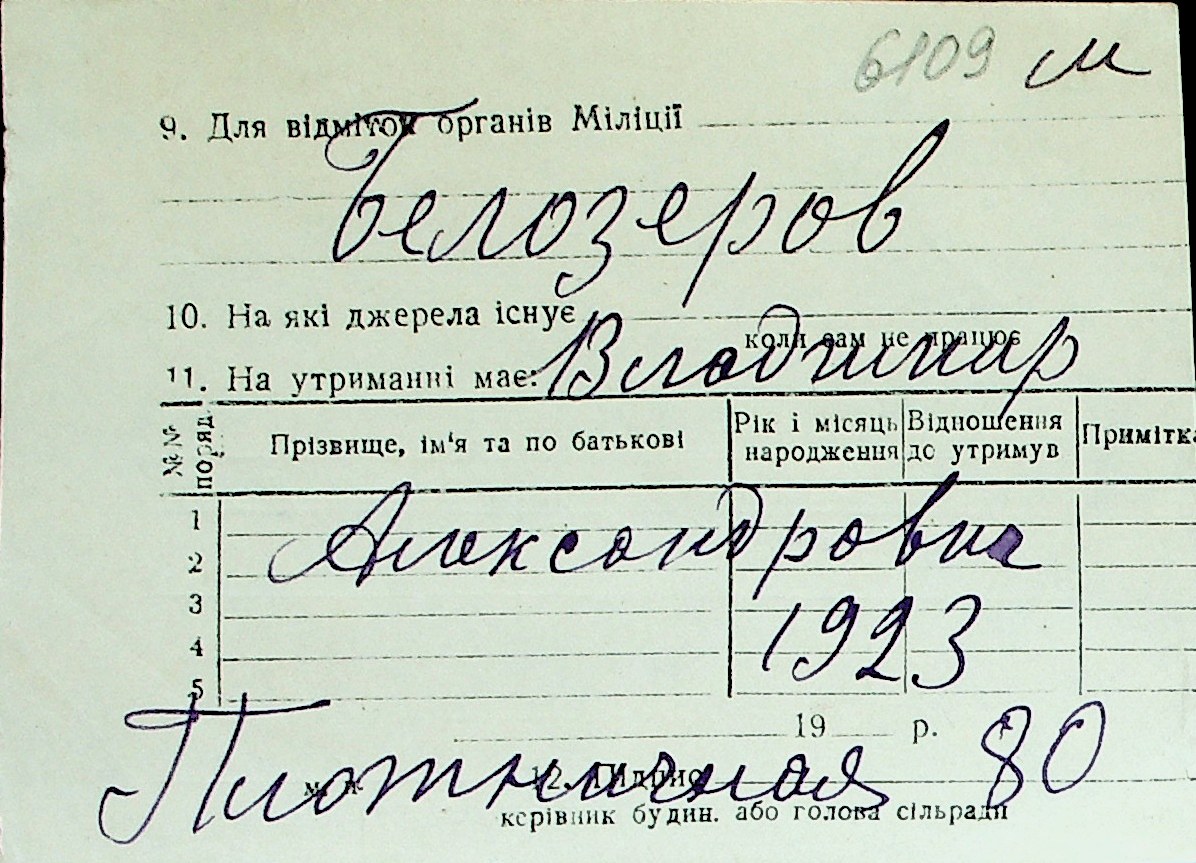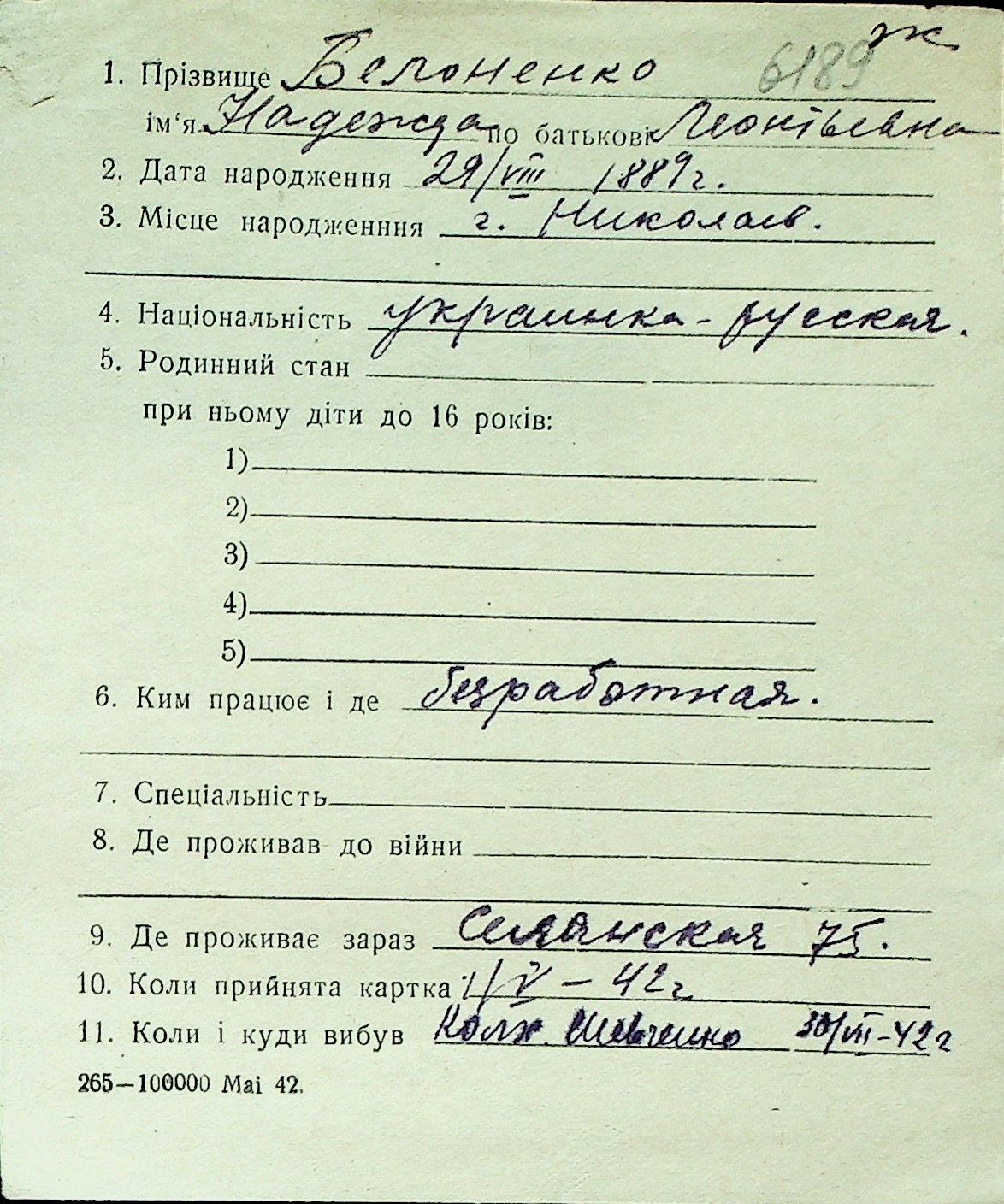 ◦ ◦ Перелік карток на осіб, які мешкали у м. Миколаїв у період окупації 1941–1944 років