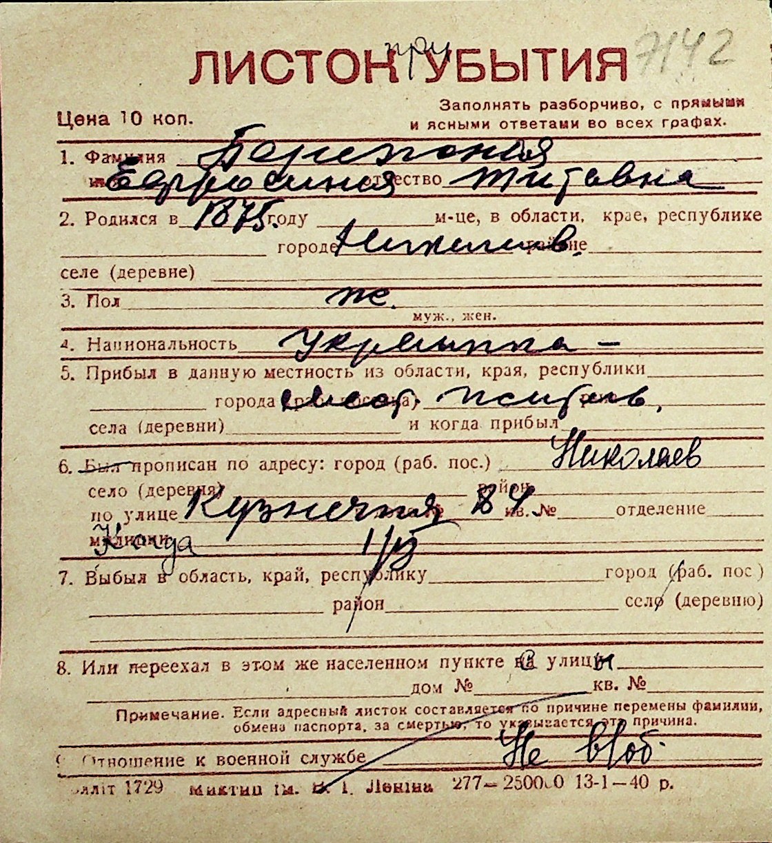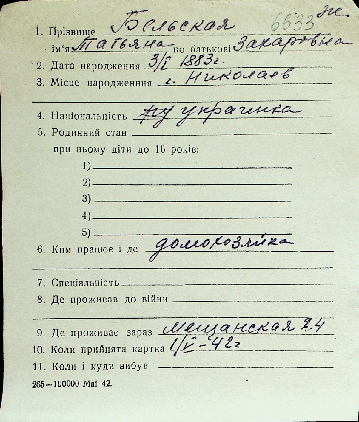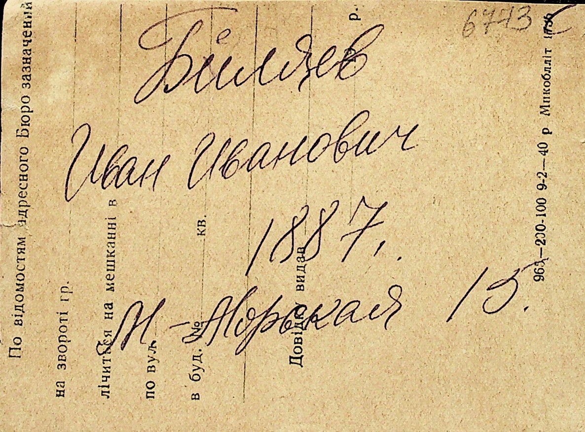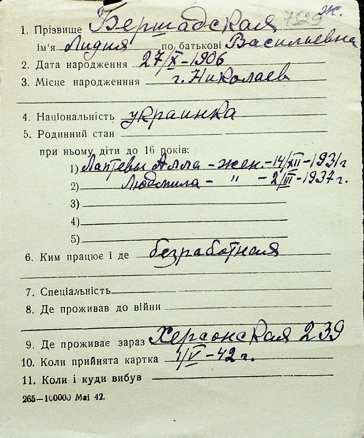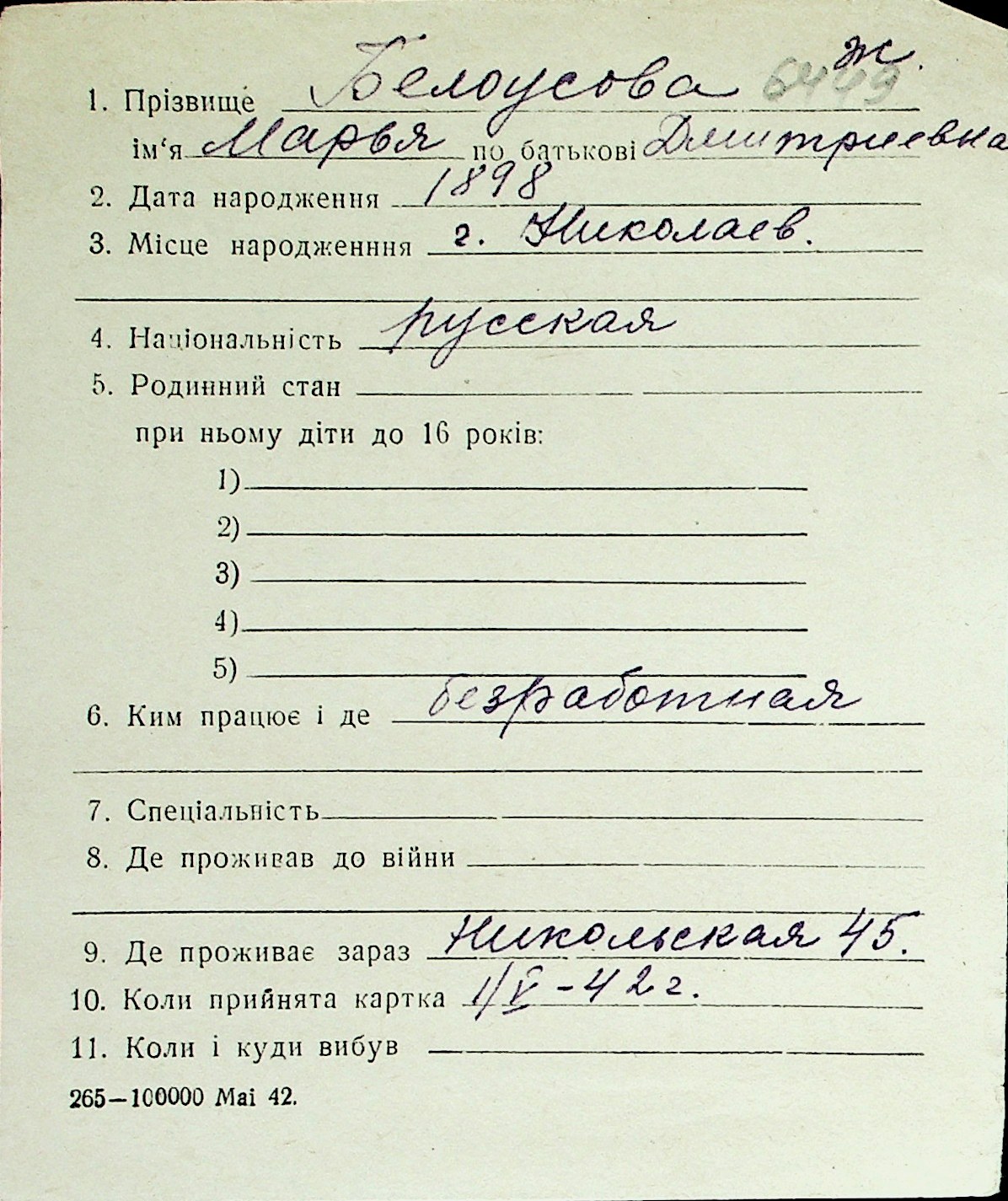 ◦ ◦ Перелік карток на осіб, які мешкали у м. Миколаїв у період окупації 1941–1944 років