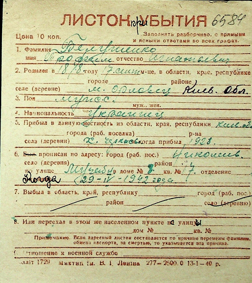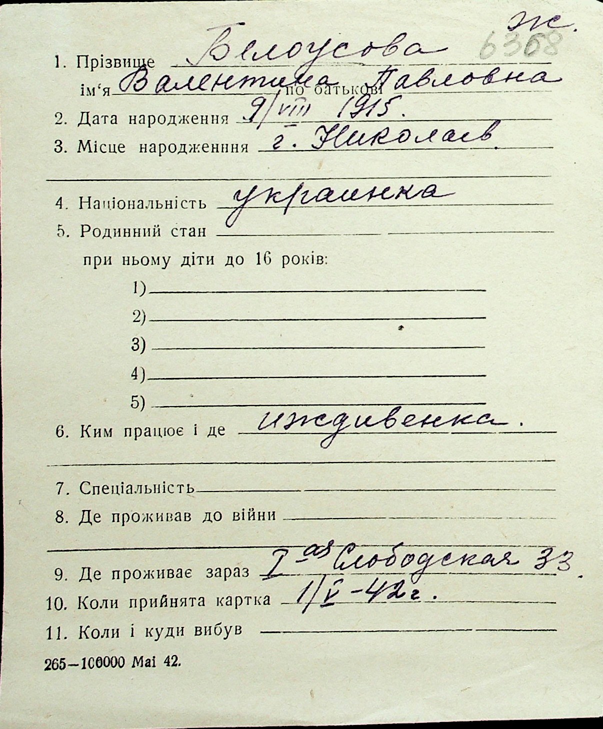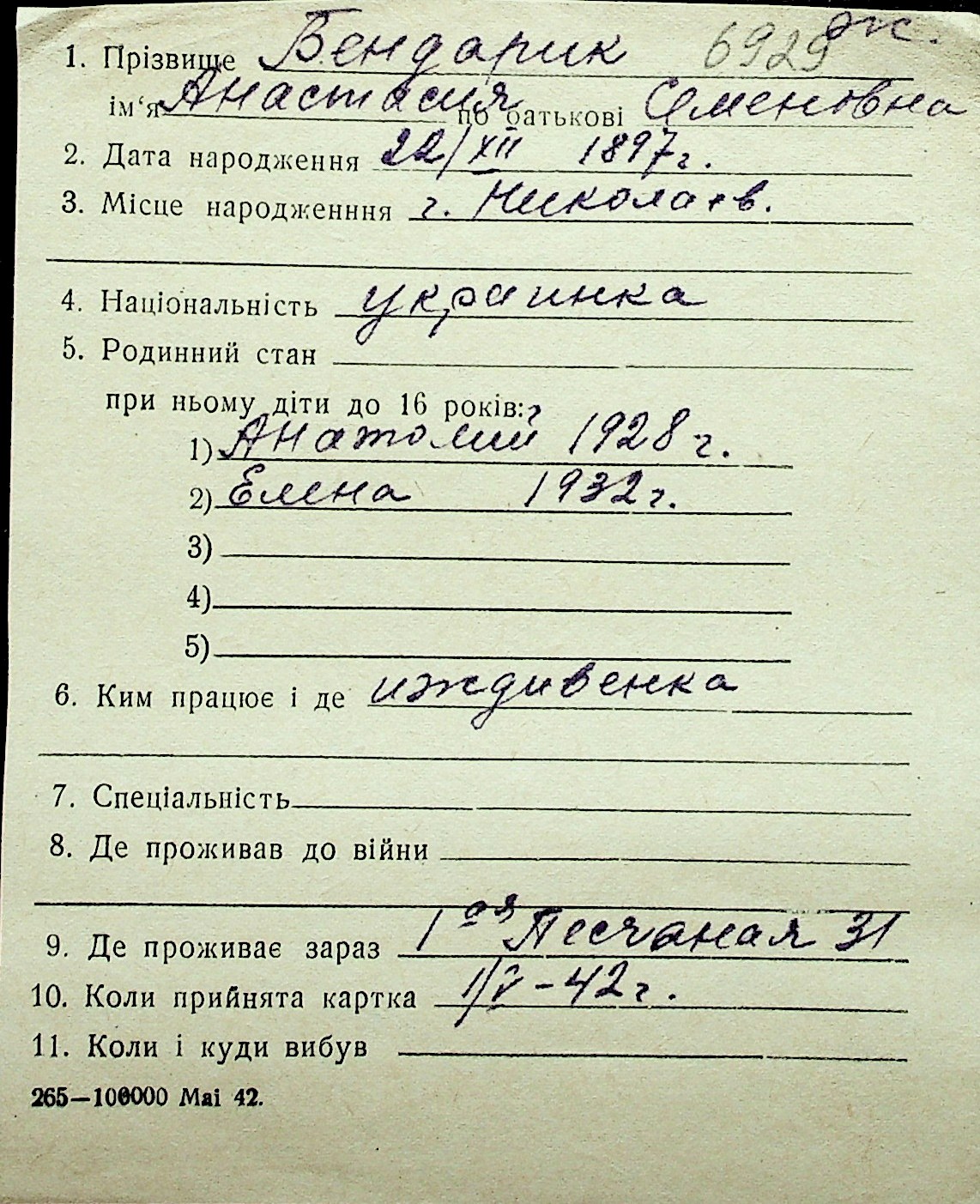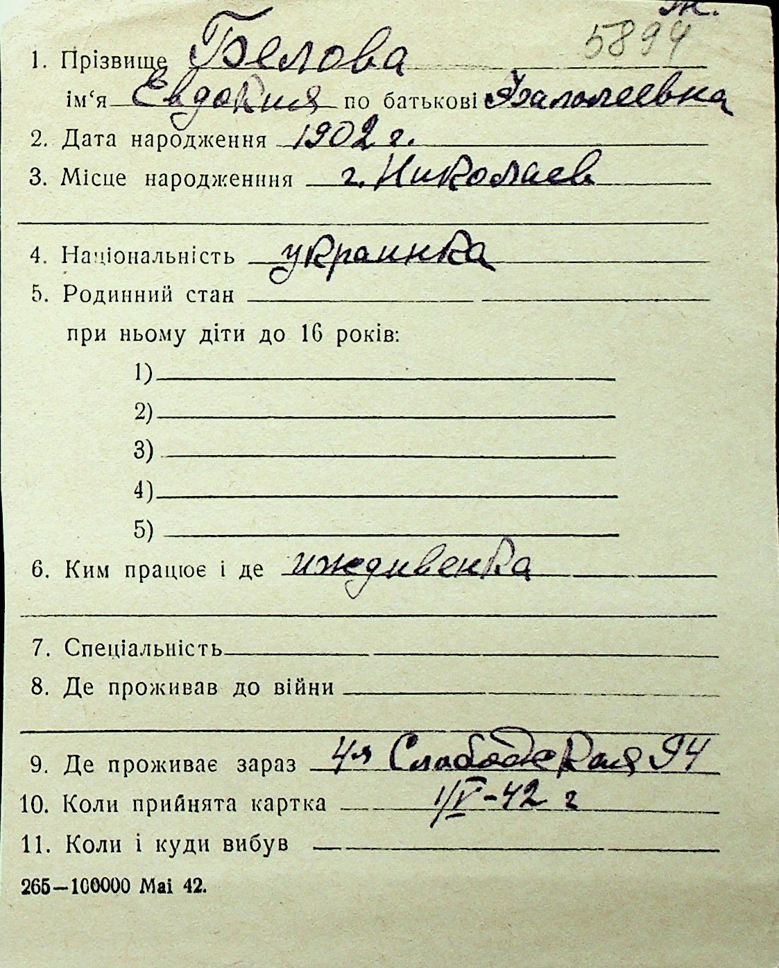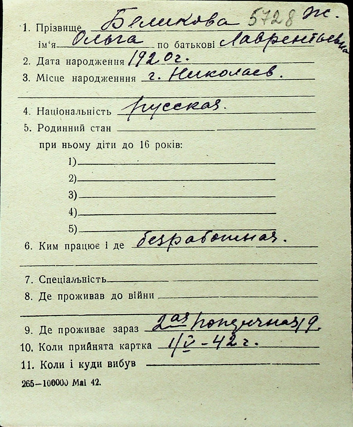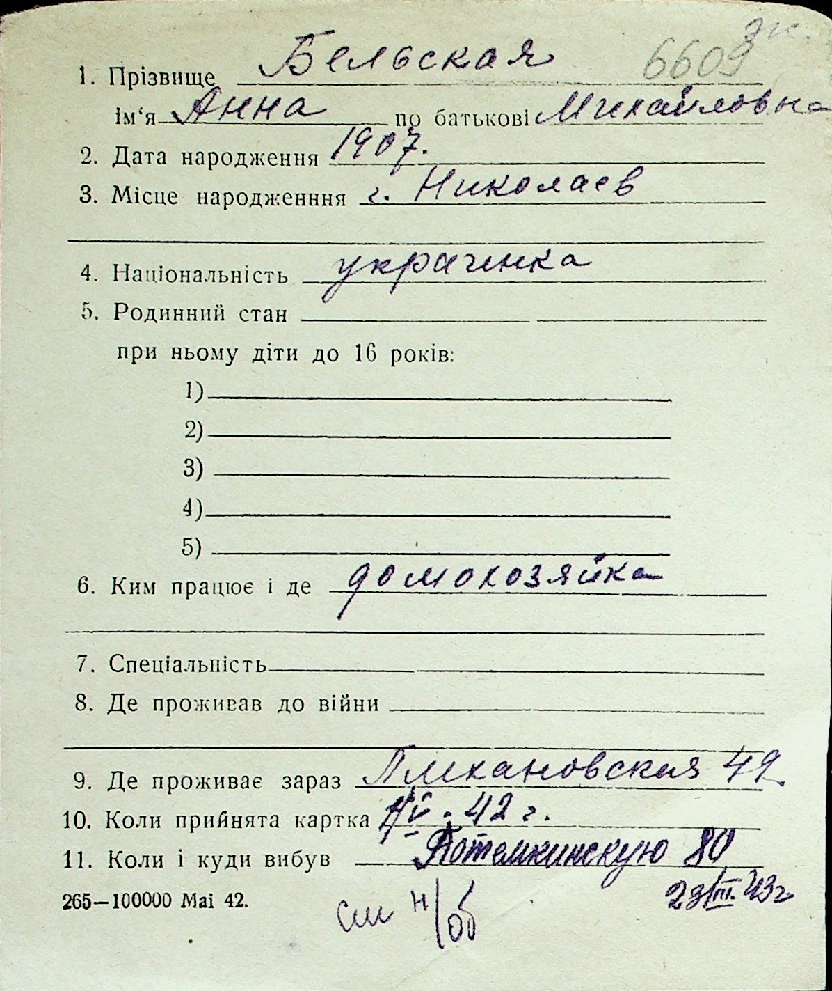 ◦ ◦ Перелік карток на осіб, які мешкали у м. Миколаїв у період окупації 1941–1944 років