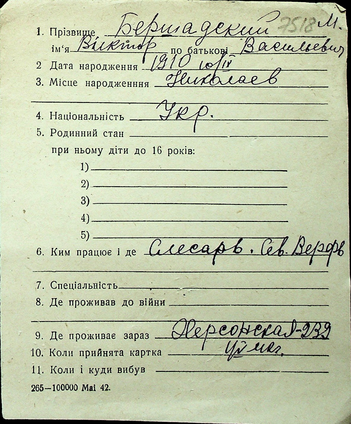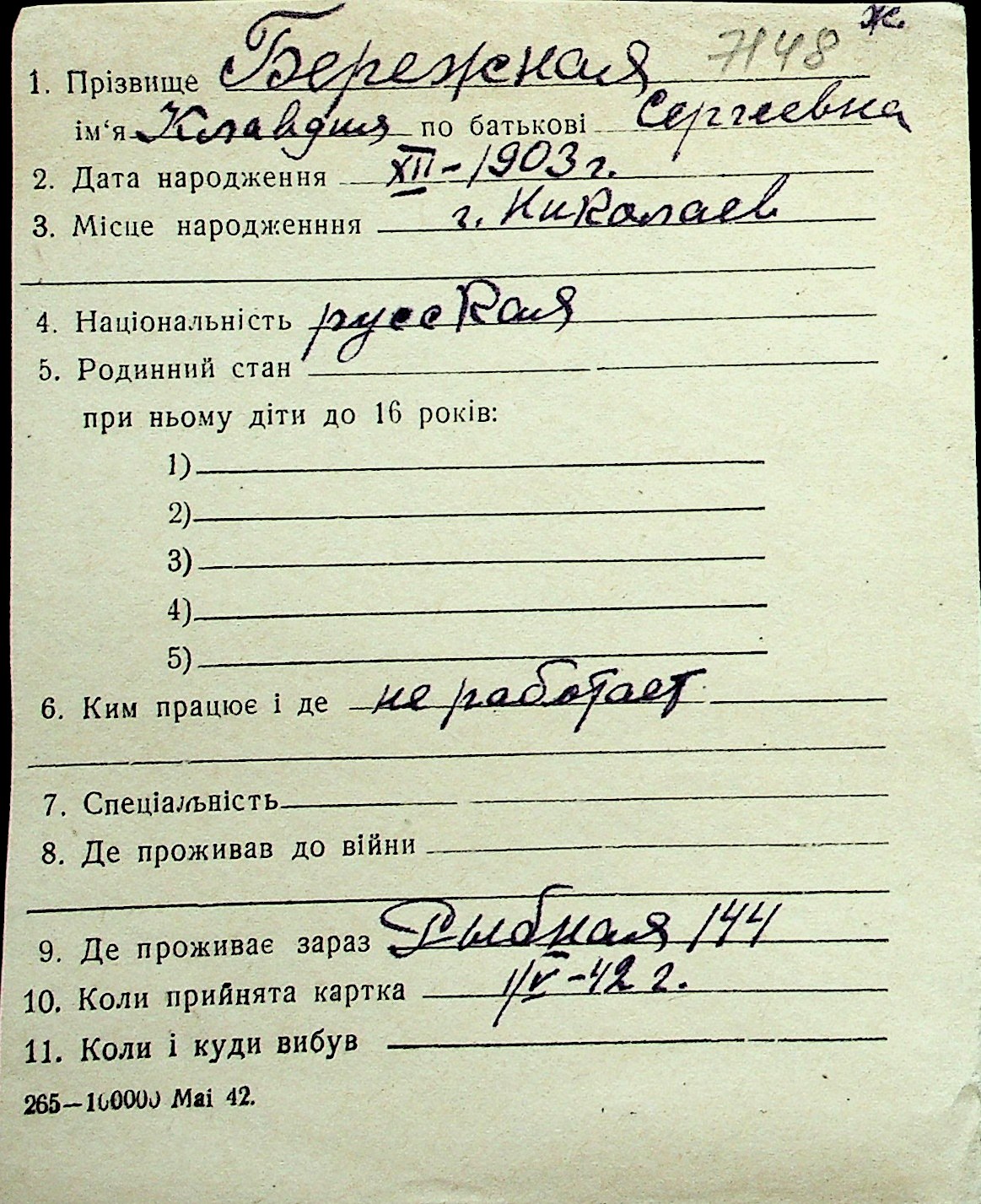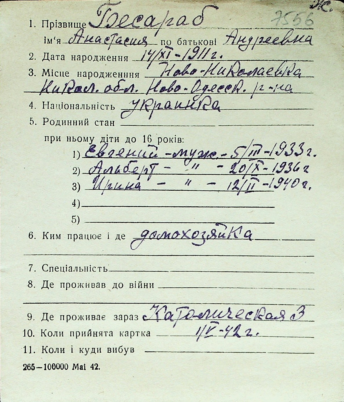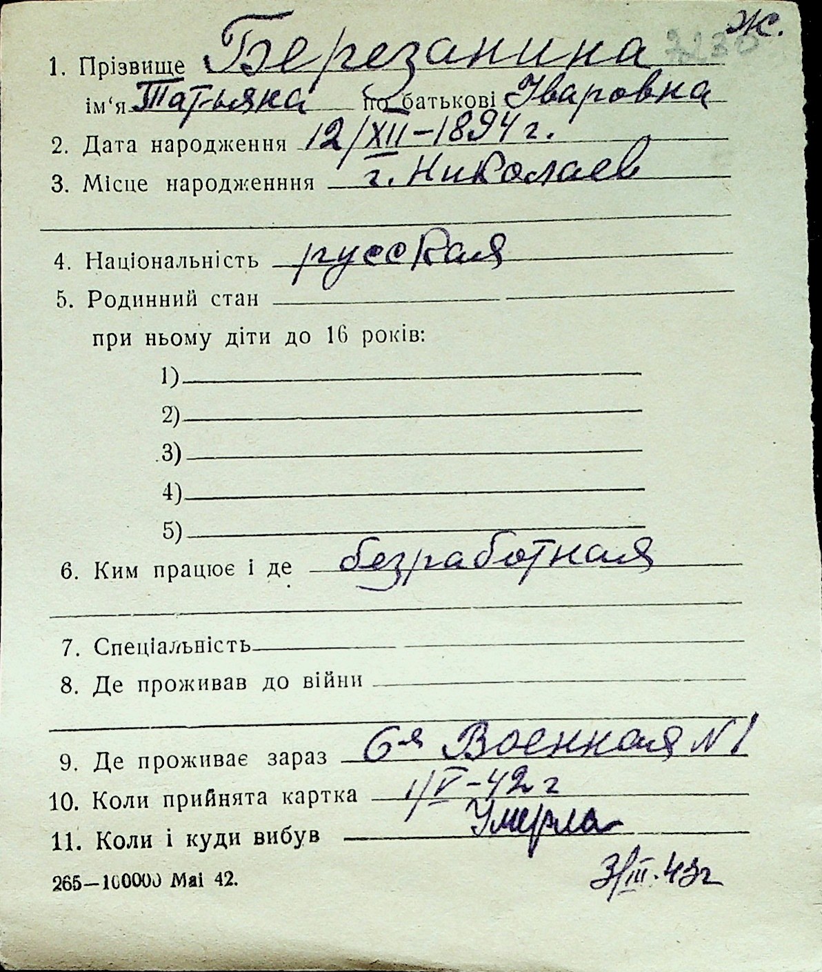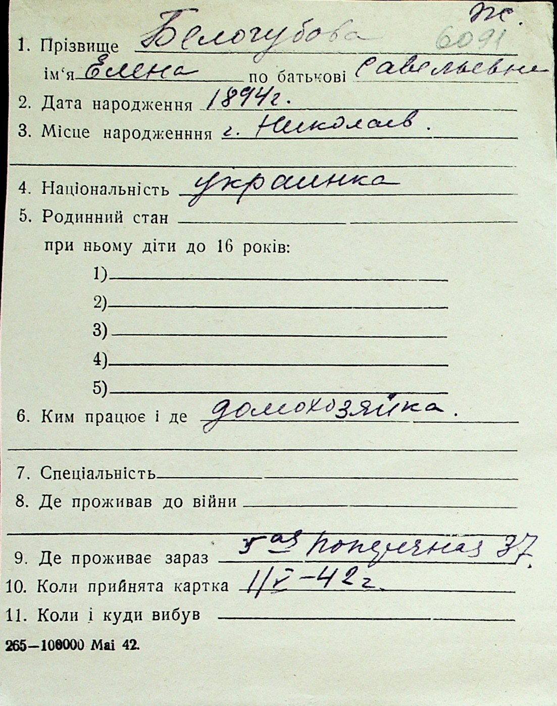 ◦ ◦ Перелік карток на осіб, які мешкали у м. Миколаїв у період окупації 1941–1944 років