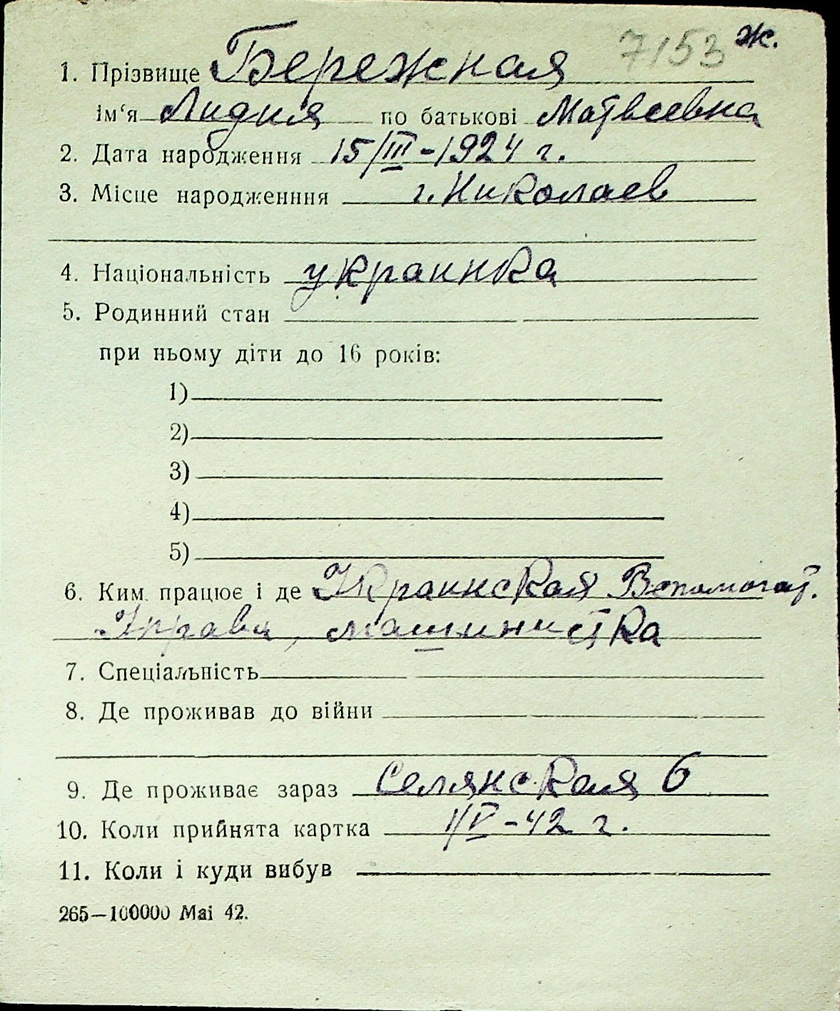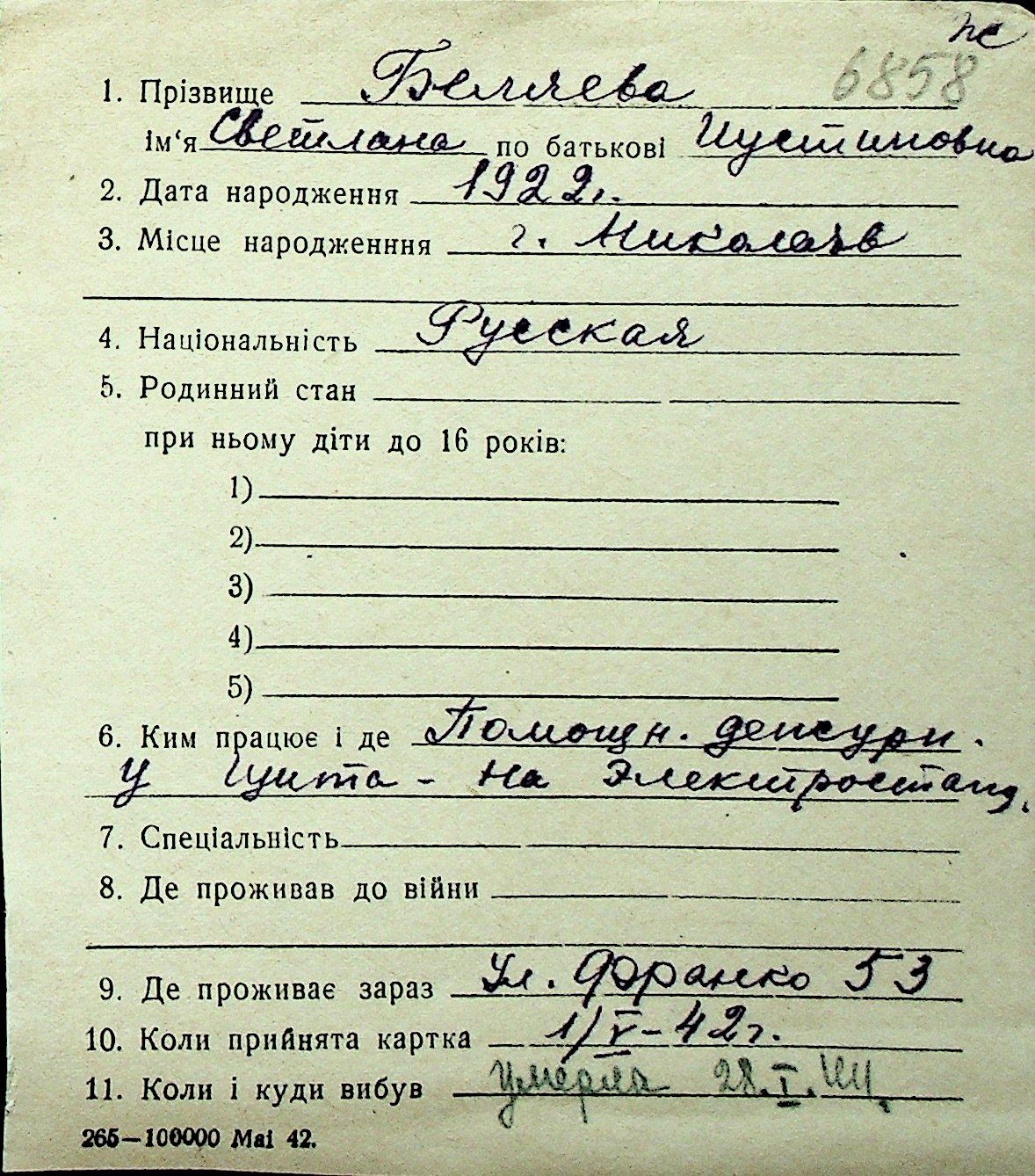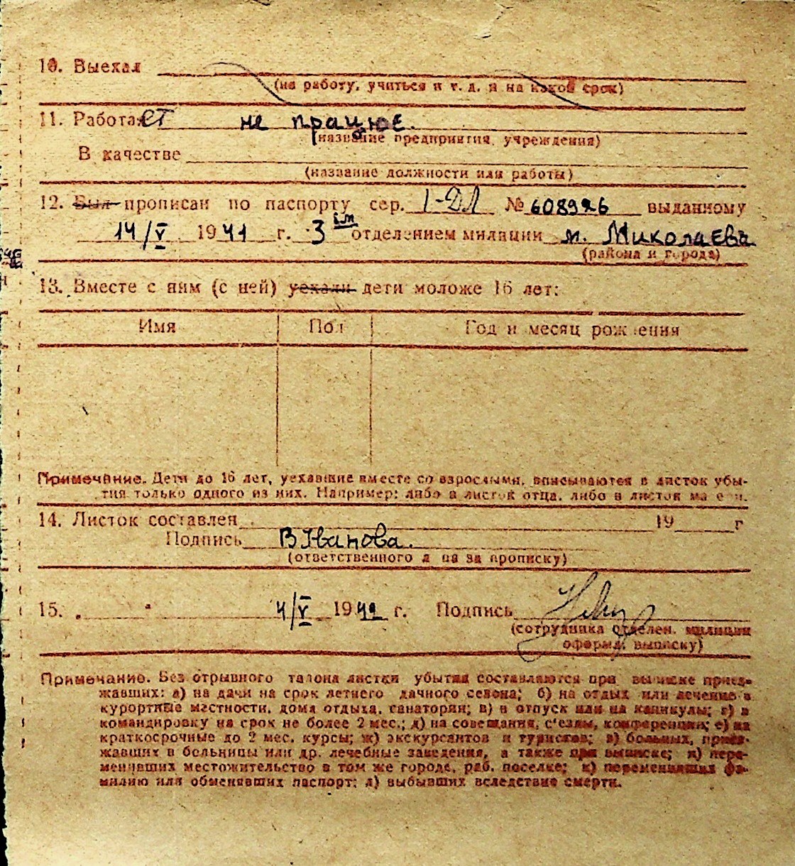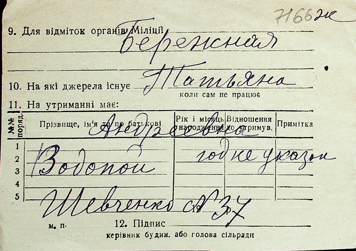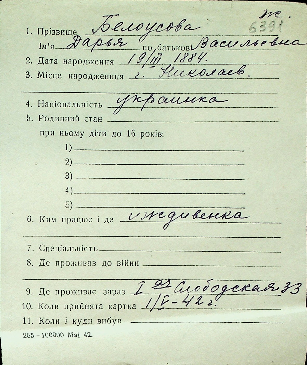 ◦ ◦ Перелік карток на осіб, які мешкали у м. Миколаїв у період окупації 1941–1944 років
