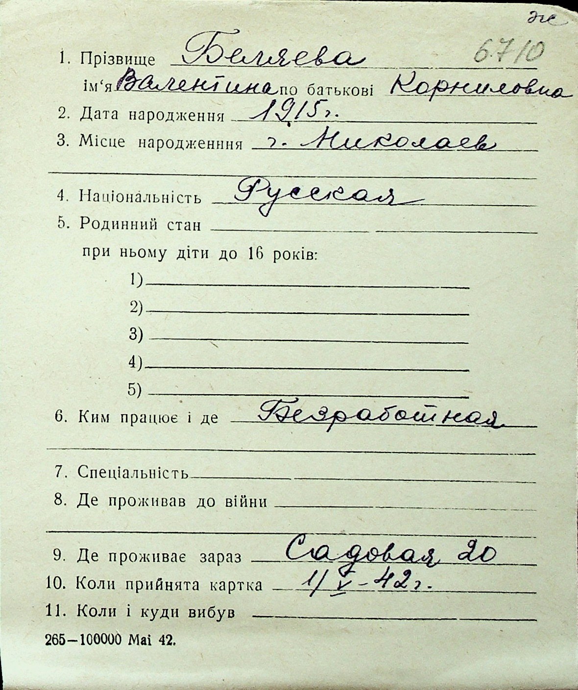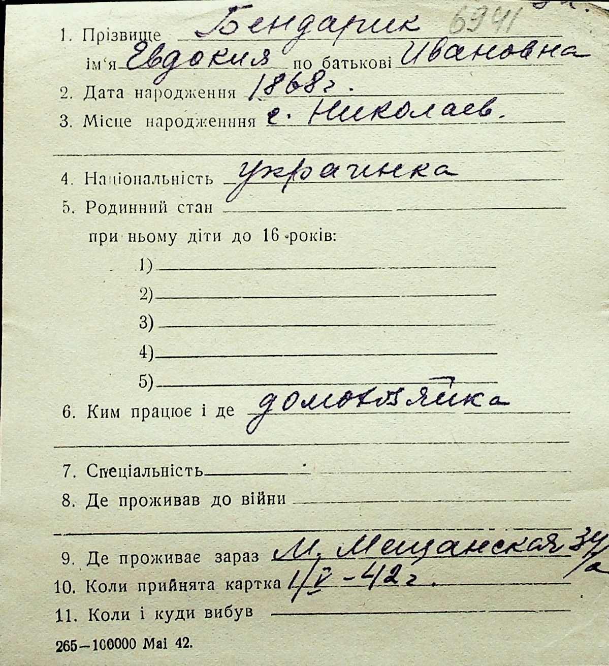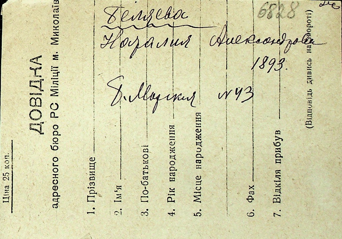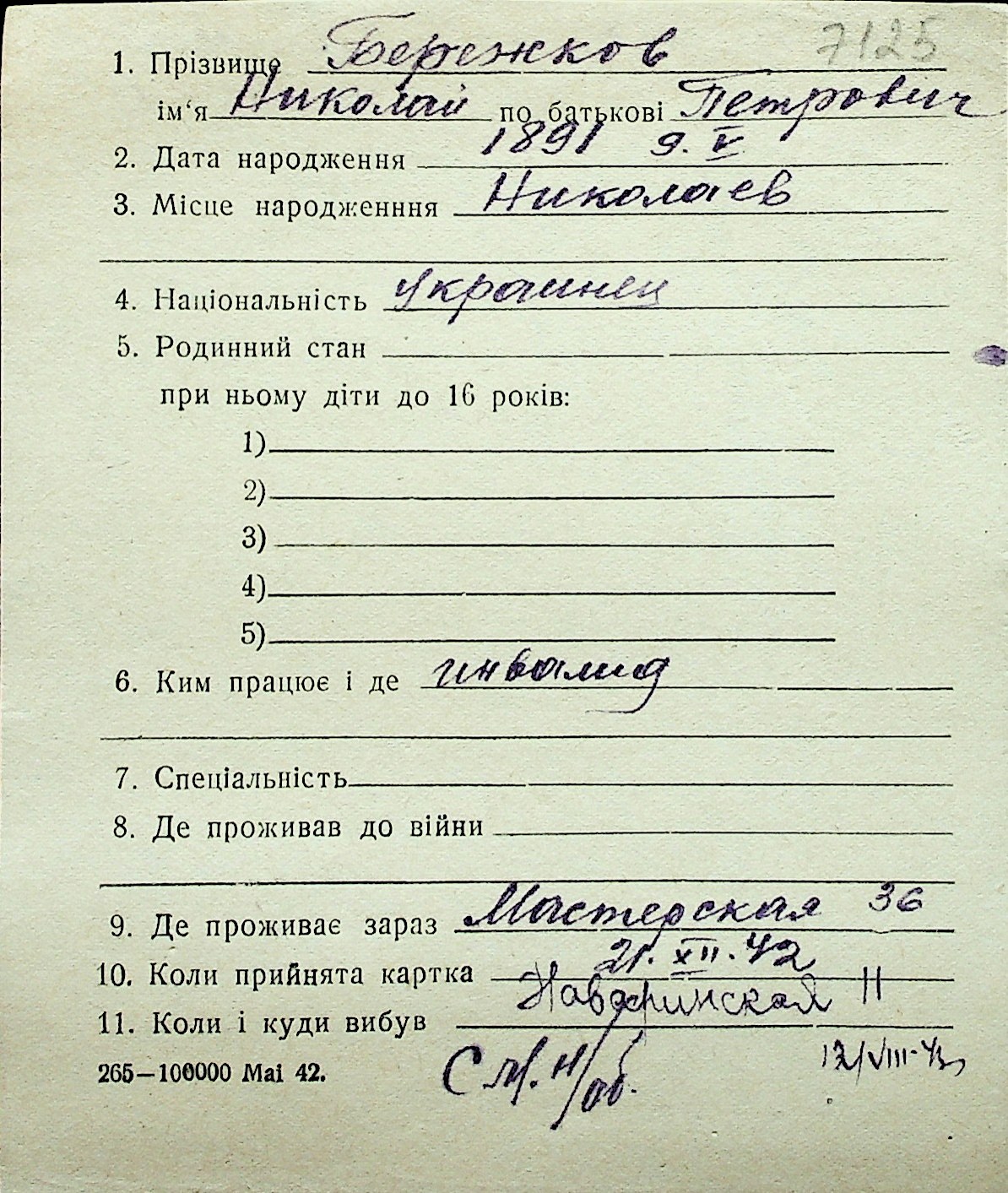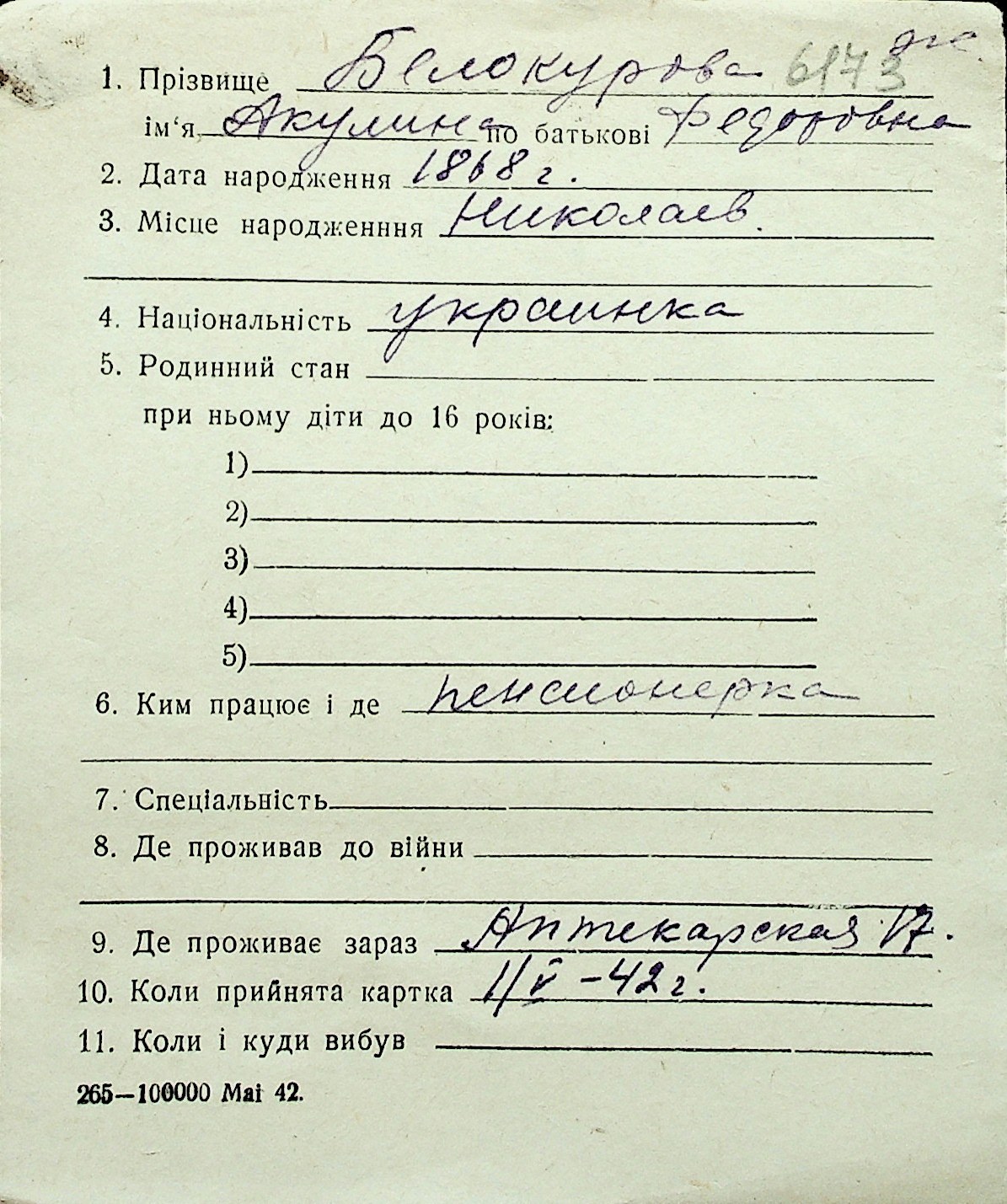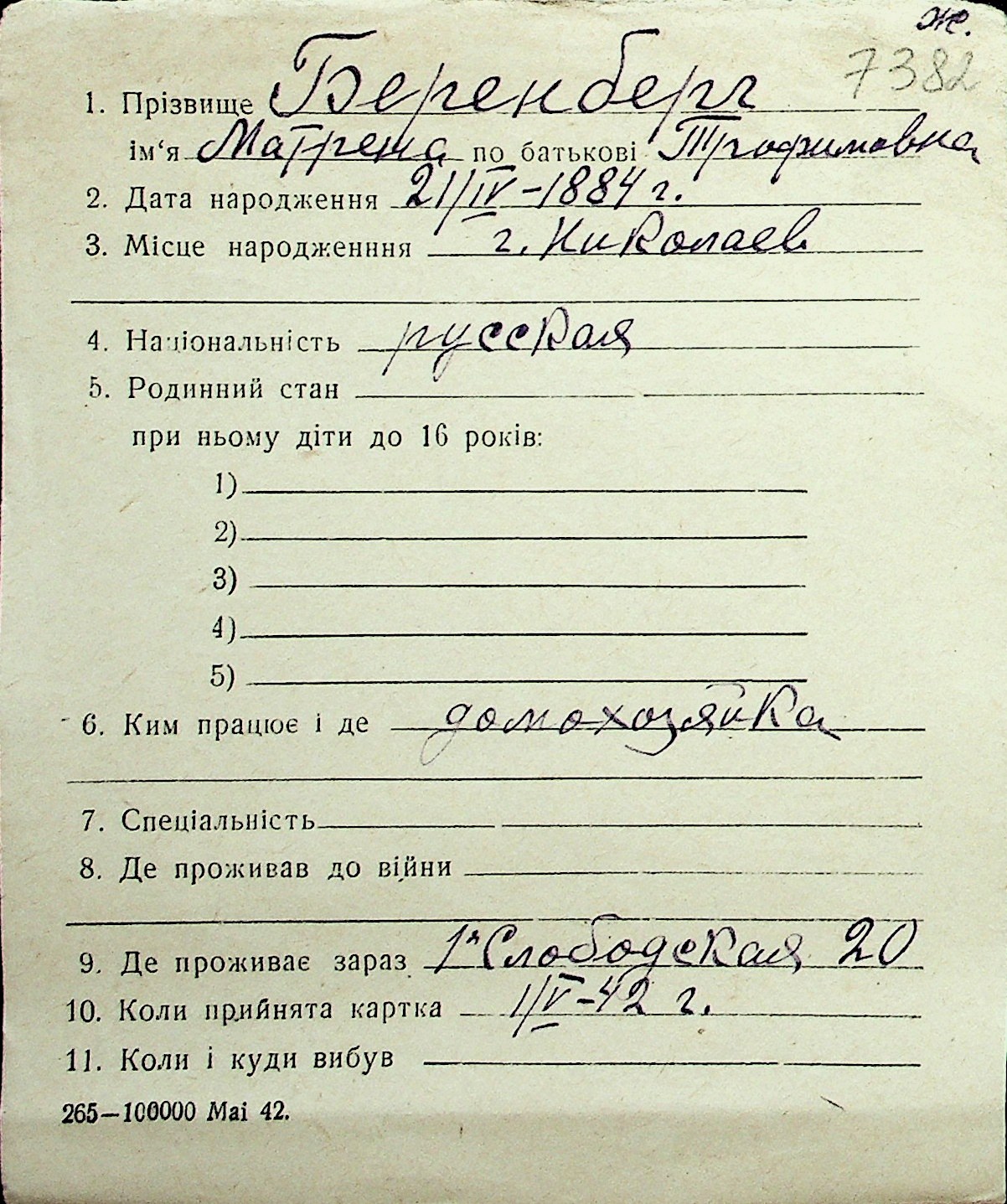 ◦ ◦ Перелік карток на осіб, які мешкали у м. Миколаїв у період окупації 1941–1944 років