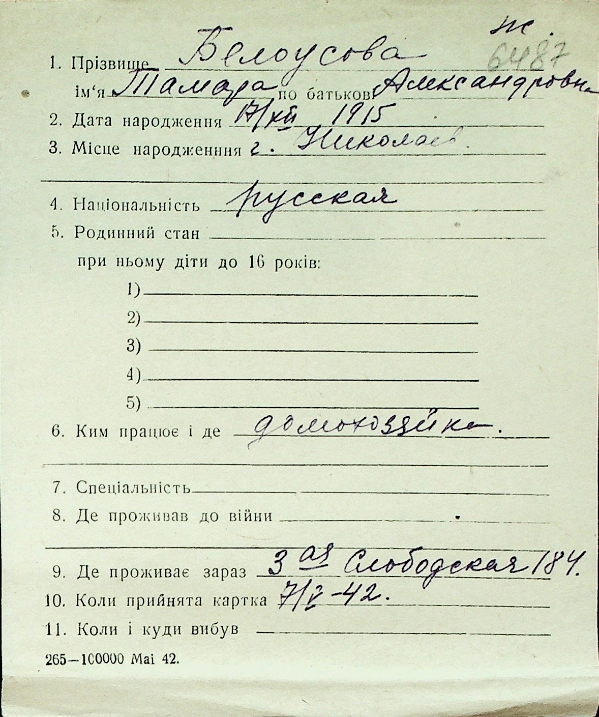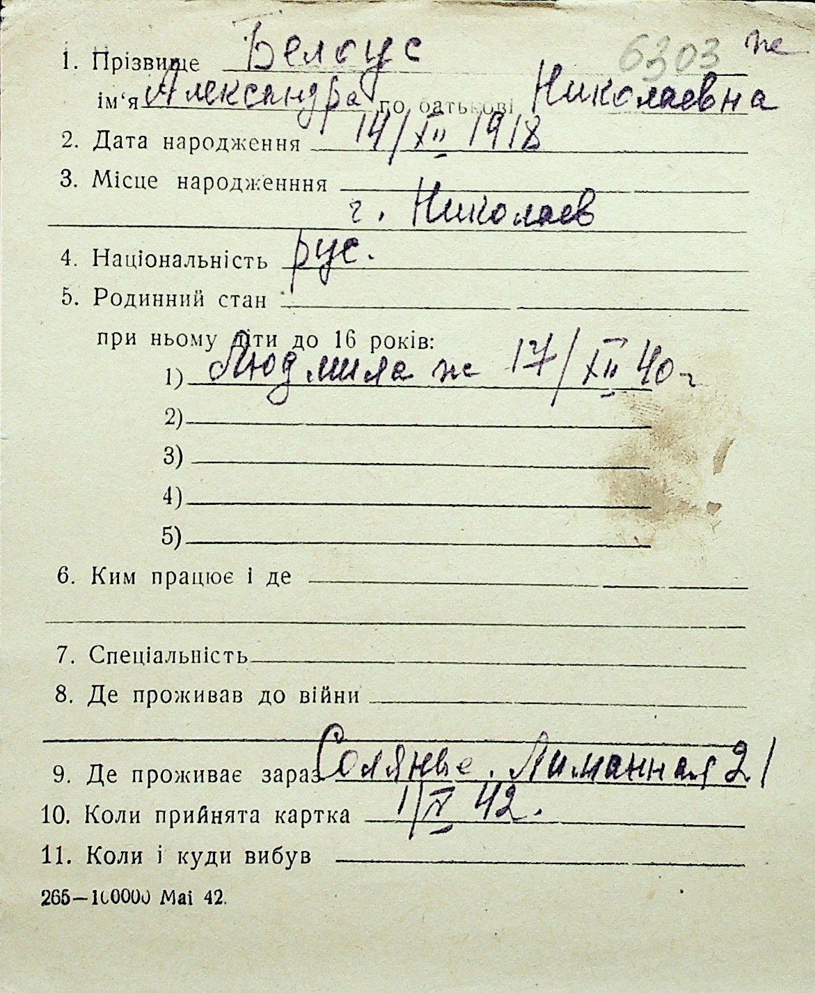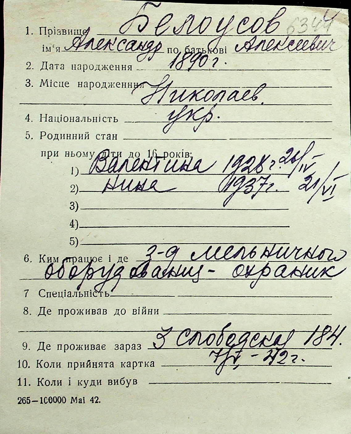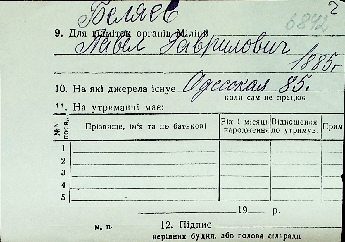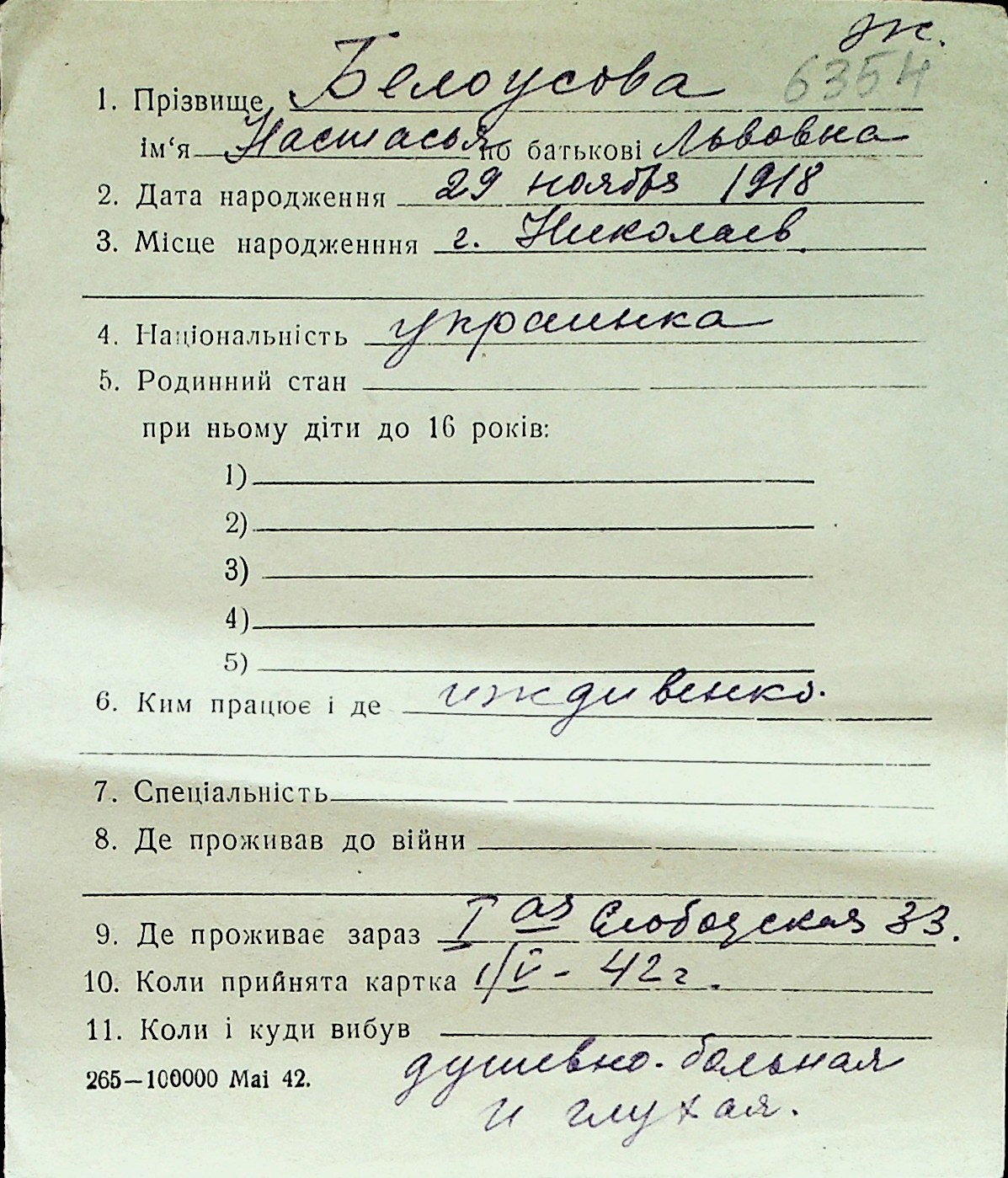 ◦ ◦ Перелік карток на осіб, які мешкали у м. Миколаїв у період окупації 1941–1944 років