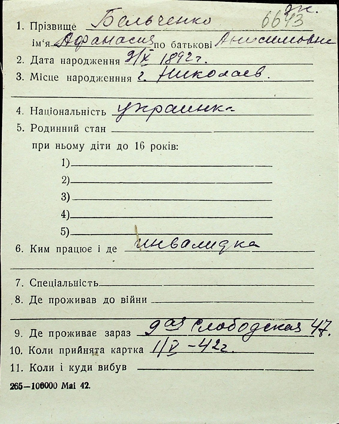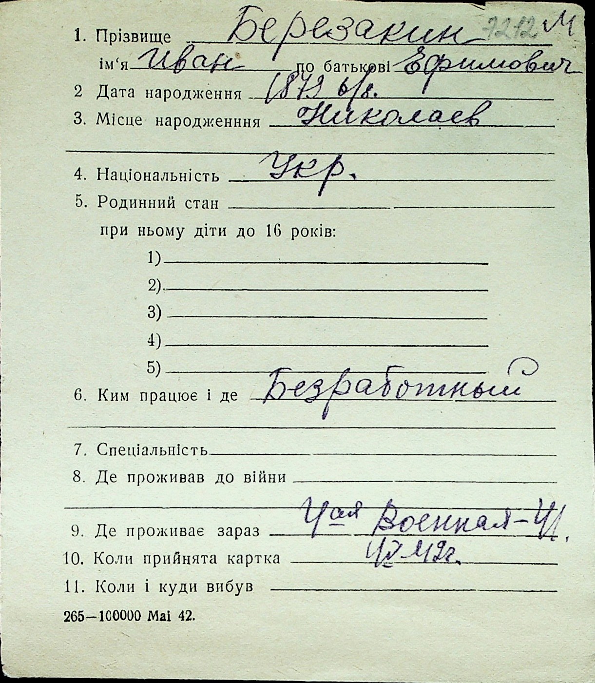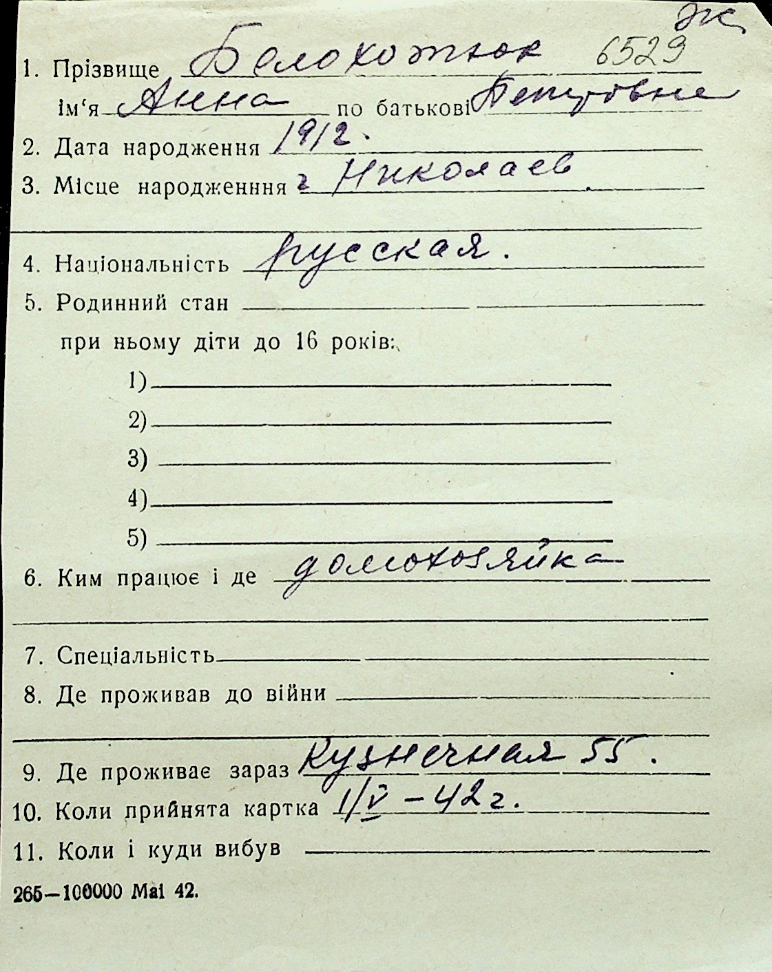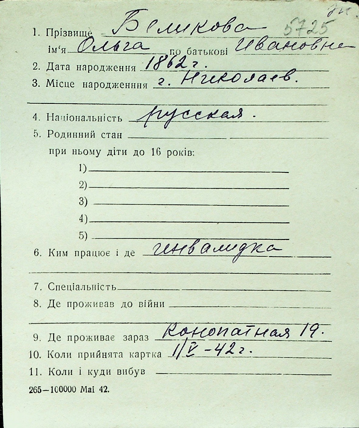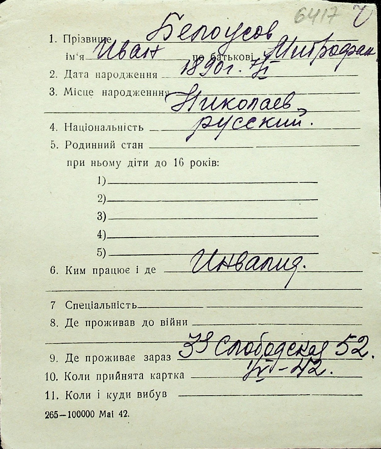 ◦ ◦ Перелік карток на осіб, які мешкали у м. Миколаїв у період окупації 1941–1944 років