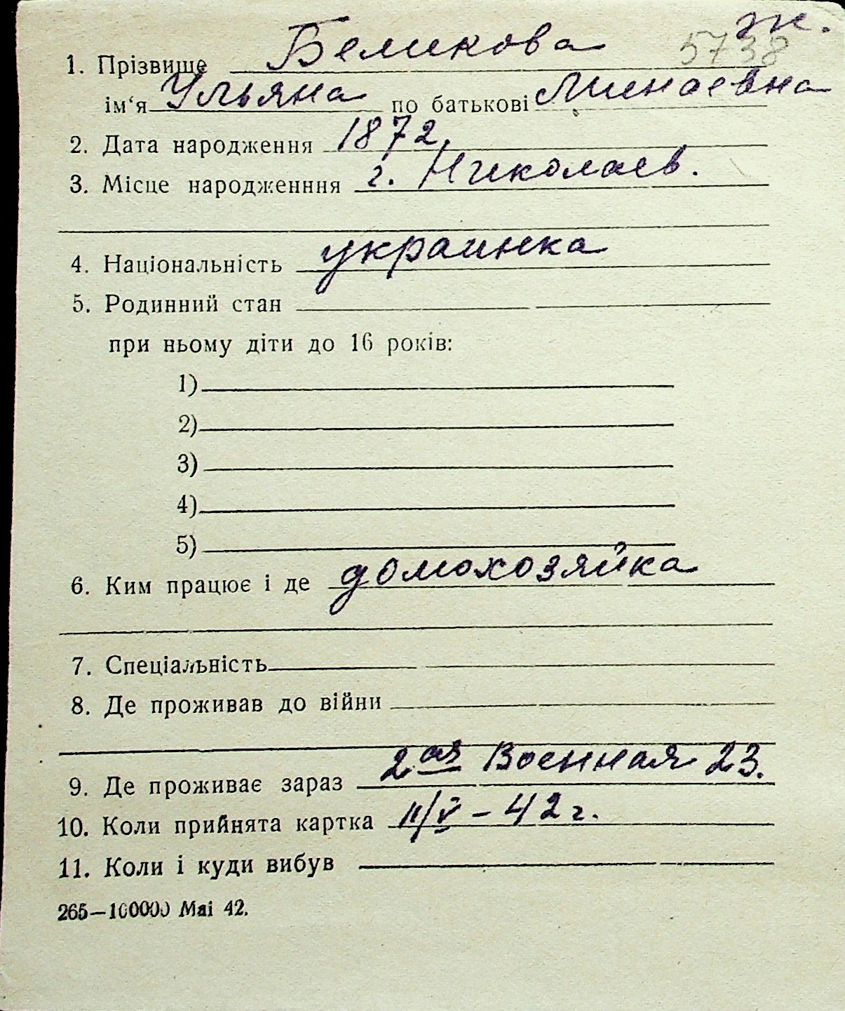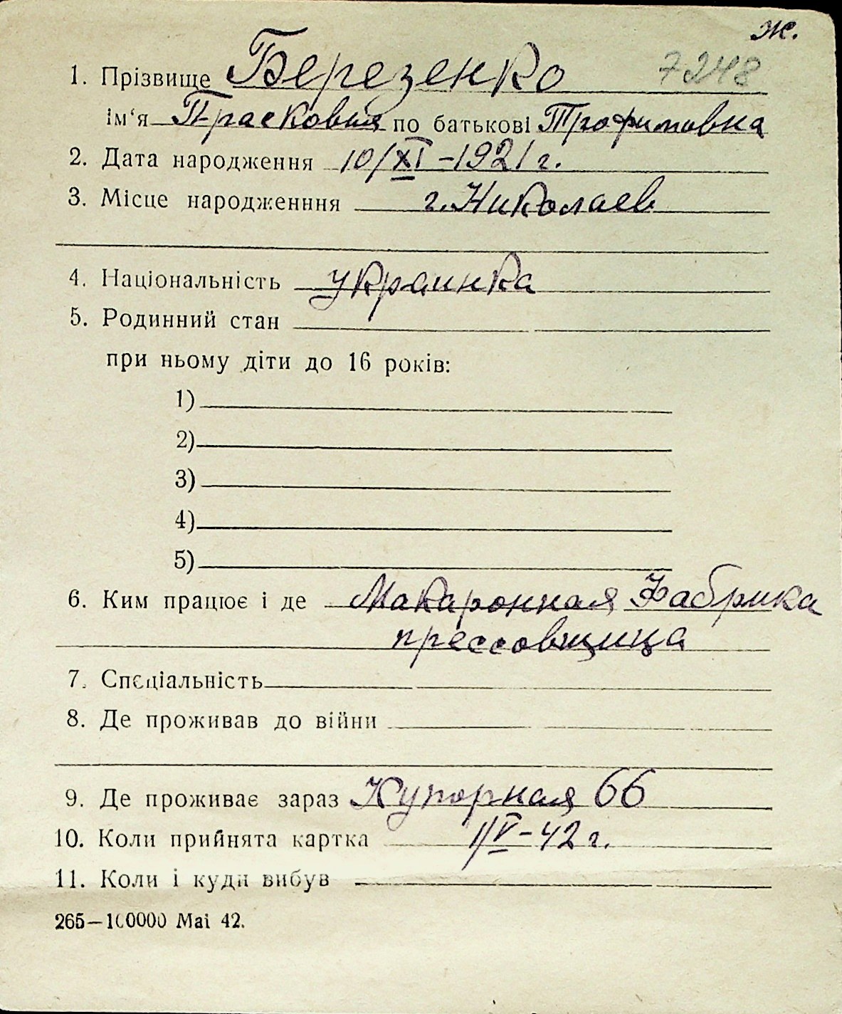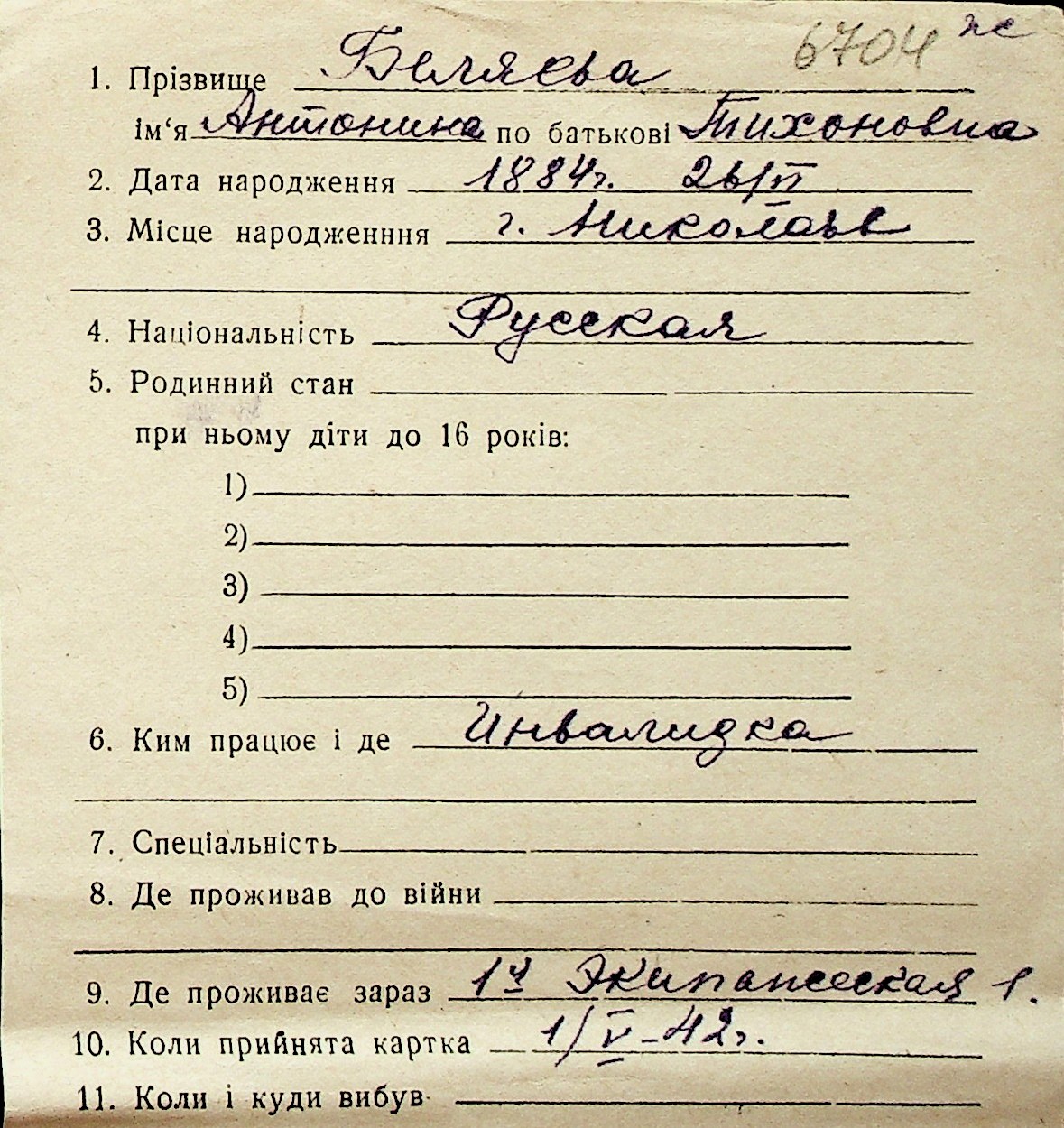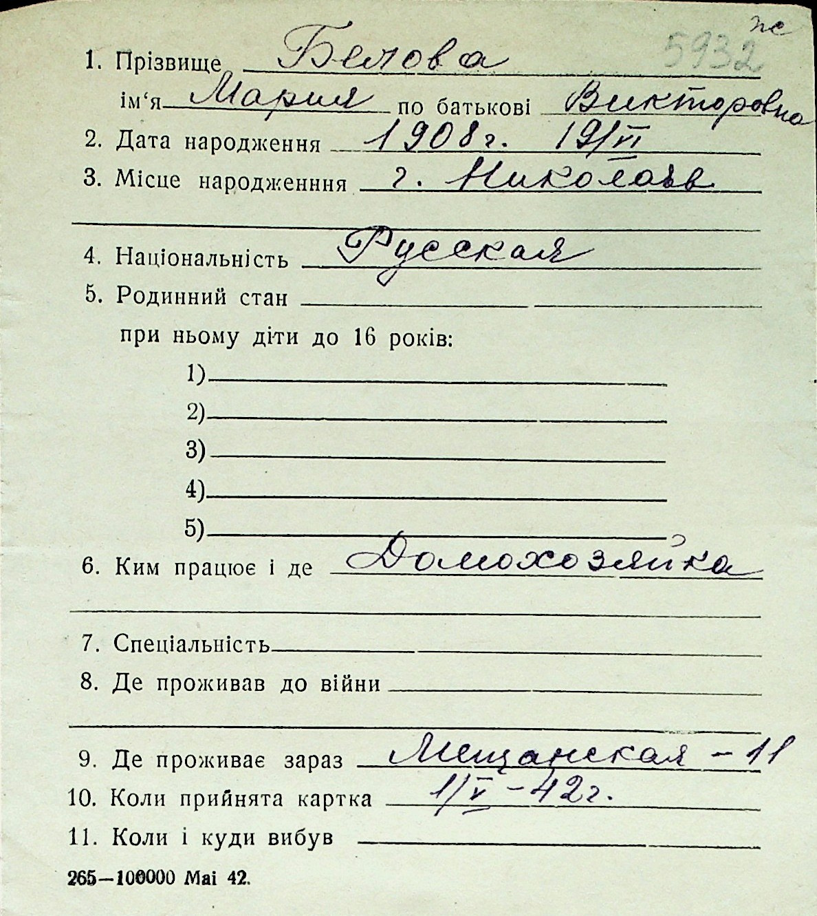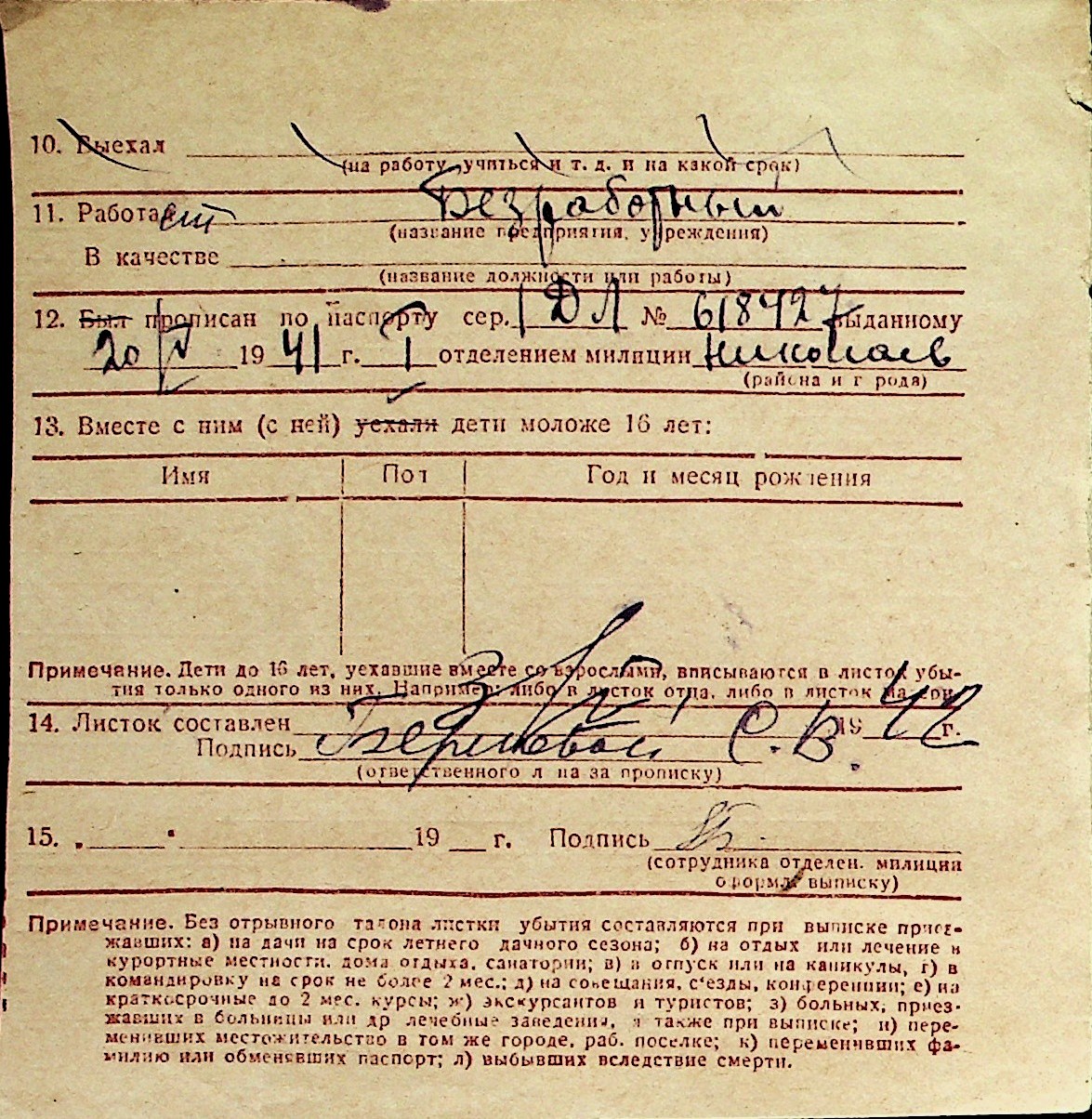 ◦ ◦ Перелік карток на осіб, які мешкали у м. Миколаїв у період окупації 1941–1944 років