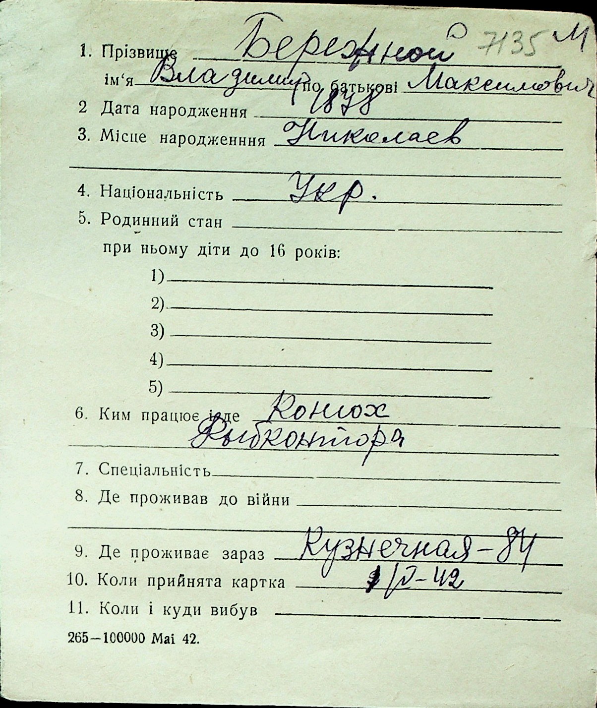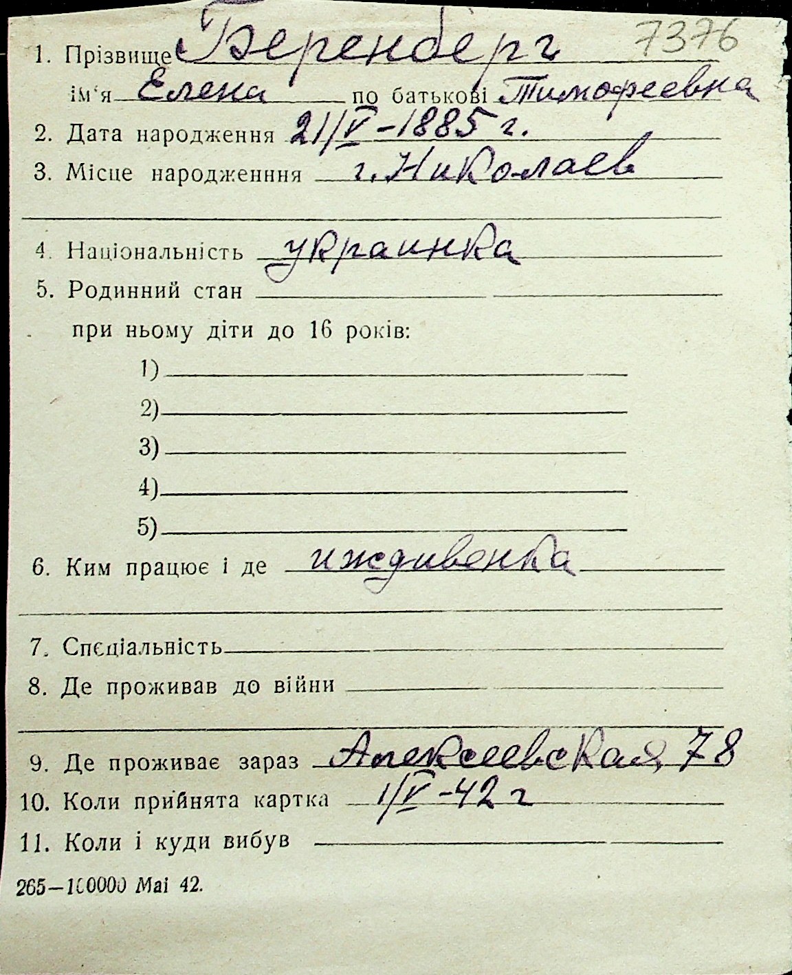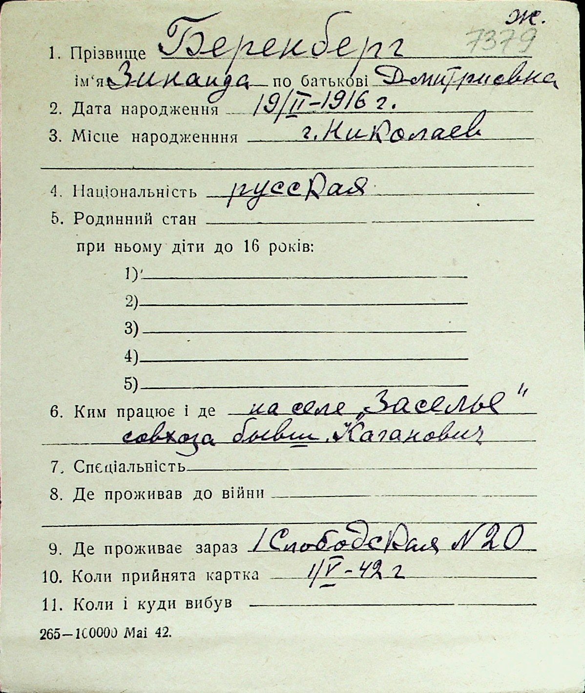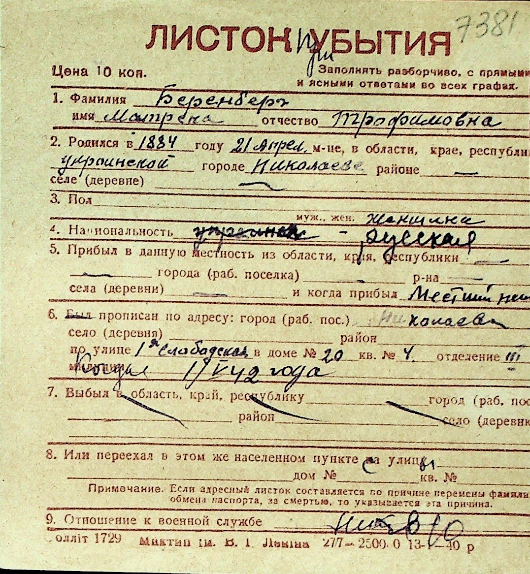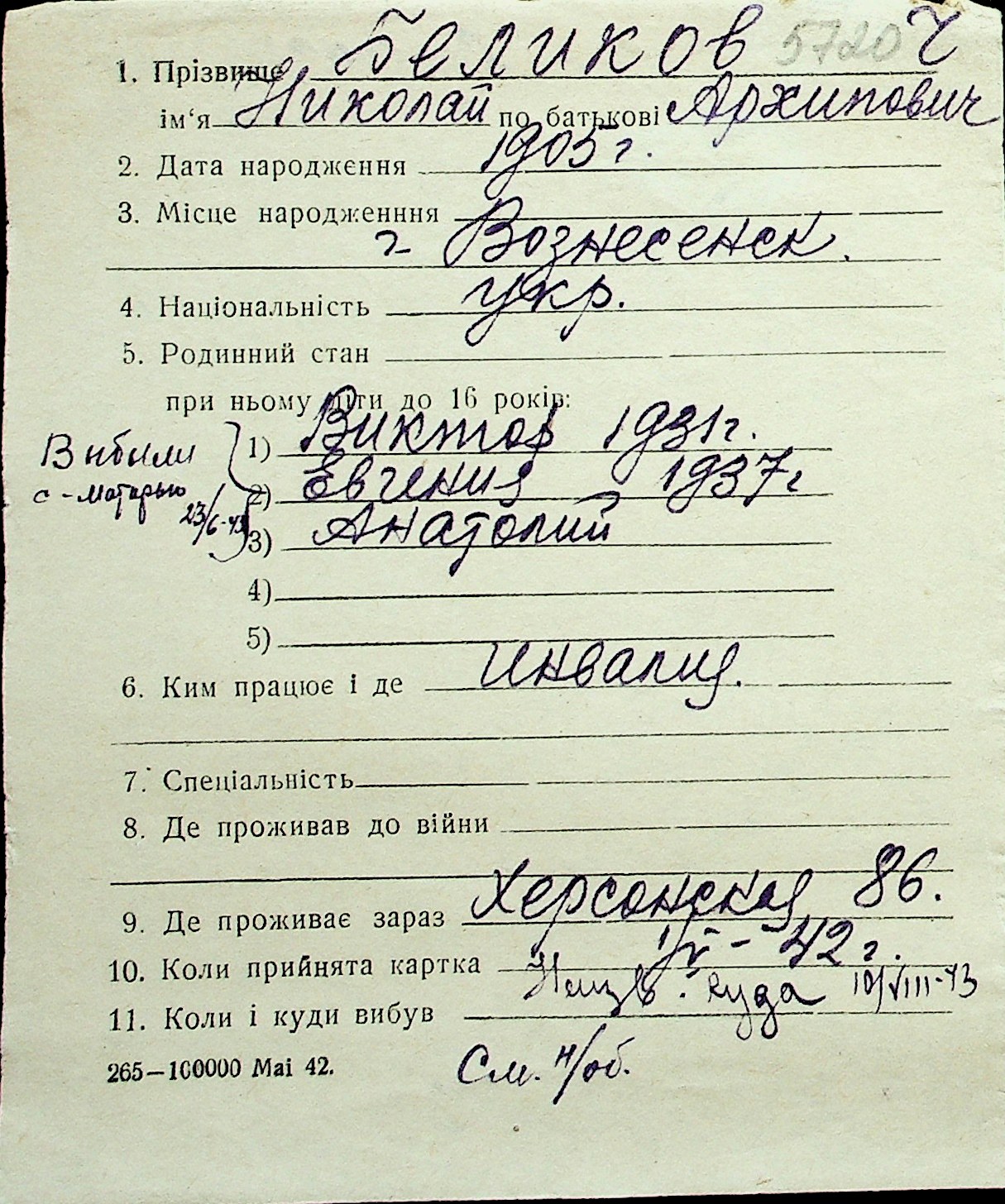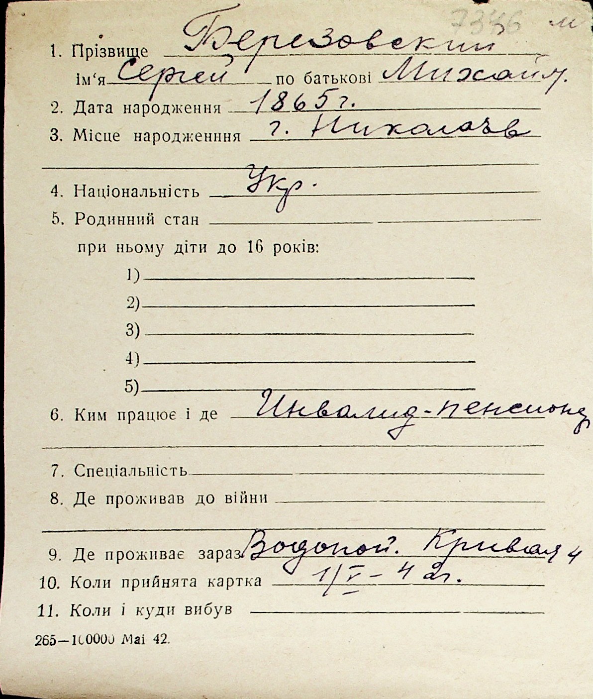 ◦ ◦ Перелік карток на осіб, які мешкали у м. Миколаїв у період окупації 1941–1944 років