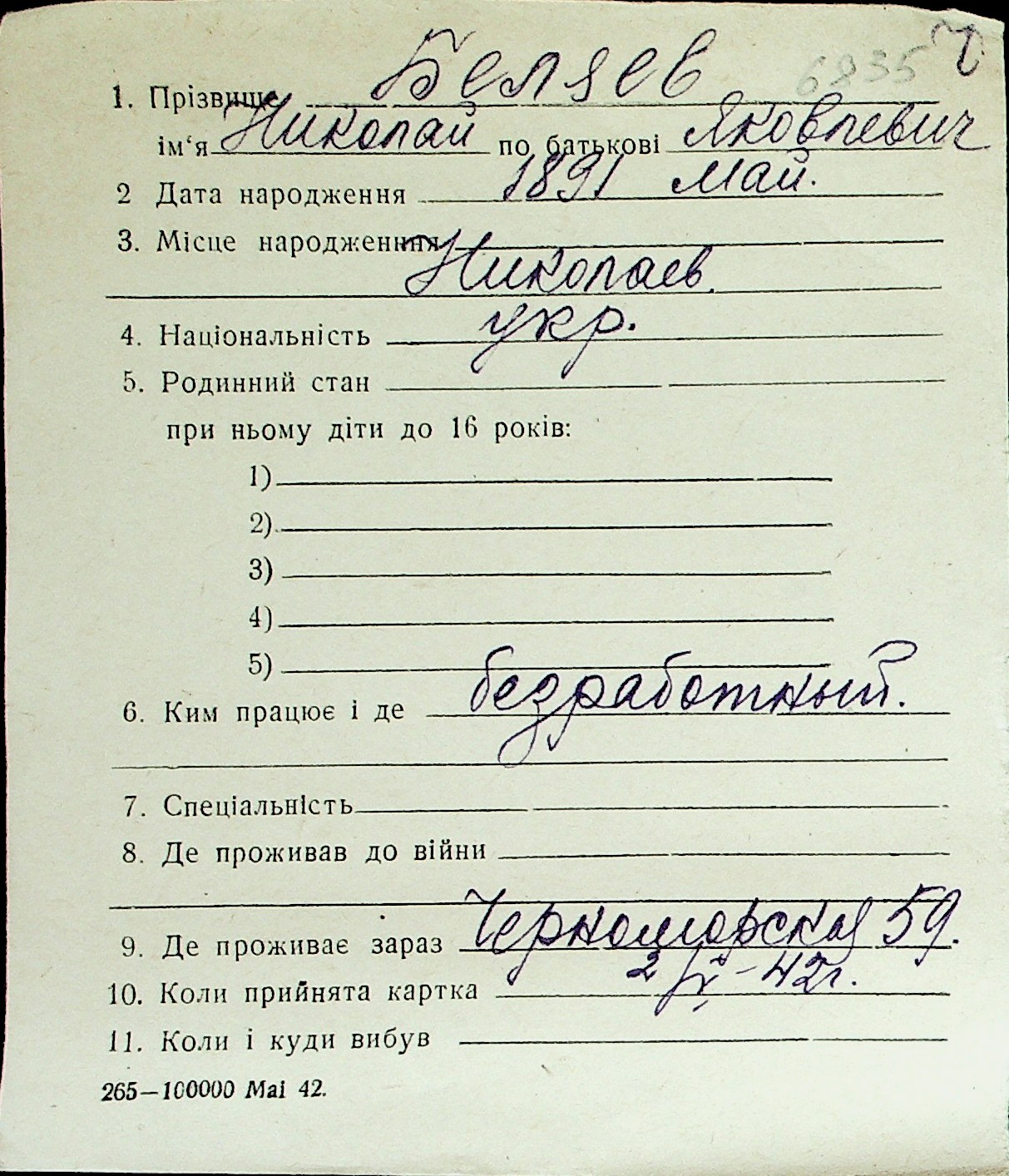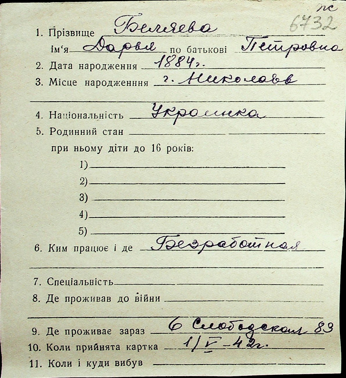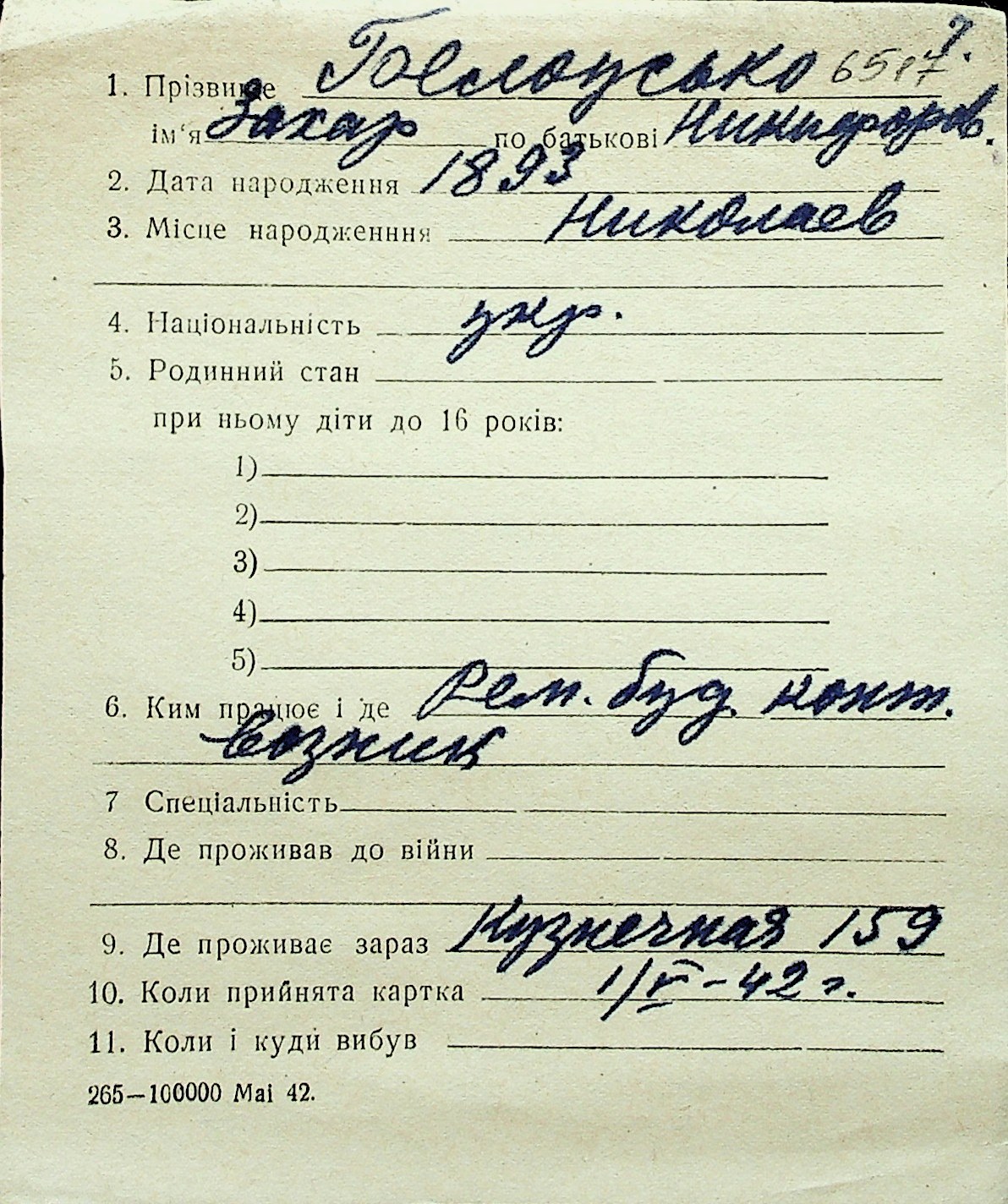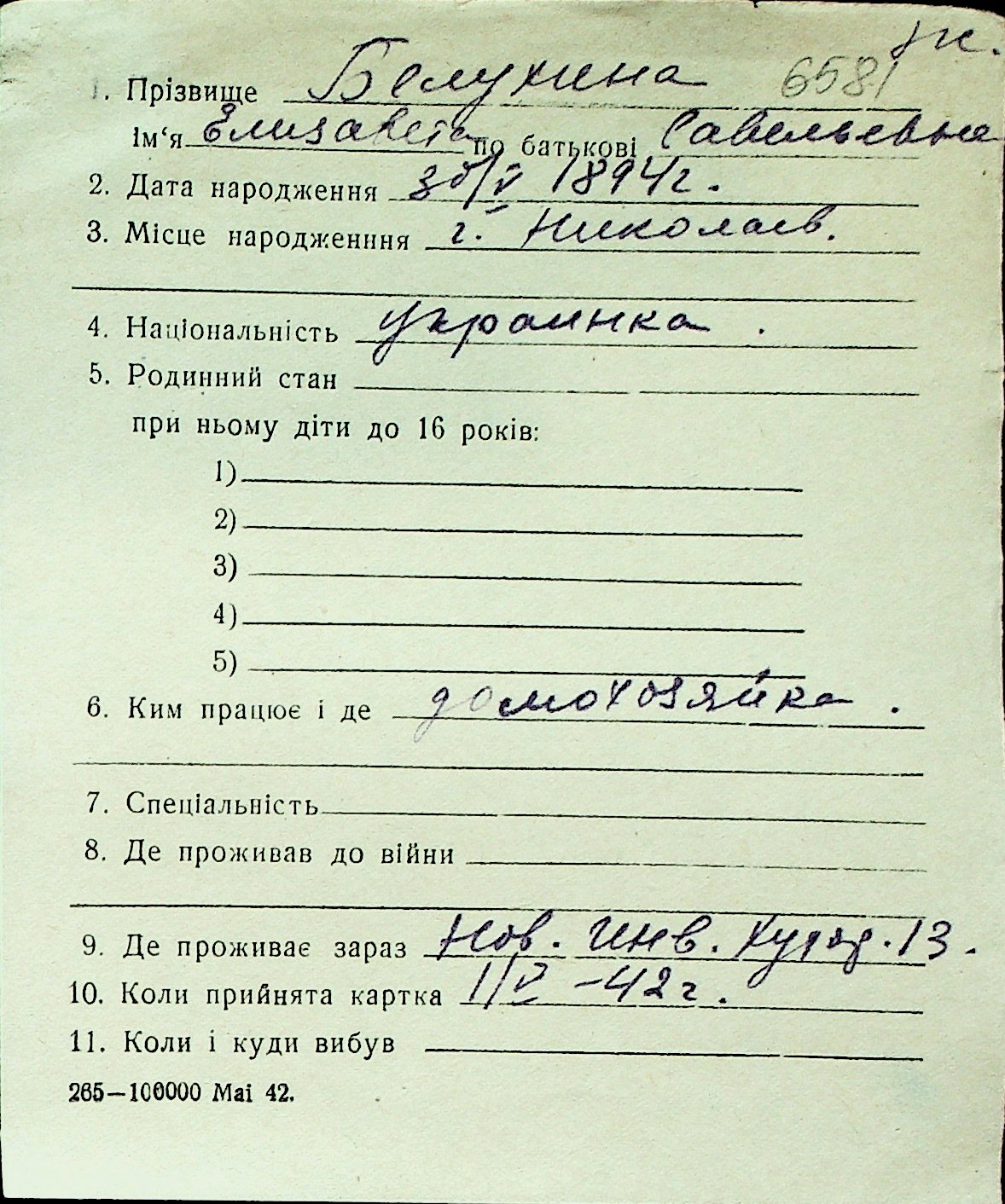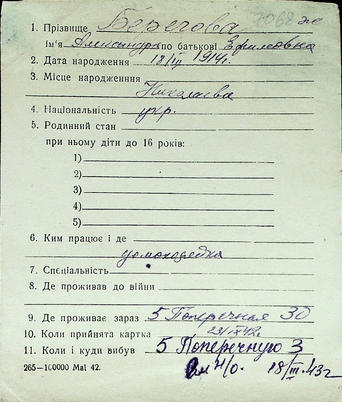 ◦ ◦ Перелік карток на осіб, які мешкали у м. Миколаїв у період окупації 1941–1944 років