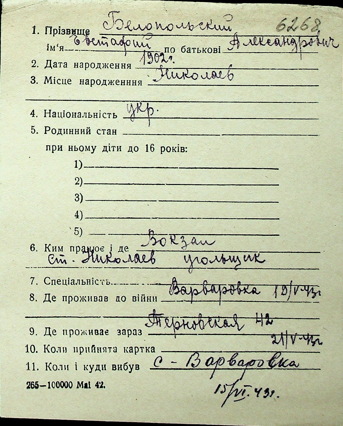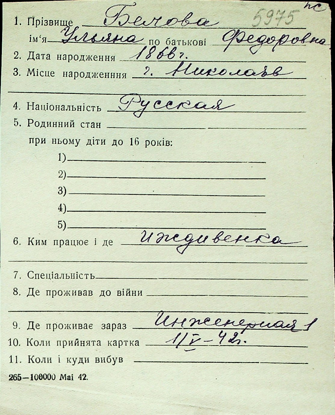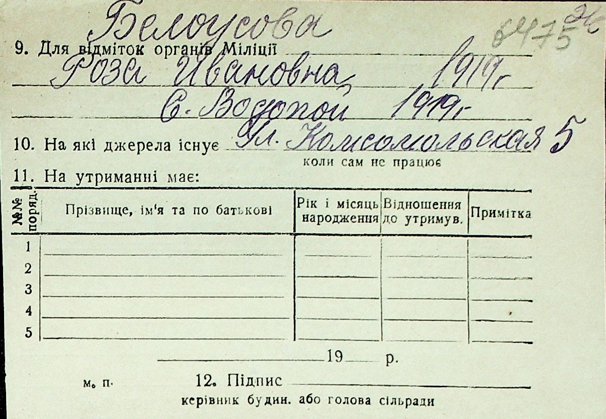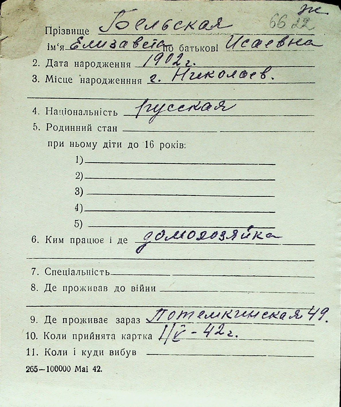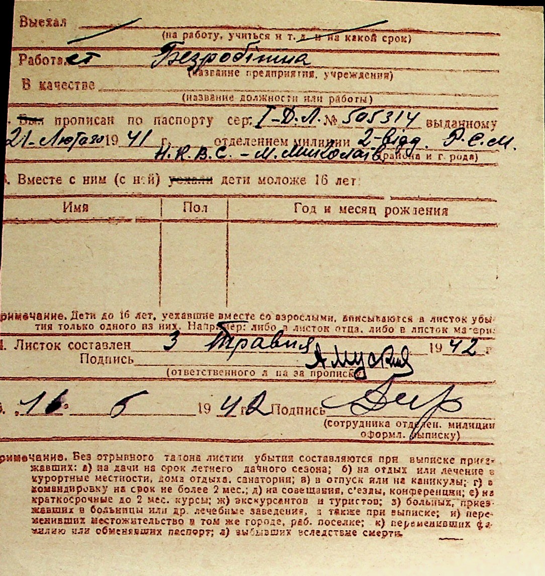 ◦ ◦ Перелік карток на осіб, які мешкали у м. Миколаїв у період окупації 1941–1944 років