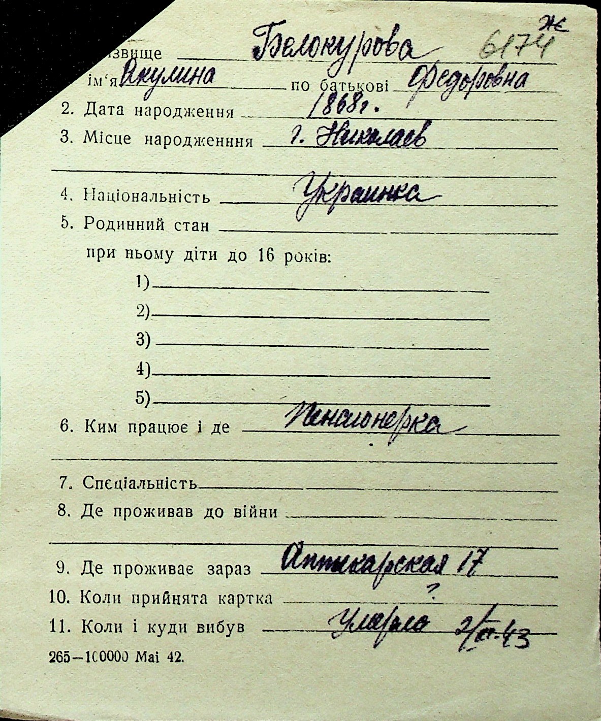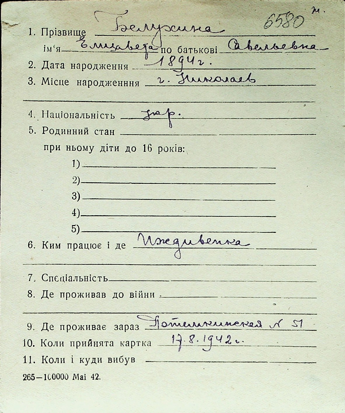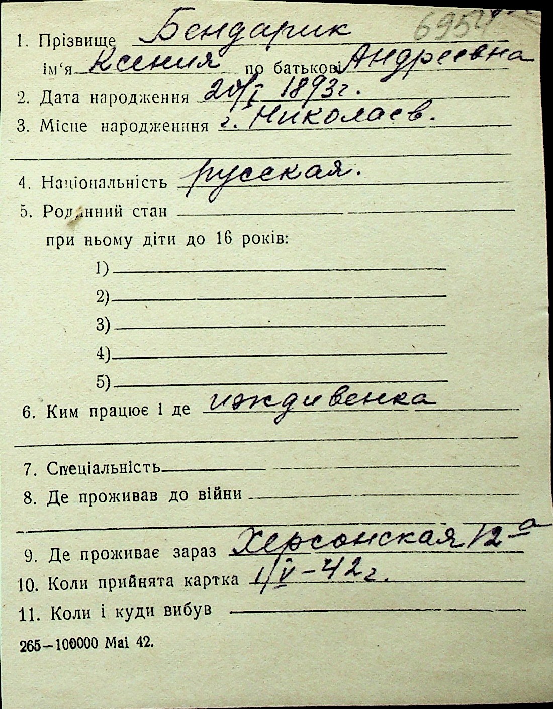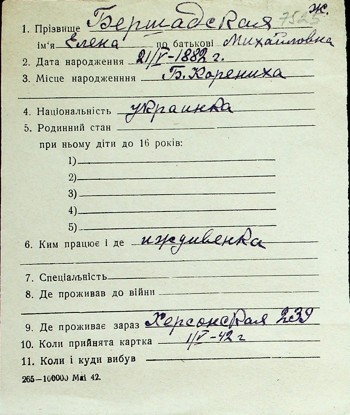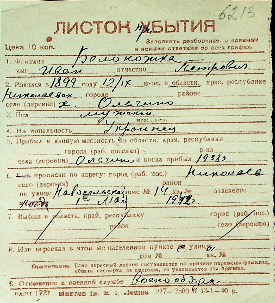 ◦ ◦ Перелік карток на осіб, які мешкали у м. Миколаїв у період окупації 1941–1944 років