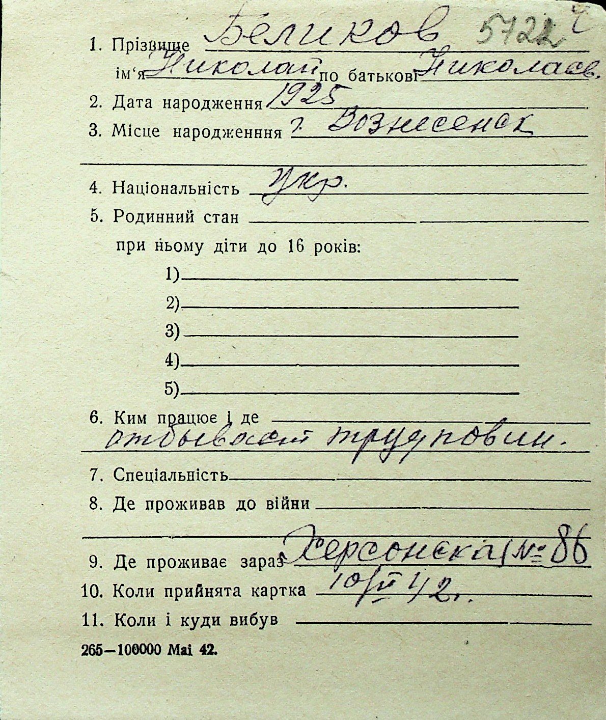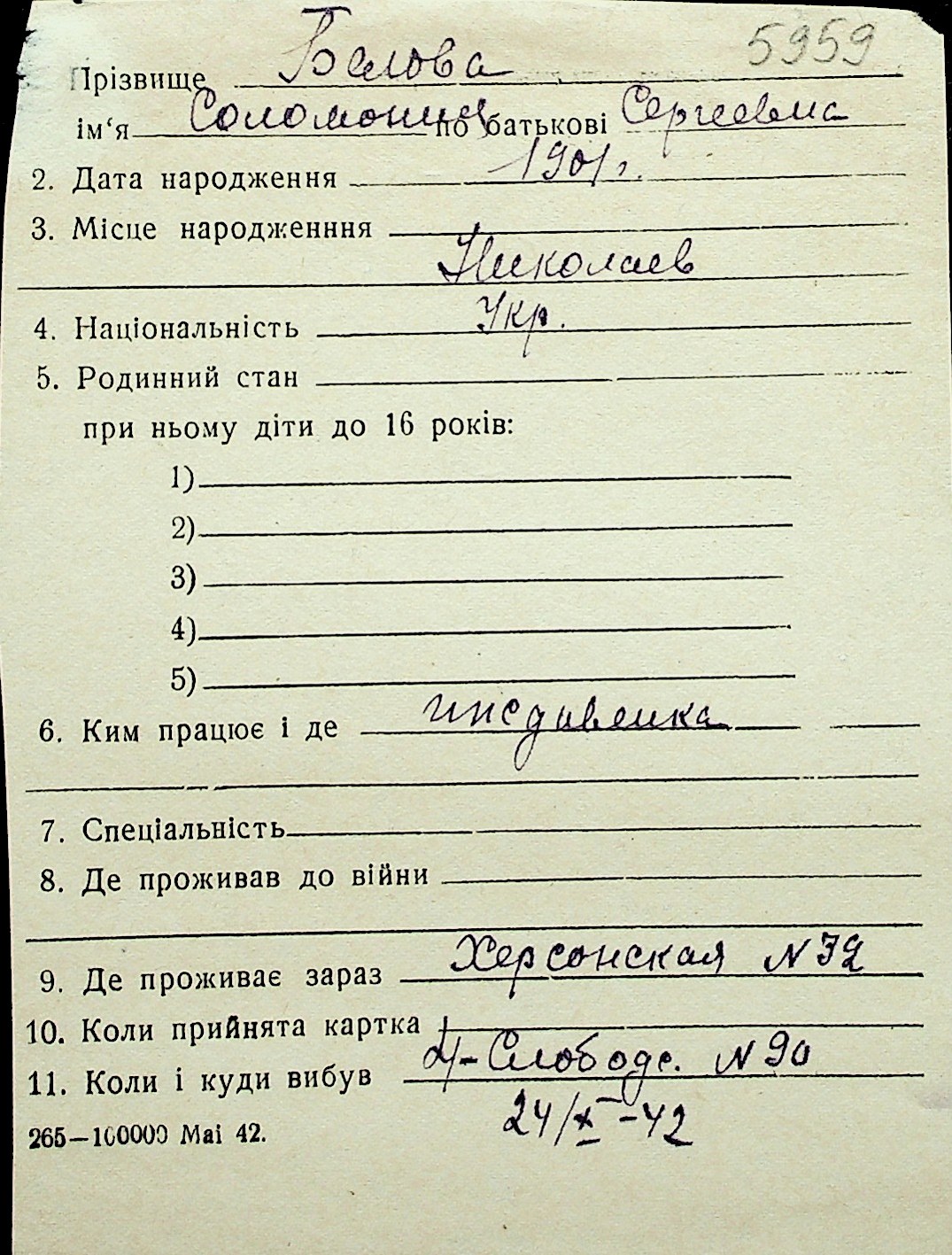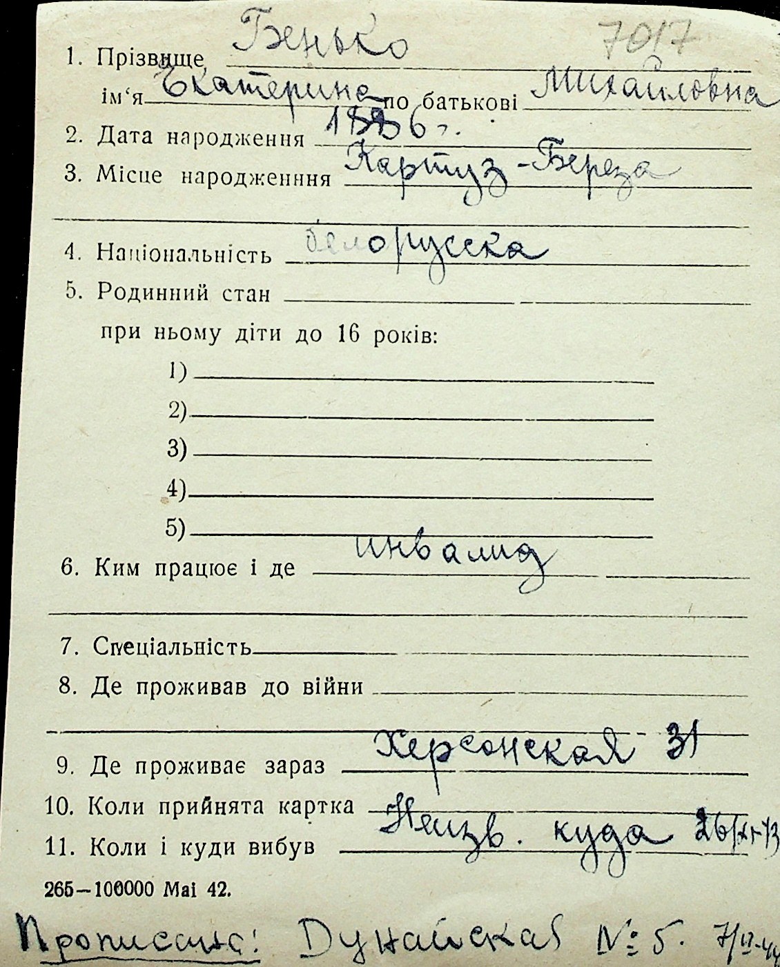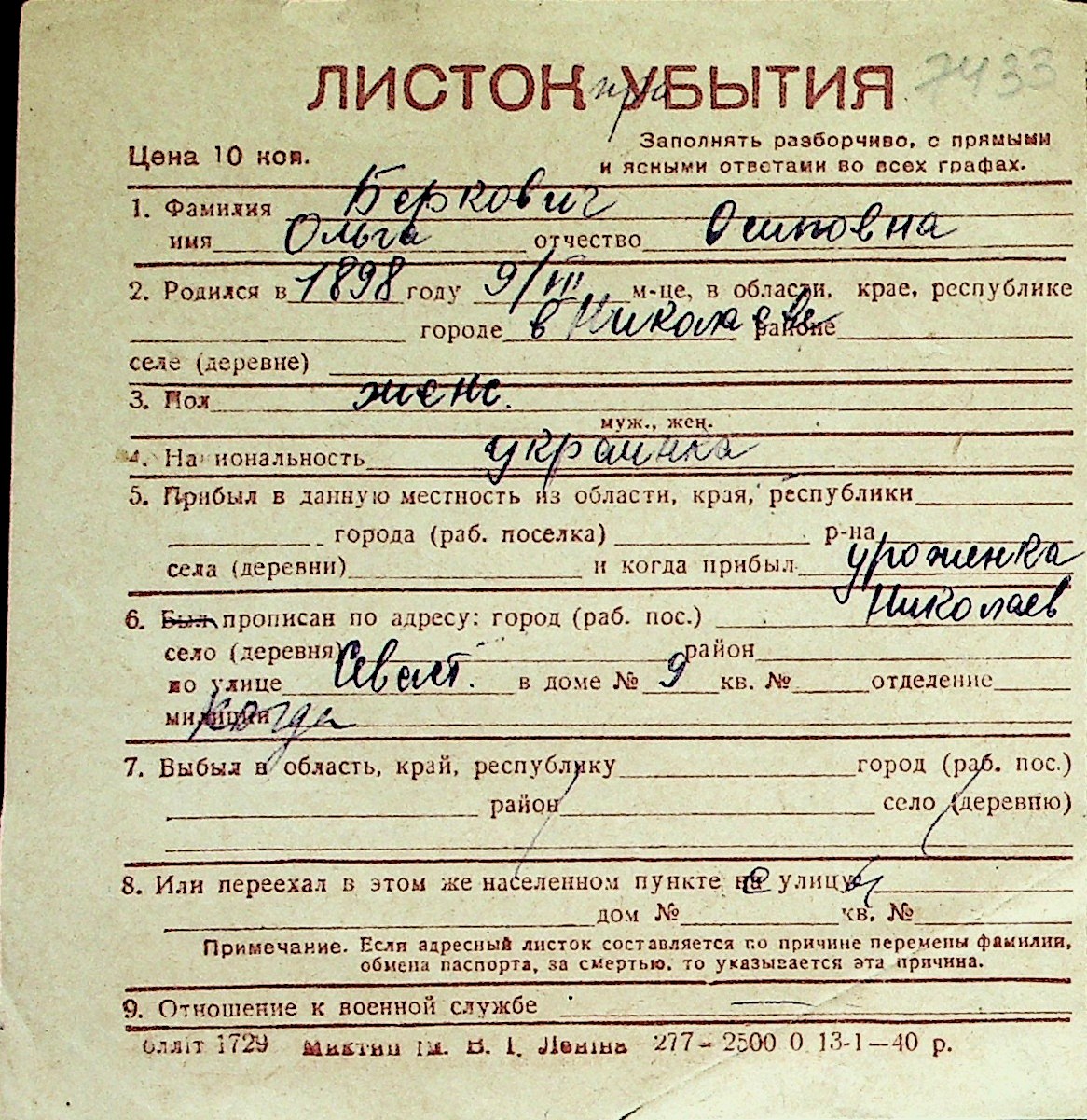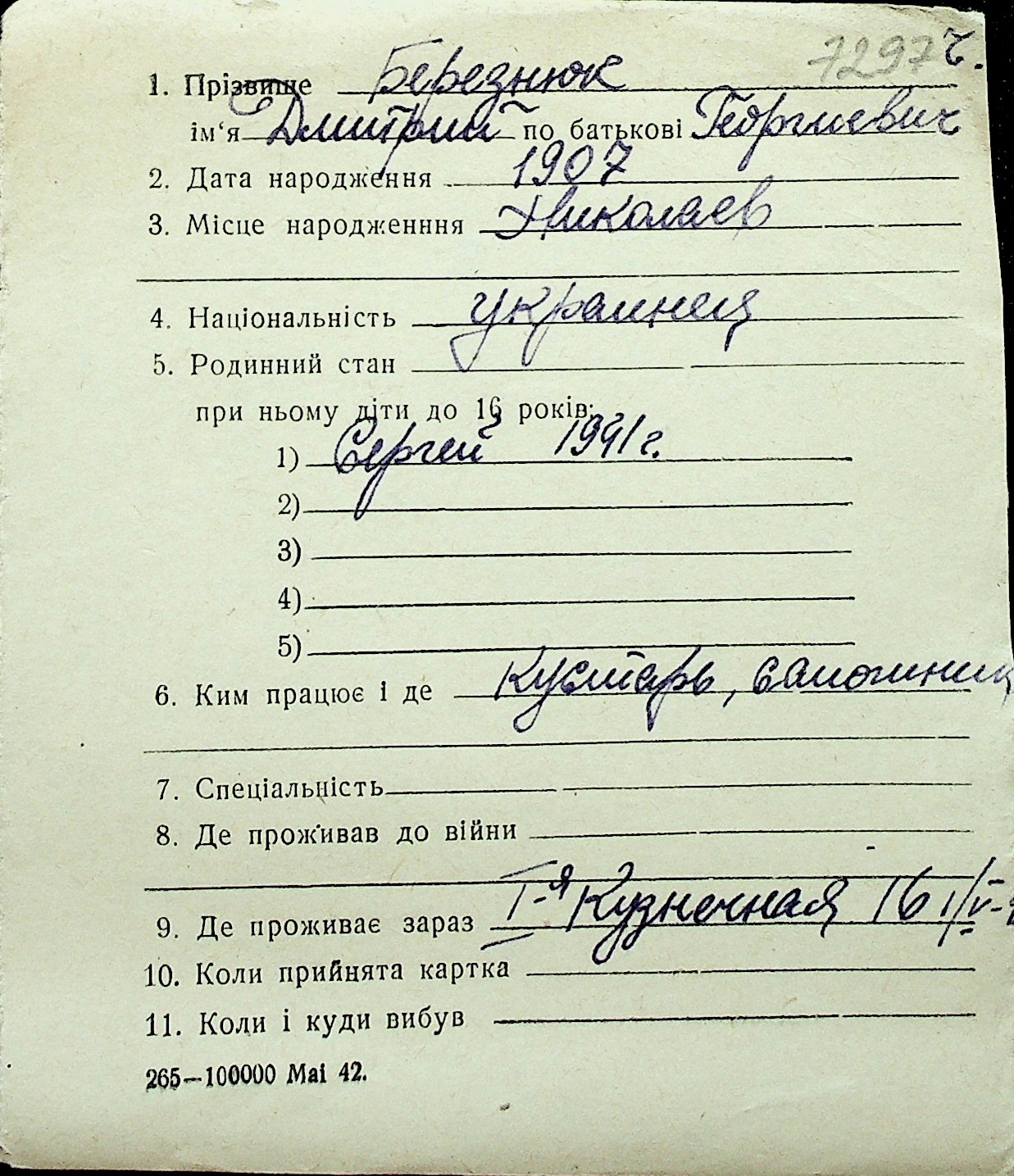 ◦ ◦ Перелік карток на осіб, які мешкали у м. Миколаїв у період окупації 1941–1944 років