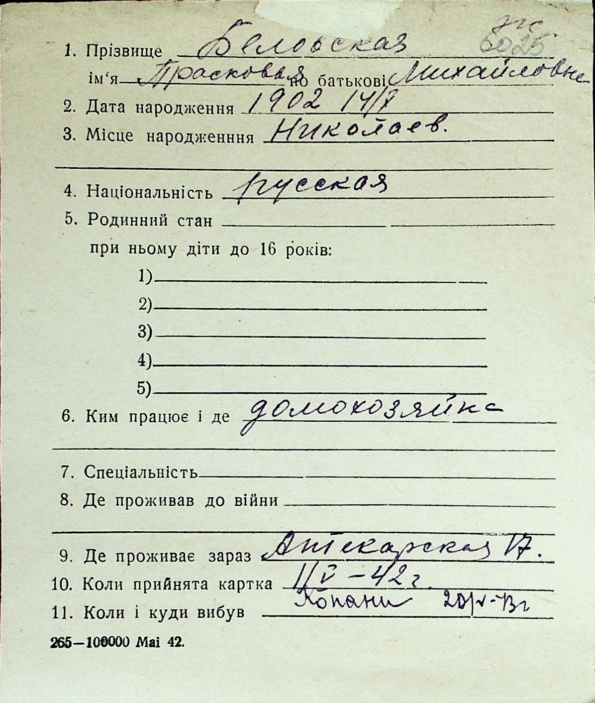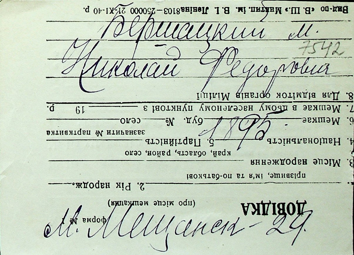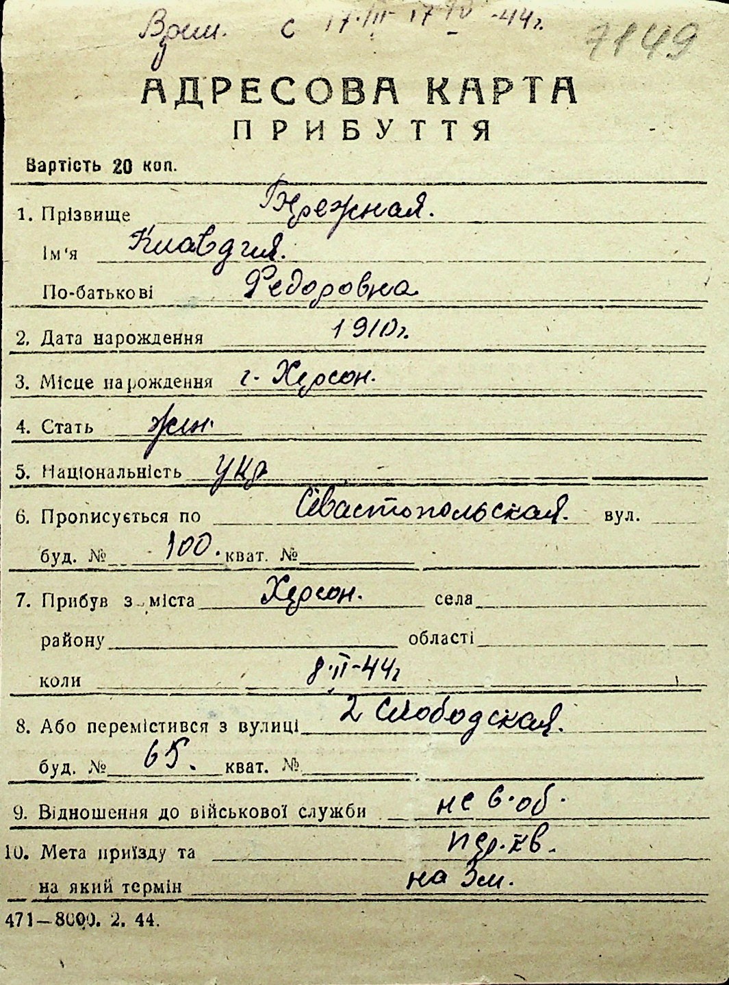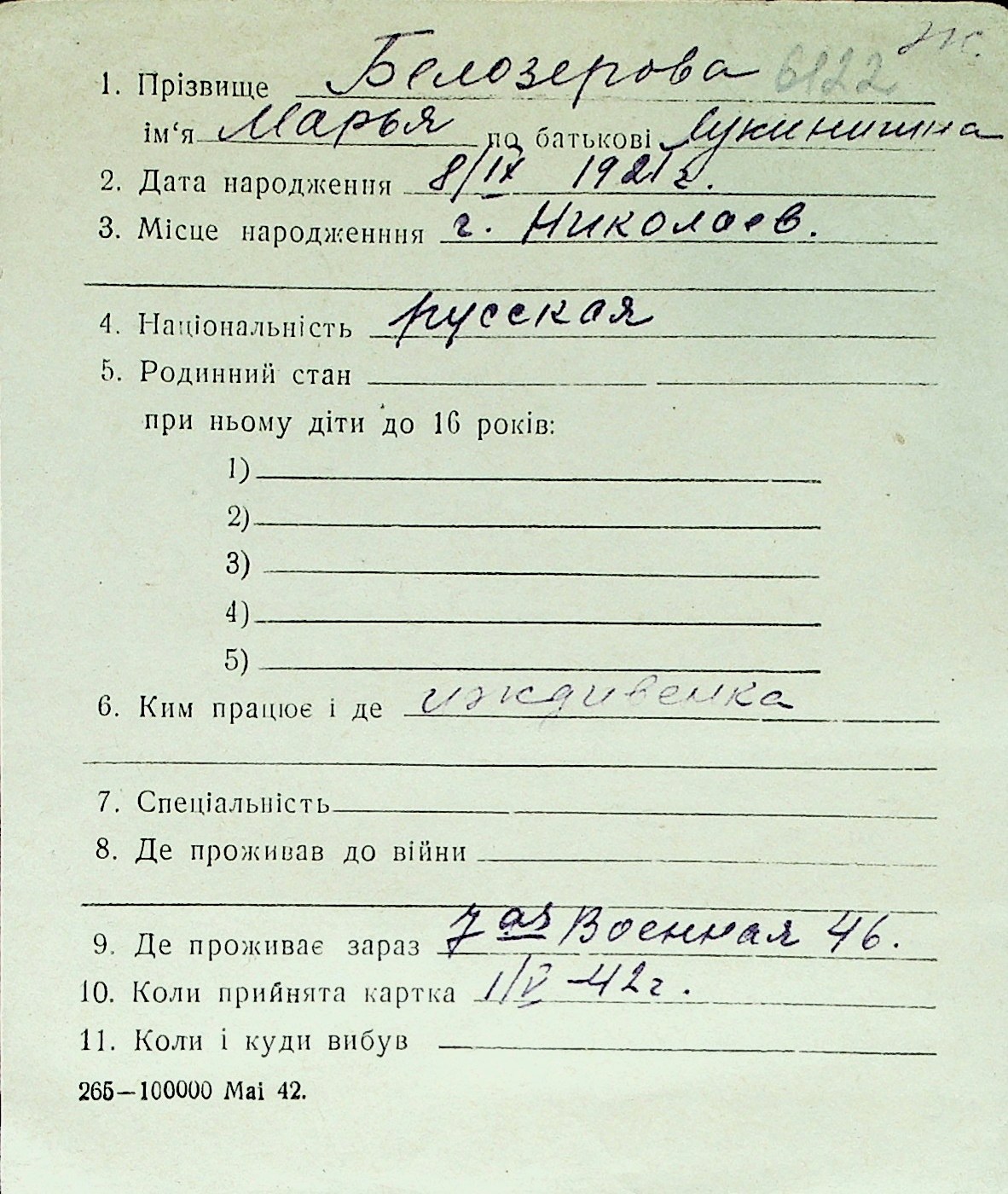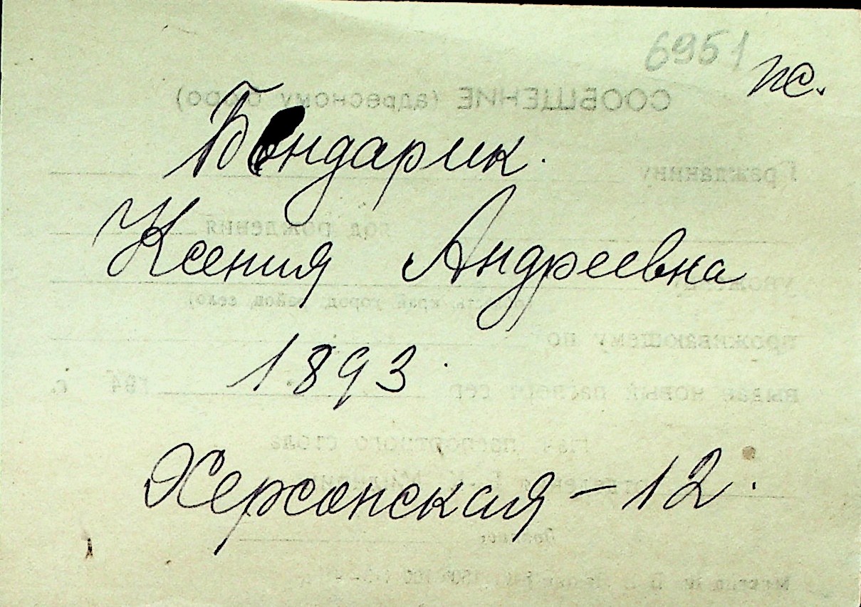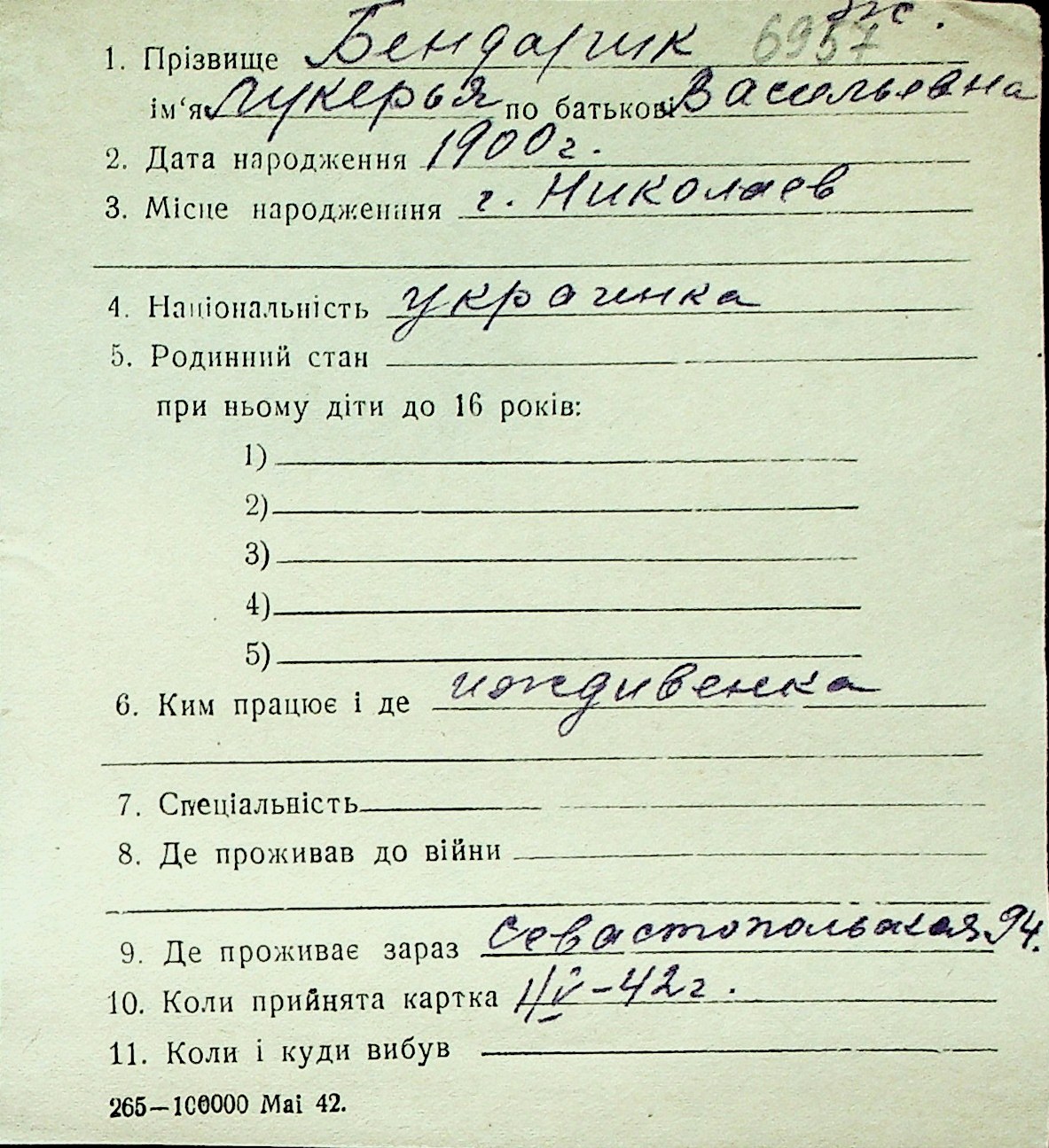 ◦ ◦ Перелік карток на осіб, які мешкали у м. Миколаїв у період окупації 1941–1944 років