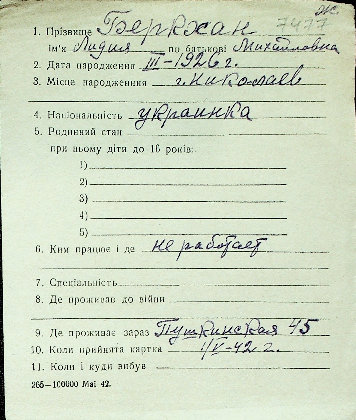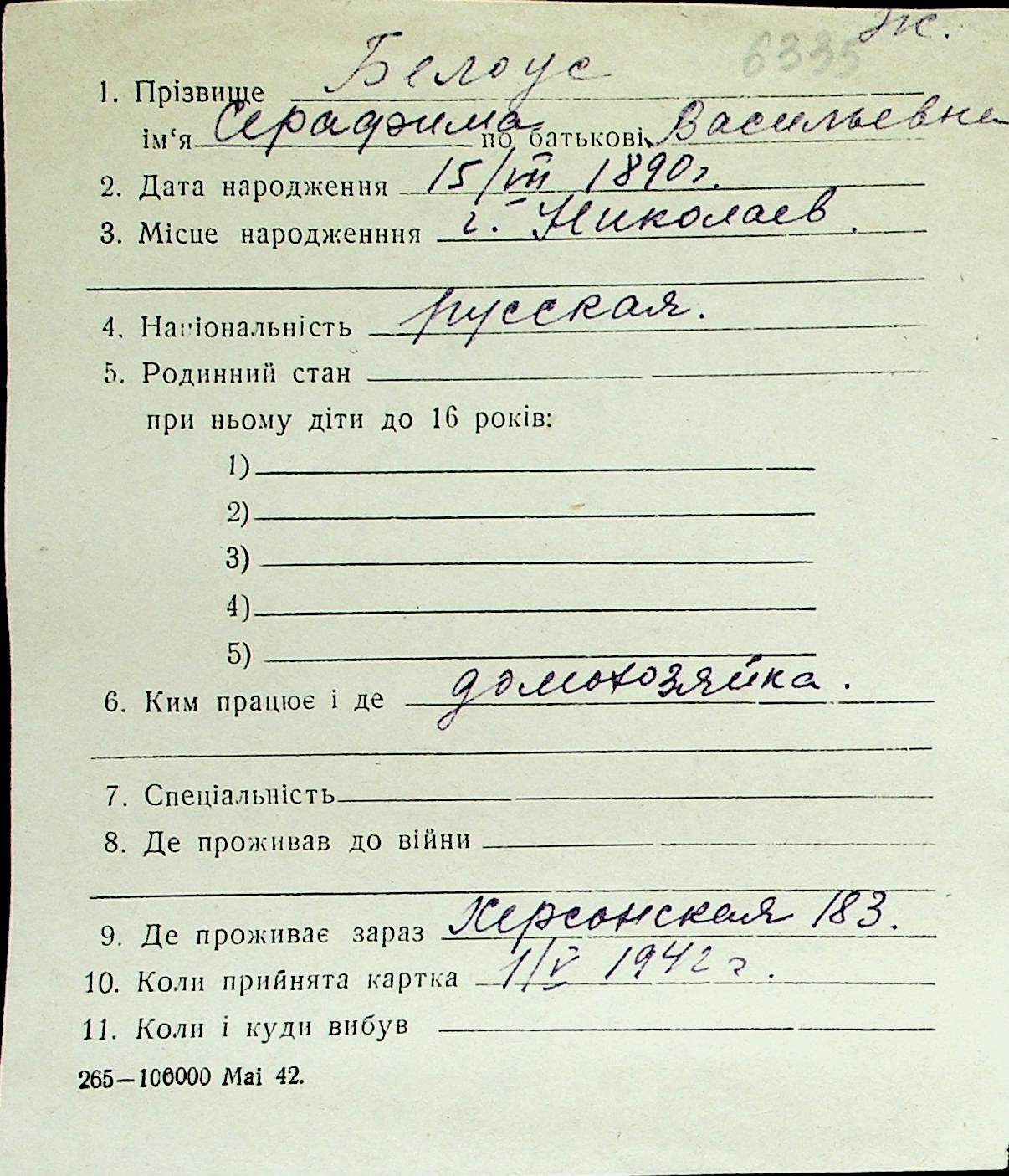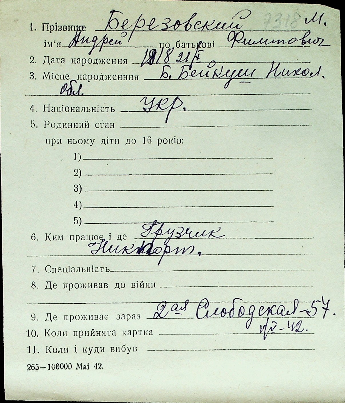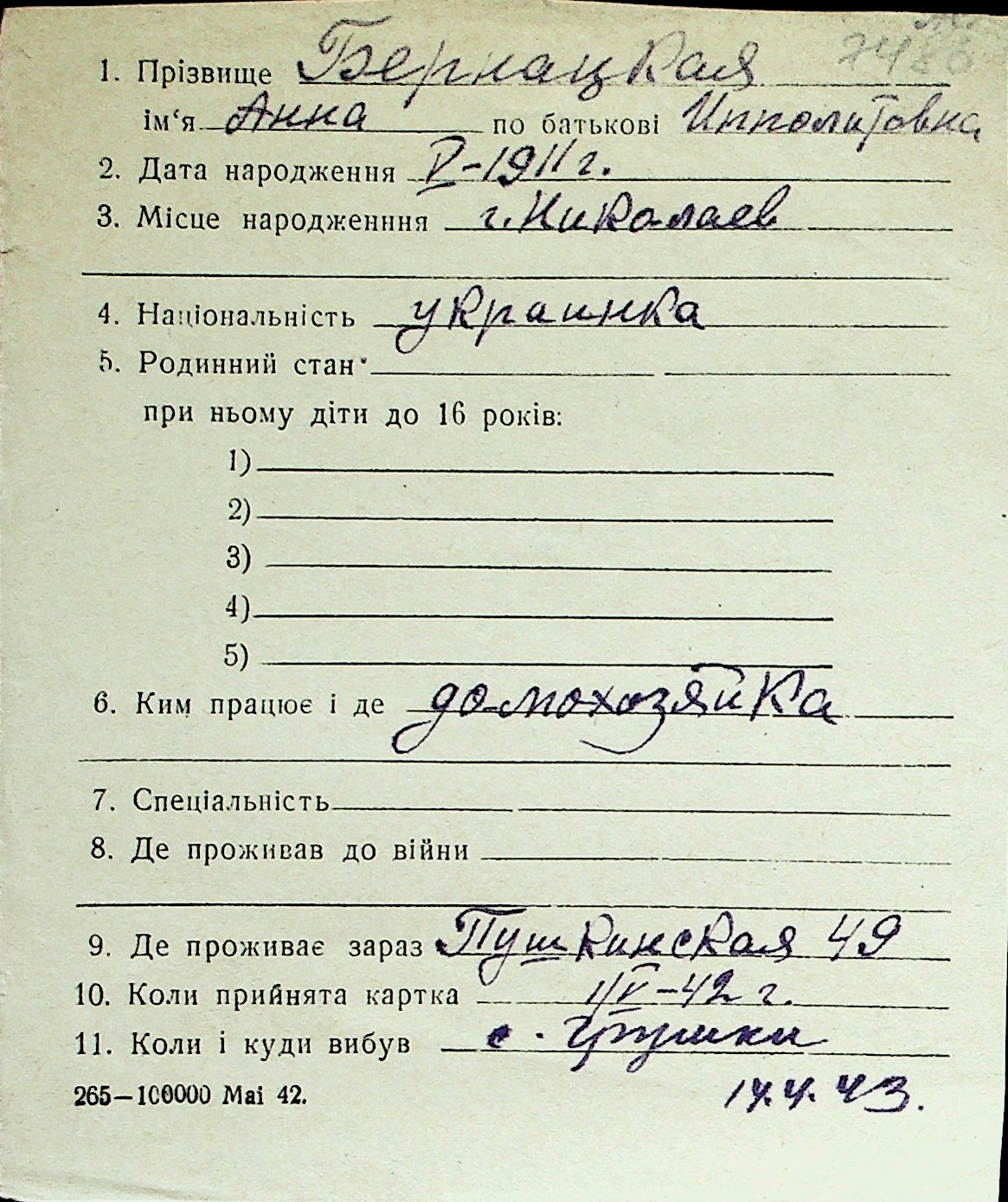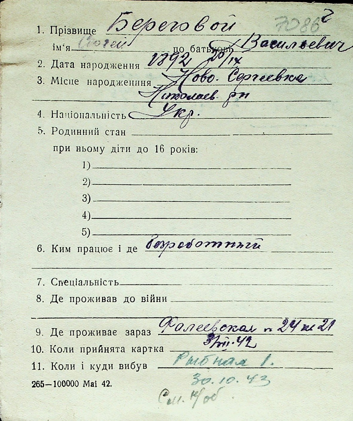 ◦ ◦ Перелік карток на осіб, які мешкали у м. Миколаїв у період окупації 1941–1944 років