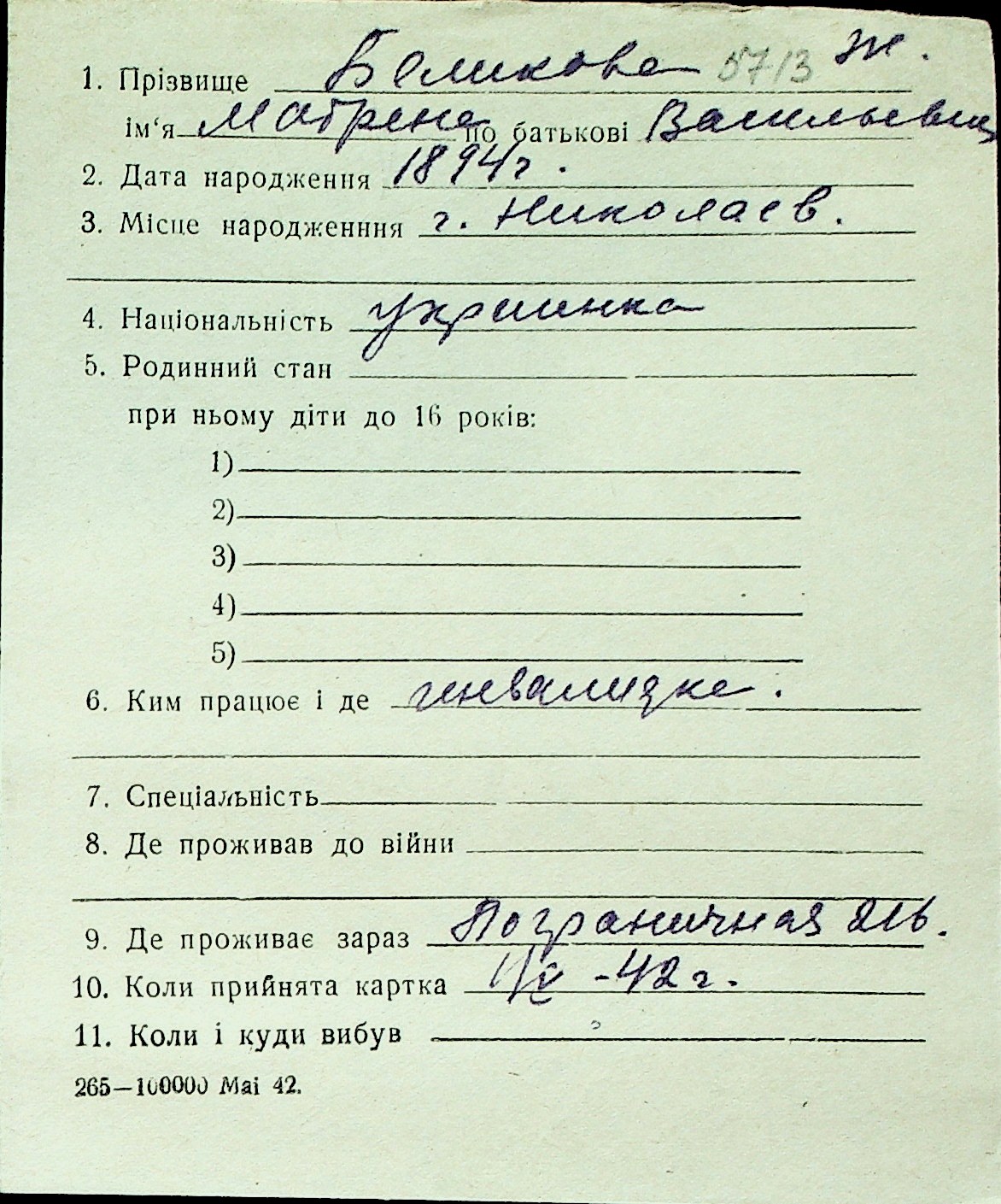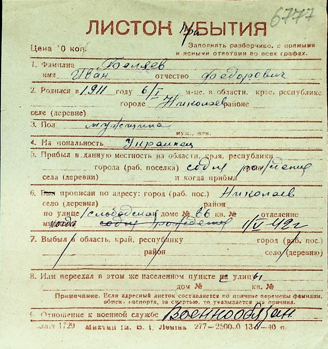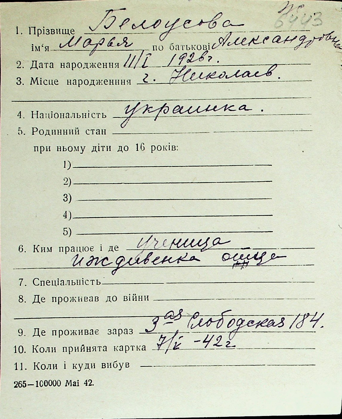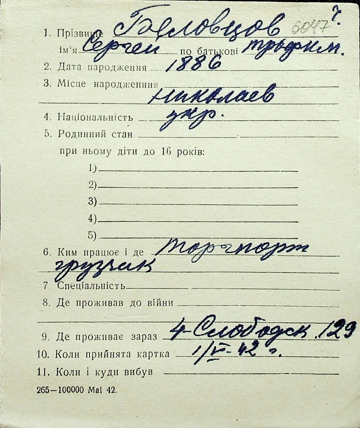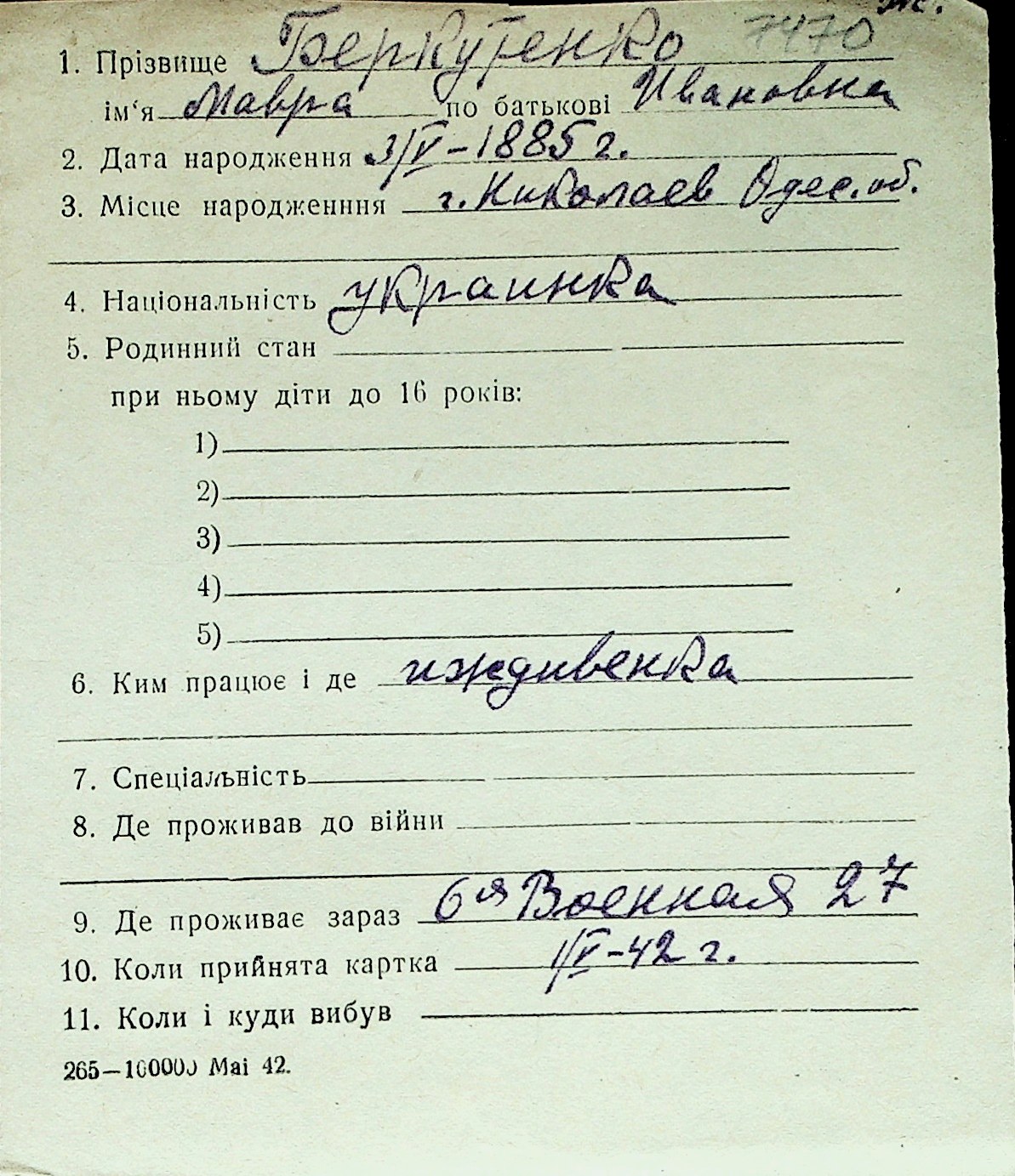 ◦ ◦ Перелік карток на осіб, які мешкали у м. Миколаїв у період окупації 1941–1944 років