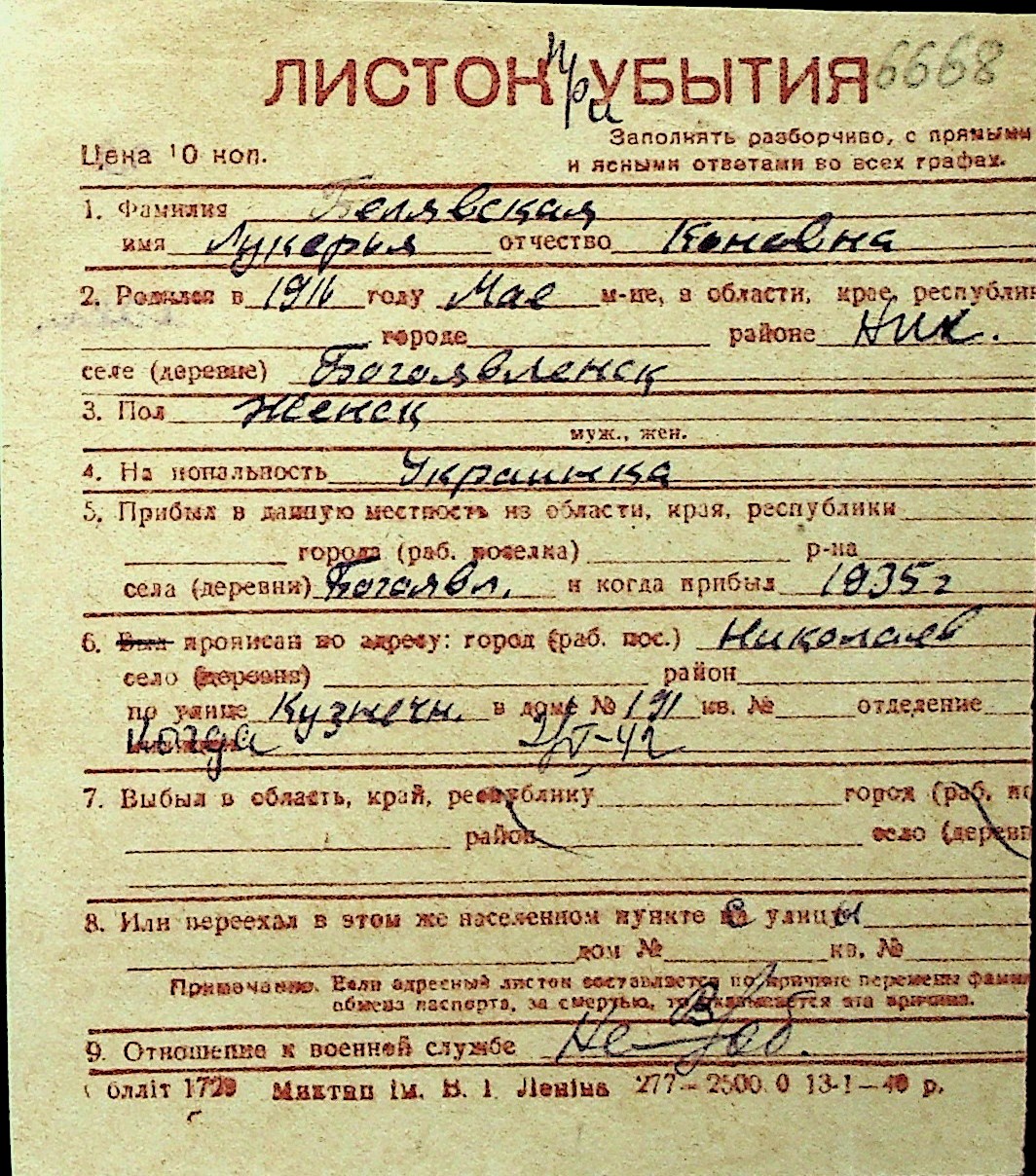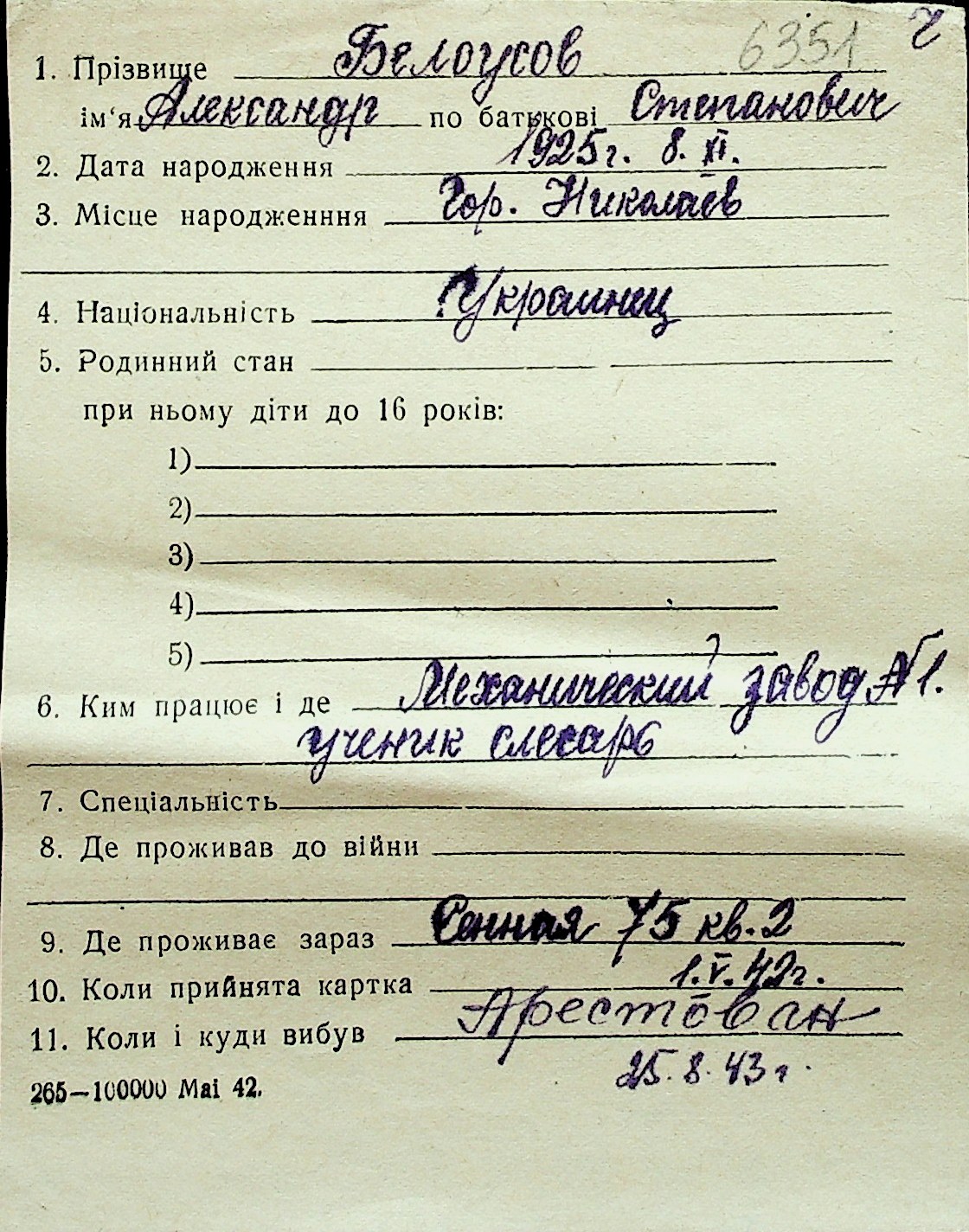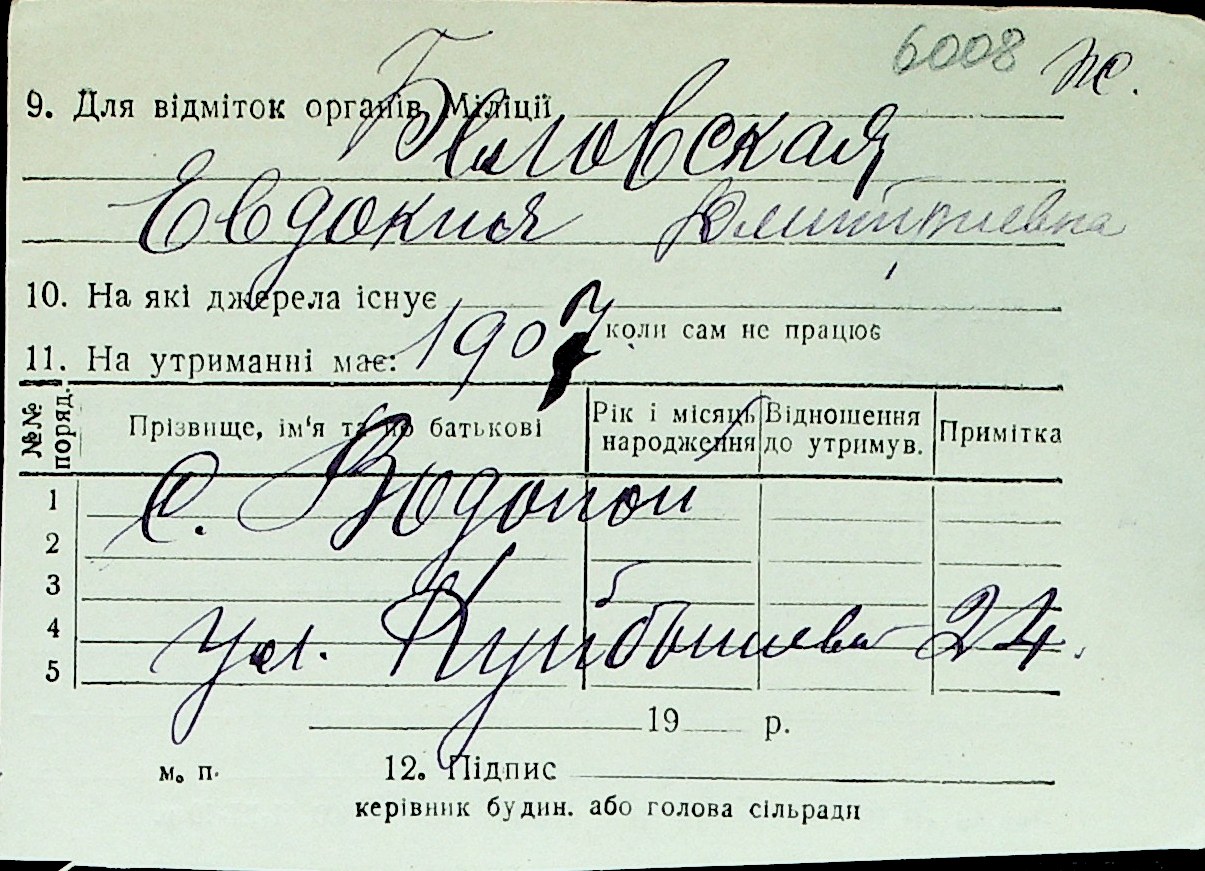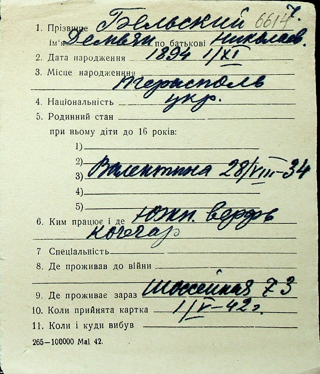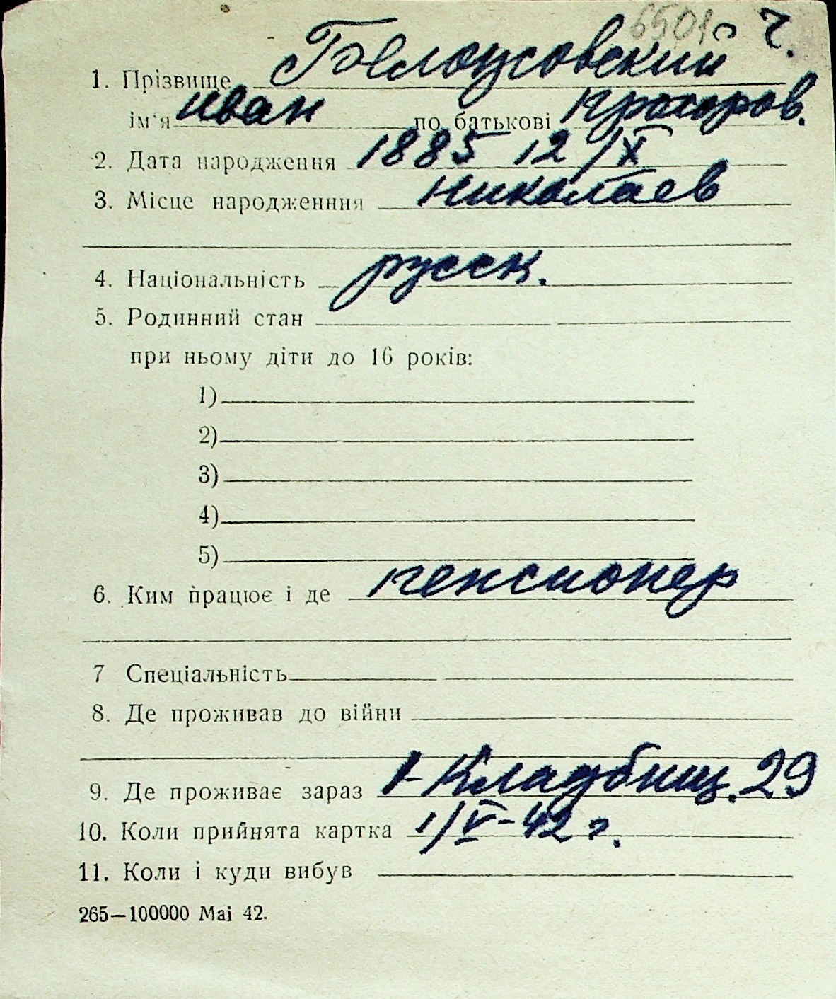 ◦ ◦ Перелік карток на осіб, які мешкали у м. Миколаїв у період окупації 1941–1944 років