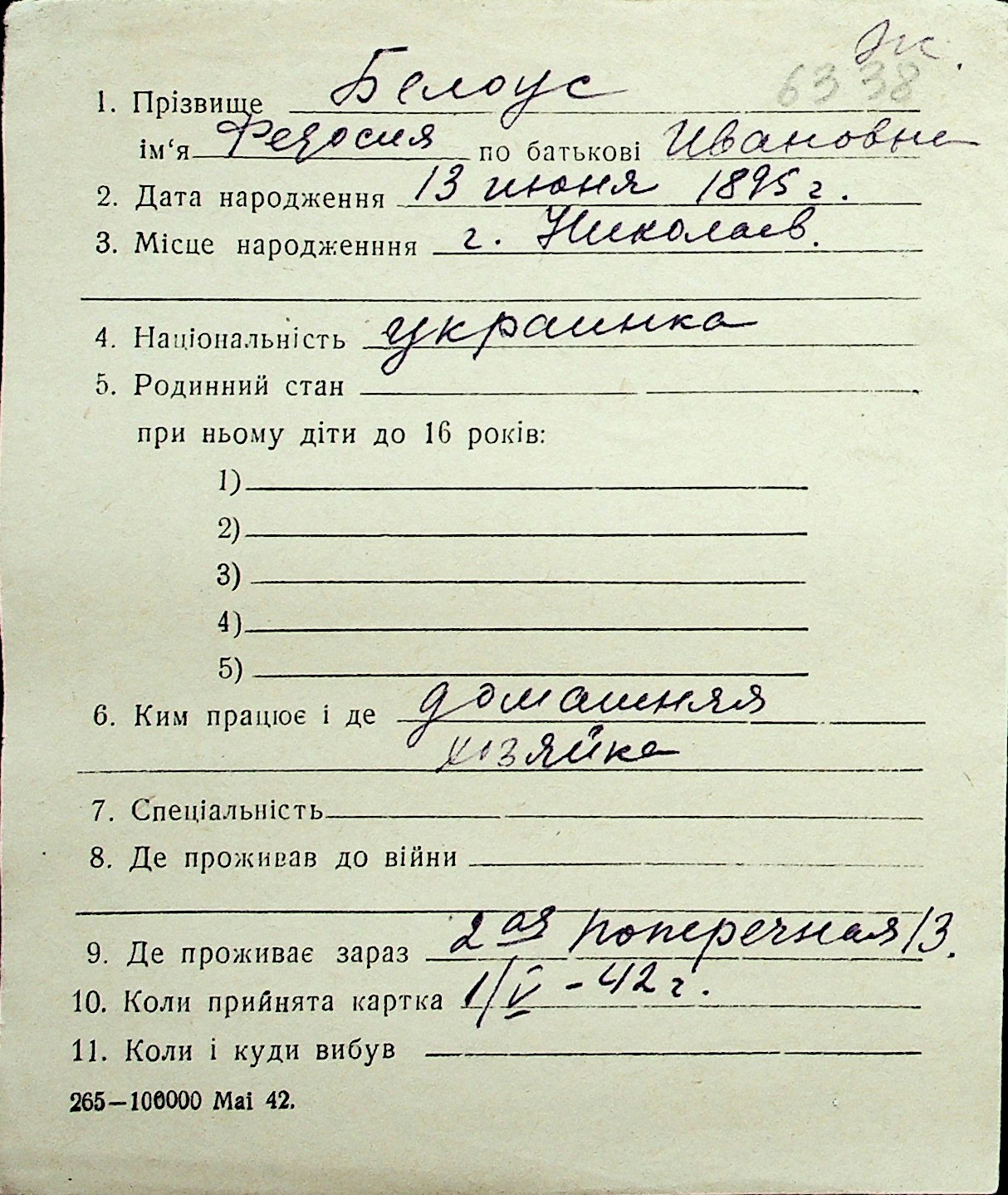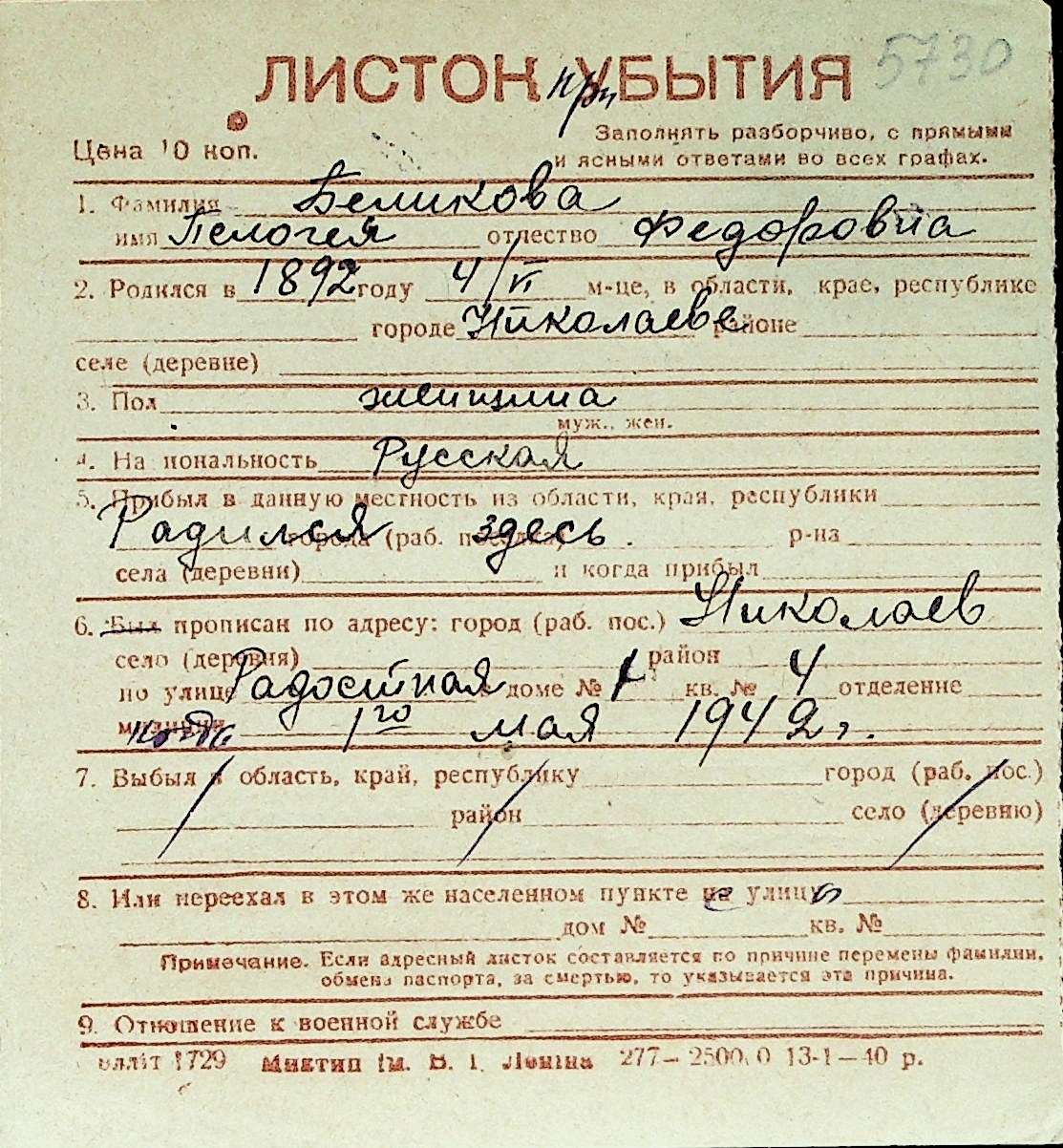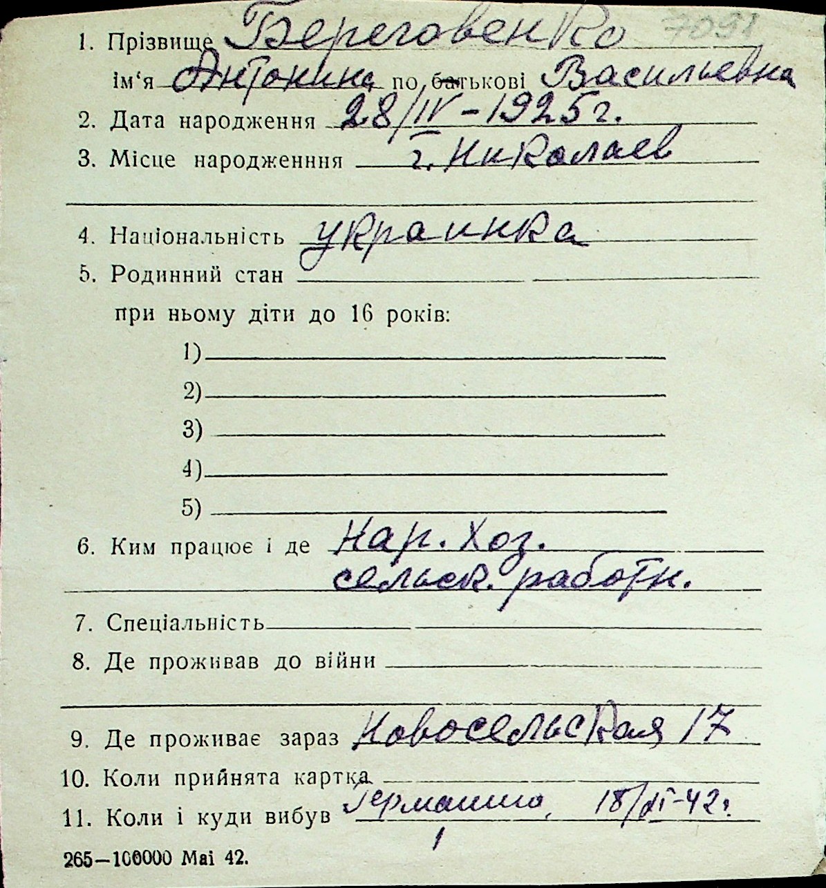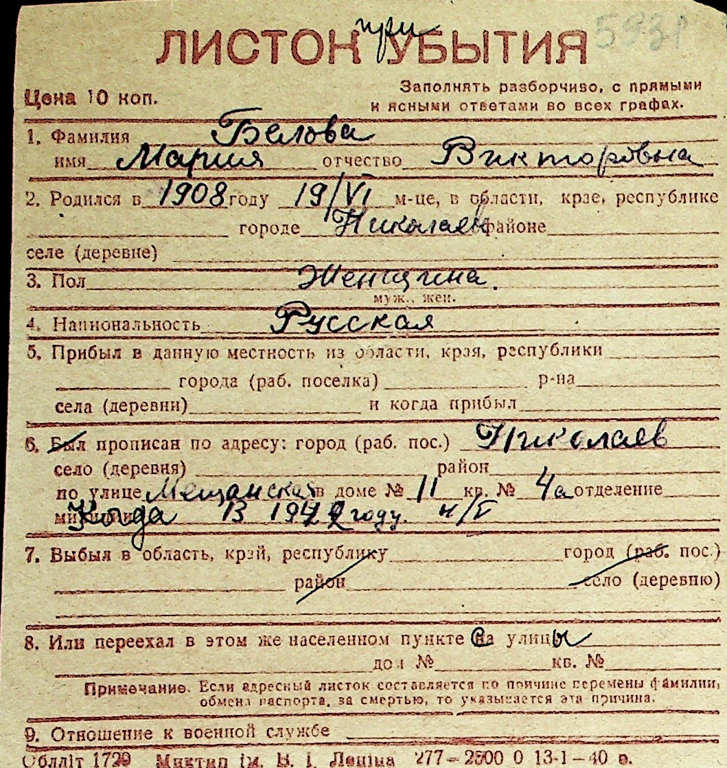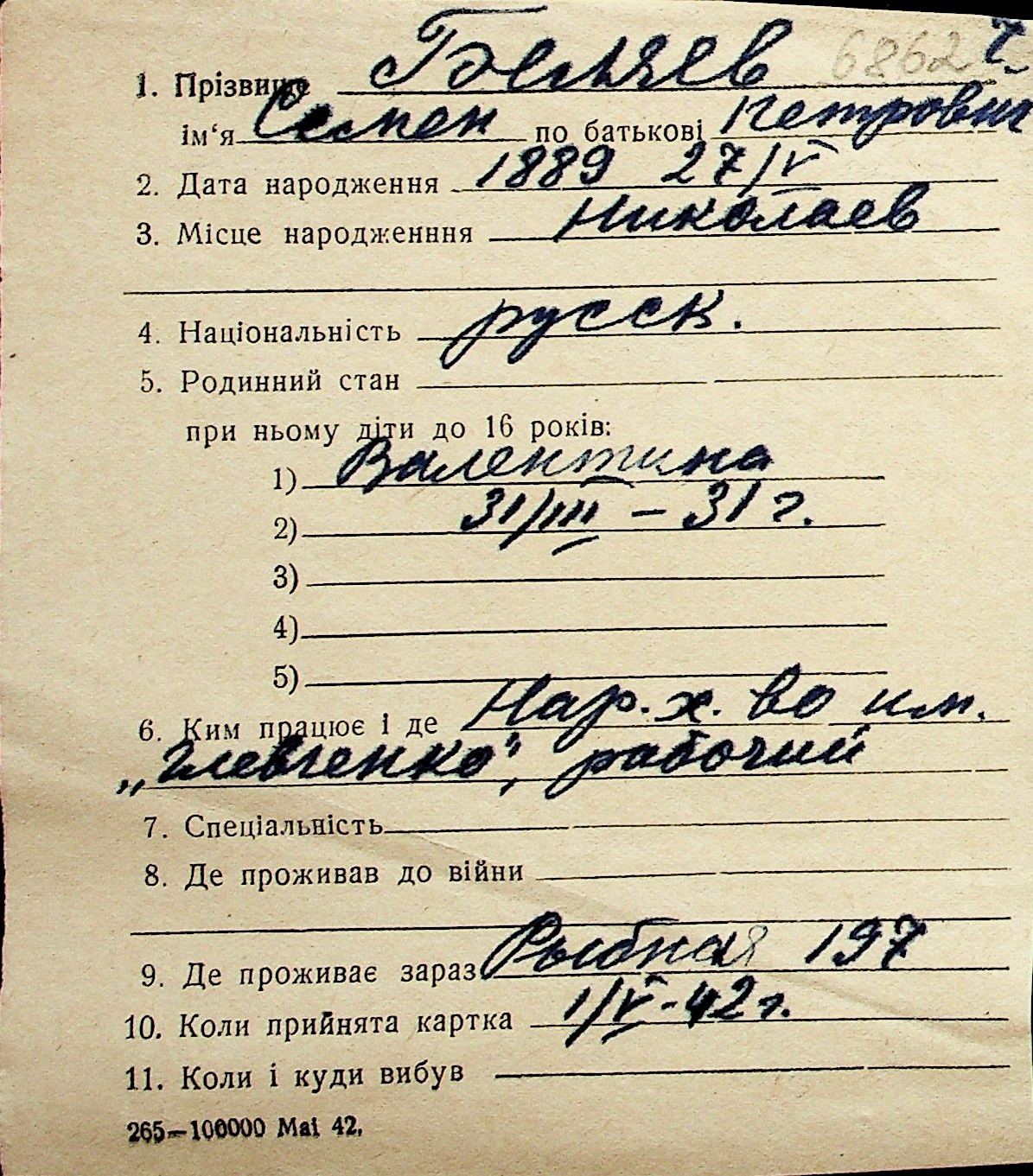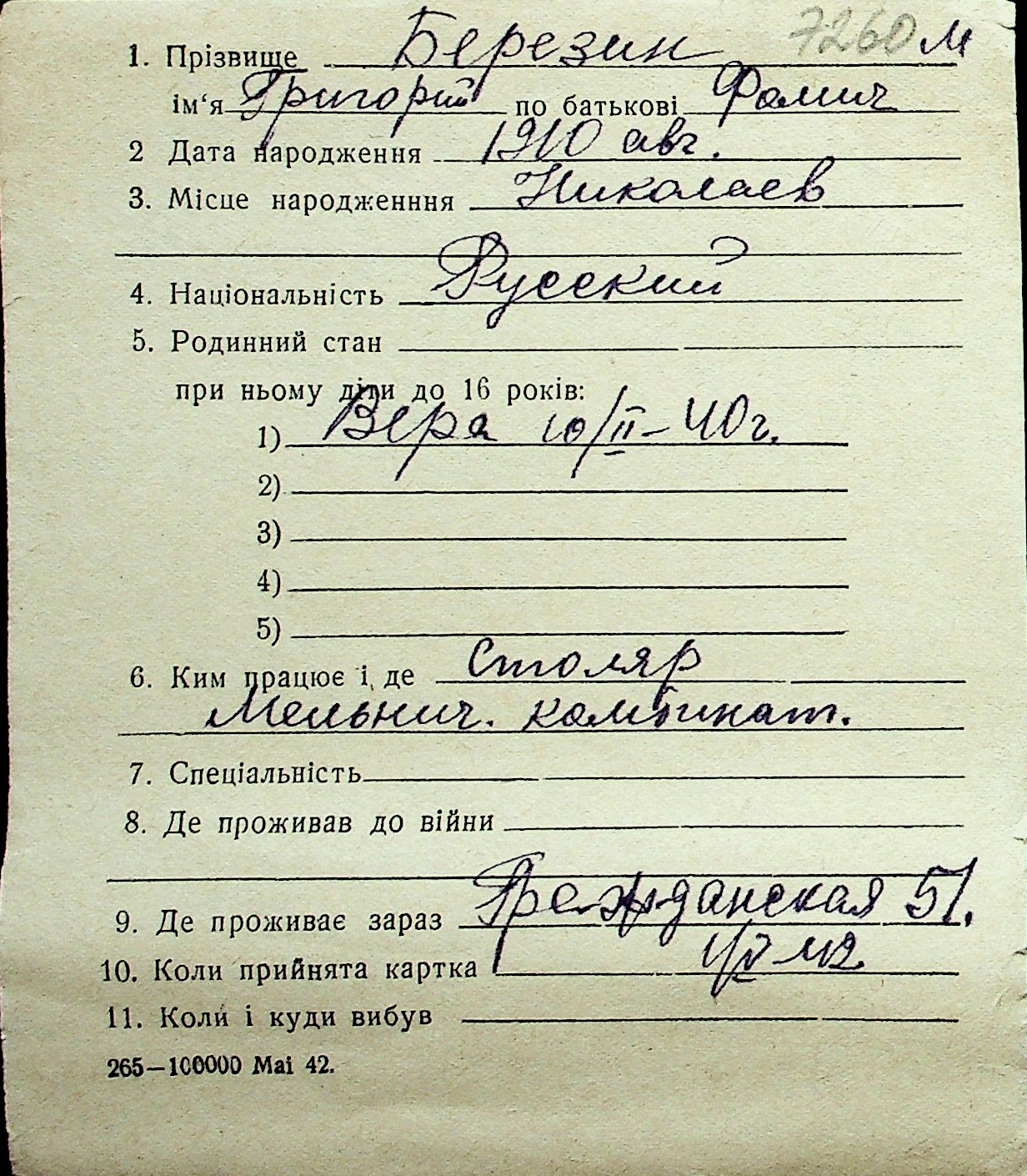 ◦ ◦ Перелік карток на осіб, які мешкали у м. Миколаїв у період окупації 1941–1944 років