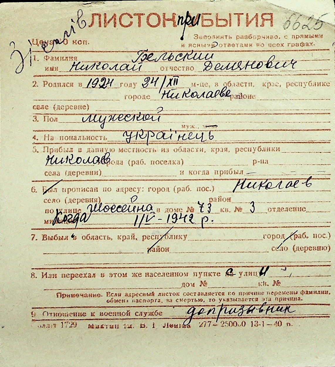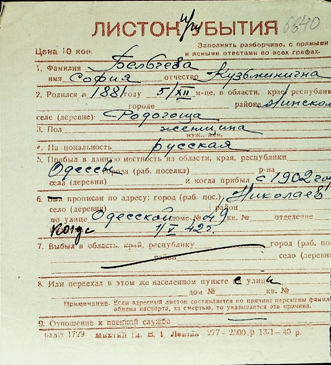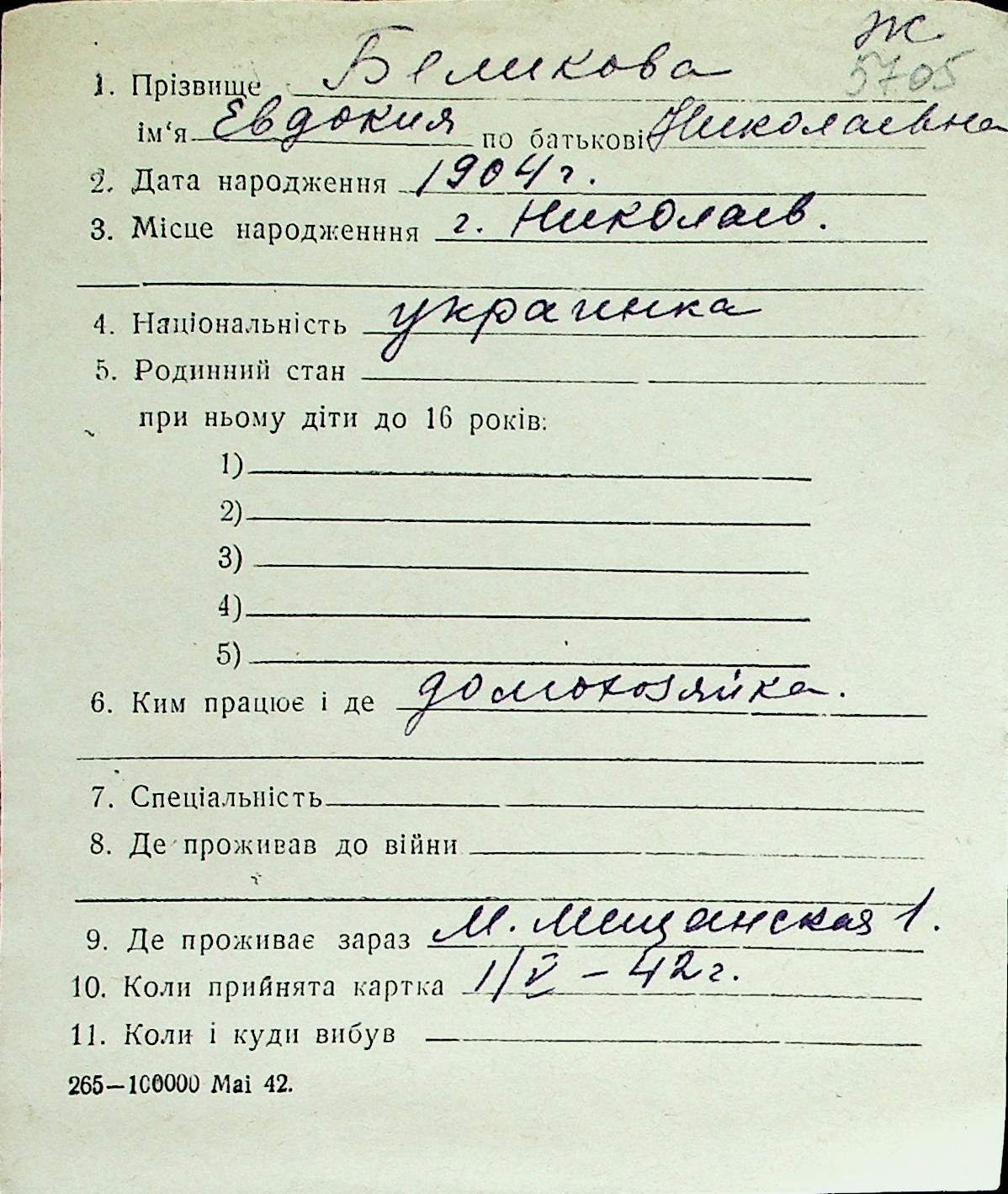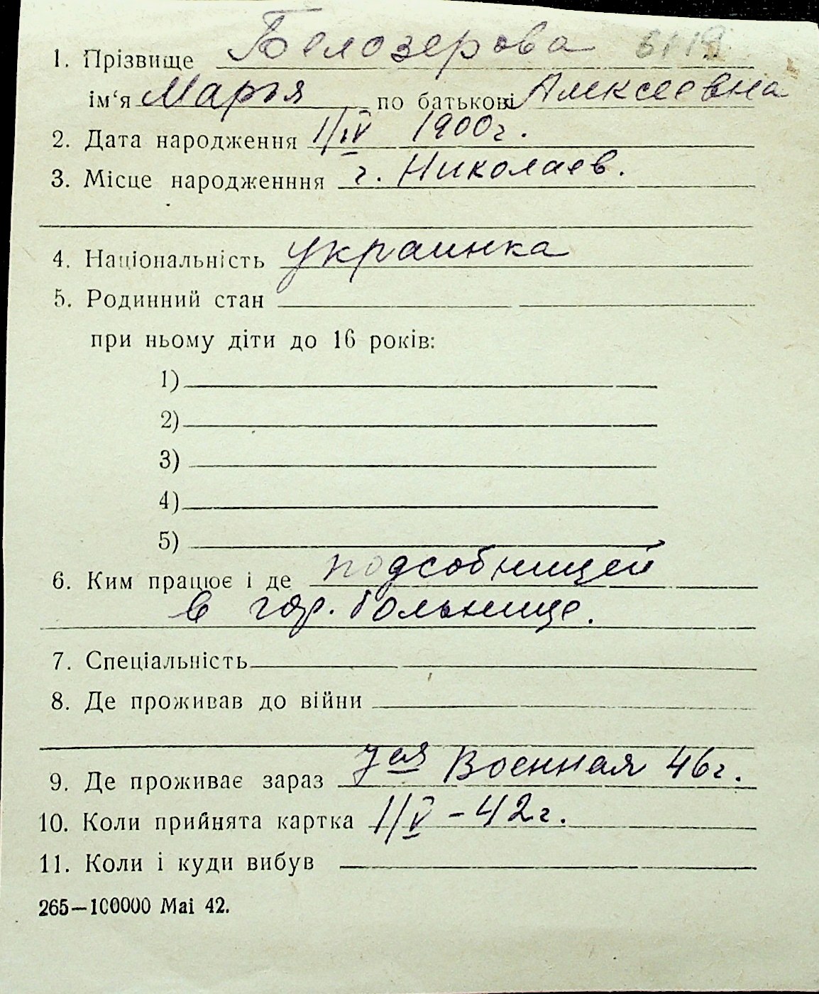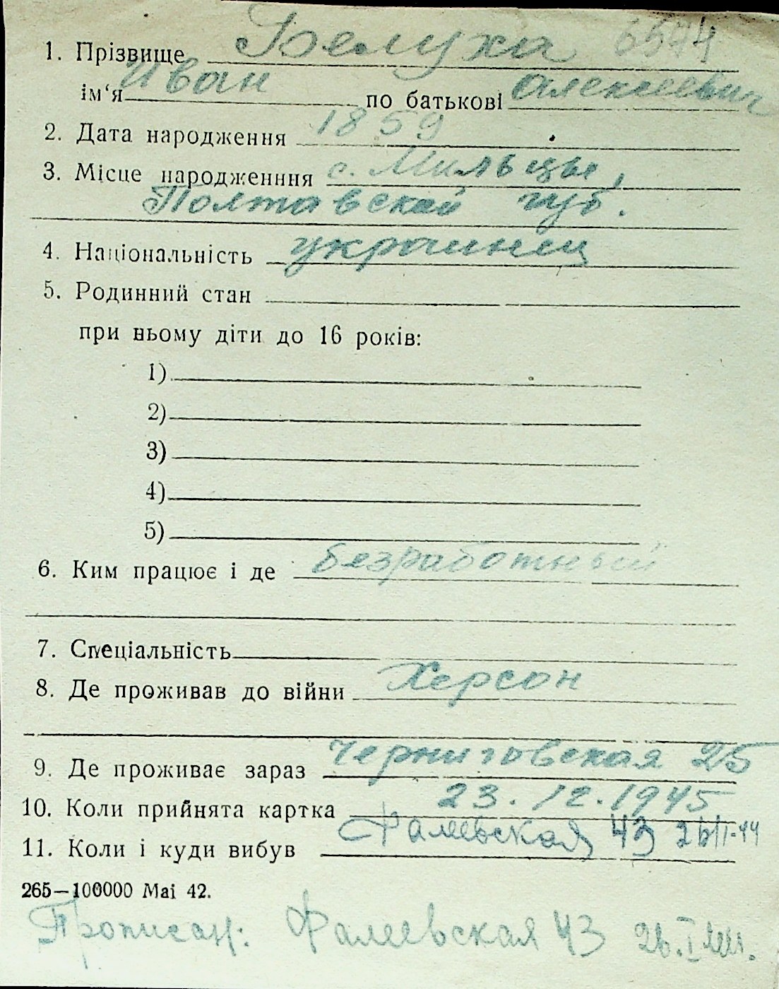 ◦ ◦ Перелік карток на осіб, які мешкали у м. Миколаїв у період окупації 1941–1944 років