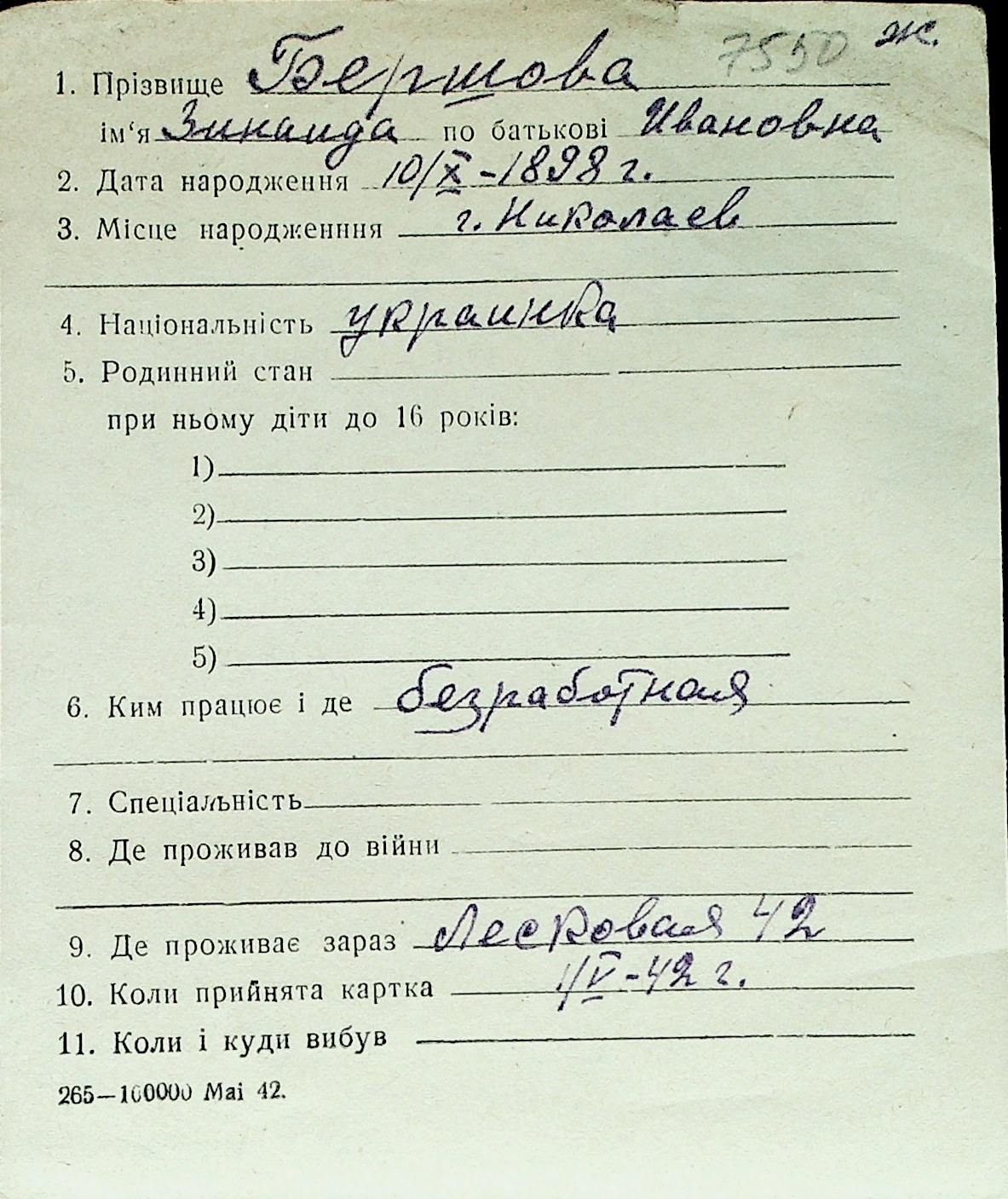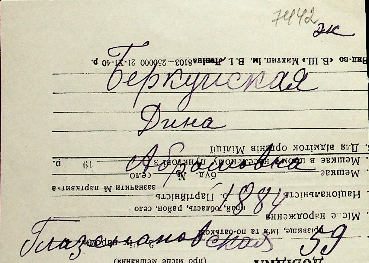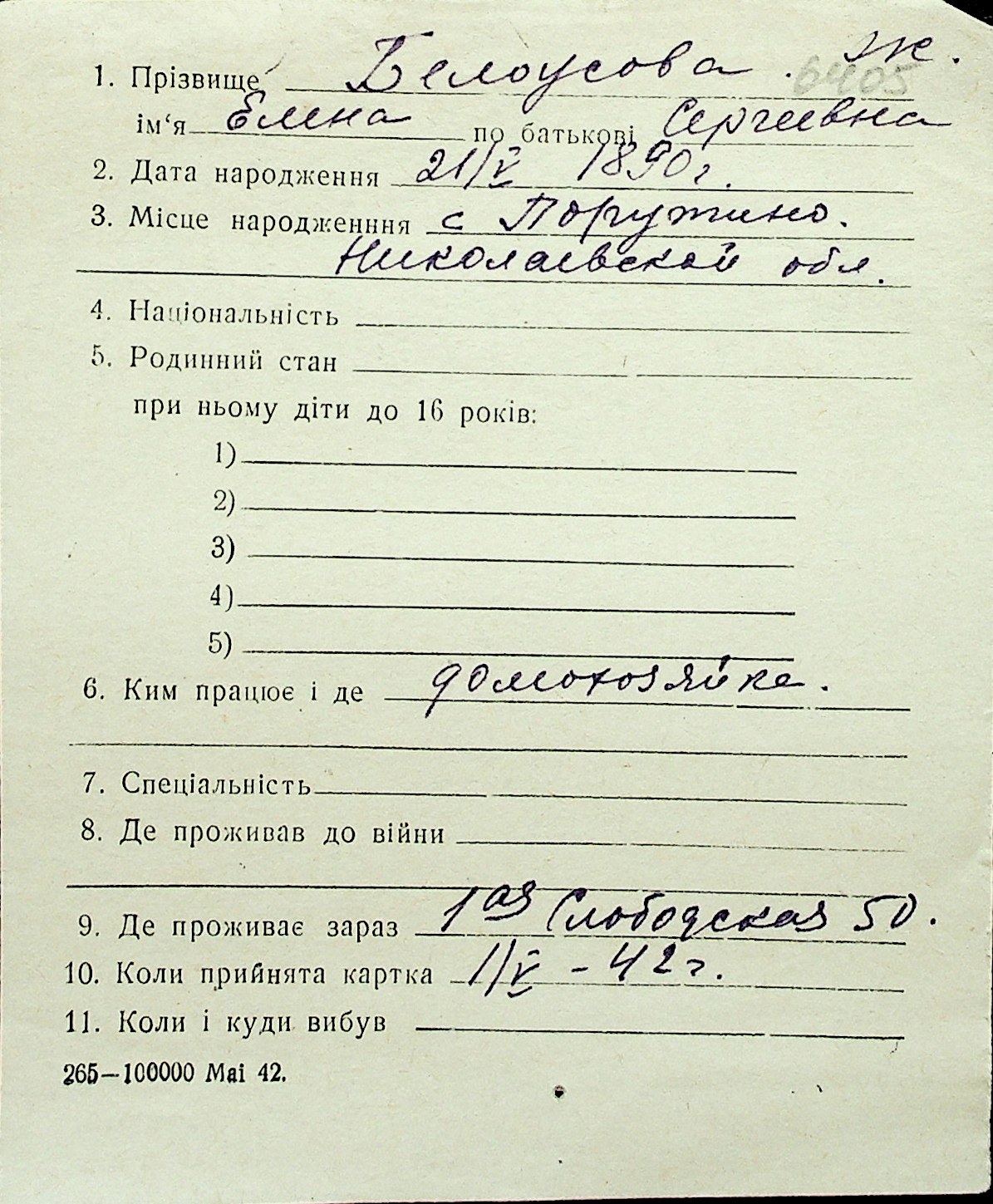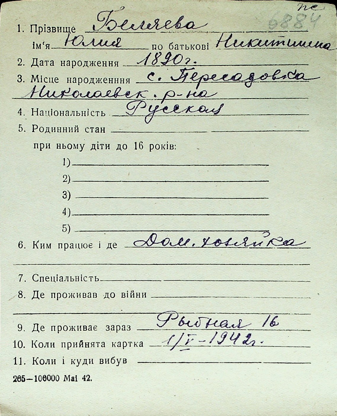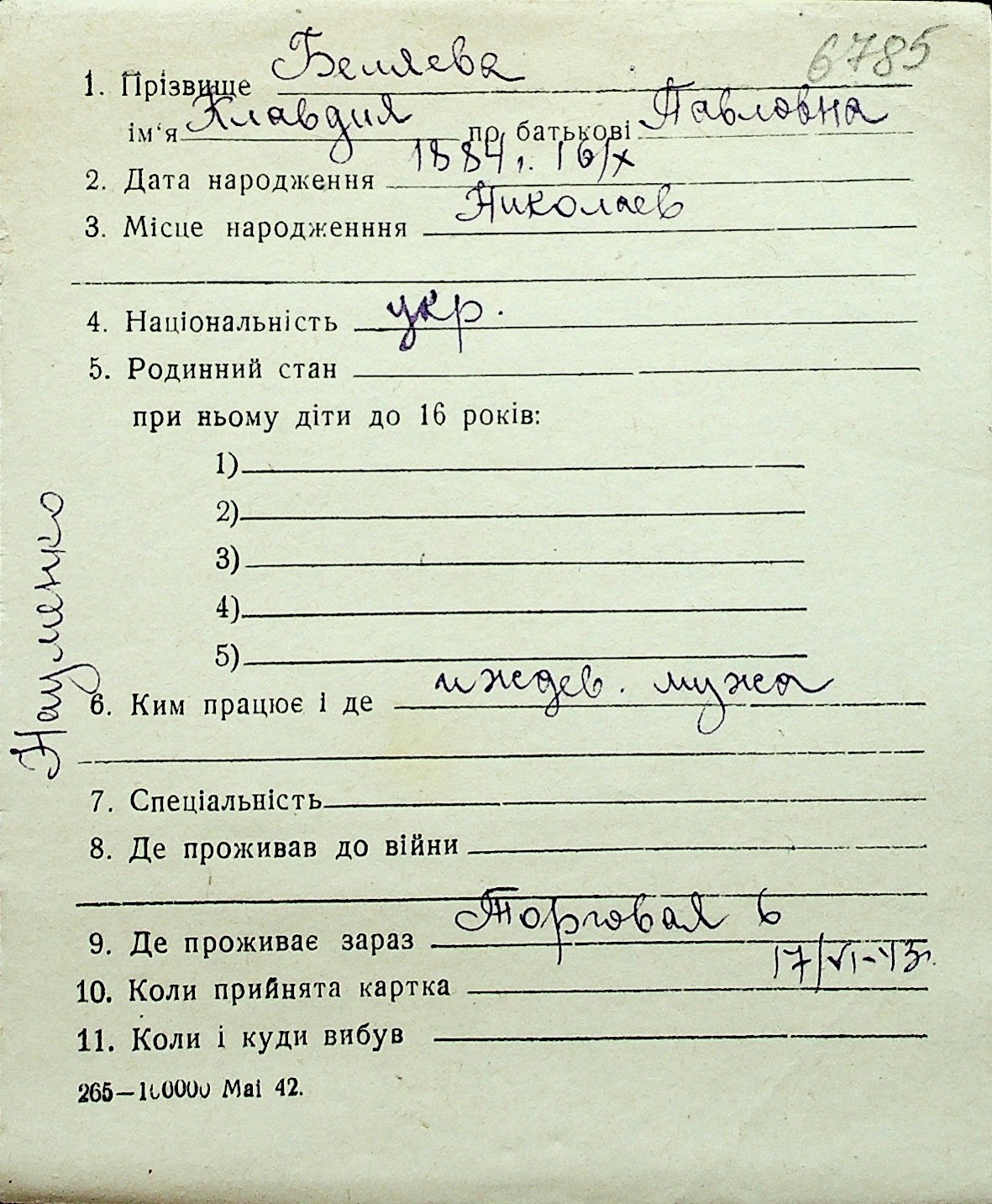 ◦ ◦ Перелік карток на осіб, які мешкали у м. Миколаїв у період окупації 1941–1944 років
