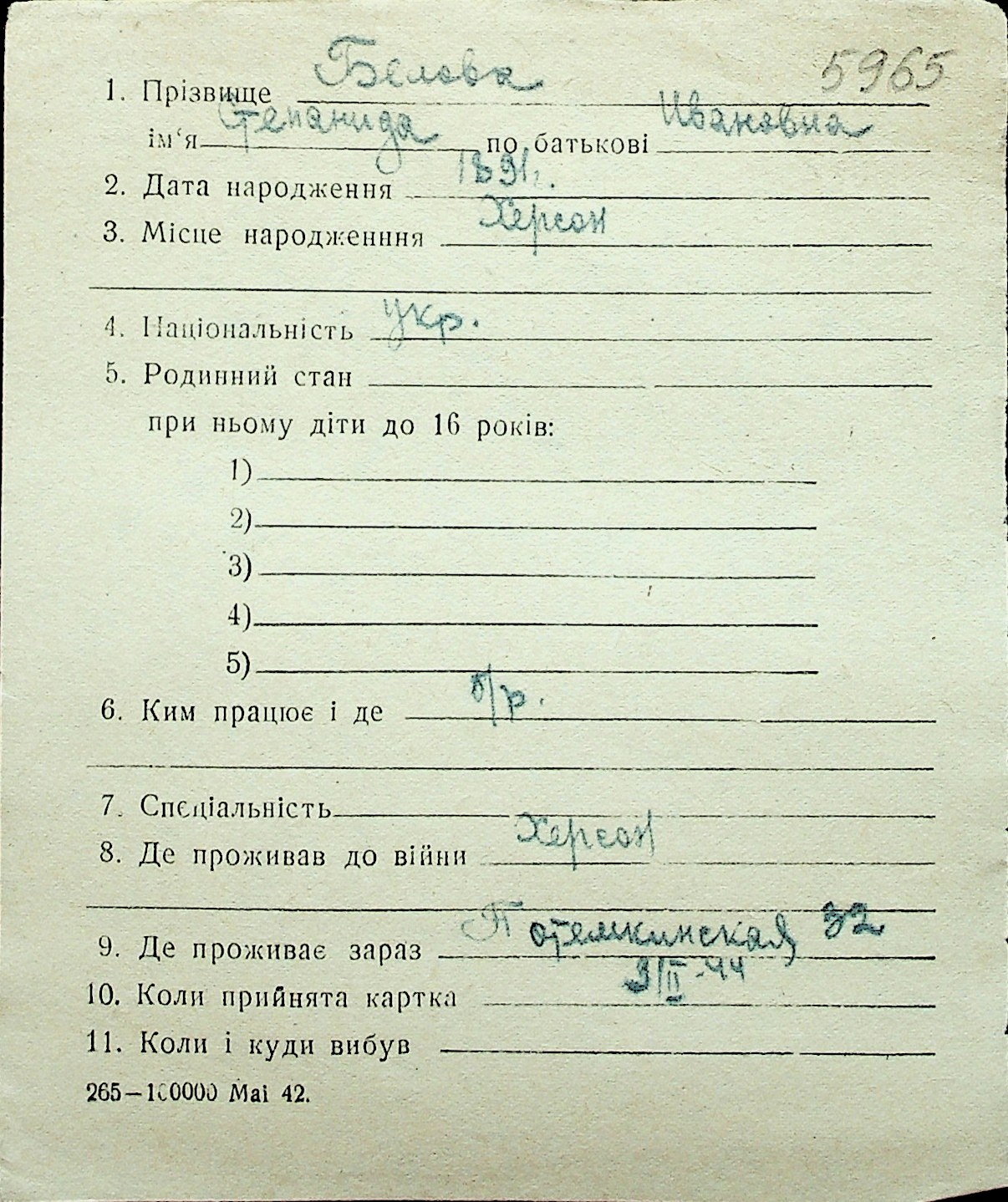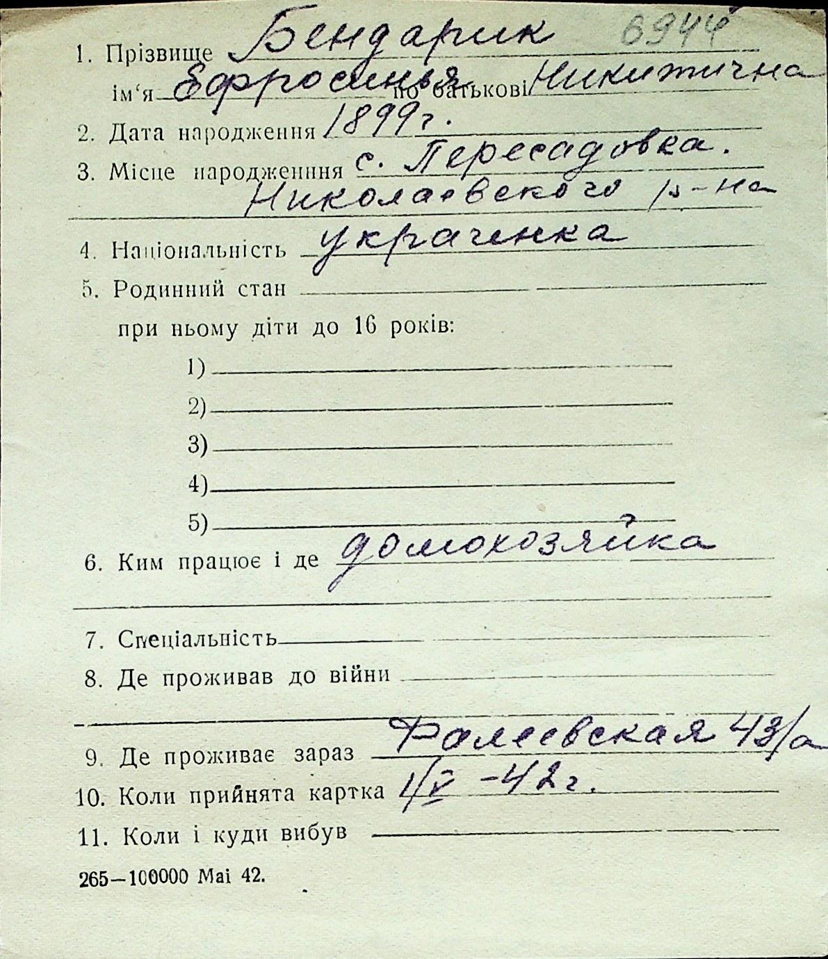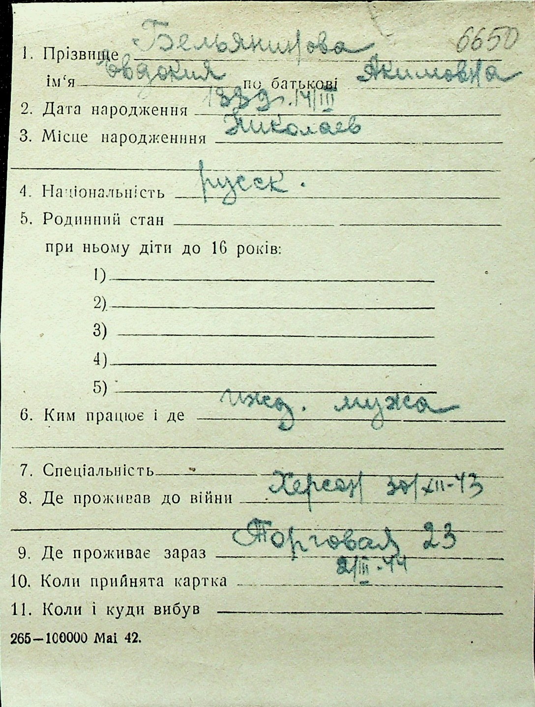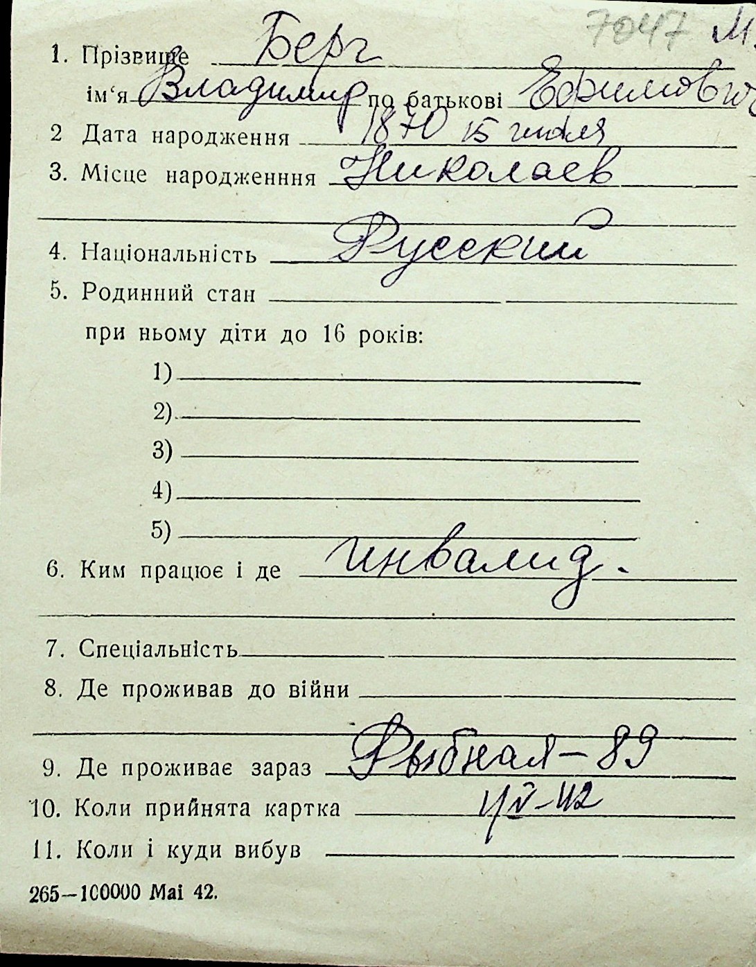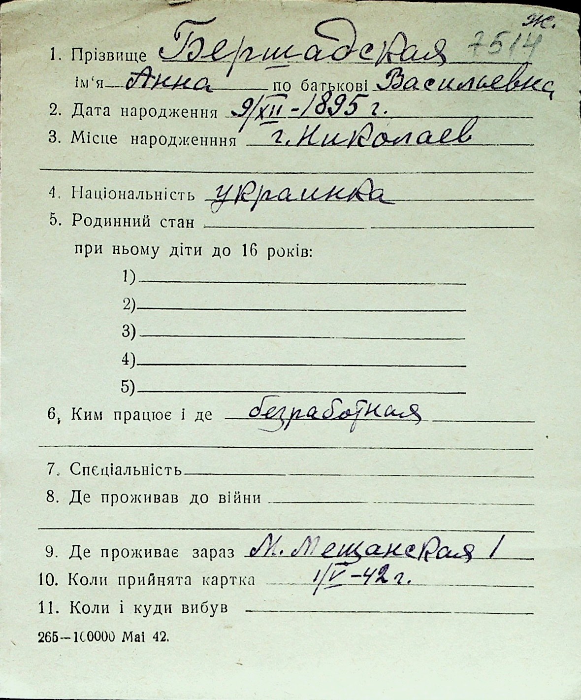 ◦ ◦ Перелік карток на осіб, які мешкали у м. Миколаїв у період окупації 1941–1944 років