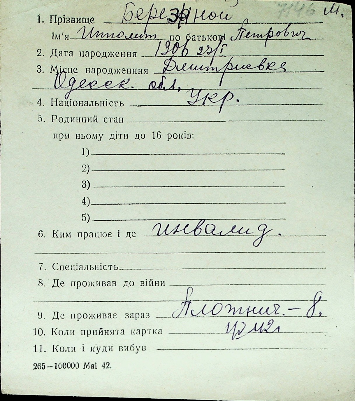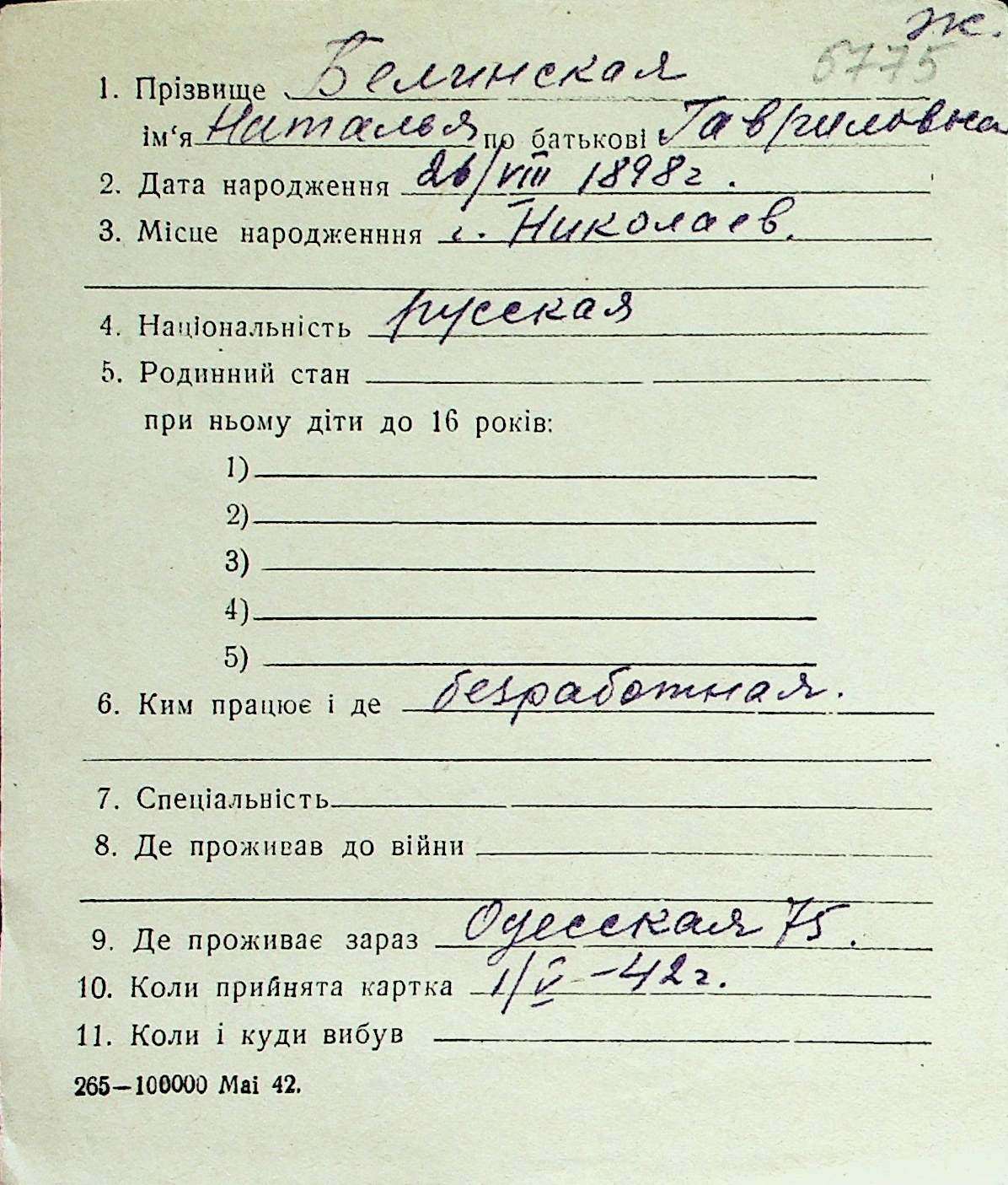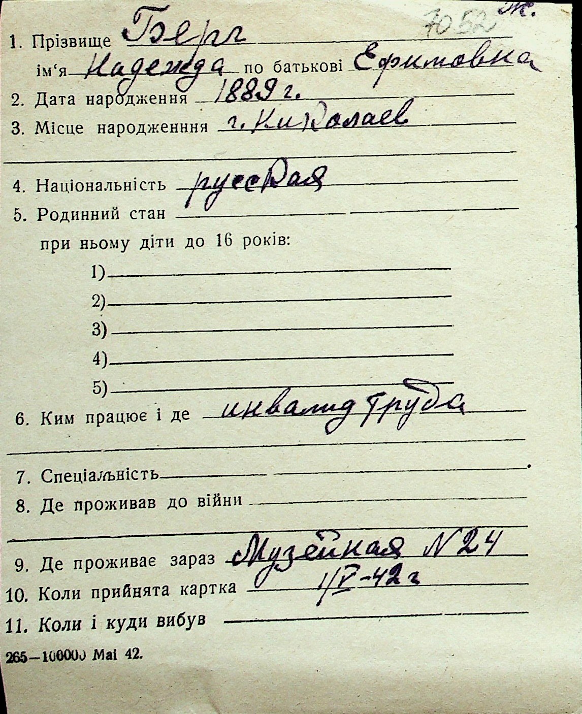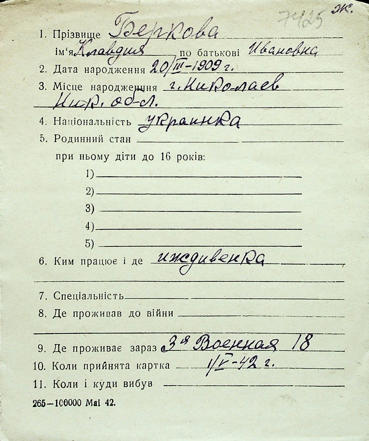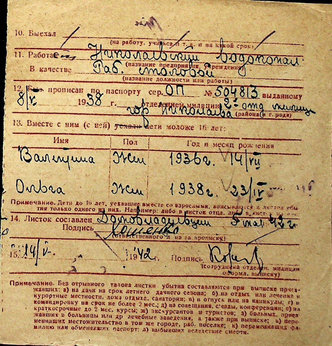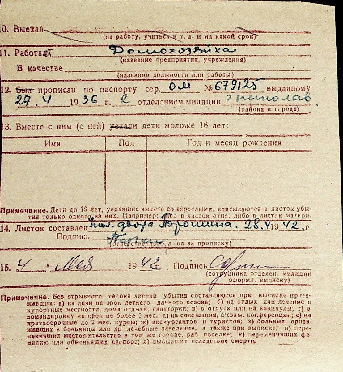 ◦ ◦ Перелік карток на осіб, які мешкали у м. Миколаїв у період окупації 1941–1944 років