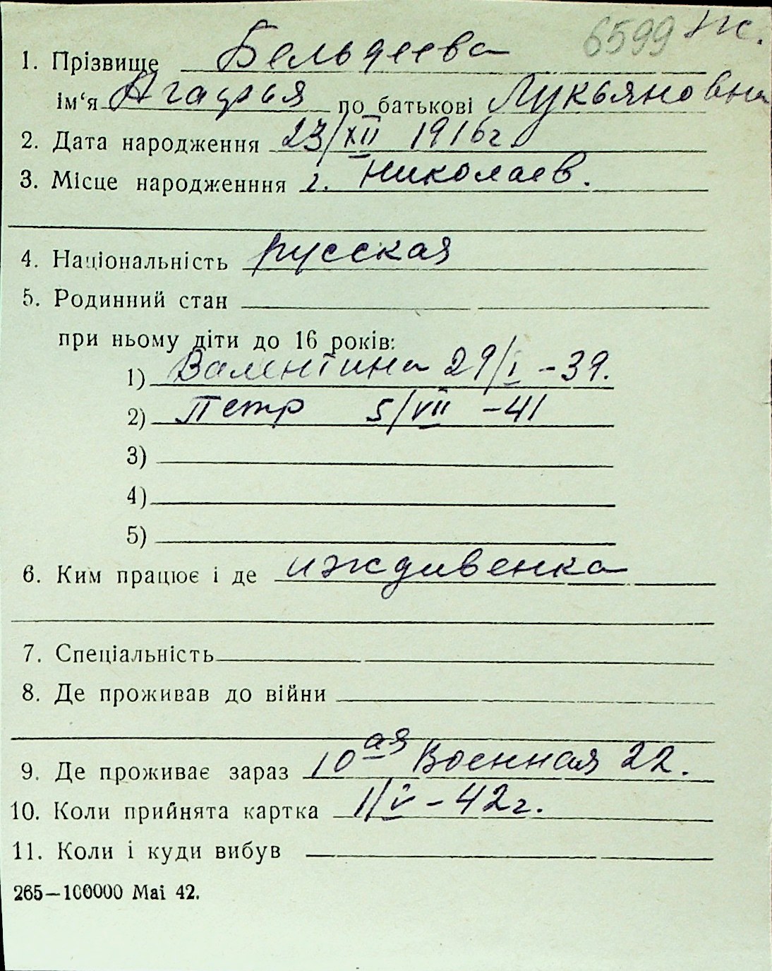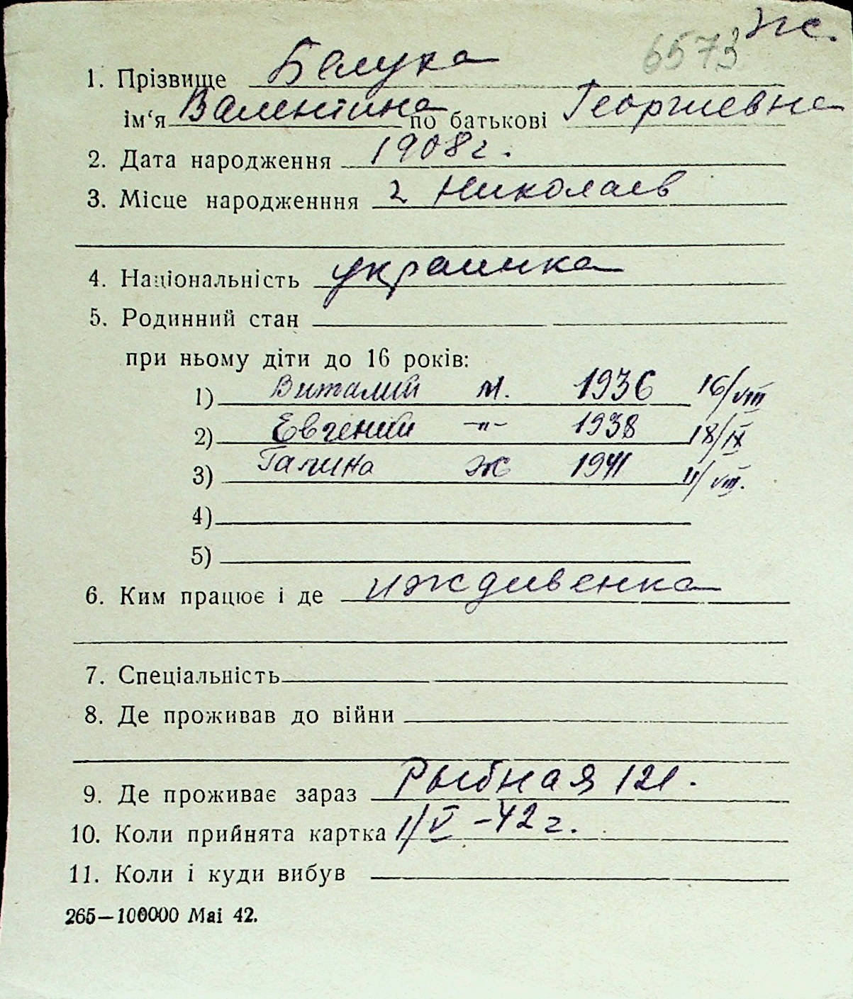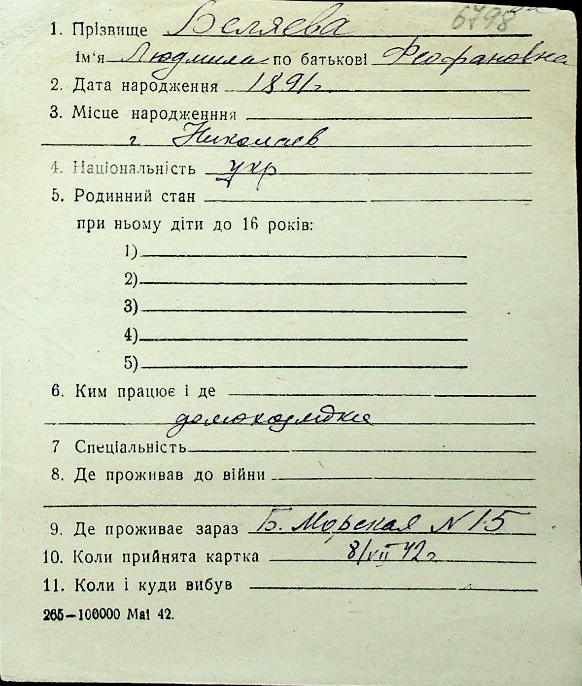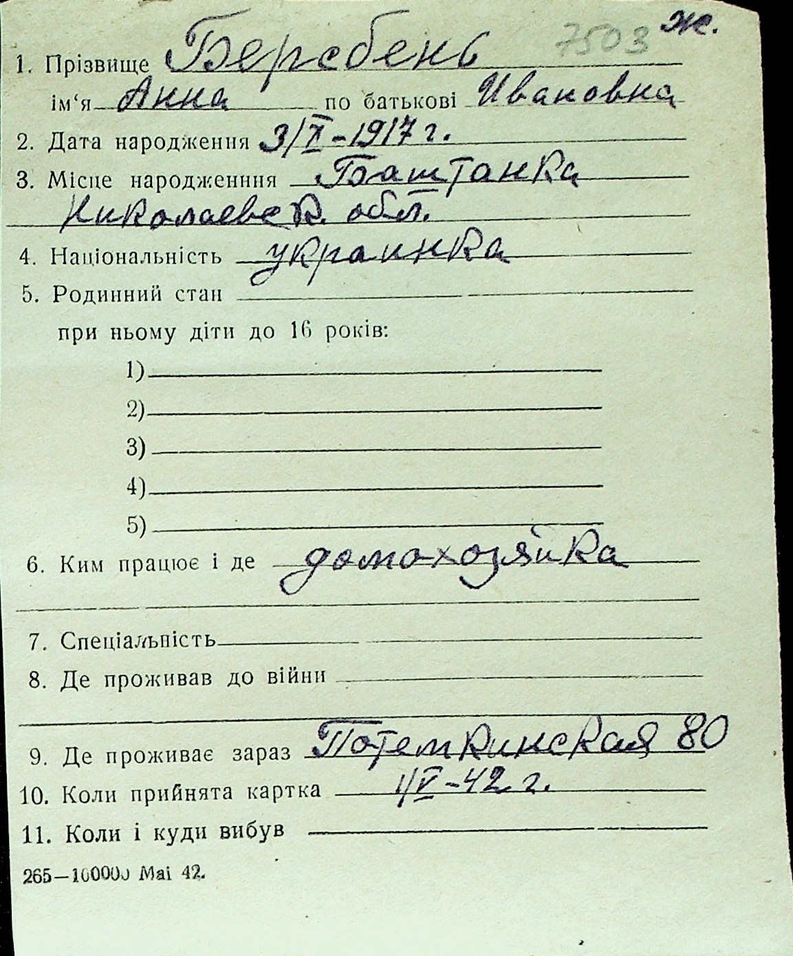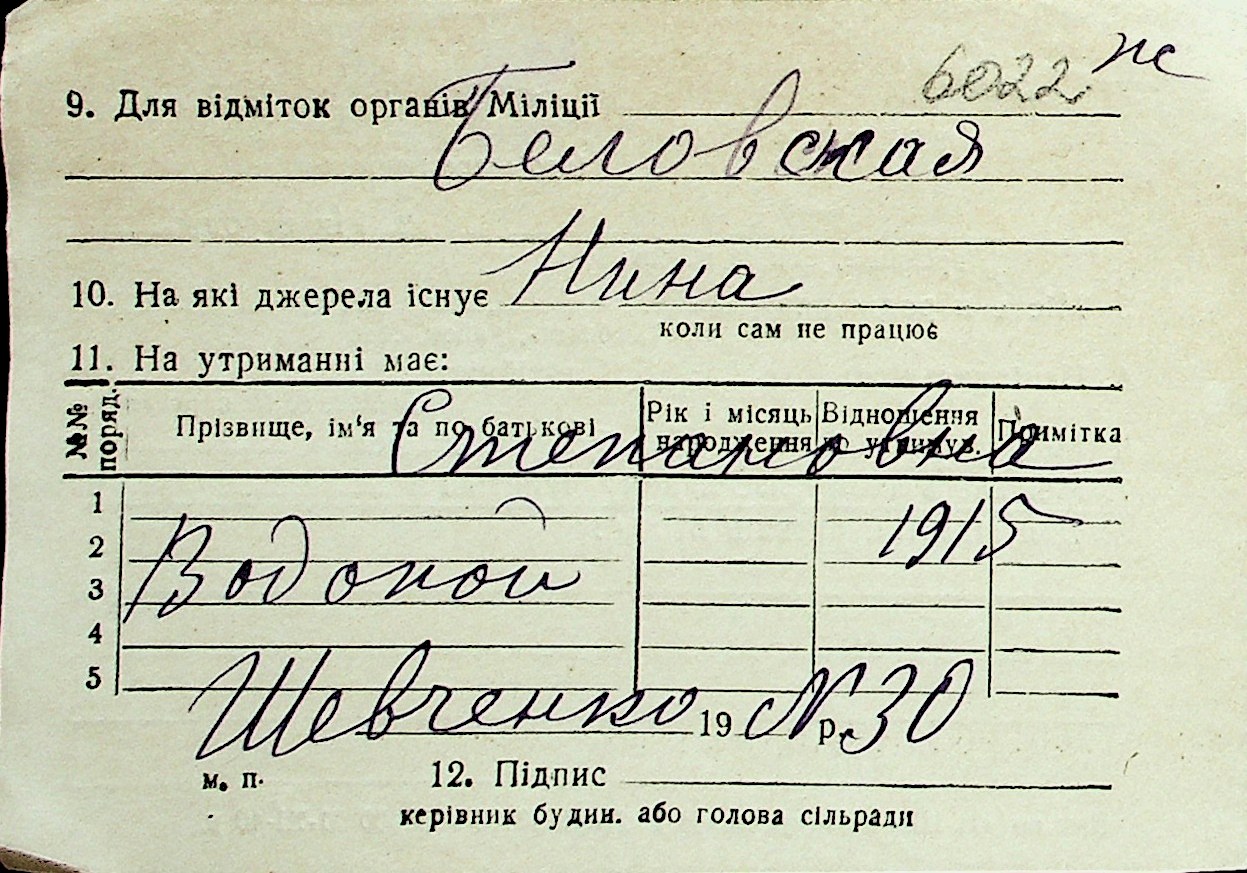 ◦ ◦ Перелік карток на осіб, які мешкали у м. Миколаїв у період окупації 1941–1944 років